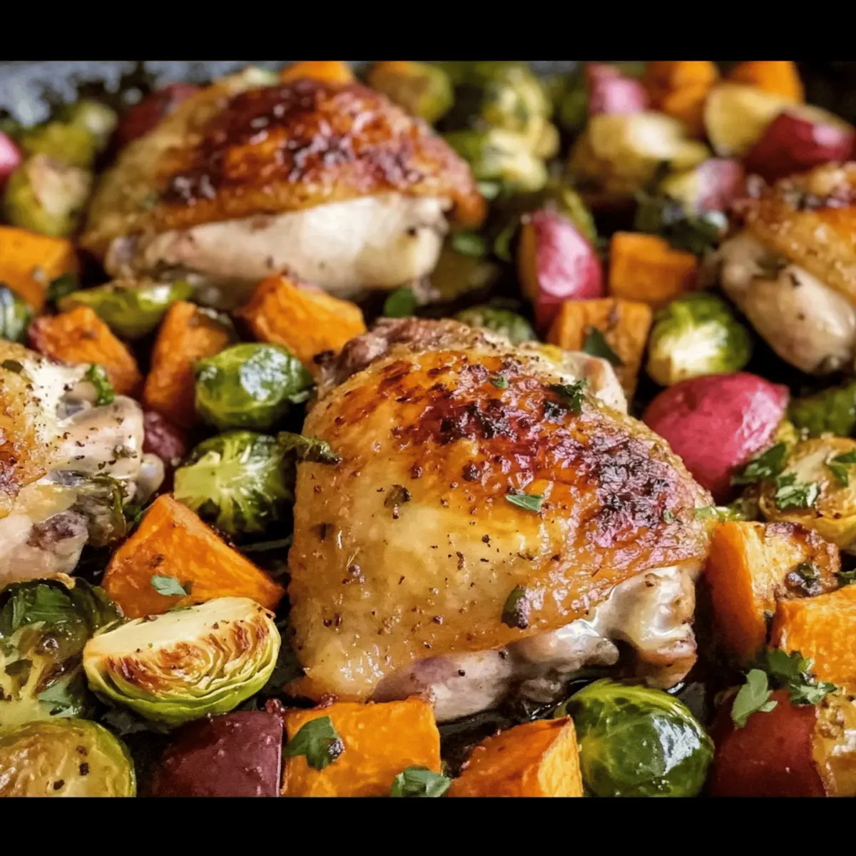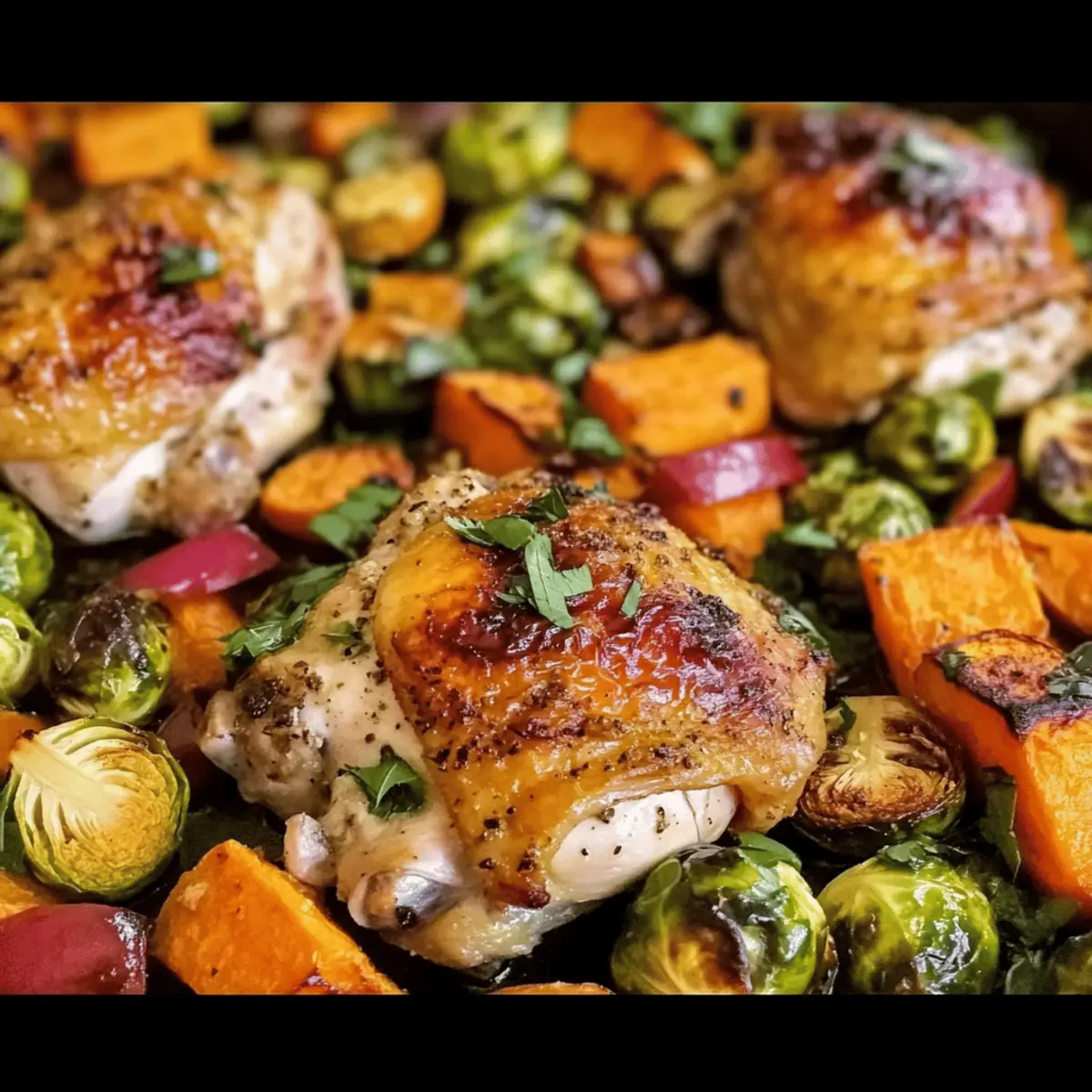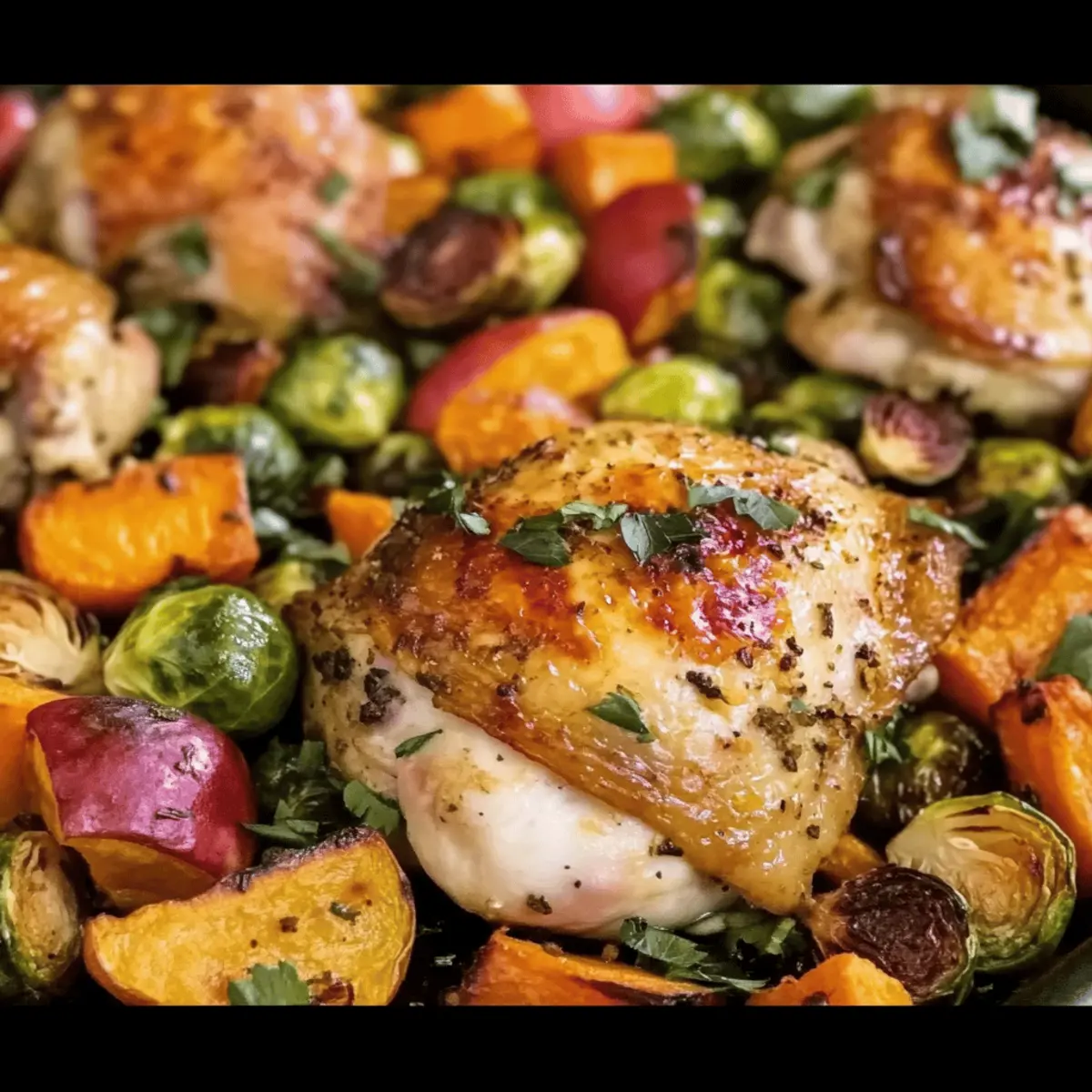 Jump to Recipe Print RecipeAs the leaves begin to change and a crispness fills the air, my thoughts drift to cozy meals that embrace the spirit of the season. Enter my One Pan Autumn Chicken Dinner, a dish that perfectly captures the essence of fall with tender chicken thighs roasting alongside caramelized sweet potatoes and earthy Brussels sprouts. Not only is it a delightful weeknight solution, but this one-pan meal is also gluten-free and allows for endless vegetable substitutions, making it as flexible as your schedule. With minimal cleanup and maximum comfort, this recipe invites you to snuggle up and enjoy the warmth of homemade goodness. Ready to turn your kitchen into an autumn haven? Let’s dive in! Why is This Recipe a Must-Try? Comforting Warmth: This One Pan Autumn Chicken Dinner brings a cozy feeling right to your table, perfect for cool evenings. Effortless Cooking: With just one pan, you’ll save time on cleanup, making it ideal for busy weeknights. Flavorful Harmony: The roast chicken and sweet potatoes blend beautifully with earthy Brussels sprouts and a hint of apple sweetness. Customizable Goodness: Feel free to swap veggies or add extras like cranberries for that personalized touch! Check out my Honey Butter Chicken if you’re looking for more delicious chicken recipes. Appeal for Everyone: This dish strikes a perfect balance of taste and nourishment, making it a hit with friends and family alike. Autumn Chicken Dinner Ingredients For the Chicken • Chicken Thighs – Juiciness and flavor; best bone-in and skin-on for optimal taste. • Olive Oil – Moisture and flavor; substitute with avocado oil for a high smoke point. • Red Wine Vinegar – Adds acidity and depth; apple cider vinegar can work in a pinch. • Garlic (minced) – Aromatic base flavor; fresh or jarred garlic can be used. • Fresh Thyme, Sage, Rosemary – Herbs for flavor complexity; dried herbs can be substituted but use less. For the Vegetables • Sweet Potato – Provides a sweet balance; can swap for regular potatoes or squash. • Brussels Sprouts – Earthy flavor and texture; substitute with green beans or carrots if desired. • Fuji Apples – Adds sweetness and tartness; other firm apples like Honeycrisp are great alternatives. • Shallots – Sweet, mild onion flavor; regular onions can be a substitute. For Extra Flavor • Bacon (hickory smoked) – Extra savoriness and depth; omit for a lower-fat version. • Parsley (chopped) – Garnish for color and freshness; optional but recommended for presentation. Step‑by‑Step Instructions for One Pan Autumn Chicken Dinner Step 1: Preheat Your Oven Begin by preheating your oven to 425°F to create the perfect roasting environment for your One Pan Autumn Chicken Dinner. While the oven heats up, gather your baking sheet and set it aside, ensuring it’s ready for the fresh, colorful ingredients that are to come. Step 2: Marinate the Chicken In a resealable bag, combine 2 tablespoons of olive oil, red wine vinegar, minced garlic, and the fresh herbs. Add the chicken thighs, seasoning generously with salt and pepper, and seal the bag. Give it a gentle shake to coat the chicken evenly, allowing it to marinate while you prepare the vegetables for about 10-15 minutes. Step 3: Prepare the Vegetables On your baking sheet, spread out the chopped sweet potatoes, Brussels sprouts, sliced apples, and shallots. Drizzle the remaining olive oil over the vegetables, then sprinkle them with salt and pepper for additional flavor. Toss everything together to ensure an even coating. The vibrant hues will evoke the essence of autumn. Step 4: Combine Chicken and Vegetables Once marinated, remove the chicken from the bag and place it on top of the bed of vegetables on the baking sheet. Arrange everything snugly but without overcrowding, allowing each ingredient to roast beautifully. For added flavor, sprinkle the cured smoked bacon pieces over the chicken and veggies. Step 5: Roast Everything to Perfection Slide the baking sheet into your preheated oven and roast for 30-35 minutes. The chicken should reach an internal temperature of 165°F, with juices running clear, while the vegetables turn golden and tender. Keep an eye on them, as the oven’s warmth creates an inviting aroma throughout your kitchen! Step 6: Optional Broil for Extra Crisp For that desirable crispy skin on your chicken, turn on the broiler during the last 2-3 minutes of cooking. Watch closely as the skin bubbles and browns to golden perfection, turning your One Pan Autumn Chicken Dinner into a visual feast for both the eyes and the palate. Step 7: Garnish and Serve Once cooked, remove the baking sheet from the oven and let it rest for a few minutes. Garnish your dish with freshly chopped parsley for a pop of color and a hint of freshness. Serve the warm, hearty One Pan Autumn Chicken Dinner straight from the pan for a cozy and delightful family meal. What to Serve with One Pan Autumn Chicken Dinner As the flavors of fall burst forth from your kitchen, it’s time to complement your cozy dish with delightful side options that enhance the warmth and heartiness of the season. Crusty Bread: A warm, rustic loaf is perfect for soaking up all the delicious juices from the chicken and veggies. Simple Green Salad: Fresh greens tossed in a light vinaigrette add a crisp contrast, balancing the rich, roasted flavors. Garlic Mashed Potatoes: Creamy and buttery, these mashed potatoes accentuate the savory notes of the dish while providing a comforting touch. Roasted Brussels Sprouts: Extra roasted Brussels sprouts, seasoned with lemon and garlic, echo the dish’s flavors and bring a delightful crunch. Buttered Corn on the Cob: Sweet, juicy corn creates a bright pop of sweetness, enhancing your overall autumn experience. Cranberry Sauce: A bright, tart cranberry sauce on the side makes for a wonderful contrast to the savory chicken and sweet potatoes. Warm Apple Crisp: For dessert, a warm apple crisp 