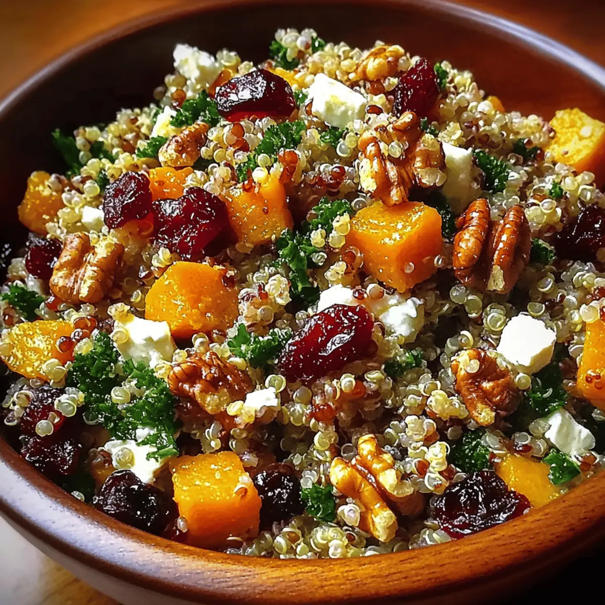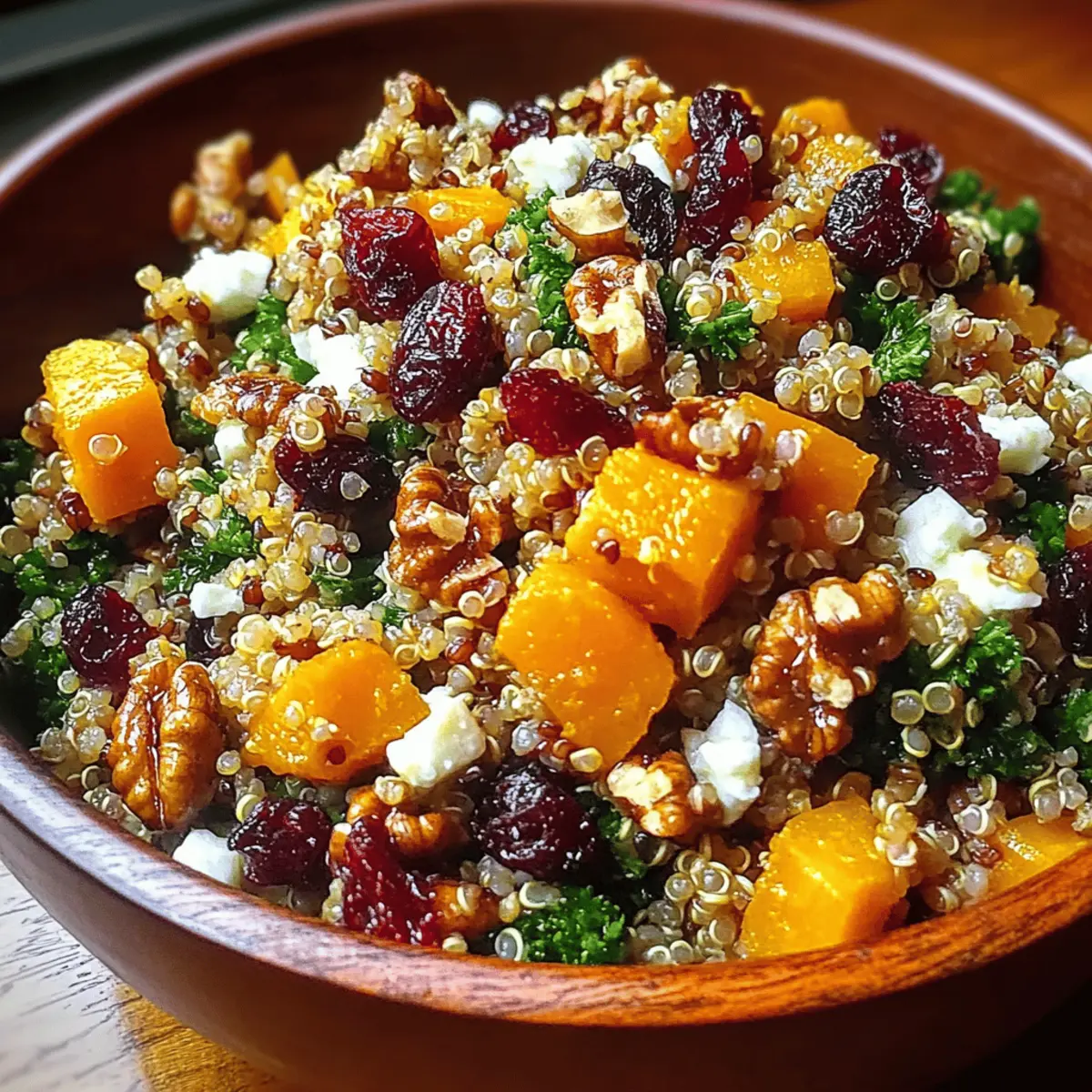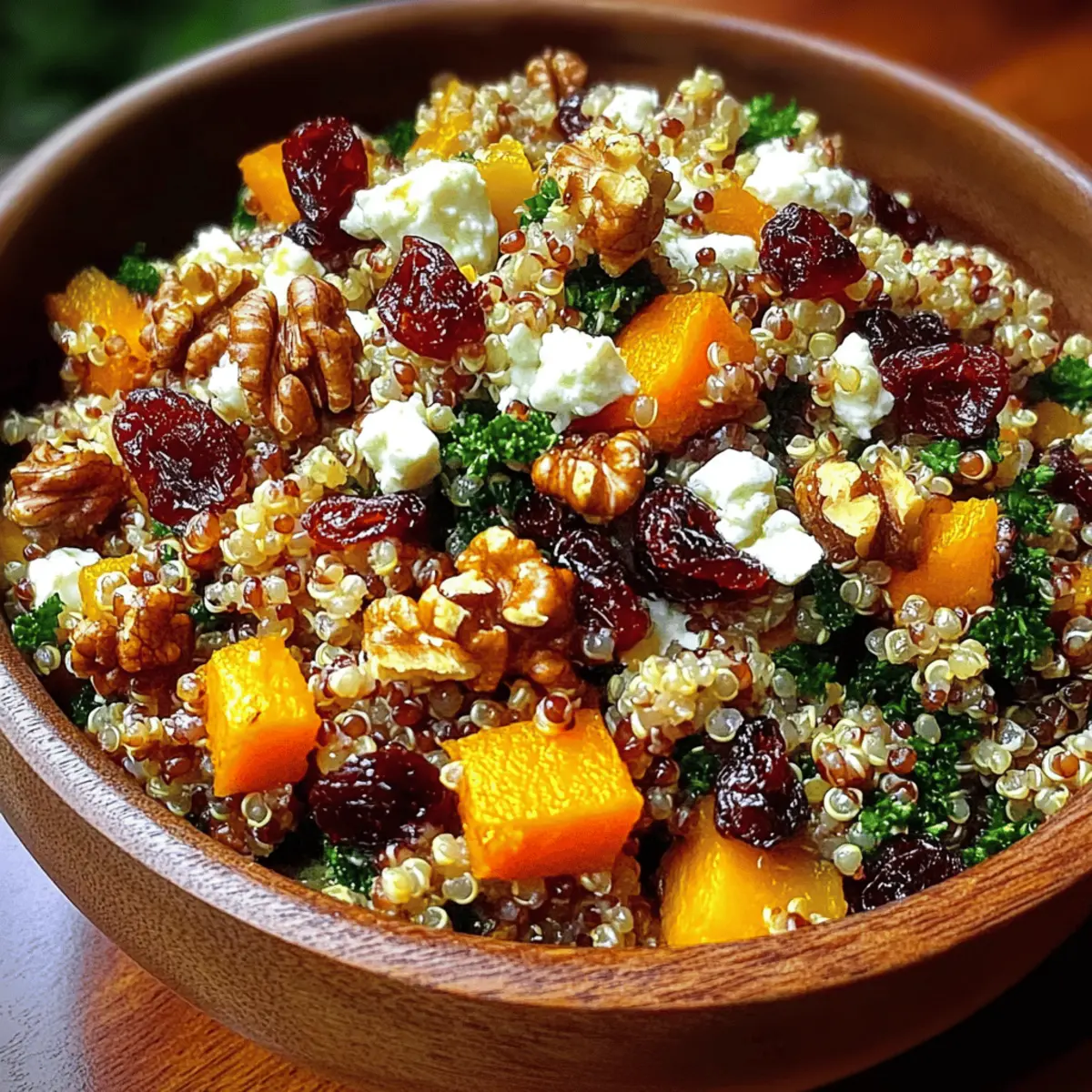 Jump to Recipe Print RecipeAs the crisp autumn breeze rustles through the leaves, I’ve found my kitchen transformed into a sanctuary of warmth and color. This vibrant Autumn Harvest Grain Salad with Cranberries is my favorite way to celebrate the season’s bounty. Picture a delightful mix of nutty quinoa, chewy farro, and sweet roasted butternut squash, all combined in celebration of fall. Not only is this salad a feast for the eyes, but it’s also packed with nutrition and flavor, making it a perfect healthy choice for busy weeknights or special gatherings. Plus, the versatility of this recipe means you can easily customize it to fit your taste or whatever seasonal ingredients you have on hand. Who knew that something so delicious could also be so simple? Ready to dive into a bowl of autumn goodness? Why is this salad a must-try? Seasonal Vibrance: This Autumn Harvest Grain Salad bursts with the colors and flavors of fall, featuring vibrant ingredients that keep each bite exciting. Nutritious and Wholesome: Packed with protein-rich quinoa and fiber-filled farro, it offers a hearty meal that’s as healthy as it is delicious. Customizable Delight: Feel free to add your favorite seasonal vegetables like roasted Brussels sprouts or even swap in proteins like grilled chicken for a boost. Easy Prep: With minimal cooking and straightforward steps, you’ll have this stunning salad ready in no time—perfect for busy weeknights! Crowd-Pleasing Favorite: Whether for a cozy family dinner or a festive gathering, this salad is sure to impress guests and family alike. If you’re looking to elevate your meal even more, consider serving it alongside a refreshing Cucumber Shrimp Salad or elegant Millionaire Peach Salad for a complete autumn feast. Autumn Harvest Grain Salad Ingredients • The perfect medley of flavors awaits! For the Salad Quinoa – A complete protein that adds a light, fluffy texture; substitute with brown rice if preferred. Farro – Contributes a chewy texture and nutty flavor; can be swapped with barley or bulgur for variety. Dried cranberries – Provides a sweet and tart burst to the salad; feel free to use fresh cranberries, but they may need additional sweetening. Butternut squash – Adds natural sweetness and beautiful color when roasted; sweet potatoes can be used as an alternative. Kale – A nutritional powerhouse that gives a robust bite; substitute with spinach or arugula for a different taste and texture. Walnuts – Perfect for adding a crunchy element and healthy fats; try pecans or sunflower seeds for a unique twist. Feta cheese – Brings creaminess and a tangy kick; it can be omitted for a vegan version or replaced with a plant-based cheese. For the Dressing Olive oil – Crucial for roasting and dressing; avocado oil is a great substitute for a different flavor profile. Maple syrup – Offers natural sweetness in the dressing; honey or agave syrup can be used as alternatives. Salt and pepper – Essential for enhancing all the flavors in this Autumn Harvest Grain Salad with Cranberries. Step‑by‑Step Instructions for Autumn Harvest Grain Salad with Cranberries Step 1: Rinse and Cook the Grains Rinse 1 cup of quinoa and 1 cup of farro under cold water to remove any bitterness. In separate pots, combine each grain with their respective amounts of water (typically, quinoa uses 2 cups water and farro uses 3 cups). Bring water to a boil, then reduce heat to simmer; cover and cook quinoa for about 15 minutes and farro for 30-40 minutes, or until each is tender and water is absorbed. Step 2: Roast the Butternut Squash Preheat your oven to 400°F (200°C). While the grains are cooking, peel and dice 1 medium butternut squash into bite-sized pieces. In a large bowl, toss the squash with 1 tablespoon of olive oil, salt, and pepper until well-coated. Spread it evenly on a baking sheet and roast for 25-30 minutes, stirring halfway through, until the squash is tender and lightly browned. Step 3: Prepare the Kale While the squash is roasting, clean and chop 4 cups of kale into bite-sized pieces. In a large mixing bowl, add kale and drizzle with 1 tablespoon of olive oil and a pinch of salt. Use your hands to massage the kale for about 2-3 minutes until it softens and becomes vibrant in color. This prepares it wonderfully for the salad, enhancing its flavor and texture. Step 4: Combine the Ingredients Once the grains and squash are ready, check that the quinoa is fluffy and farro is chewy before adding them to the bowl with the kale. Next, mix in 1 cup of dried cranberries and 1 cup of chopped walnuts, creating a colorful and flavorful blend. Stir gently to combine, ensuring the ingredients are evenly distributed throughout the salad. Step 5: Whisk the Dressing In a small bowl, whisk together the remaining 2 tablespoons of olive oil, 2 tablespoons of maple syrup, and a touch of salt and pepper. This dressing will enhance the flavors of the Autumn Harvest Grain Salad with Cranberries. Taste it and adjust the sweetness or seasoning as you desire, creating a perfect balance for your salad. Step 6: Dress and Serve the Salad Pour the dressing over the salad, gently tossing everything together to combine well. This allows all the flavors to meld beautifully. You can serve the salad warm, or let it sit for 10-15 minutes to let the flavors develop and serve it at room temperature. This hearty dish can be enjoyed as a side or a satisfying main course. What to Serve with Autumn Harvest Grain Salad with Cranberries Looking to elevate your mealtime experience? This colorful grain salad pairs beautifully with a variety of complementary dishes. Grilled Chicken: Juicy and tender, grilled chicken adds protein and a smoky flavor that balances the sweetness of the salad. Stuffed Bell Peppers: These vibrant peppers filled with quinoa or rice make a hearty and colorful side, perfect for autumn vibes. Roasted Brussels Sprouts: Crispy, caramelized sprouts bring an earthy element that contr