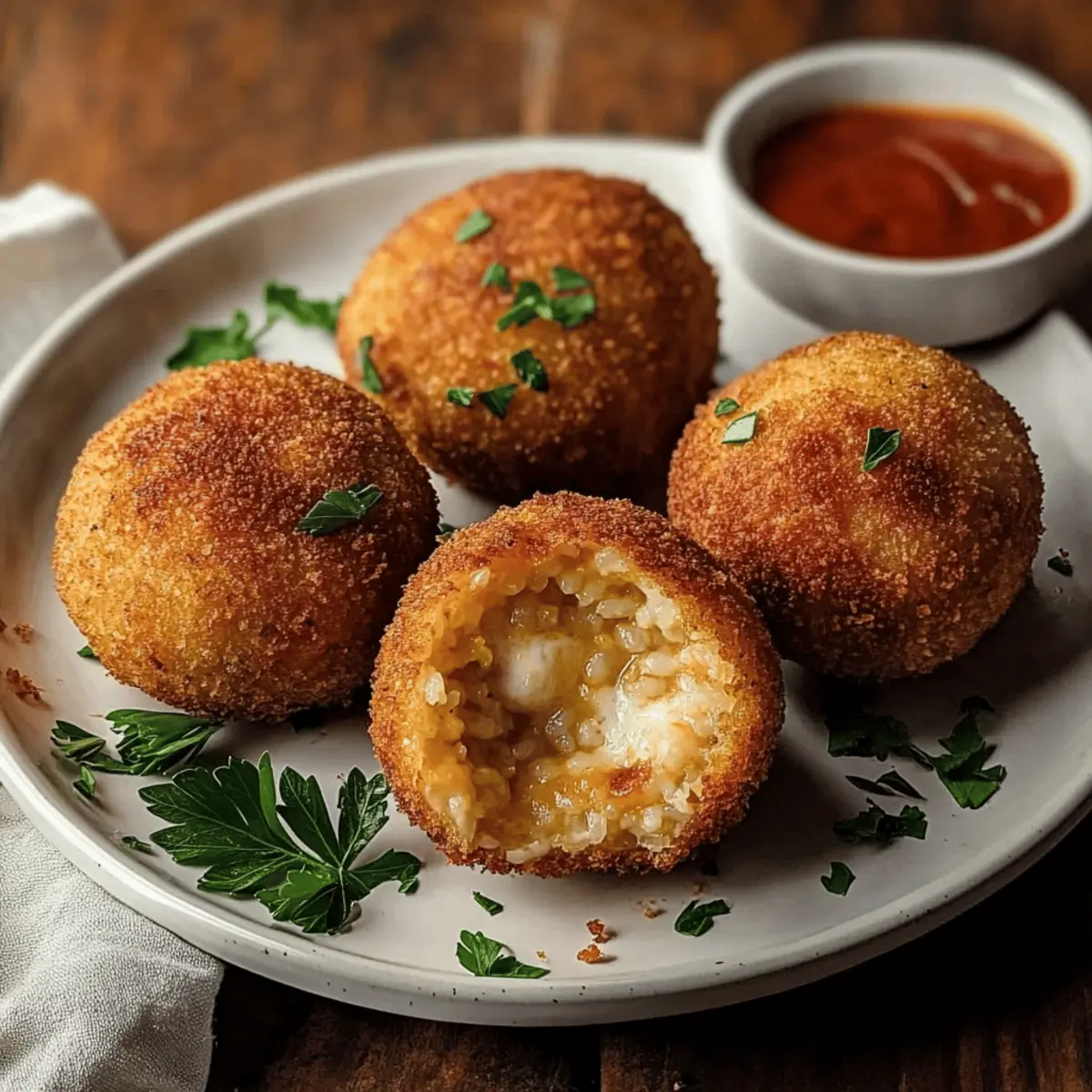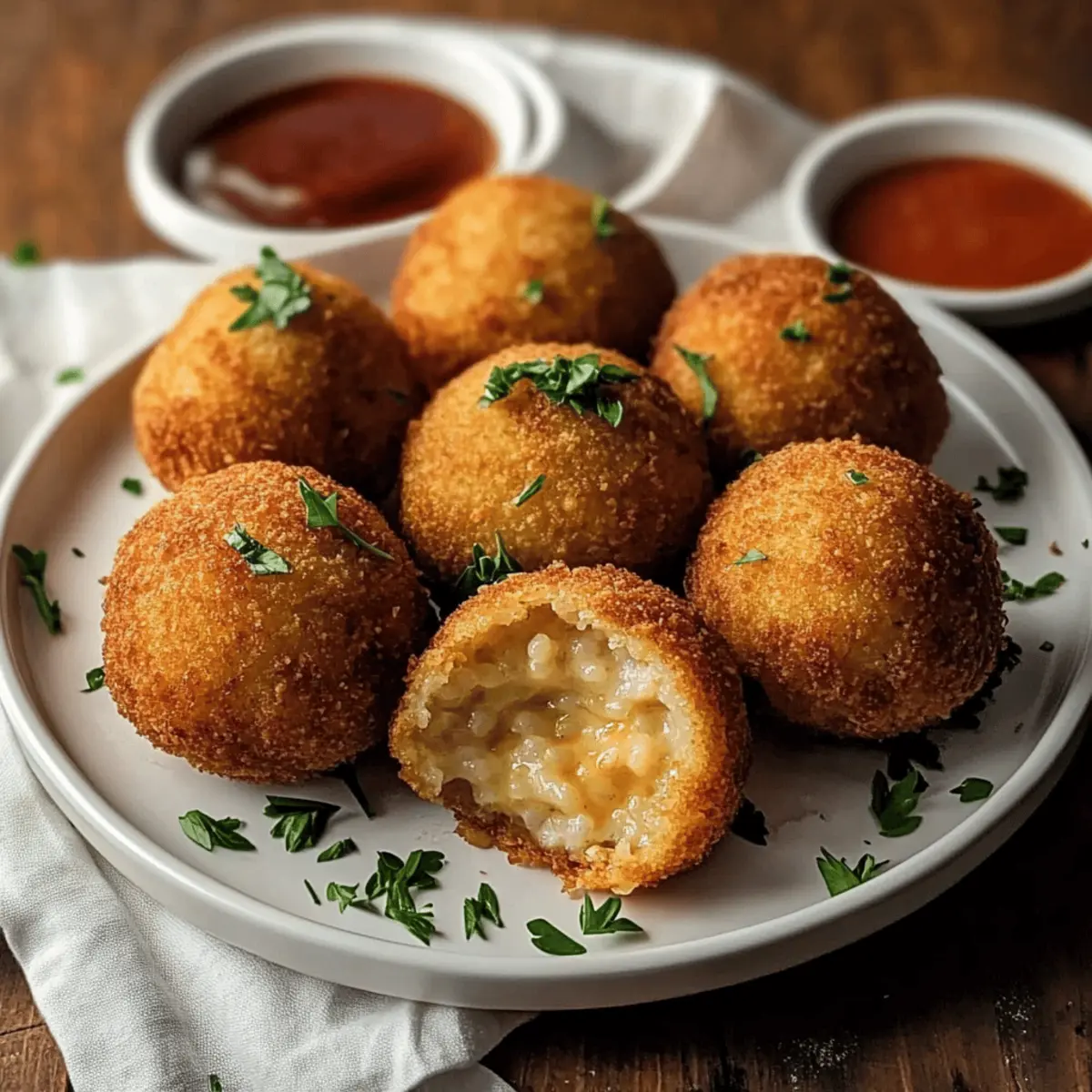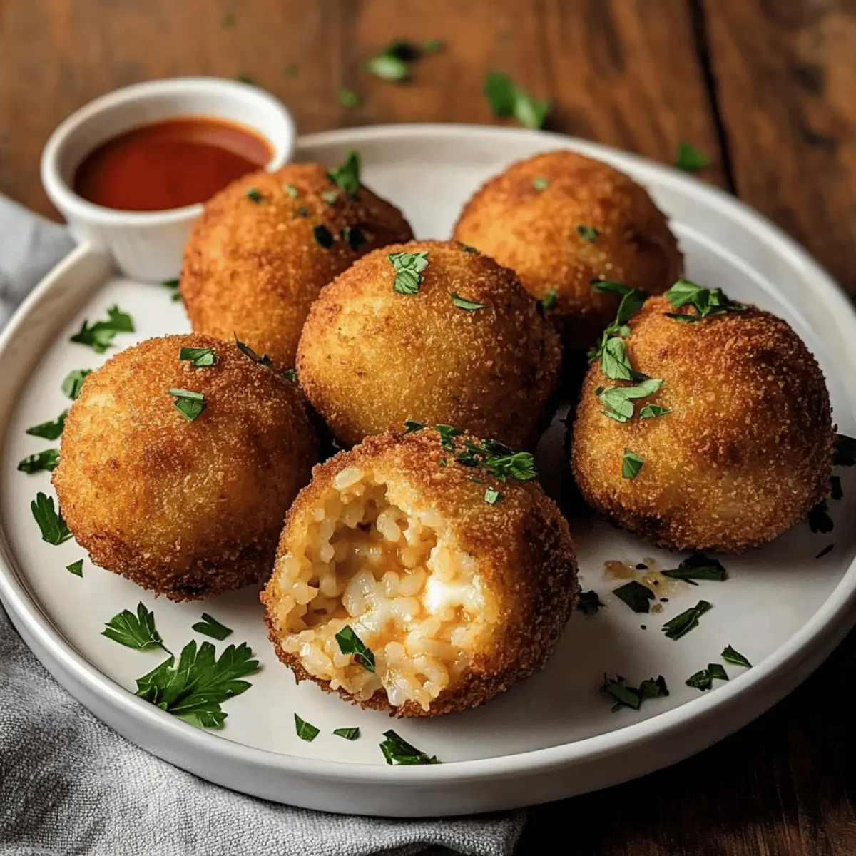 Jump to Recipe Print RecipeThe golden crunch of freshly baked arancini brings a wave of nostalgia, instantly welcoming memories of Italian family gatherings filled with laughter and love. These delightful little rice balls not only capture the essence of Sicilian cuisine, but they also provide a healthier twist on a beloved classic, making them a perfect choice for those seeking a nutritious comfort food option. Using simple ingredients like creamy Arborio rice and gooey mozzarella, this baked arancini recipe is a quick prep that promises big flavor with every bite. Whether you’re hosting a festive gathering or simply craving a homemade snack, these crispy treats will leave you happily satisfied without the greasiness of frying. Are you ready to roll up your sleeves and create some cheesy magic in your kitchen? Why Try Baked Arancini Today? Irresistible Flavor: These baked arancini burst with rich, savory goodness, thanks to the combination of creamy Arborio rice and melty mozzarella. Healthier Option: By eliminating frying, you can indulge guilt-free, making these a perfect snack for health-conscious foodies. Quick Prep: With simple steps, you can whip up these delightful bites in no time. Perfect for gatherings, they pair fantastically with marinara sauce for dipping or even alongside Baked Asparagus Fries for a complete meal. Versatile Recipe: Feel free to customize fillings or toppings to suit your taste buds—add herbs or swap cheeses for a unique twist. Nostalgic Comfort: Each bite transports you to joyful family moments, making them not just food, but a cherished experience. Dive into the joy of cooking and savor every delicious moment! Baked Arancini Ingredients For the Rice Mixture • Arborio Rice – Provides structure and creaminess, essential for the signature texture. Note: Other short-grain rice can be used if Arborio is unavailable. • Chicken Broth – Adds depth of flavor to the rice during cooking. Alternatively, vegetable broth can be used for a vegetarian version. • Parmesan Cheese – Enhances the richness and savory flavor. Substitute with Pecorino Romano for a stronger taste. • Chopped Parsley – Adds a fresh herbaceous note to the flavor. Omit or substitute with basil if preferred. • Salt and Pepper – Essential for seasoning. Adjust to taste based on broth used. For the Filling • Mozzarella Cheese – Provides a gooey, melty filling at the center. Consider using cheddar for a different flavor profile. For the Coating • Eggs – Acts as a binding agent to hold the arancini together. Flax eggs can be used as a vegan substitute. • Bread Crumbs – Forms a crispy exterior upon baking. Use gluten-free breadcrumbs for a GF variation. For Baking • Olive Oil – Brushed on to encourage browning and crispiness during baking. Can use cooking spray for a lighter version. Step‑by‑Step Instructions for Baked Arancini Step 1: Prepare the Rice Start by cooking 1 cup of Arborio rice in 3 cups of chicken broth over medium heat until it reaches al dente, about 18-20 minutes. Once cooked, remove from heat and let it cool in a large bowl for at least 30 minutes. This step is crucial as it allows the rice to firm up, making it easier to shape into perfect balls for your baked arancini. Step 2: Mix Ingredients In the cooled rice, fold in ½ cup of grated Parmesan cheese, salt, pepper to taste, and ¼ cup of chopped parsley. Ensure everything is well combined, which will create a flavorful base for your arancini. The mixture should be sticky but not overly wet, offering a perfect texture for shaping into rice balls. Step 3: Shape Arancini With your hands, take a scoop of the rice mixture and flatten it slightly. Place a cube of mozzarella cheese in the center, then mold the rice around it, forming a tight ball. Repeat this process with the remaining rice mixture, ensuring the balls are uniform in size and the cheese is well-sealed inside. This will give your baked arancini a delightful melty center. Step 4: Coat with Eggs and Breadcrumbs Prepare two shallow bowls—one with beaten eggs and another with breadcrumbs. Dip each rice ball first into the egg to coat, allowing any excess to drip off before rolling it in the breadcrumbs. Make sure each ball is evenly coated for a crispy texture when baking. This step creates that delicious golden exterior as they bake. Step 5: Bake Preheat your oven to 375°F (190°C). Line a baking sheet with parchment paper, then arrange the coated arancini on the sheet, spaced apart. Brush the tops lightly with olive oil to enhance browning. Bake them for 20-25 minutes, turning halfway through, until they’re golden and crispy. Keep an eye on them towards the end to ensure perfect crispiness on your baked arancini. What to Serve with Baked Arancini Elevate your homemade arancini experience by pairing them with delightful, complementary dishes that tantalize the senses. Marinara Sauce: A classic pairing! This tangy sauce provides a rich contrast to the crispy arancini and enhances their flavors. Garlic Bread: Crunchy and buttery, fresh garlic bread brings comforting carbs to the table, ideal for mopping up any leftover sauce. Indulge in a delightful salad alongside for a refreshing bite. Caprese Salad: Juicy tomatoes, creamy mozzarella, and fragrant basil create a vibrant dish that balances the richness of the arancini. Roasted Vegetables: A platter of seasonal roasted veggies adds a smoky depth and a nutritious element to your meal, complementing the flavors beautifully. For a delightful dessert, consider a sweet finish. Tiramisu: Celebrate Italian heritage with this coffee-infused dessert that provides a sweet and creamy contrast to the savory arancini. Limoncello Sorbet: Light and refreshing, a scoop of this zesty sorbet cleanses the palate and rounds off the meal perfectly. Finally, don’t forget a nice drink! Italian Red Wine: A glass of Chianti or Sangiovese enhances the meal’s richness, making each bite of the baked aranci