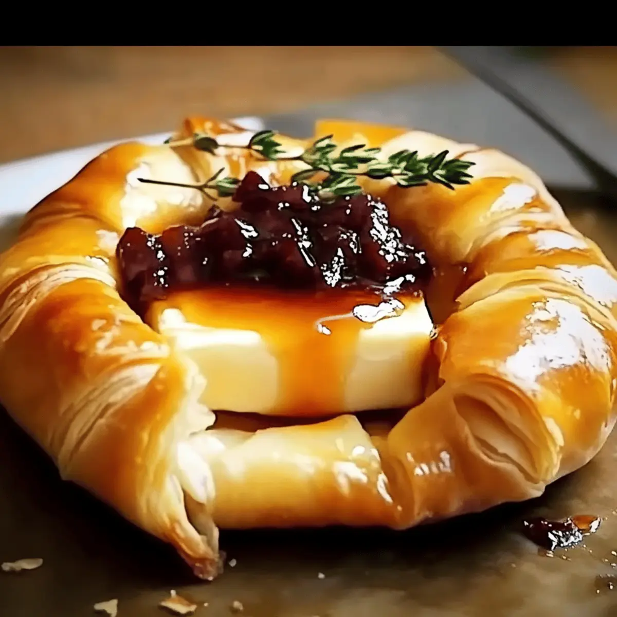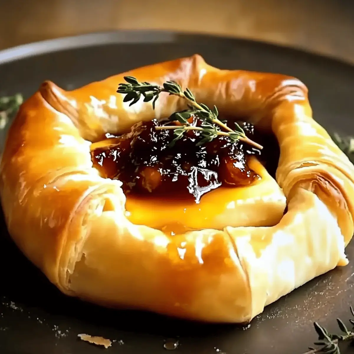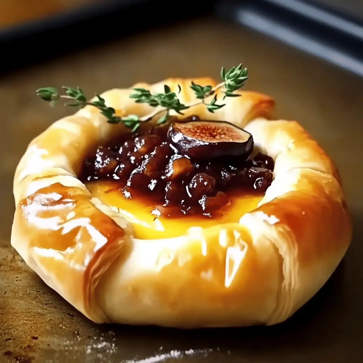 Jump to Recipe Print RecipeAs the aroma of warm, flaky pastry fills my kitchen, I can’t help but feel a wave of excitement. There’s something incredibly satisfying about turning a few simple ingredients into an unforgettable dish. My Perfect Baked Brie in Puff Pastry with Honey and Fig is not just a meal; it’s an experience that transforms any gathering into a celebration. This delightful recipe features a creamy Brie, lovingly wrapped in buttery puff pastry, drizzled with sweet honey, and balanced with rich fig preserves. Not only is it perfect for impressing guests at dinner parties, but it’s also a quick and easy option for cozy nights in. With a serving of this cheesy masterpiece, you’re guaranteed warm smiles, gooey indulgence, and the kind of comfort that calls for seconds. Ready to elevate your entertaining game? Let’s dive into this delectable dish that promises to be a showstopper! Why Is This Baked Brie So Special? Irresistible Flavor: The harmonious blend of sweet honey and rich fig preserves elevates the creamy Brie, creating a flavor profile that’s simply unforgettable. Visual Delight: With its golden, flaky pastry, this dish is as beautiful as it is delicious, making it a stunning centerpiece for any gathering. Quick & Easy: Perfect for busy hosts, this dish can be prepared in just 30 minutes—ideal when you need to impress without the fuss. Versatile Toppings: Not just limited to figs! You can easily switch it up with cranberry sauce and orange zest for a festive twist. Crowd-Pleasing Comfort: Whether you’re serving it at a party or enjoying it during a cozy night in, this Baked Brie in Puff Pastry guarantees smiles all around. Serve it alongside fresh fruit or crackers, and you might want to check out Honey Butter Chicken for another crowd-pleaser! Baked Brie in Puff Pastry Ingredients For the Puff Pastry • Puff Pastry – Choose a high-quality, frozen variety for the best flaky results; thaw it in the fridge before using. For the Filling • Brie Cheese – Select a round Brie for even melting; can substitute Camembert if desired. • Honey – Adds a delightful sweetness that perfectly complements the rich cheese. • Fig Preserves – Offers a luxurious flavor pairing; cranberry sauce can be swapped for a seasonal touch. Serving Suggestions • Crackers – Serve with your favorite varieties for a delightful crunch alongside the creamy Brie. • Fresh Fruit – Apple slices or grapes enhance the dish with freshness and contrast. Indulge in this Baked Brie in Puff Pastry with Honey and Fig, and watch your guests be wowed! Step‑by‑Step Instructions for Baked Brie in Puff Pastry with Honey and Fig Step 1: Preheat the Oven Begin by preheating your oven to 375°F (190°C). This ensures the perfect baking temperature for achieving that golden-brown puff pastry. While the oven warms up, prepare your work area by gathering all your ingredients and equipment, such as a baking sheet lined with parchment paper. Step 2: Prepare the Puff Pastry Remove your thawed puff pastry from the fridge, and gently roll it out on a lightly floured surface to about 1/8-inch thickness. This step is crucial for maintaining the pastry’s flaky texture. Once rolled out, place it carefully on the prepared baking sheet, leaving space at the center for the Brie cheese. Step 3: Position the Brie Place the round Brie cheese in the center of the puff pastry. The cheese should be at room temperature for easier melting and a creamy texture. This Baked Brie in Puff Pastry with Honey and Fig will be elevated by the contrast between the warm cheese and the crispy outer layer. Step 4: Add Sweet Toppings Drizzle honey generously over the top of the Brie, allowing it to cascade down the sides. Next, spoon fig preserves atop the cheese. The combination of sweet honey and rich fig flavors will create a mouthwatering filling that complements the creamy Brie beautifully. Step 5: Wrap the Brie Gently fold the edges of the puff pastry over the Brie, ensuring it is completely enveloped. Pinch the seams to seal the pastry and trim any excess dough to prevent burning. This step is key to achieving that perfect, flaky pastry while keeping all the cheesy goodness inside. Step 6: Bake to Perfection Place the baking sheet in the preheated oven and bake for 25–30 minutes. Keep an eye on the pastry, looking for a deep golden color and a puffed-up, flaky appearance. The kitchen will fill with a delightful aroma, indicating the Baked Brie in Puff Pastry with Honey and Fig is nearly ready. Step 7: Cool and Serve Once baked, remove the dish from the oven and let it cool for about 5 minutes. This brief cooling period allows the cheese to set slightly, making it easier to slice. Serve your Baked Brie with crackers or fresh fruit, inviting everyone to indulge in this irresistible appetizer. Make Ahead Options These Perfect Baked Brie in Puff Pastry with Honey and Fig are fantastic for meal prep! You can assemble the entire dish up to 24 hours in advance—just leave it covered in the refrigerator after wrapping the Brie. This ensures that the pastry stays fresh and maintains its flaky texture. When you’re ready to serve, simply preheat your oven and bake it straight from the fridge, adding an extra 5 minutes to the baking time as needed. This approach not only saves time but also allows you to put the finishing touch on a show-stopping appetizer with minimal effort, ensuring you can enjoy your gathering without stress! Expert Tips for Baked Brie in Puff Pastry Keep It Cool: Always ensure the puff pastry is cold before rolling it out. This helps maintain its flaky texture during baking. Sealing Properly: Make sure to pinch the seams of the pastry well to prevent leaks. Loose seals can lead to melted cheese oozing out while baking. Tent If Needed: If the pastry starts to brown too quickly, cover it with aluminum foil. This will protect it from burning while allowing the cheese to melt perfectly. Perfect Slici