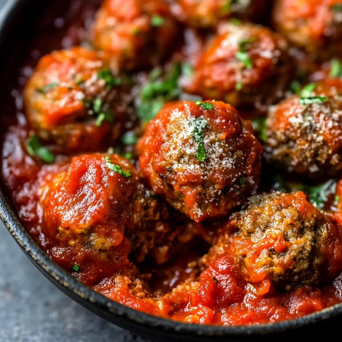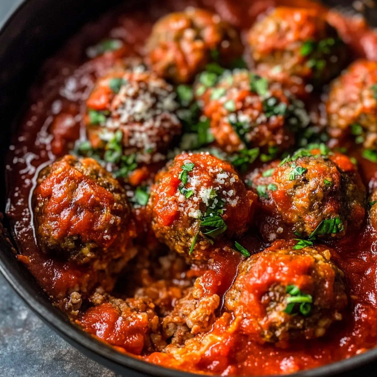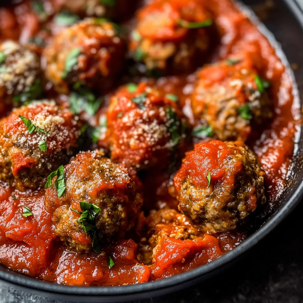 Jump to Recipe Print RecipeAs the savory aroma of herbs wafted through my kitchen, I couldn’t help but think that weeknight dinners could be a whole lot more exciting. Enter my Easy Baked Meatballs with Marinara Sauce—a dish not only packed with comforting Italian flavors but also ready in just 30 minutes. These meatballs are perfectly tender, making them a fantastic crowd-pleaser whether you’re serving the family or hosting friends for a cozy gathering. Plus, with simple ingredient swaps like ground turkey or a mix of meats, you can customize this recipe to fit any taste or dietary preference. Are you ready to transform your dinner routine and impress your taste buds all at once? Let’s dive in! Why are these meatballs a must-try? Simplicity, – With just a handful of ingredients, you can whip up these delicious meatballs in no time. Versatile, – Enjoy them with traditional spaghetti, on a sub roll, or even as a tasty appetizer. Flavors that pop, – Each bite bursts with savory spices and rich marinara, making them irresistible. Make-ahead friendly, – Batch cook and freeze for easy dinners down the line, plus check out Baked Asparagus Fries for a perfect side! Crowd-pleaser, – These meatballs are sure to impress family and friends alike, creating memorable meal experiences. Baked Meatball Ingredients • Discover the essential ingredients for these mouthwatering baked meatballs! For the Meatballs Ground Beef – Choose 80/20 for maximum juiciness; you can also use ground turkey for a lighter version. Garlic Powder – Adds a savory kick without the fuss of fresh garlic. Onion Powder – Provides a delicious depth of flavor that enhances the meatballs. Italian Seasoning – A perfect blend for that classic Italian taste; dried oregano or basil works in a pinch. Ground Black Pepper – Sprinkles heat to elevate the overall taste. Salt – Essential for enhancing flavor; adjust to your preference. Large Egg – Acts as a binder, keeping the meatballs moist and together. Freshly Grated Parmesan Cheese – Imparts richness; substitute with nutritional yeast for a dairy-free option. Breadcrumbs – Gives structure to the meatballs; try crushed crackers for a delightful twist. Lukewarm Water – Helps achieve the perfect mixture consistency; adjust as needed. For the Marinara Sauce Olive Oil – A must for flavor in your marinara; extra virgin is best! Garlic (Minced) – Fresh garlic adds a wonderful aroma; omit if using garlic powder. Crushed Red Pepper Flakes – Optional for those who crave a little heat in their sauce. Crushed Tomatoes – The base of the sauce; fire-roasted adds a depth that’s simply irresistible! Sugar – Balances the acidity of the tomatoes perfectly. With these ingredients, you’ll create baked meatballs that are tender and flavorful, making your dinner not just easy, but unforgettable! Step‑by‑Step Instructions for Easy Baked Meatballs with Marinara Sauce Step 1: Preheat and Prepare Begin by preheating your oven to 425°F (220°C). Line a baking sheet with parchment paper to ensure your baked meatballs don’t stick and can crisp up beautifully. While the oven warms, you can gather all your ingredients for easy access during the mixing process. Step 2: Mix the Meatball Ingredients In a large mixing bowl, combine the ground beef, garlic powder, onion powder, Italian seasoning, ground black pepper, salt, egg, grated Parmesan cheese, breadcrumbs, and lukewarm water. Use your hands to gently mix until everything is just combined; be careful not to overmix as this can lead to tough meatballs. The texture should be slightly sticky and well-blended. Step 3: Shape the Meatballs With your hands, scoop out portions of the mixture and roll them into 1-inch meatballs. Place each meatball on the prepared baking sheet, making sure they are evenly spaced to allow for even cooking. This step is key to ensuring your baked meatballs are tender and not overcrowded, which can cause steaming. Step 4: Bake the Meatballs Once your meatballs are shaped, slide the baking sheet into the preheated oven and bake for 12–15 minutes. Keep an eye on them; they should be golden brown on the outside and firm to the touch. An internal temperature of 160°F (70°C) indicates they are perfectly cooked through. Step 5: Make the Marinara Sauce While the meatballs are baking, heat a tablespoon of olive oil in a pan over medium-low heat. Add minced garlic and sauté until golden and fragrant, about 1-2 minutes. This step enhances the sauce’s flavor and provides a delicious base to complement your baked meatballs. Step 6: Simmer the Sauce Next, stir in the crushed red pepper flakes, crushed tomatoes, salt, sugar, and any remaining seasonings. Allow the mixture to come to a simmer and let it cook for at least 10 minutes. As the sauce thickens and the flavors meld together, it will transform into a rich, savory accompaniment for the meatballs. Step 7: Combine and Serve Once the meatballs are done and the marinara sauce has simmered, carefully add the baked meatballs into the sauce. Gently toss them to ensure each meatball is coated in that luscious marinara. Serve them hot over spaghetti, in sub rolls, or simply on their own for a delightful meal. Expert Tips for Baked Meatballs Don’t Overmix: Prevent tough meatballs by mixing the ingredients just until combined—this keeps them tender. Gauge Your Baking Time: Adjust the baking time based on the size of your meatballs. They should be firm and golden when fully cooked. Simmer for Depth: Allow your marinara sauce to simmer longer for a fuller flavor. A mere 10 minutes makes a big difference! Experiment with Meats: Feel free to explore different ground meats for variation in flavor and texture. Ground turkey or chicken are great alternatives! Stay Mindful of Seasoning: If using fresh garlic in the sauce, reduce the garlic powder in the meatball mix to balance the flavors. Perfectly Serve Your Meatballs: Serve over spaghetti, in sub r