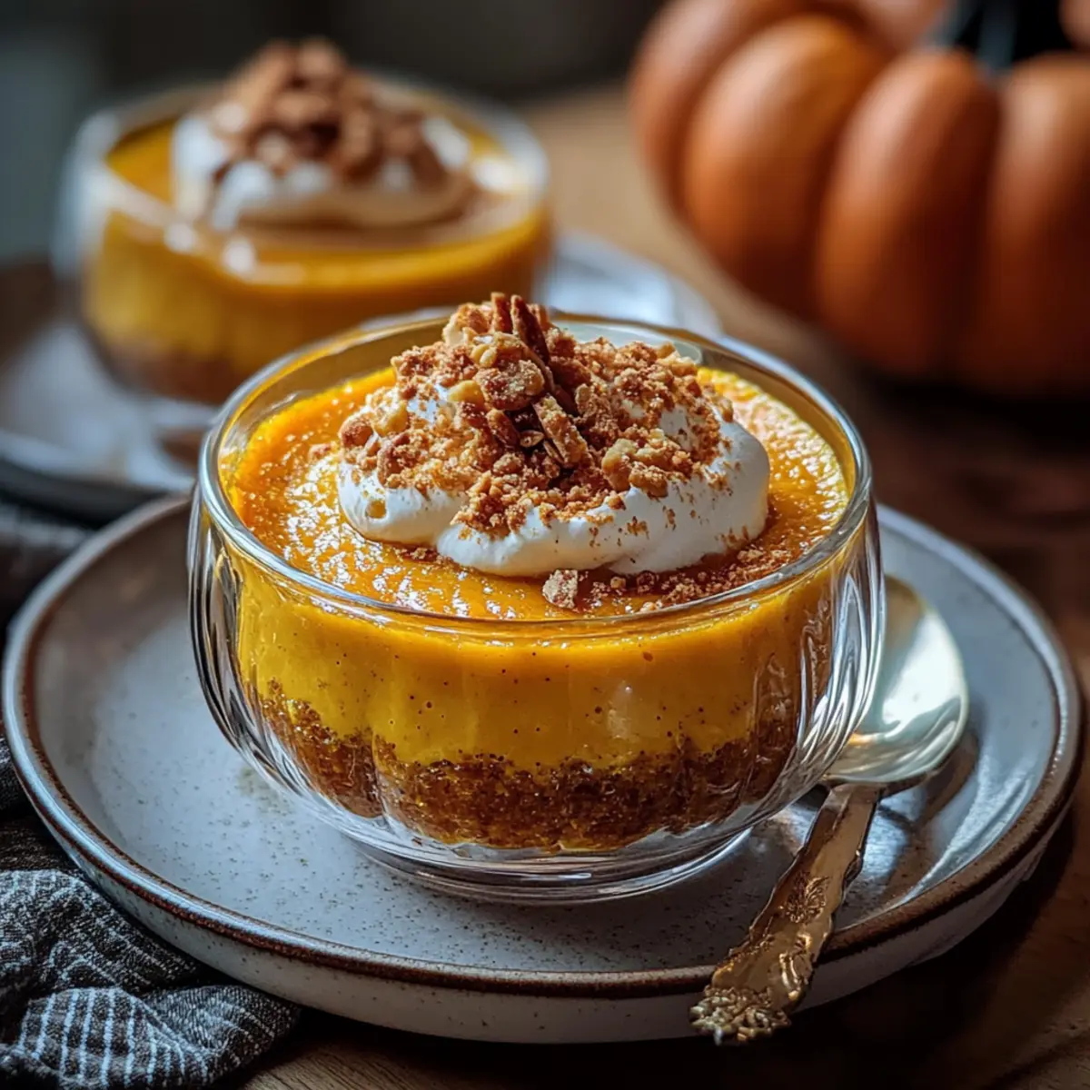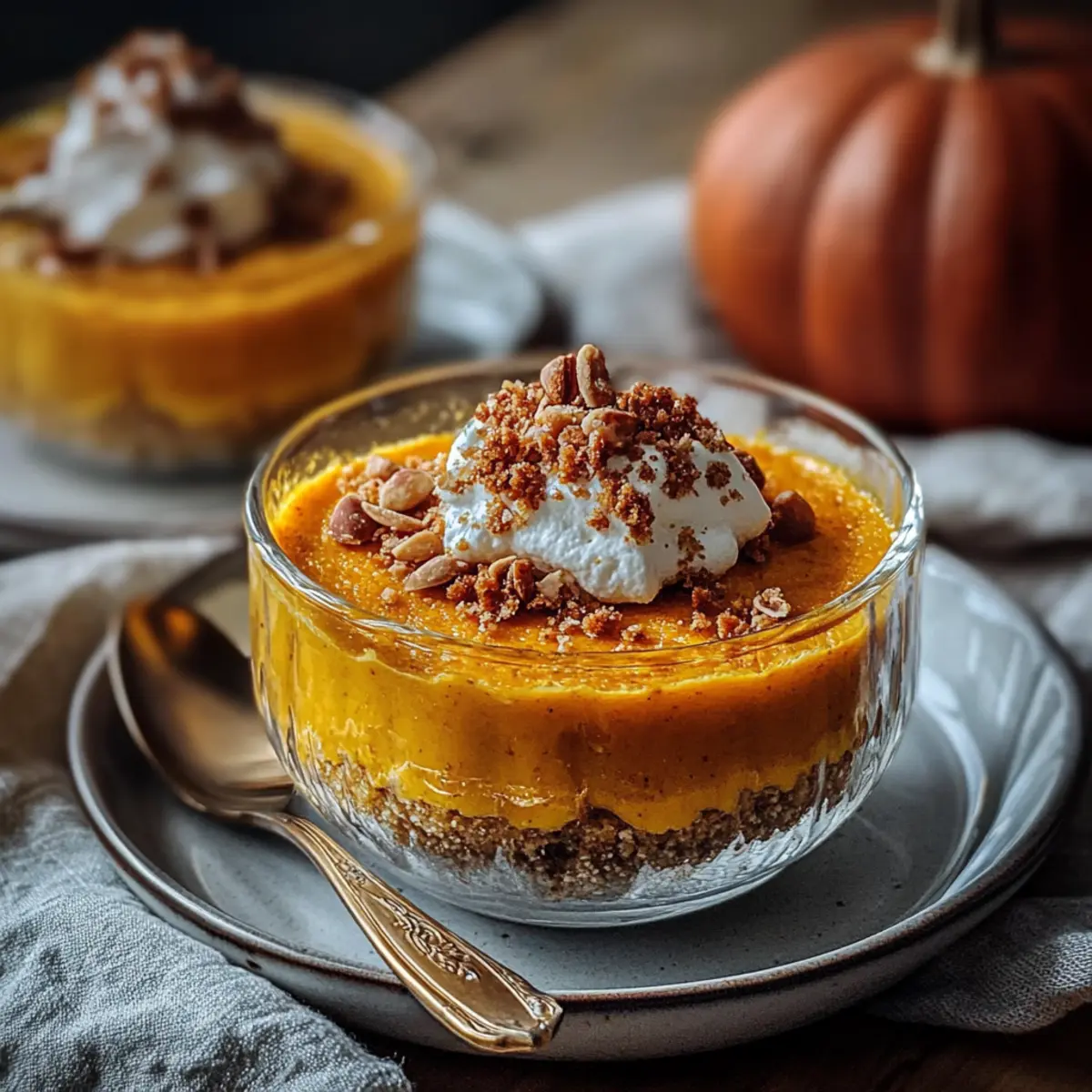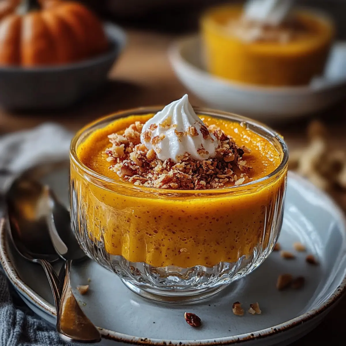 Jump to Recipe Print RecipeThere’s something magical about the aroma of warm spices wafting through the kitchen, especially as the seasons shift and cozy vibes take over. That’s exactly what you’ll experience with this delightful Baked Pumpkin Pudding! With its rich, earthy flavor and easy preparation, this pumpkin-based dessert is ideal for those moments when you crave comfort without spending hours in the kitchen. Just grab a pot and whisk, and in under an hour, you’ll have a luscious, custard-like treat that’s sure to impress your family and friends. Plus, it’s versatile enough to adapt with optional add-ins or toppings, making it a real crowd-pleaser. What’s your favorite way to enjoy pumpkin-inspired desserts? Why is Baked Pumpkin Pudding a must-try? Comforting Aroma: The warm blend of cinnamon and nutmeg creates an inviting atmosphere that feels like a hug in dessert form. Quick Preparation: With just a pot and whisk, you can whip this up in no time, making it perfect for busy weeknights. Creamy Texture: The custard-like consistency is both smooth and satisfying, providing a dessert experience you won’t forget. Versatile Add-Ins: Feel free to jazz it up with chocolate chips or nuts, allowing you to tailor it to your preferences. Perfect for Sharing: Whether for a family gathering or a cozy dinner with friends, this pudding will surely impress everyone at the table. If you love pumpkin desserts, check out our Banana Pudding Parfait for a sweet pairing! Baked Pumpkin Pudding Ingredients • Gather these essential ingredients for your creamy delight! For the Pudding Base Pumpkin Puree – The star of this dish, providing rich flavor and color; use canned or fresh pumpkin puree for convenience. Sugar – Sweetens the pudding and balances the earthiness of pumpkin; adjust to taste if necessary. Milk – Contributes creaminess and moisture; almond or oat milk can substitute for a dairy-free option. Large Eggs – Binds the ingredients together, giving the pudding its custard-like texture; ensure they are at room temperature for optimal blending. Vanilla Extract – Enhances flavor with warmth; pure vanilla is preferred for a deeper taste. For the Spices Ground Cinnamon – A warm, comforting spice that’s essential for pumpkin desserts; increase the amount for an extra cozy flavor. Ground Nutmeg – Complements cinnamon beautifully with its nutty profile; can be omitted if you’re out. Ground Ginger – Adds subtle spiciness and rich flavor; fresh ginger can provide an even bolder kick. Salt – Elevates all the flavors, balancing the sweetness of the pudding. For the Structure All-Purpose Flour – Provides structure; alternative flours can be used for gluten-free versions, though results may vary. Enjoy your journey of making this Baked Pumpkin Pudding—a comforting autumn dessert that brings warmth and joy! Step‑by‑Step Instructions for Baked Pumpkin Pudding Step 1: Preheat the Oven Begin by preheating your oven to 350°F (175°C), ensuring it’s hot enough for baking the Baked Pumpkin Pudding. This temperature will help the pudding set perfectly and achieve that rich, golden color on top. While the oven is heating, gather your mixing bowl and whisk, as you’ll need these to combine the ingredients. Step 2: Mix the Base Ingredients In a large mixing bowl, whisk together the pumpkin puree, sugar, milk, eggs, and vanilla extract until the mixture is smooth and well-combined. Aim for a silky consistency, which is essential for the pudding’s velvety texture. This should take about 2-3 minutes of whisking to ensure everything is evenly blended. Step 3: Add the Spices and Salt Once your base is ready, add in the ground cinnamon, nutmeg, ginger, and salt. Whisk these spices thoroughly into the mixture, allowing their warmth to infuse the pumpkin. You’ll want to see a consistent color throughout, which signals that the Baked Pumpkin Pudding will boast a delightful and aromatic flavor profile when baked. Step 4: Incorporate the Flour Gradually sprinkle in the all-purpose flour as you continue to whisk the mixture. This step is critical for ensuring that the batter is lump-free, resulting in a smooth and creamy pudding. As you mix, take note that the batter should thicken slightly, forming a pourable yet substantial consistency. Step 5: Prepare the Baking Dish Grease a 9×13 inch baking dish with butter or non-stick spray to prevent the pudding from sticking. Once greased, carefully pour the pumpkin batter into the prepared baking dish, spreading it evenly to ensure it bakes uniformly. You should see a thick, rich mixture ready to transform into your delightful dessert. Step 6: Bake the Pudding Place the baking dish in the preheated oven and bake for about 45 minutes. As it bakes, you’ll notice the edges puffing up and the center should have a slight jiggle, resembling gelatin. Test for doneness by inserting a toothpick into the center—if it comes out clean, your Baked Pumpkin Pudding is ready! Step 7: Cool and Serve After removing the pudding from the oven, let it cool for a few minutes before serving. This brief cooling will help it set a bit more and makes it easier to slice if you desire. You can serve it warm or at room temperature, perhaps with a dollop of whipped cream or a scoop of vanilla ice cream for a lovely finishing touch. Baked Pumpkin Pudding Variations Feel free to get creative with your Baked Pumpkin Pudding and tailor it to your taste! Nutty Crunch: Add chopped pecans or walnuts for delightful texture and a satisfying crunch. They’ll contrast beautifully with the creamy pudding, bringing an extra layer of flavor. Maple Sweetness: Substitute maple syrup for sugar for a warmer, richer flavor profile. This twist can elevate your dessert and impart a lovely hint of autumn. Whipped Delight: Serve your pudding with a generous dollop of whipped cream or a scoop of vanilla ice cream. This adds a luxurious touch, ensuring each bite is decadent. Choco