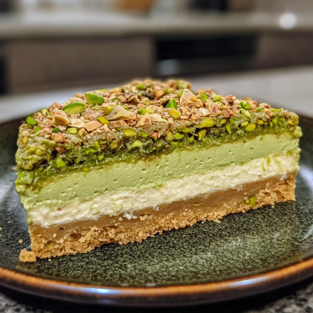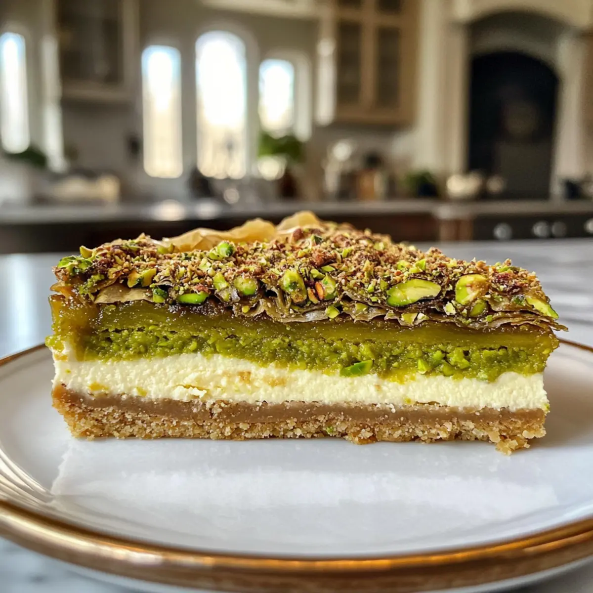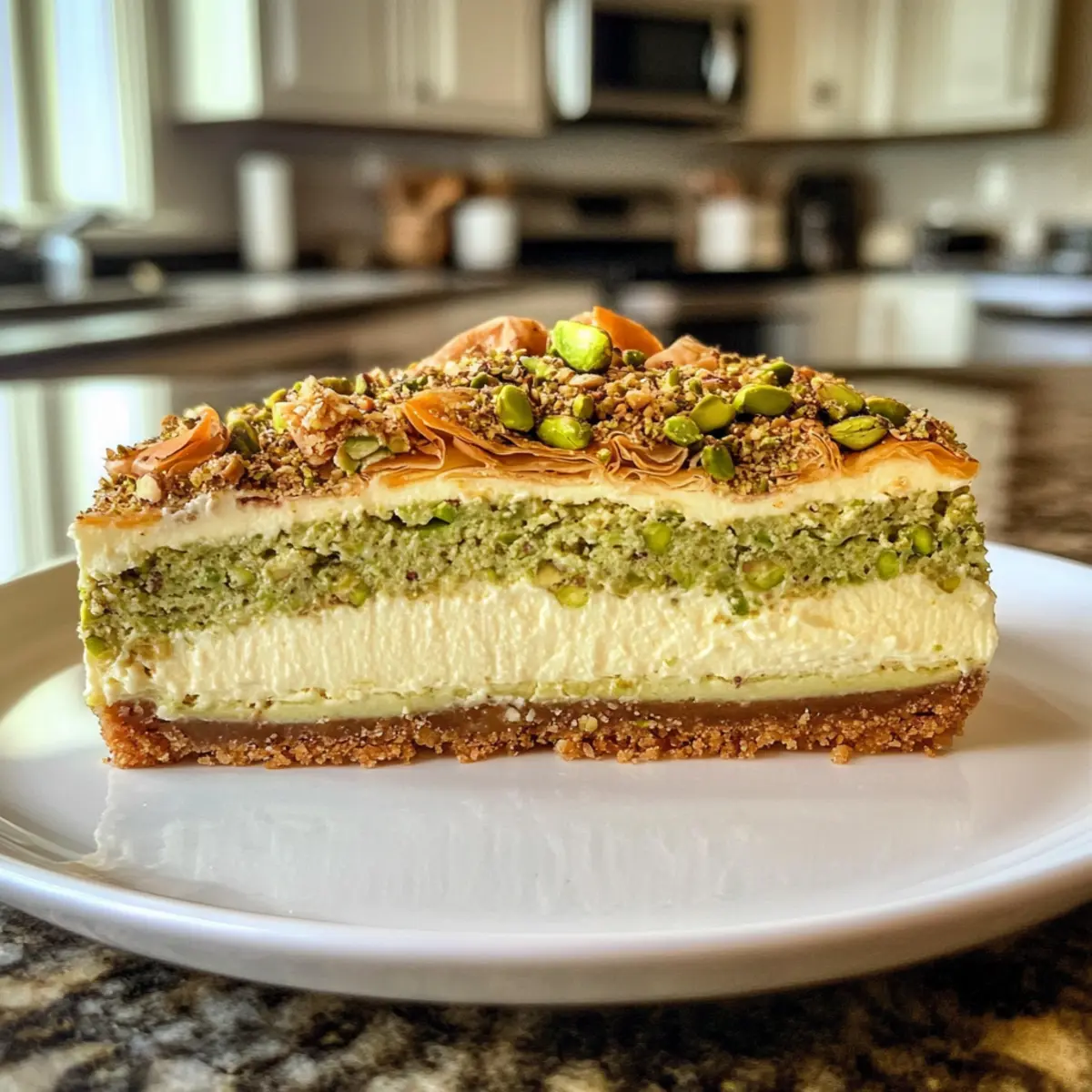 Jump to Recipe Print RecipeAs I was sifting through my spice cabinet the other day, I stumbled upon a jar of fragrant ground pistachios, transporting me back to a charming café in the heart of Istanbul. That delightful memory sparked my inspiration for this Baklava Pistachio Cheesecake, a unique fusion that turns the classic dessert into a layered masterpiece. With a nutty pistachio shortbread crust, a rich and creamy filling infused with honey, and a delightful crunchy baklava topping, it’s a showstopper that will leave your guests raving. Perfect for gatherings or quiet evenings at home, this cheesecake is not only a big crowd-pleaser but also allows for customization to suit your palate. What nut or spice combo will you choose to make it your own? Why Will You Love This Cheesecake? Uniqueness: This Baklava Pistachio Cheesecake pairs two beloved traditions—Middle Eastern baklava and creamy cheesecake, creating a delightful twist. Ease of Preparation: Each step is simple and straightforward, allowing both novice and experienced bakers to shine! Customizable Flavors: You can easily adapt this recipe with different nuts or spices; options like hazelnuts or cardamom make for an exciting twist. Perfect for Any Occasion: Whether it’s a festive gathering or a cozy dinner, this dessert steals the show! Crowd-Pleasing Delight: Your friends and family are sure to be captivated by its stunning layers and rich, bold flavors. Explore even more delicious flavors with our Honey Cheesecake Salted or Blueberry Crisp Cheesecake. Baklava Pistachio Cheesecake Ingredients For the Crust • Pistachio Shortbread – This nutty base adds a delicious crunch and buttery flavor; for a gluten-free option, almond flour works well. For the Filling • Cream Cheese – Choose softened cheese for easy blending, providing that rich and creamy texture everyone adores in cheesecakes. • Sugar – Sweeten to taste; substitute with honey for a more authentic flavor that complements the Middle Eastern theme. • Honey – Adds natural sweetness and depth; feel free to explore maple syrup if you prefer! • Eggs – Essential for binding, ensure they are beaten until pale to achieve the perfect filling consistency. For the Topping • Baklava Pieces – Sprinkle over for that delightful crunch; using premade baklava simplifies the process while maintaining flavor. • Optional Nuts (e.g., walnuts, almonds) – Experiment with these additions for extra texture and flavor; consider spices like cinnamon for warmth. Step‑by‑Step Instructions for Baklava Pistachio Cheesecake Step 1: Preheat the Oven Begin by preheating your oven to 350°F (175°C) to prepare for baking. This temperature is crucial for achieving a perfectly set Baklava Pistachio Cheesecake. As the oven warms up, gather your ingredients and equipment, including an 8-inch springform pan, mixing bowl, and electric mixer, to streamline your baking process. Step 2: Prepare the Pistachio Shortbread Crust In a mixing bowl, combine your ingredients to create the pistachio shortbread crust. Blend the crushed pistachios with flour and melted butter until the mixture resembles damp sand. Press this mixture firmly into the bottom of your springform pan, ensuring an even layer. Bake for 10–12 minutes or until it’s lightly golden and fragrant, then set it aside to cool completely. Step 3: Make the Cheesecake Filling In a large mixing bowl, beat together the softened cream cheese and sugar until smooth and creamy, about 2–3 minutes. Gradually add in the honey and eggs, mixing just until fully incorporated. Be careful not to overmix, as this can affect the texture of your Baklava Pistachio Cheesecake. The filling should be silky and homogeneous, ready to pour over the cooled crust. Step 4: Add the Baklava Topping Pour the luscious cheesecake filling over the cooled pistachio crust in your springform pan. Gently place pieces of baklava on top of the filling, ensuring they’re evenly distributed for delightful crunch in every bite. This layer adds beautiful texture and embodies the essence of baklava, making your dessert even more enticing. Step 5: Bake the Cheesecake Slide the cheesecake into your preheated oven and bake for 40–45 minutes. Keep an eye on it; the edges should look set while the center remains slightly jiggly. This slight wobble is key as it will firm up while cooling, creating that perfect creamy consistency you desire in Baklava Pistachio Cheesecake. Step 6: Cool and Refrigerate Once baked, remove the cheesecake from the oven and allow it to cool at room temperature. This cooling process can take up to an hour, after which refrigerate it for at least 4 hours, or overnight if possible. Chilling not only sets the cheesecake but allows the flavors to meld beautifully, resulting in a more delicious dessert. Step 7: Serve and Garnish When you’re ready to serve your Baklava Pistachio Cheesecake, gently run a knife around the edges of the pan to loosen it before removing the sides. For an extra touch, garnish with crushed pistachios or a drizzle of honey. This finishing touch enhances the presentation and offers a delightful contrast to the creamy filling. Make Ahead Options These Baklava Pistachio Cheesecakes are perfect for meal prep enthusiasts! You can prepare the pistachio shortbread crust and the cheesecake filling up to 24 hours in advance, ensuring a fantastic flavor while saving you time on the day you plan to serve. Simply bake the crust and allow it to cool before storing it in the refrigerator. For the filling, mix and refrigerate it separately until you’re ready to combine and bake. When you’re ready to finish the recipe, pour the chilled filling over the crust, top with baklava, and bake as directed. This way, you’ll have an impressive dessert that’s just as delicious, with minimal stress right before serving! How to Store and Freeze Baklava Pistachio Cheesecake Fridge: Keep leftover Baklava Pistachio Cheesecake in an airtigh