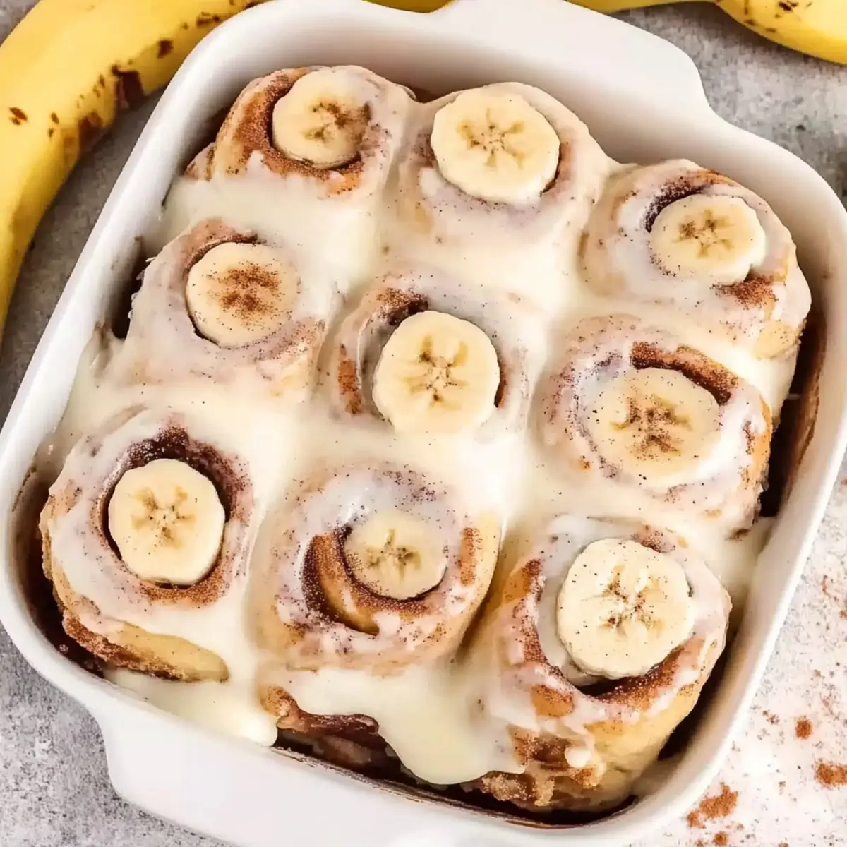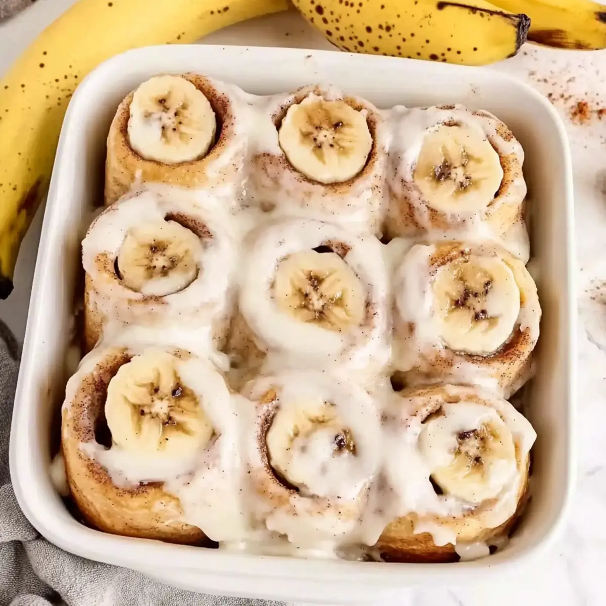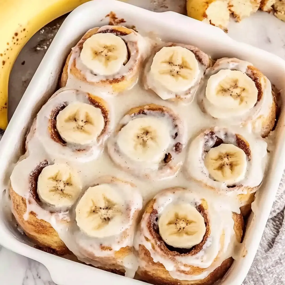 Jump to Recipe Print RecipeThere’s something magical about a fresh batch of cinnamon rolls wafting through the kitchen, isn’t there? The aroma wraps around you like a warm hug, instantly making everything feel cozy and inviting. My Eggless Banana Bread Cinnamon Rolls combine the irresistible flavors of sweet, ripe bananas with the comforting spices of cinnamon, resulting in a delightful treat perfect for brunch gatherings or a special breakfast. Not only are they surprisingly easy to make, ideal for bakers of any skill level, but they can also be prepared in advance—just pop them in the oven when you’re ready! With a luscious cream cheese frosting to top it all off, these rolls are bound to win over your taste buds and the hearts of your loved ones. Are you ready to discover this delicious twist on a classic favorite? Why will you adore this recipe? Irresistible Flavor: The combination of banana and cinnamon results in a sweet, spicy symphony that dances on your palate, ensuring each bite is a delight. Effortless Preparation: With simple ingredients and straightforward instructions, you’ll find these Eggless Banana Bread Cinnamon Rolls perfect for both beginner and experienced bakers alike. Make-Ahead Convenience: Prepare them the night before and bake fresh in the morning; ideal for brunch or a cozy breakfast moment. Crowd-Pleasing Treat: Serve warm, alongside coffee or tea, and watch family and friends rave about this delectable twist on classic flavors. Versatile Options: Feel free to add nuts or chocolate chips for an extra indulgent experience. If you’re seeking additional inspiration, don’t miss my recipe for Banana Pudding Parfait or a refreshing Watermelon Banana Smoothie. Banana Bread Cinnamon Rolls Ingredients For the Dough Milk – Provides moisture and helps activate the yeast; use lukewarm milk (120-130°F) for best results. Unsalted Butter – Adds richness and tenderness to the dough; make sure it’s soft for easy spreading. Granulated Sugar – Sweetens the dough; can be substituted with coconut sugar for a deeper caramel flavor. All-Purpose Flour – Forms the structure of the rolls; do not exceed 5 cups to avoid dense rolls. Instant Yeast – Essential for dough rising; can be replaced with active dry yeast (just increase the rise time). Salt – Enhances flavor and strengthens the dough; key for balanced taste. Mashed Banana – Binds the dough and adds delicious banana flavor; about 1 large banana yields enough mash. For the Filling Brown Sugar – Adds sweetness and caramel notes; sprinkle generously for the best flavor. Ground Cinnamon – Provides warmth and spice; adjust to taste for your perfect balance. Sliced Banana – Adds extra banana goodness; use perfectly ripe bananas for maximum sweetness. For the Topping Heavy Cream – Poured over rolls before baking to ensure softness; can substitute with almond milk for a dairy-free option. Cream Cheese – Key for the frosting, offering a rich, tangy flavor; substitute with a non-dairy cream cheese for a vegan option. Powdered Sugar – Sweetens the frosting; adjust the amount based on your desired sweetness level. Vanilla Extract – Adds depth to the flavor; feel free to replace with almond extract for a different twist. Step‑by‑Step Instructions for Banana Bread Cinnamon Rolls Step 1: Warm the Milk Mixture Begin by gently heating the milk in a saucepan over low-medium heat until it reaches a temperature between 120°F and 130°F, ensuring you can comfortably hold your finger in it. Stir in the unsalted butter and granulated sugar until the butter fully melts, creating a warm, inviting mixture perfect for activating the yeast. Step 2: Combine Dry Ingredients In the bowl of a stand mixer fitted with a dough hook, combine all-purpose flour, instant yeast, and salt. Mix these dry ingredients briefly before adding the warmed milk mixture and the mashed banana. This will help create a flavorful and cohesive dough as you begin to mix them together. Step 3: Knead the Dough Set the mixer to a medium speed and knead the dough for 6 to 8 minutes until it’s smooth and elastic. You’ll know it’s ready when it is slightly sticky to the touch but pulls away cleanly from the sides of the bowl. This texture is crucial for your Banana Bread Cinnamon Rolls to be soft and fluffy. Step 4: First Rise Transfer the kneaded dough to a lightly greased bowl, cover it with a clean kitchen towel, and let it rise in a warm area for 1 to 1.5 hours. You’ll know it’s ready when it has doubled in size, puffed up beautifully, and smells aromatic—a sign of the yeast doing its work! Step 5: Prepare for Filling Once the dough has risen, gently punch it down and roll it out on a floured surface into a rectangle, about 1/4 inch thick. Spread softened butter generously over the surface, then sprinkle an even layer of brown sugar and ground cinnamon on top, followed by a layer of sliced banana for that delicious filling. Step 6: Roll the Dough Starting from one edge, carefully roll the dough tightly into a log, ensuring the filling doesn’t spill out. Pinch the seam to seal it, then use a sharp knife to cut the log into 12 equal sections. Each piece should look enticing and ready to rise again, showcasing all that delightful filling. Step 7: Second Rise Place the cut cinnamon rolls into a greased baking dish, ensuring they are close but not squished together. Cover them once more and allow them to rise until puffy, which should take between 45 to 75 minutes. Keep an eye on them—this makes your Banana Bread Cinnamon Rolls even fluffier. Step 8: Preheat and Add Cream Preheat your oven to 350°F (177°C) as you wait for the rolls to finish rising. Carefully pour warmed heavy cream evenly over the risen rolls—this step ensures they bake up soft and moist. Watch for that golden-brown glow on top as they bake for 30 to 35 minutes. Step 9: Frost the Rolls After removing the rolls from the oven, let them cool slightly for aroun