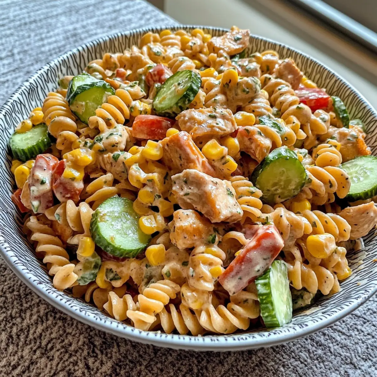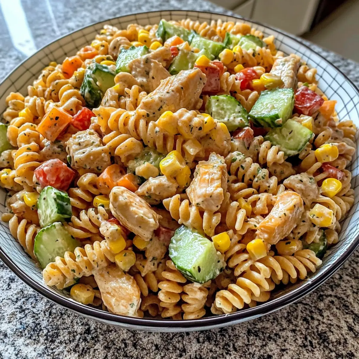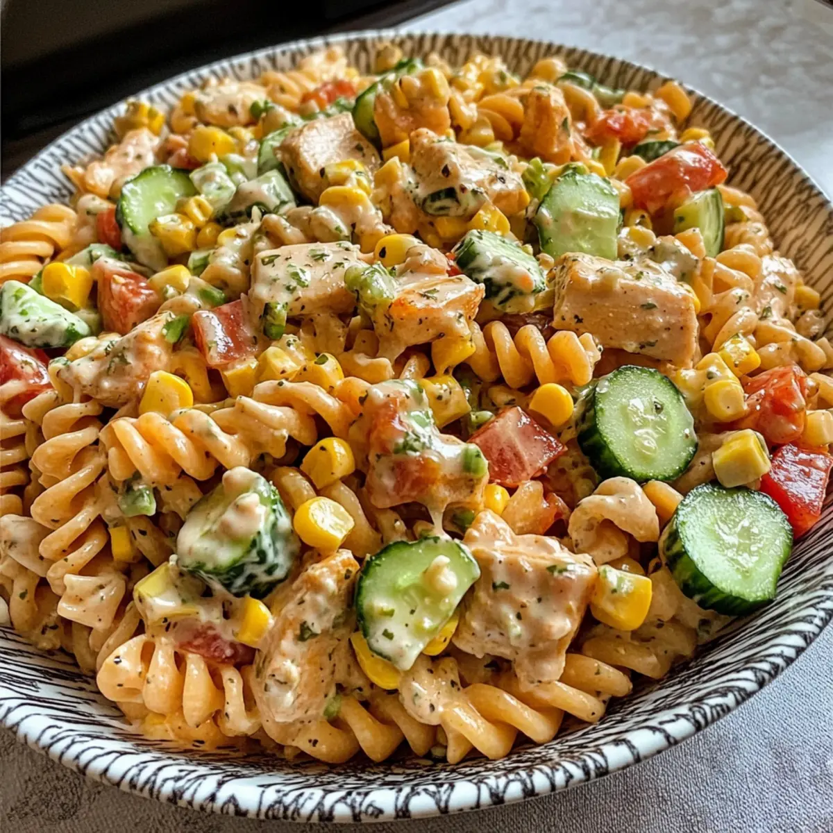 Jump to Recipe Print RecipeAs summer sizzles and outdoor gatherings beckon, I find myself drawn to the vibrant flavors of the season. This Summer-Ready Barbecue Chicken Pasta Salad is my go-to dish, brimming with crisp cucumbers, sweet corn, and hints of tangy barbecue sauce. It’s not just a meal; it’s a celebration of everything I love about summer cooking! With quick prep time and the flexibility to use your favorite pasta shapes, this recipe is perfect for those busy days or casual get-togethers. Plus, it’s a satisfyingly hearty option that can be enjoyed as a side or a stand-alone lunch. Who could resist diving into this delicious medley at your next backyard barbecue? Let’s whip up a bowl of sunshine together! Why is this pasta salad a must-try? Simplicity in preparation makes this Barbecue Chicken Pasta Salad an effortless dish for any occasion. Bursting with refreshing flavors, it combines crispy veggies and tender chicken for a delightful bite. Versatility shines through as you can easily swap pasta shapes or BBQ sauces to suit your taste. Crowd-pleasing and satisfying, it’s perfect as a hefty side or a main dish. For a complete meal, consider pairing it with a zesty Chicken Crunch Salad or the colorful Rainbow Chicken Salad. Enjoy the taste of summer in every forkful! Barbecue Chicken Pasta Salad Ingredients For the Salad • Chicken Breasts – This is the main protein source; use boneless for easy prep. • Olive Oil – Ideal for sautéing chicken; any cooking oil can be a substitute. • Whole Kernel Corn – Adds sweetness and texture; frozen corn works as a great alternative. • Seedless Cucumber – Provides a refreshing crunch; substitute with bell peppers for added color. • Red Bell Pepper – Sweet and crunchy; feel free to swap with yellow or green bell peppers. • Red Onion – Brings a sharp flavor; green onions can be used for a milder taste. • Green Onions – Enhances freshness; use regular onions in smaller quantities if needed. • Cheddar Cheese – Offers creaminess and flavor; feel free to experiment with different cheese varieties. • Spiral Shaped Pasta – Holds dressing well, but any pasta shape will work. For the Dressing • Hidden Valley Ranch Dressing Packet – A convenient flavor base; homemade ranch is an option if preferred. • Barbecue Sauce – The star flavor component; any BBQ sauce works for this Barbecue Chicken Pasta Salad. • Soy Sauce – Adds umami depth; use low-sodium if you’re watching salt intake. • Garlic Powder – Enhances the overall taste; freshly minced garlic can be used instead. • Onion Powder – Provides flavor without the texture; can adjust to taste. • Dried Oregano – Offers a herbal note that complements the dish; fresh oregano can be substituted if available. • Dried Parsley – For a pop of color and flavor; fresh parsley can elevate the dish further. Enjoy this delightful and vibrant Barbecue Chicken Pasta Salad that’s perfect for summer gatherings! Step‑by‑Step Instructions for Barbecue Chicken Pasta Salad Step 1: Cook the Pasta Bring a large pot of salted water to a rolling boil, then add your spiral-shaped pasta, cooking according to package directions until al dente, about 8-10 minutes. Drain the pasta and rinse it under cold water to stop the cooking process and cool it down. This rinsing ensures your Barbecue Chicken Pasta Salad stays fresh and doesn’t clump together. Step 2: Prepare the Chicken While the pasta cooks, pat the boneless chicken breasts dry with paper towels. Cut the chicken into bite-sized pieces and toss them in a bowl with olive oil, garlic salt, and freshly ground black pepper. Let this marinate for about 10 minutes to absorb the flavors, while you prepare other ingredients. Step 3: Sauté the Corn In a large skillet, melt 1 tablespoon of butter over medium heat. Add the whole kernel corn, seasoning it with cayenne pepper and black pepper, sautéing for about 5-7 minutes until heated through and slightly caramelized. This brings out the natural sweetness of the corn, creating a delightful balance in your Barbecue Chicken Pasta Salad. Step 4: Cook the Chicken In the same skillet, add a bit more olive oil if needed and heat it to medium-high. Add the marinated chicken pieces and cook for about 6-8 minutes, stirring occasionally, until browned and fully cooked. The chicken should be no longer pink in the center. Mix in a few tablespoons of your favorite barbecue sauce while the chicken is still in the pan, allowing the flavors to meld together. Step 5: Chop the Veggies While the chicken cooks, chop the seedless cucumber, red bell pepper, red onion, and green onions into small, bite-sized pieces. Place these chopped veggies into a large mixing bowl, creating a colorful and crunchy base for your Barbecue Chicken Pasta Salad. Step 6: Dice the Cheese Take your cheddar cheese and cut it into small cubes, ensuring they’re manageable bite-sized pieces. Set the diced cheese aside, ready to be mixed into the salad later, as it will add a creamy richness that complements the BBQ chicken beautifully. Step 7: Prepare the Dressing In a separate bowl, combine the ranch dressing mix with the recommended amount of water per the package instructions. Stir until well mixed and let it chill in the refrigerator. This cooling step enhances the flavors, making it a refreshing addition to your Barbecue Chicken Pasta Salad. Step 8: Mix the Dressing Ingredients In another bowl, whisk together your barbecue sauce, soy sauce, garlic powder, onion powder, dried oregano, and dried parsley. This mixture will enhance the overall flavor of your salad as you combine all components together, creating a deliciously tangy dressing. Step 9: Combine Ingredients In the large bowl with the chopped vegetables, add the cooled pasta, sautéed corn, and the cooked chicken and barbecue sauce mixture. Toss everything together gently to avoid damaging the pasta and vegetables while ensuring an even dis