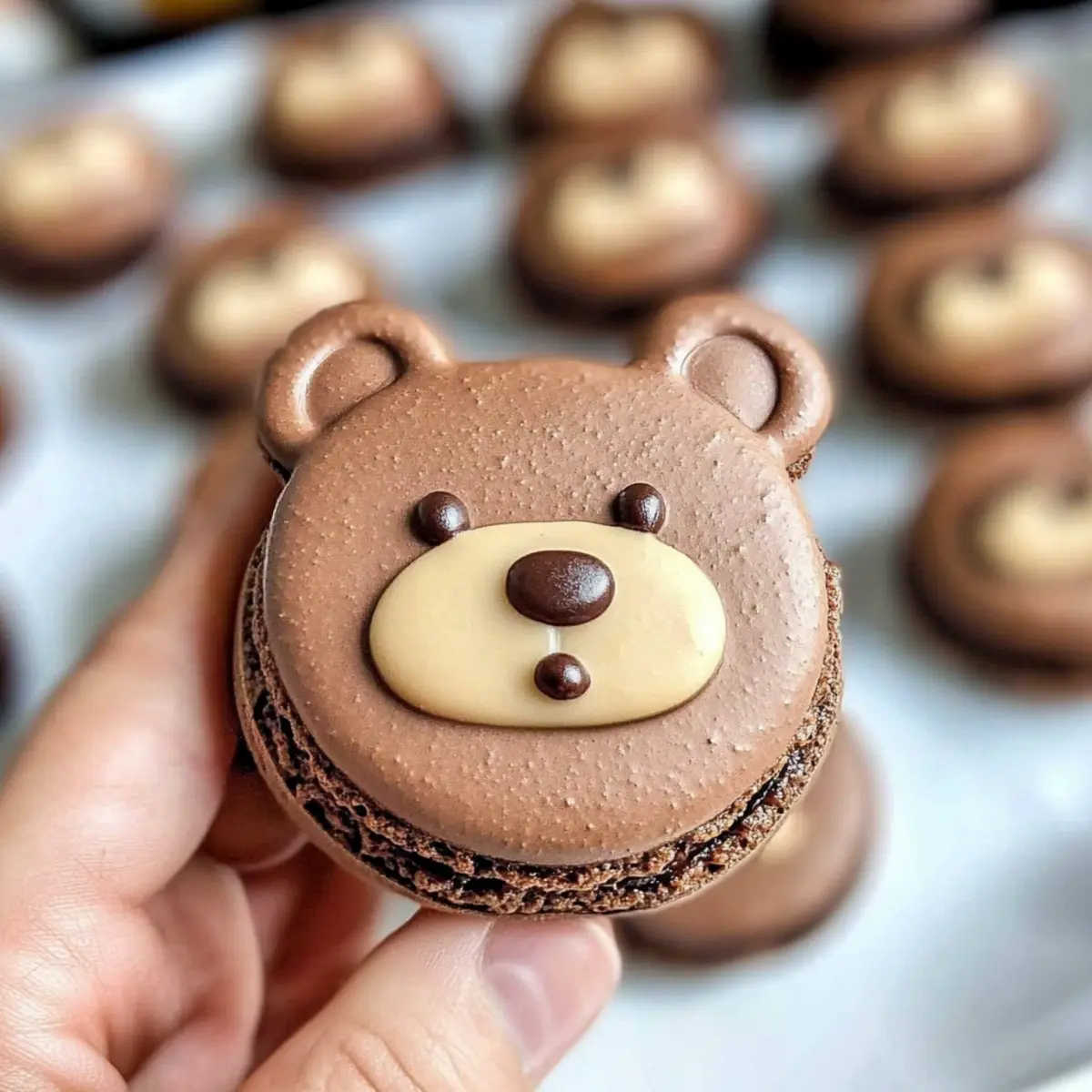 Indulge in delightful Bear Macarons featuring rich dark chocolate filling, a whimsical dessert perfect for any occasion.