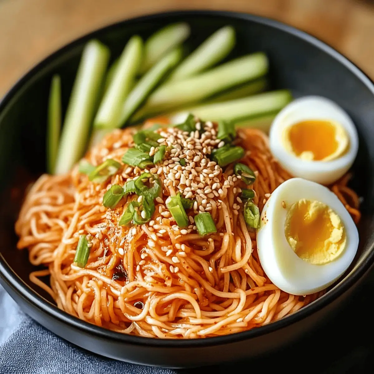 Top each bowl of Bibimmyeon with halved hard-boiled eggs for a protein boost, ensuring they are placed artfully. Sprinkle 1 tablespoon of sesame seeds on top and add a few chopped green onions for a fresh finish. These garnishes will elevate your dish’s visual appeal and flavor.