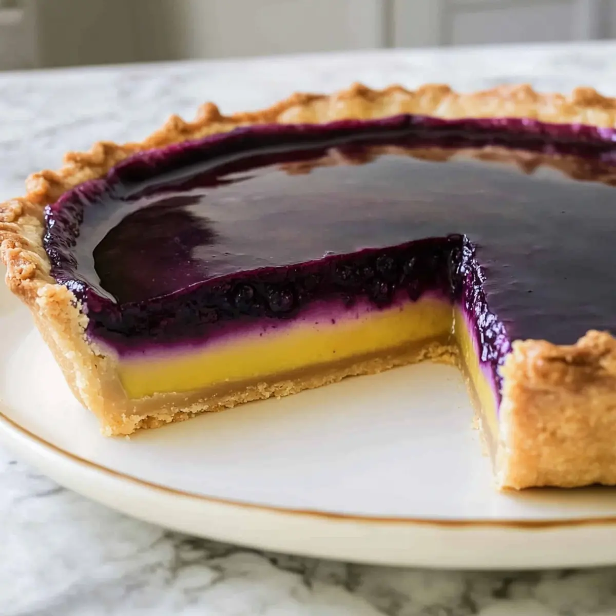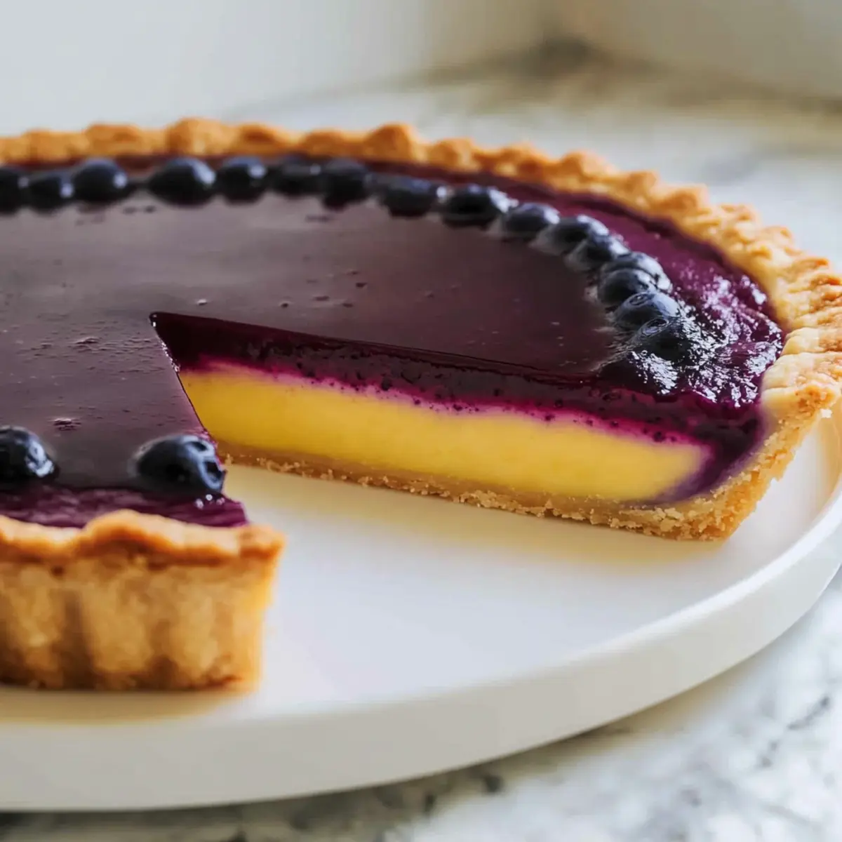 Jump to Recipe Print RecipeThe first time I tasted a Blueberry-Lemon Curd Tart was at a quaint little café tucked away in the countryside, where the aroma of fresh-baked pastries enveloped me like a warm hug. This Naturally Sweetened Blueberry-Lemon Curd Tart is my homage to that delightful moment, merging zesty lemon curd with a vibrant layer of blueberries that just scream summer. What I adore about this recipe is its ability to impress without the guilt; it’s naturally sweetened, making it a lighter take on traditional desserts while still delivering a satisfying punch of flavor. Plus, it’s perfect for gatherings or a special afternoon treat that everyone will enjoy. Ready to elevate your dessert game and wow your guests? Let’s dive into this luscious, layered delight! Why is this tart a must-try? Refreshing, this Blueberry-Lemon Curd Tart packs a flavor punch that will have everyone raving. Naturally sweetened, it offers guilt-free indulgence with wholesome ingredients that keep sugar in check. Eye-catching layers of zesty lemon curd and vibrant blueberries create a stunning centerpiece for any gathering. Easy to make, even novice bakers can tackle this recipe with confidence. Plus, it can be prepared ahead of time—perfect for casual get-togethers or special occasions. If you’re also looking for lighter breakfast options, check out this delicious Sweet Potato Breakfast for more wholesome inspiration! Blueberry-Lemon Curd Tart Ingredients For the Tart Crust All-purpose flour – Provides structure to the crust; a gluten-free flour blend can be used for a gluten-free option. Confectioners’ sugar – Adds sweetness to the crust; substitute with powdered erythritol for a lower-sugar option. Kosher salt – Enhances flavor; no substitutions necessary. Unsalted butter – Key for richness and texture in the crust; dairy-free butter works for a vegan option. Egg yolk – Binds the dough; use a flax egg for a vegan alternative. Heavy cream – Enriches the dough; substitute with unsweetened almond milk if necessary. Vanilla extract – Adds a hint of sweetness; optional but recommended for flavor depth. For the Lemon Curd Lemon zest and juice – Provide primary flavor and acidity; fresh lemons are preferred for a luscious taste. Eggs – Essential for structure and richness; make sure to use large eggs for accurate measurements. Honey – Acts as a natural sweetener and flavor enhancer; maple syrup can serve as a substitute. Unsalted butter – Contributes to the creaminess of the curd; ensure to use it for richness. For the Blueberry Filling Blueberries – The primary fruit flavor; frozen wild blueberries are recommended for enhanced taste. Cornstarch – Serves as a thickener for the blueberry mixture; essential for achieving the right texture. Honey – Adds natural sweetness to the filling; regular sugar can be used if desired. This Blueberry-Lemon Curd Tart is not just a treat; it’s an experience that invites you to savor every delightful layer. Enjoy creating this refreshing dessert with your loved ones! Step‑by‑Step Instructions for Blueberry–Lemon Curd Tart Step 1: Prepare the Tart Crust In a large mixing bowl, combine all-purpose flour, confectioners’ sugar, and kosher salt. Use a pastry cutter to cut in cold, unsalted butter until the mixture resembles coarse crumbs. In a separate bowl, whisk together the egg yolk, heavy cream, and vanilla, then add to the flour mixture. Combine until a dough forms, wrap it in plastic wrap, and chill it in the refrigerator for 1 hour. Step 2: Form the Tart Shell Preheat your oven to 350°F (175°C) while you roll out the chilled dough on a lightly floured surface to about ¼ inch thick. Carefully fit the dough into a 9-inch tart pan, pressing it into the sides and removing any excess. Prick the bottom with a fork to prevent bubbling, then place it in the oven. Bake for 20-25 minutes, or until the crust is lightly golden and fragrant. Step 3: Make Lemon Curd While the tart crust is cooling, prepare the lemon curd. In a medium saucepan, whisk together fresh lemon juice, lemon zest, eggs, and honey. Cook over medium-low heat, stirring constantly until the mixture thickens and reaches 165°F (74°C), about 10-12 minutes. Once thickened, remove from heat and stir in the unsalted butter until smooth and creamy. Pour the lemon curd into the cooled crust and spread evenly. Step 4: Bake the Curd Layer Return the tart to the oven and bake for an additional 10-12 minutes, or until the lemon curd is just set but still jiggles slightly in the center. Keep a close eye to avoid overbaking, as the curd will continue to firm up as it cools. Once done, allow the tart to cool completely at room temperature. Step 5: Prepare Blueberry Filling To make the blueberry filling, combine fresh or frozen blueberries in a saucepan over medium heat. Use a fork to mash the blueberries gently and cook for about 5 minutes, until they start to release their juices. Strain the mixture through a fine mesh sieve into a bowl, discarding solids, and return the liquid to the saucepan. Step 6: Thicken the Blueberry Mixture Add cornstarch and honey to the strained blueberry juice in the saucepan, and bring the mixture to a boil over medium heat while stirring continuously. Cook for 2-3 minutes, or until the filling thickens and becomes glossy. Remove from heat and allow it to cool slightly before proceeding to the next step to prevent mixing. Step 7: Assemble the Tart Once the blueberry filling has cooled slightly, gently pour it over the set lemon curd layer. Use a spatula to spread it evenly, creating a lovely visual layer atop the tart. Carefully refrigerate the assembled tart for at least 2 hours, allowing the flavors to meld and the layers to firm up beautifully. Step 8: Serve and Enjoy After chilling, your Blueberry-Lemon Curd Tart is ready to serve! Slice it into wedges and garnish with fresh berries or mint leaves, if desired. The tart can be kept in the ref
