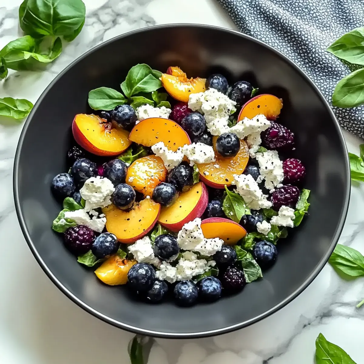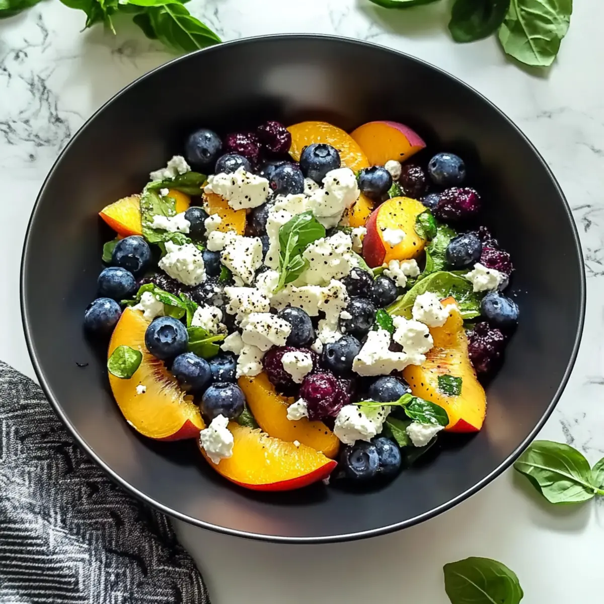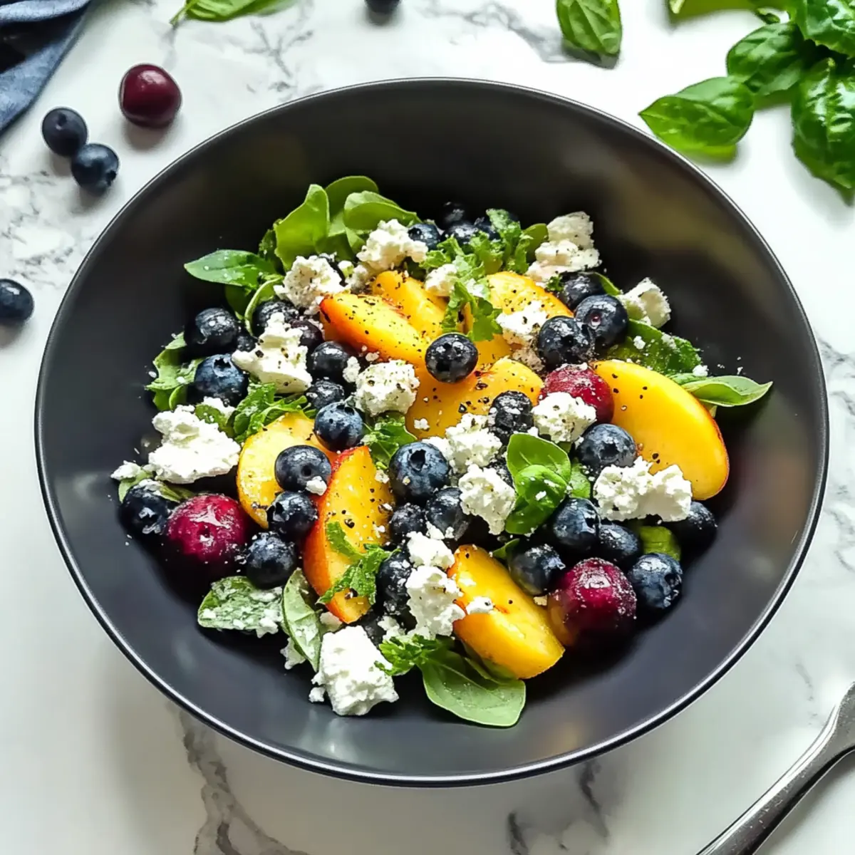Jump to Recipe Print RecipeThere’s something truly magical about summer salads that make you feel alive with every bite. With warm sunshine and gentle breezes, I crave light, refreshing dishes like my Blueberry Peach Feta Salad. This vibrant blend of juicy peaches and sweet blueberries, tossed with tangy feta cheese and crisp mixed greens, creates not just a meal but a celebration of summer’s flavors. What I love most is how quick and easy it is to prepare, making it a perfect choice for those hot days when you want to keep things light. Plus, this salad is gluten-free, ensuring everyone at the table can enjoy it. Are you ready to dive in and whip up this colorful creation? Let’s make every bite count! Why is this salad a must-try? Vibrant Colors: This salad is a feast for the eyes, showcasing a beautiful array of colors that makes any table pop with summer vibrance. Quick to Prepare: Ready in just minutes, this Blueberry Peach Feta Salad is perfect for busy days and spontaneous gatherings without sacrificing flavor. Flavor Harmony: The delightful mix of juicy fruits, creamy feta, and crunchy walnuts creates a symphony of taste and texture that will impress all your guests. Health-Packed: Packed with fresh, nutritious ingredients, it’s an easy way to boost your daily intake of fruits and veggies and can be enjoyed guilt-free. Crowd-Pleaser: Whether for a barbecue or a light lunch, this salad is guaranteed to please everyone, just like my Millionaire Peach Salad or a refreshing Radish Salad Roasted. Embrace the summer vibes and discover how easy it is to elevate your meal experience! Blueberry Peach Feta Salad Ingredients For the Salad Fresh Blueberries – Sweetness and juiciness are enhanced when using fresh; avoid frozen unless well-drained. Ripe Peaches – The juicier and riper, the better the flavor; slice into wedges for the best presentation. Crumbled Feta Cheese – Adds a tangy creaminess that pairs beautifully with the sweetness of the fruit; can swap with goat cheese for a milder taste. Mixed Greens – Offers a fresh, crisp texture; try arugula for an added peppery kick or baby spinach for a delicate touch. Chopped Red Onion – Provides a sharp contrast; swap with green onions for a milder option. Chopped Walnuts – Introduces a crunchy texture and nutty flavor; pecans are a great substitute if you prefer. For the Dressing Honey – Adds sweetness with subtle floral notes; adjust the amount to match your taste preference. Balsamic Vinegar – This tangy component elevates the overall dish; apple cider vinegar can also be used for a different twist. Olive Oil – Infuses richness and helps emulsify the dressing for a smooth finish. Black Pepper & Salt – Essential seasonings that enhance the flavors and balance the sweetness of the salad. Feel free to embrace the summer vibes with this Blueberry Peach Feta Salad – it’s not just a dish, it’s an experience! Step‑by‑Step Instructions for Blueberry Peach Feta Salad Step 1: Rinse the Blueberries Begin by rinsing 1 cup of fresh blueberries under cold running water to remove any dirt. Gently pat them dry with a clean kitchen towel, ensuring they’re perfectly clean and ready to add that burst of sweetness to your Blueberry Peach Feta Salad. Set them aside to keep their lovely plumpness. Step 2: Slice the Peaches While your blueberries are drying, take 2 ripe peaches and slice them into wedges or thin slices. The riper the peaches, the sweeter they will be, enhancing the overall flavor of your salad. Visual cues for ripeness include a fragrant aroma and slight softness when gently pressed. Step 3: Combine the Fruits In a large mixing bowl, combine the freshly rinsed blueberries and sliced peaches. Gently toss the fruits together, allowing them to intermingle, as your Blueberry Peach Feta Salad begins to take shape. The vibrant colors will instantly brighten your kitchen! Step 4: Add the Feta Cheese Next, crumble about ½ cup of feta cheese over the fruit mixture. The creamy tang of the feta provides a lovely contrast to the sweetness of the blueberries and peaches. Use your fingers or a fork to crumble the cheese evenly, ensuring each bite of the salad is rich with flavor. Step 5: Prepare the Greens Now it’s time to wash and dry 4 cups of mixed greens. You can use a salad spinner for efficient drying. Add the thoroughly dried greens to the bowl, creating a beautiful base for your Blueberry Peach Feta Salad. Make sure to incorporate them gently with the fruits to maintain their crispness. Step 6: Sprinkle with Red Onion Chop ¼ cup of red onion finely and sprinkle it over the salad. The sharpness of the onion adds a savory contrast to the sweetness of the fruits and creaminess of the cheese. Take care to distribute it evenly to ensure a balanced flavor in every mouthful. Step 7: Add the Walnuts Roughly chop ¼ cup of walnuts and scatter them over the salad for added crunch. The nutty flavor complements the fruit and feta beautifully. This step adds a wonderful texture that enhances the overall experience of the Blueberry Peach Feta Salad, making it even more delightful. Step 8: Make the Dressing In a separate bowl, whisk together 2 tablespoons of honey, 2 tablespoons of balsamic vinegar, and 3 tablespoons of olive oil. Season with a pinch of black pepper and salt to taste. The dressing should be well combined and smooth, creating a perfect accompaniment for your salad. Step 9: Dress the Salad Drizzle the freshly whisked dressing over the salad mixture, ensuring even coverage. With a gentle touch, toss the salad to combine all the ingredients without breaking down the fruits. This step ensures that each component of your Blueberry Peach Feta Salad is deliciously coated and flavorful. Step 10: Final Taste Adjustments Before serving, taste your salad and adjust the seasoning if needed, adding more salt or honey based on your preference. You can serve the salad immediately or chill it for 1 hour in the refrigerator,
