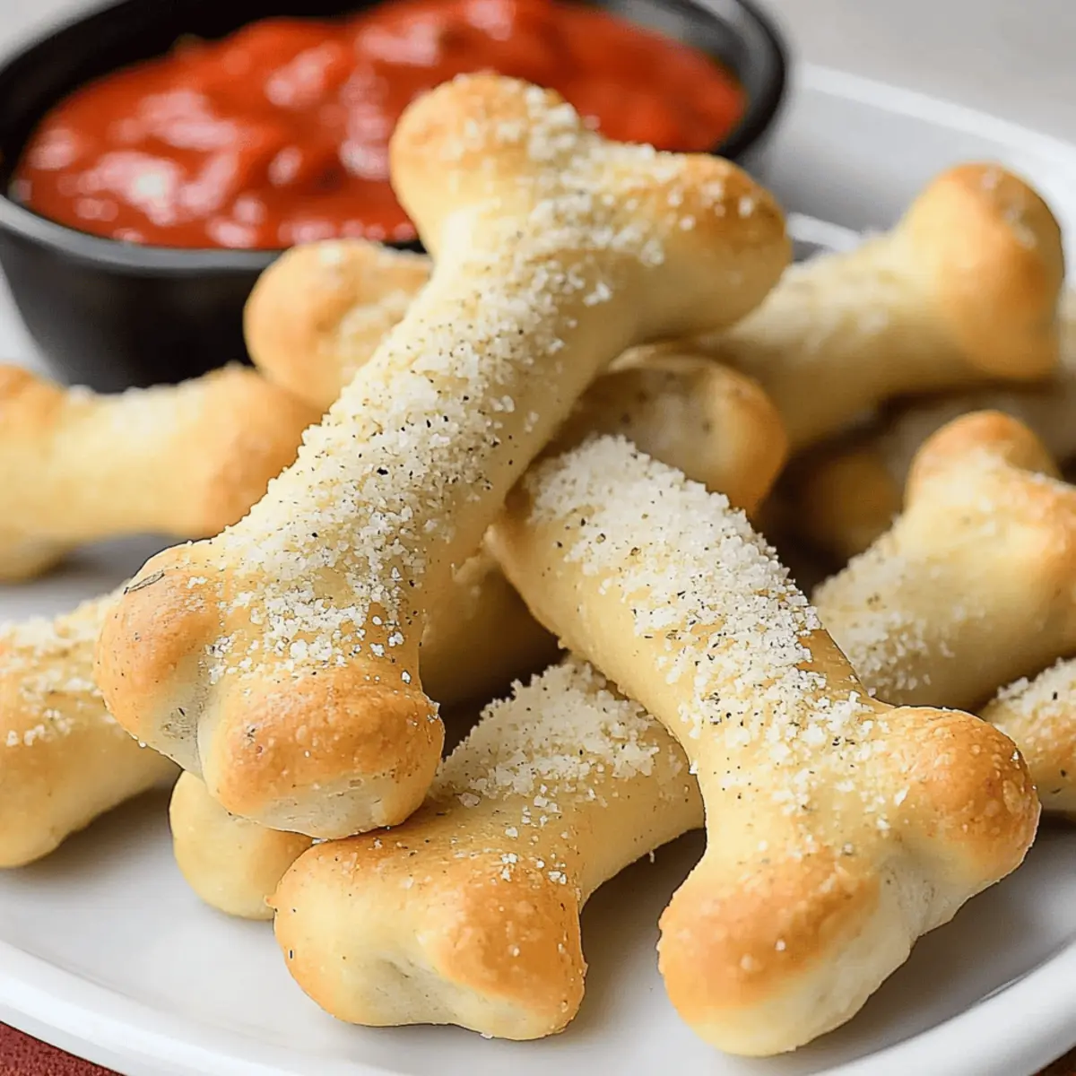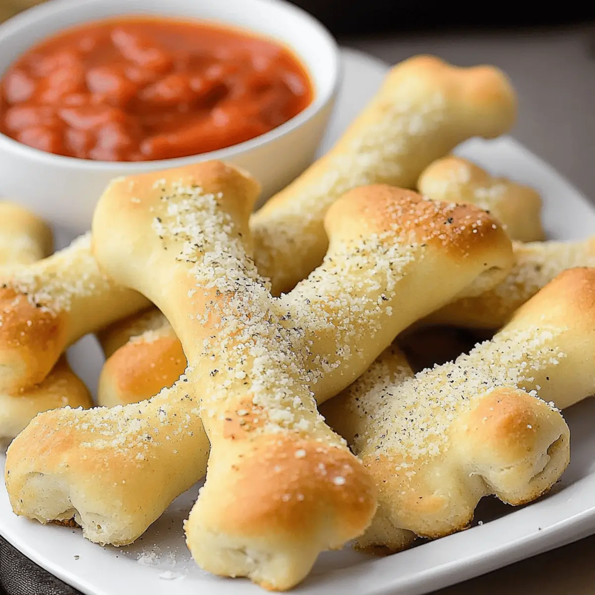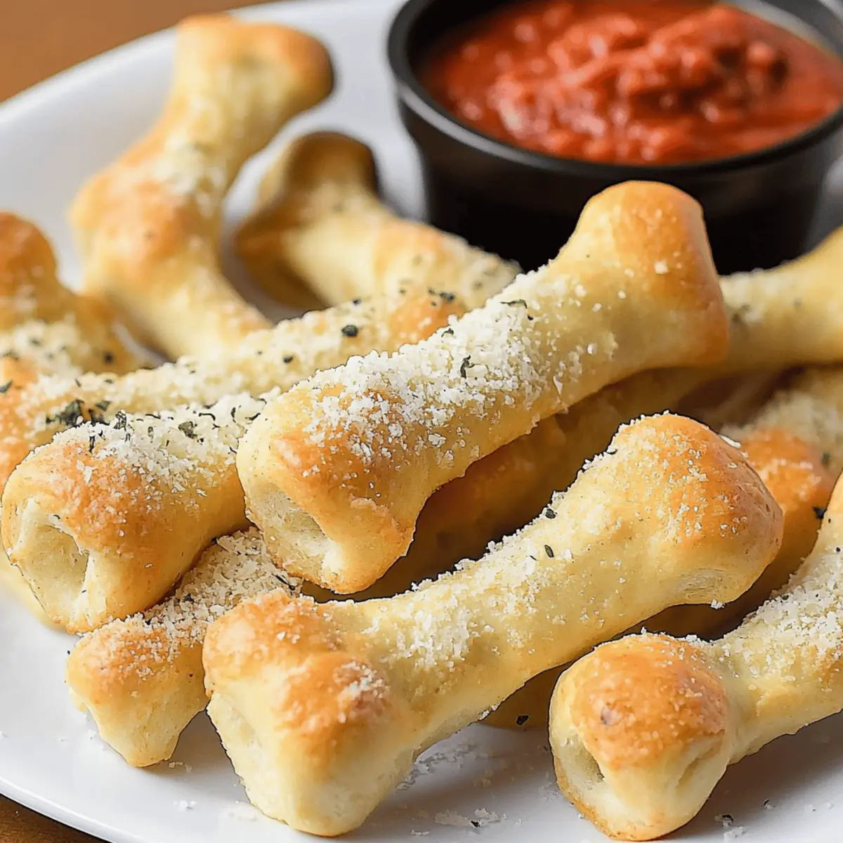 Jump to Recipe Print RecipeAs the leaves turn crisp and shadows grow long, I find myself craving treats that celebrate the spirit of Halloween. What could be more fun than crafting spooky Cheesy Breadstick Bones that not only look delightfully eerie but are also incredibly easy to whip up? These playful appetizers are the perfect blend of cheesy goodness and spooktacular charm, ready to delight friends and family at your Halloween gathering. Plus, they’re customizable—whether you use store-bought dough or go homemade, these crowd-pleasers require minimal prep time, making your holiday entertaining a breeze. So, why not add a dash of creativity to your snacking this season? Let’s bring these fun, bone-shaped delights to life—ready to dip in marinara and serve up some festive fun! Why are these Breadstick Bones a must-try? Spooktacular Fun: These Cheesy Breadstick Bones are not just tasty; they bring a whimsical touch to your Halloween table that kids and adults will love. Easy Preparation: Minimal prep time means you can enjoy more time with your guests, whether you opt for homemade dough or grab store-bought. Customize your Flavors: Feel free to swap out spices or toss in some herbs to suit your taste. Want extra gooeyness? Add mozzarella for cheesy-filled bones! Perfect Pairing: Serve them with marinara sauce for that classic dip that enhances each bite and adds to the spooky experience. Make Ahead: These delights can be frozen unbaked for last-minute festivities, ensuring you always have a fun treat on hand. Try pairing them with other festive snacks, like Cheesy Garlic Breadsticks, for a complete spread! Breadstick Bones Ingredients For the Dough • Warm Water – Hydrates the yeast; use water that feels just warmer than your skin for ideal activation. • Active Dry Yeast – This leavening agent makes the breadsticks rise; always check the expiration date for best results. • Sugar – Feeds the yeast to activate it and helps create that light, airy texture we love. • Salt – Enhances flavor and regulates yeast activity to prevent the dough from over-proofing. • Canola Oil – Adds moisture and softness to the dough; you can swap this out for olive oil for a richer taste. • Flour (All-Purpose) – Provides the structure for these delicious breadstick bones; ensure it’s finely milled for the best outcome. For the Topping • Melted Butter – Adds richness to your breadsticks when brushed on right after baking. • Garlic Salt – Introduces a savory kick; feel free to use regular salt and fresh minced garlic if preferred. • Grated Parmesan Cheese – Sprinkles on top for a cheesy layer; Romano is a great substitute if you’d like to mix it up. For Dipping • Marinara Sauce – Perfect for dipping; choose a store-bought version you adore or concoct your own for a fresh spin. These breadstick bones are not only fun to make, but they also deliver a flavorful punch that will capture your Halloween spirit! Step‑by‑Step Instructions for Breadstick Bones Step 1: Activate the Yeast In a large mixing bowl, combine 1 cup of warm water with 2 teaspoons of active dry yeast and 1 tablespoon of sugar. Stir gently until mixed and let it sit for about 5–10 minutes, or until the mixture becomes foamy. This is a crucial step that ensures your breadstick bones will rise beautifully and have a fluffy texture. Step 2: Prepare the Dough Once your yeast mixture is foamy, add 1 teaspoon of salt, 2 tablespoons of canola oil, and 2 cups of all-purpose flour. Mix with a wooden spoon until the dough starts to form. Gradually incorporate the remaining flour, about 1/2 cup at a time, until a soft but slightly sticky dough forms that pulls away from the sides of the bowl. Step 3: Knead the Dough Transfer the dough onto a floured surface and knead for about 5–8 minutes until it’s smooth and elastic. Visualization here is key: the dough should feel tacky but not stick to your hands. After kneading, place the dough in a greased bowl, cover it with a damp cloth, and let it rise in a warm spot for about 1 hour, or until it has doubled in size. Step 4: Shape the Breadsticks After the dough has risen, punch it down to release the air, then divide it into 16 equal pieces. Roll each piece into a rope about 12 inches long. For the bone shape, cut small slits at both ends and form each rope into a bone shape, ensuring they resemble the spooky breadstick bones you’re aiming for! Step 5: Second Rise Place the shaped breadstick bones on a greased baking sheet, leaving space between each one. Cover them with a clean towel and allow them to rise again for 45 minutes. They should become puffy and nearly double in size, which indicates they’re ready for baking. Step 6: Bake the Breadsticks Preheat your oven to 425°F (220°C). When the oven is hot, bake the breadstick bones for 12–14 minutes or until they turn golden brown. Keep an eye on them; you want that enticing golden hue that signals they are perfectly cooked and ready to impress your guests. Step 7: Add Finishing Touches Once baked, remove the breadsticks from the oven and brush them with melted butter immediately. Sprinkle garlic salt and grated Parmesan cheese on top while they’re still warm, allowing the toppings to meld beautifully. Serve your delightful cheesy Breadstick Bones warm with marinara sauce for dipping, and watch them disappear in no time! Breadstick Bones Variations & Substitutions Feel free to play around with these fun ideas to make your Breadstick Bones even more delightful! Herb-Infused: Add dried Italian herbs like oregano or basil directly into the dough for a fragrant twist. It elevates the flavor and delights herb lovers! Spicy Option: Mix in a pinch of crushed red pepper flakes for a cheeky kick, perfect for those who enjoy a bit of heat in their snacks. Cheese-Stuffed: For an unexpected surprise, stuff each bone with shredded mozzarella before shaping. This melty center is sure to impress! Sweet Twist: Dri