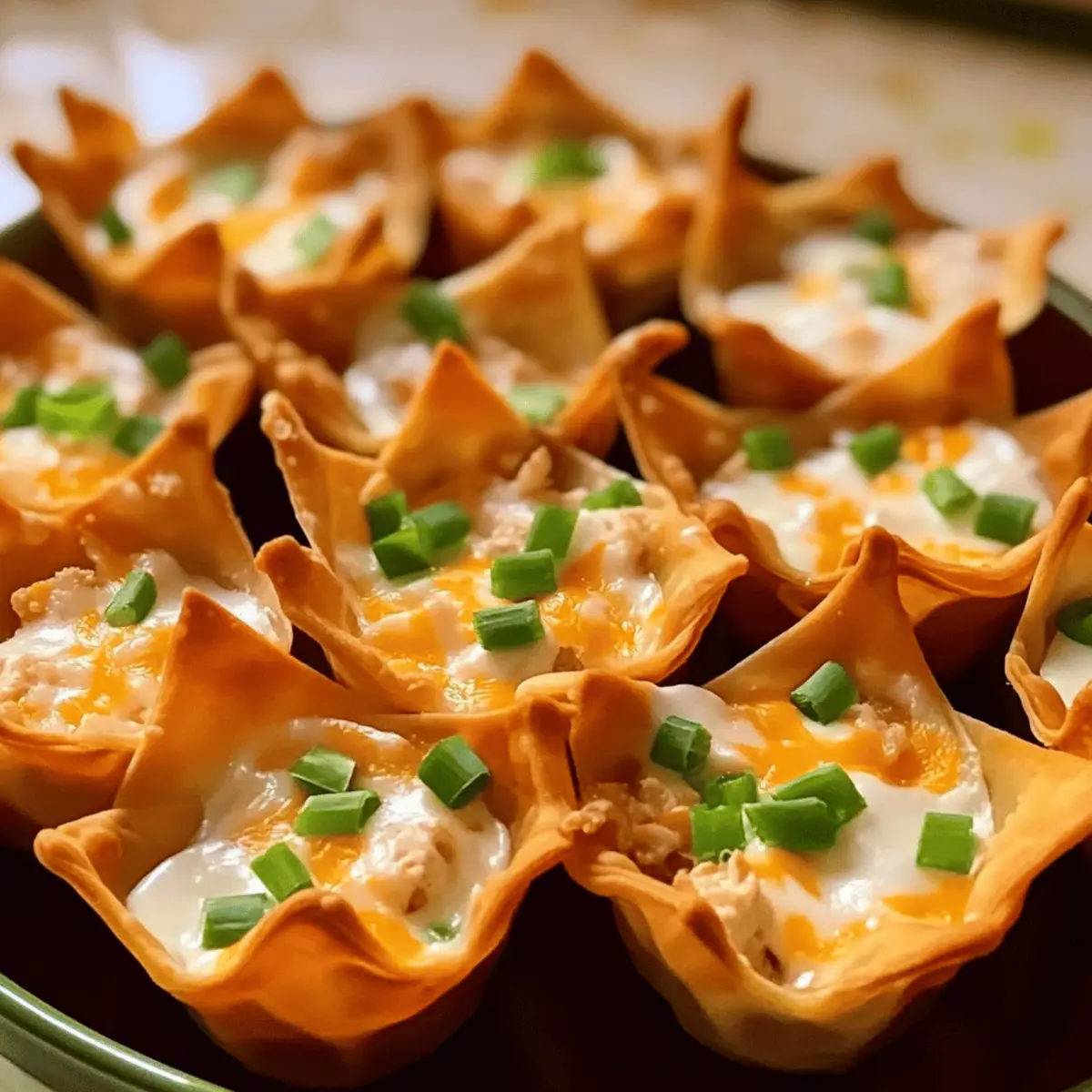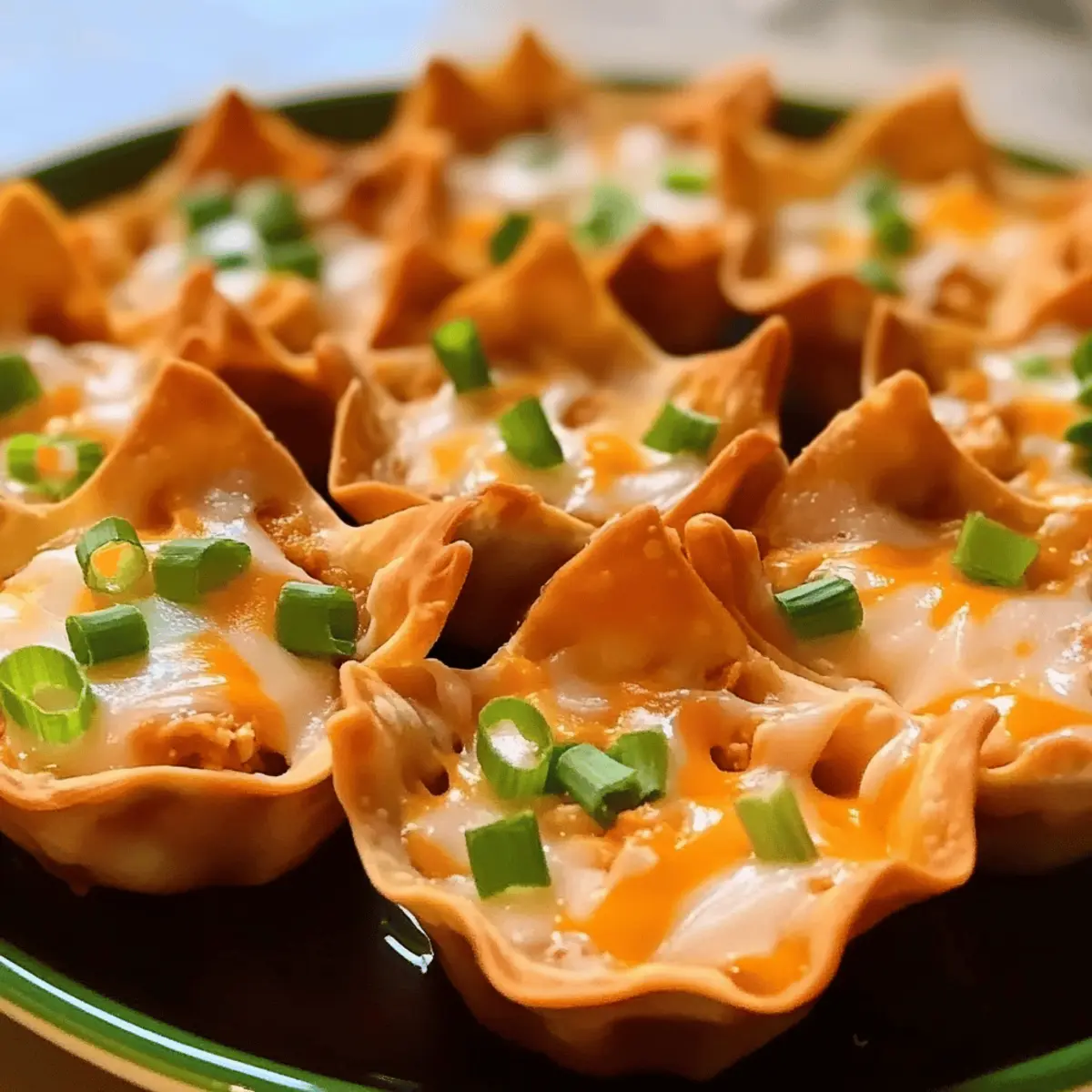 Jump to Recipe Print RecipeAmidst the chaos of a bustling kitchen, I stumbled upon a new favorite that would become my go-to for gatherings: Buffalo Chicken Wonton Cups. These irresistible bite-sized appetizers blend spicy, creamy chicken filling with crispy wonton wrappers, creating a culinary delight that has become a crowd-pleaser among friends and family. With just 35 minutes of prep time, these quick and simple goodies bring a flavorful twist to any occasion while keeping your entertaining stress-free. Plus, they’re versatile enough to adapt to your personal taste—add more buffalo sauce for a fiery kick, or pop in some black beans for extra texture! Are you ready to impress your guests with a fun and delicious snack that’s bound to vanish in moments? Let’s dive into this delightful recipe! Why You’ll Love Buffalo Chicken Wonton Cups Quick Preparation: These delightful appetizers come together in just 35 minutes, making them a stress-free option for any gathering. Crowd-Pleaser: With their spicy and creamy filling encased in a crispy wonton shell, these cups are sure to impress family and friends, vanishing from the table in a heartbeat! Versatility: Feel free to adapt the flavor by adding in more buffalo sauce for an extra kick, or even swap in different proteins like ground turkey or beef for a wholesome twist. Perfect for Any Occasion: Whether it’s game day or a cozy gathering, serve these with ranch or blue cheese dressing for an unbeatable pairing. Nutritious Bite: Each cup packs approximately 240 calories, contributing to a satisfying snack that doesn’t compromise on flavor or enjoyment. For more tempting ideas, try our Air Fryer Buffalo Cauliflower for a lighter bite! Buffalo Chicken Wonton Cups Ingredients For the Filling Cooked Shredded Chicken – Provides the main protein and texture; using rotisserie chicken saves time. Buffalo Sauce – Adds a spicy kick; adjust the amount based on your desired heat level. Cream Cheese – Creates a creamy texture and binds the filling; Greek yogurt can be a lighter substitute. Shredded Cheddar Cheese – Contributes richness and creaminess; Monterey Jack adds a different flavor twist. For the Cups Wonton Wrappers – Forms the crispy base for the cups; dried bean curd sheets can work as a substitute. Cooking Spray – Prevents sticking in the muffin tin, ensuring perfect removal of your Buffalo Chicken Wonton Cups. For the Garnish Green Onions – Adds freshness and color as a topping; although optional, they enhance the overall presentation. Bring these ingredients together, and you’ll be one step closer to creating a delicious snack that’s perfect for any occasion! Step‑by‑Step Instructions for Buffalo Chicken Wonton Cups Step 1: Preheat and Prepare Preheat your oven to 375°F (190°C) and gather a muffin tin. Spray each cup generously with cooking spray to prevent sticking, ensuring that your Buffalo Chicken Wonton Cups release easily after baking. As you wait for the oven to heat, you can prepare the filling, making sure everything is ready for assembly. Step 2: Make the Filling In a mixing bowl, combine your cooked shredded chicken, buffalo sauce, cream cheese, and half of the shredded cheddar cheese. Stir the mixture until it’s fully blended and creamy, creating a flavorful filling that’s rich with the kick of buffalo sauce. This step should take about 5 minutes, and it’s essential to get the right consistency before moving on. Step 3: Assemble the Wonton Cups Place the wonton wrappers into the prepared muffin tin, gently pressing them into the bottom and up the sides to form small cups. Make sure they’re tightly pressed to maintain their shape during baking. This should only take a few minutes, and you’ll want to ensure that each cup is well-formed for the best results with your Buffalo Chicken Wonton Cups. Step 4: Fill the Cups Spoon the buffalo chicken mixture into each wonton cup, filling them nearly to the brim. The combination of flavors and textures will start to come alive at this stage. Be sure not to overfill, as the filling may expand during baking. This step should take around 5 minutes, so take your time to ensure even distribution. Step 5: Top with Cheese Sprinkle the remaining shredded cheddar cheese on top of each filled wonton cup. This layer of cheese not only adds flavor but also creates that delicious, gooey texture as it melts in the oven. It should take about 2 minutes to accurately distribute the cheese across all your Buffalo Chicken Wonton Cups. Step 6: Bake in the Oven Carefully place the muffin tin in the preheated oven and bake for 15-20 minutes. Keep an eye on the cups as they cook; they are done when the edges are golden brown and the cheese is bubbly and melted. This step is crucial for achieving that perfect crispiness for your wonton cups. Step 7: Cool and Remove Once baked, remove the muffin tin from the oven and let the cups cool for about 5 minutes. This will help the filling set slightly, making them easier to remove. Use a fork or spoon to gently lift each Buffalo Chicken Wonton Cup out of the tin, taking care to preserve their shape as you transfer them to a serving platter. Step 8: Garnish and Serve Before serving, garnish your Buffalo Chicken Wonton Cups with finely sliced green onions for a pop of color and freshness. This final touch not only enhances the presentation but adds a delightful crunch. Serve them warm, and watch them vanish from the table as your guests indulge in this delicious appetizer! Storage Tips for Buffalo Chicken Wonton Cups Room Temperature: Allow the cups to cool completely before storing at room temperature for up to 2 hours. After that, they should be refrigerated. Fridge: Store leftover Buffalo Chicken Wonton Cups in an airtight container in the refrigerator for up to 3 days. Reheat in the oven for a crispy texture. Freezer: For longer storage, freeze the assembled cups (unbaked) on a baking sheet, then transfer to an airtight cont