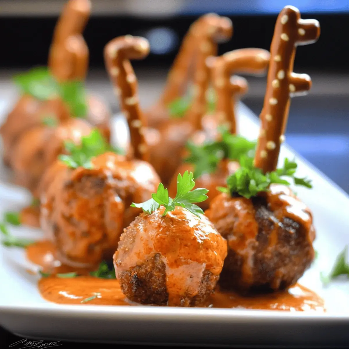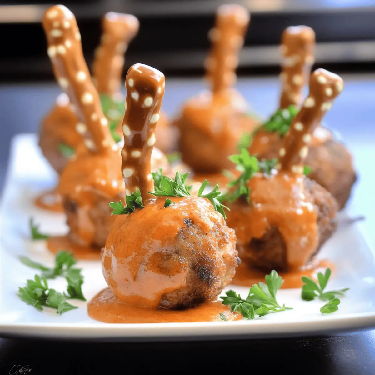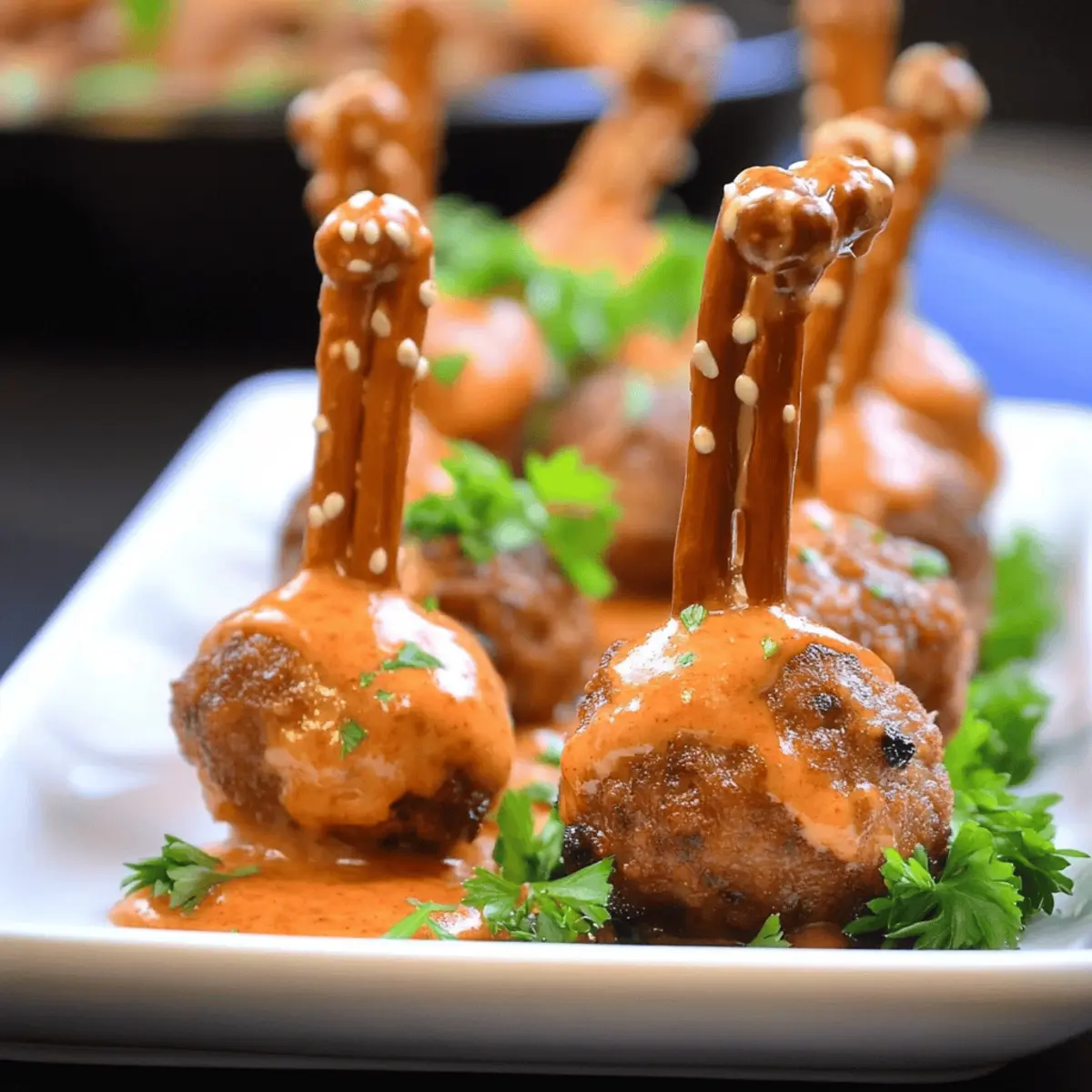 Jump to Recipe Print RecipeAs the crisp autumn air sets in, there’s something magical about transforming ordinary ingredients into festive treats. This is why I’m so excited to share my recipe for Buffalo Meatball Pumpkins! These delightful little bites combine juicy, gluten-free meatballs with a zesty buffalo sauce, all while resembling adorable pumpkins that are perfect for your fall gatherings. Not only are they a crowd-pleaser, but they also require minimal prep time, making them an ideal choice for busy evenings or Halloween parties. With a fun twist, you can adjust the spice level to suit any palate, ensuring that both kids and adults will enjoy them. Ready to impress your guests while savoring the flavors of the season? Let’s dive into this spooky yet scrumptious recipe! Why Are These Meatball Pumpkins So Special? Festive Presentation: These adorable Buffalo Meatball Pumpkins not only taste amazing but also look delightful on any table, making them a perfect conversation starter at gatherings. Flavorful Kick: The creamy buffalo sauce wrapped around juicy meatballs gives an irresistible tang that truly embodies the spirit of fall. Customizable Spice Levels: Adjust the heat to cater to all taste buds—perfect for family events or gatherings with friends. Super Easy Prep: With only a few steps and minimal cooking time, you can whip up these treats without breaking a sweat. If you love quick and delicious options, check out other fun recipes like Air Fryer Buffalo for your next gathering! Family-Friendly: Kids will love their fun pumpkin shape, and you can rest easy knowing the ingredients are gluten-free and wholesome! Perfect for Leftovers: These meatballs store well, making them an excellent make-ahead dish that keeps the fun going well beyond the first festive night! Buffalo Meatball Pumpkins Ingredients For the Meatballs Daily Chef – Casa di Bertacchi Meatballs – These delicious gluten-free meatballs serve as your protein-packed base. You can easily substitute with any gluten-free Italian meatballs available or even your homemade ones! For the Pumpkin Look Pretzel Rods – These serve as whimsical ‘stems’ for your meatball pumpkins, perfect for easy grabbing. Braided pretzels or pretzel sticks also work well in a pinch! For the Garnish Fresh Parsley or Cilantro – Adds a gorgeous finishing touch that mimics pumpkin leaves. Any fresh herb can step up to the plate as a substitute. For the Buffalo Sauce Buffalo Sauce – This lively sauce gives your meatballs their signature flavor and mild heat. Families can adjust by using less hot sauce for a milder version or add more for that extra kick. Butter (⅓ cup) – This rich ingredient forms the base of your buffalo sauce, enhancing the flavors. Unsalted butter can be used for better flavor control. Pumpkin Puree (¼ cup) – Not only is this essential for creaminess, but it also brings a delightful seasonal touch. Canned or homemade pumpkin puree will work beautifully here. Ranch Dressing (2 tablespoons) – This creamy addition balances the buffalo sauce’s spiciness, creating a harmonious dish. Liquid ranch dressing is best for easy mixing. Step‑by‑Step Instructions for Buffalo Meatball Pumpkins Step 1: Prepare Meatballs Begin by placing the Daily Chef – Casa di Bertacchi Meatballs in a slow cooker. Set the cooker to high and allow them to heat for approximately 3 to 3.5 hours. You’ll know they are ready when they are warm throughout and slightly golden on the outside, making them perfect for the next step. Step 2: Make Buffalo Sauce In a medium saucepan over low heat, melt the butter until it’s completely liquefied. Once melted, stir in the buffalo sauce, pumpkin puree, and ranch dressing. Mix thoroughly to combine all the ingredients, and cook until it becomes a smooth and creamy consistency, around 5 minutes. The sauce should be warm and fragrant. Step 3: Combine After the meatballs are heated, carefully pour the prepared buffalo sauce over them. Gently stir to ensure each meatball is evenly coated with the creamy sauce, allowing the flavors to meld beautifully. Continue cooking in the slow cooker for an additional 10 minutes to enhance the taste and keep everything warm for serving. Step 4: Garnish Transfer the buffalo meatballs to a serving tray, creating a delightful display. Insert pretzel rods into the top of each meatball to resemble pumpkin stems—if needed, use a toothpick to create small holes for easier insertion. Finally, add a fresh parsley leaf on top for a charming garnish, completing your festive Buffalo Meatball Pumpkins! How to Store and Freeze Buffalo Meatball Pumpkins Fridge: Store leftover Buffalo Meatball Pumpkins in an airtight container for up to 3-4 days. This helps maintain their delicious flavor and quality for easy snacking. Freezer: For longer storage, freeze Buffalo Meatball Pumpkins in a freezer-safe container for up to 3-4 weeks. Ensure they’re well-wrapped to prevent freezer burn. Reheating: To enjoy your meatballs again, reheat in the microwave for 1-2 minutes or in a slow cooker on low until warmed through. This method retains their juicy texture beautifully. Make-Ahead: You can prepare the meatballs and buffalo sauce a day in advance. Just store separately in the fridge and combine when ready to serve for a convenient and tasty dish! Buffalo Meatball Pumpkins Variations Feel free to explore these exciting twists to make the recipe your own and delight your taste buds! Vegan Option: Swap meatballs with plant-based substitutes like lentil or chickpea patties for a hearty, flavorful alternative. Spicy Kick: Increase the heat by adding diced jalapeños or a dash of cayenne pepper to your buffalo sauce. Enjoy the extra zing! Cheesy Delight: Melt some shredded cheese atop the meatballs during the last few minutes of cooking for a gooey, delicious layer that everyone will adore. Sweet Twist: For a unique flavor, try replacing buffalo sauce with a tangy barbecue sauce to c