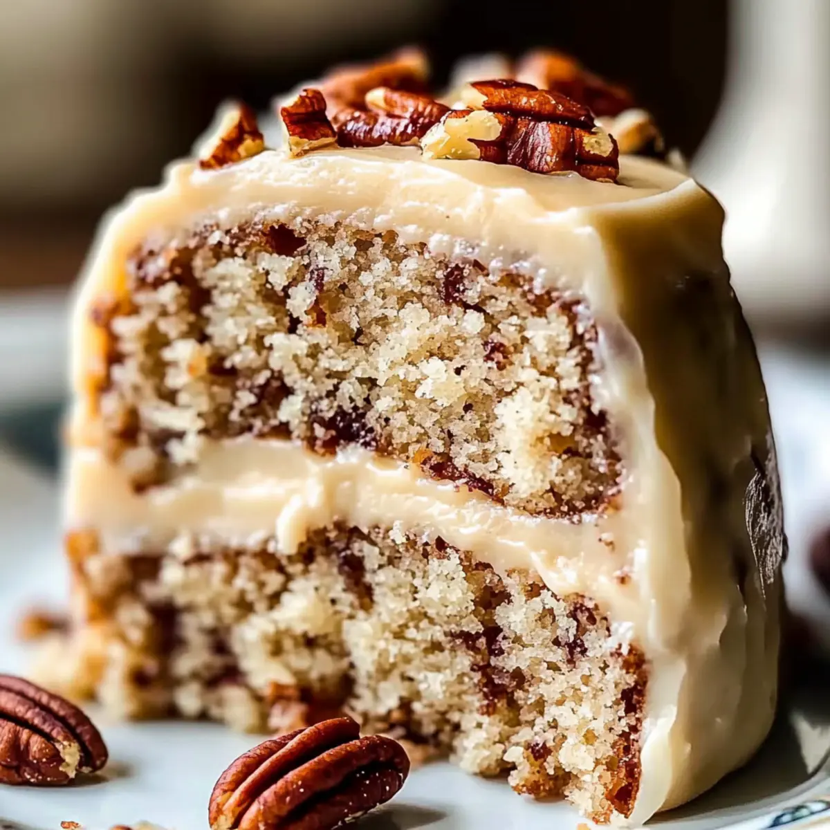 Jump to Recipe Print RecipeThere’s something magical about the aroma of nuts toasting, filling your kitchen with warmth and nostalgia. This Butter Pecan Cake is infused with the deep, nutty essence of browned butter and sprinkled with finely chopped pecans, capturing that cozy feeling in every slice. With its tender, moist crumb achieved through the gentle reverse creaming method and a hint of buttermilk, it’s a dessert that brings comfort and joy. Topped with a luscious cream cheese frosting that adds a touch of caramel sweetness, this cake isn’t just delicious—it’s a crowd-pleaser, perfect for festive gatherings or a cozy family dinner. Whether you’re a seasoned baker or just looking to elevate your cake game, this Butter Pecan Cake is sure to impress. Ready to channel your inner pastry chef and make some delightful memories in the kitchen? Let’s dive in! Why is Butter Pecan Cake So Irresistible? Decadent Flavor: Each bite of this Butter Pecan Cake is bursting with rich, nutty flavors from the browned butter and pecans that elevate it beyond the ordinary. Moist and Tender: Thanks to the careful reverse creaming technique and buttermilk, this cake results in an incredibly moist crumb that just melts in your mouth. Crowd-Pleaser: Whether you’re hosting a festive gathering or having family over, this cake is guaranteed to impress and become the star of the dessert table. Customizable: Want to mix it up? You can easily substitute pecans with sunflower seeds for a nut-free option, or try adding spices like cinnamon for an extra layer of flavor. Easy to Bake: With straightforward steps, anyone can master this recipe, from beginner bakers to seasoned pros. You’ll feel proud as it fills your kitchen with warmth, just like my Chocolate Peanut Butter dessert! Butter Pecan Cake Ingredients For the Cake • Unsalted Butter – Use brown butter for a deeper, nuttier flavor that enhances the cake beautifully. • Cake Flour – Contributes to a light, tender crumb; replace with all-purpose flour by removing 2 tablespoons per cup and adding cornstarch. • Granulated Sugar – Provides sweetness and structural integrity for the cake. • Light Brown Sugar – Adds a delightful caramel flavor that complements the pecans. • Baking Powder & Baking Soda – These leavening agents ensure your cake rises perfectly. • Salt – A little pinch enhances the flavors and balances the sweetness. • Buttermilk – Adds both moisture and a tangy kick to the cake. • Eggs – Essential for binding the ingredients and adding richness; make sure they’re at room temperature. • Vanilla Extract – Infuses the cake with aromatic sweetness. • Pecans – Finely chopped for texture and flavor; toasting them can enhance their nuttiness further. For the Frosting • Cream Cheese (softened) – The base for the frosting, contributing creaminess and a slight tang. • Confectioners’ Sugar – Sweetens and thickens the frosting to perfection. • Heavy Cream – Use this to adjust the frosting’s texture, ensuring it’s just right for spreading. This Butter Pecan Cake is a celebration of warmth and flavor that will have everyone coming back for seconds! Step-by-Step Instructions for Butter Pecan Cake Step 1: Prepare Browned Butter Begin by melting unsalted butter in a medium saucepan over medium heat. Stir continuously until the butter foams and transforms into a deep amber hue, releasing a nutty aroma—this should take about 5-7 minutes. Once browned to perfection, remove it from the heat and allow it to cool to room temperature while you gather your other ingredients. Step 2: Preheat Oven Preheat your oven to 175°C (350°F). While the oven warms up, grease and line three 20-cm round cake pans with parchment paper. This will ensure that your decadent Butter Pecan Cake releases easily and maintains its beautiful layers once baked. Step 3: Mix Dry Ingredients In a large mixing bowl, whisk together the cake flour, granulated sugar, light brown sugar, baking powder, baking soda, and salt. This step is crucial to evenly distribute the leavening agents and flavors throughout your Butter Pecan Cake batter, ensuring a perfectly risen and tender crumb. Step 4: Combine Wet and Dry Ingredients Pour the cooled browned butter into the dry mixture, and combine until crumbles form. In a separate bowl, whisk together the buttermilk, eggs, and vanilla extract until fully incorporated. Gradually add this wet mixture into the flour blend, stirring until the batter is just smooth—overmixing can lead to a dense cake, so be gentle! Step 5: Incorporate Pecans Fold in the finely chopped pecans with a spatula, ensuring they’re evenly distributed throughout the batter without overmixing. These little nutty gems lend texture and flavor to your Butter Pecan Cake, enhancing every slice with delightful crunchiness. Step 6: Bake Divide the batter evenly between the prepared cake pans and level the tops with a spatula. Place them in the preheated oven and bake for about 30 minutes, or until a skewer inserted into the center comes out clean. Once baked, allow the cakes to cool in their pans for 15-20 minutes before carefully transferring them to a wire rack. Step 7: Make Frosting While the cakes cool, prepare the cream cheese frosting. In a mixing bowl, beat the softened cream cheese, unsalted butter, light brown sugar, vanilla extract, and a pinch of salt until it’s smooth and creamy. Gradually add the confectioners’ sugar, mixing until fluffy and light. If needed, adjust the texture with a splash of heavy cream for perfect spreadability. Step 8: Assemble Cake Once the cake layers are fully cooled, level them if necessary to create an even base. Stack the layers on a serving plate, spreading a generous layer of cream cheese frosting between each. Complete by frosting the top and sides of the cake. For best results, chill the frosted cake in the refrigerator for 30-60 minutes to help set the layers and enhance the fl
