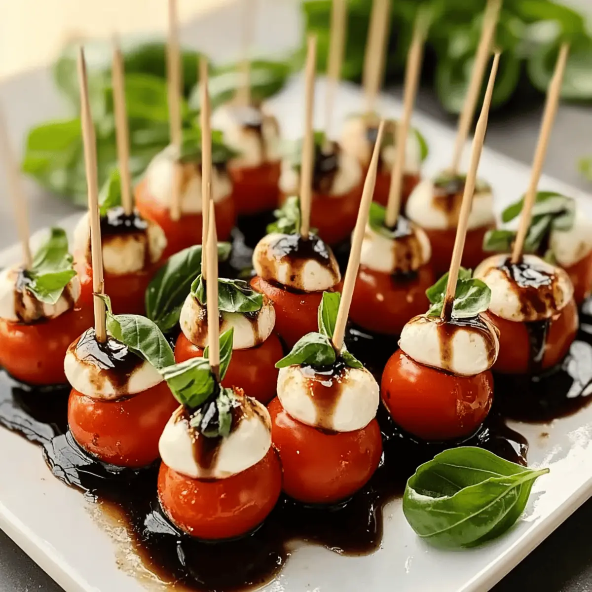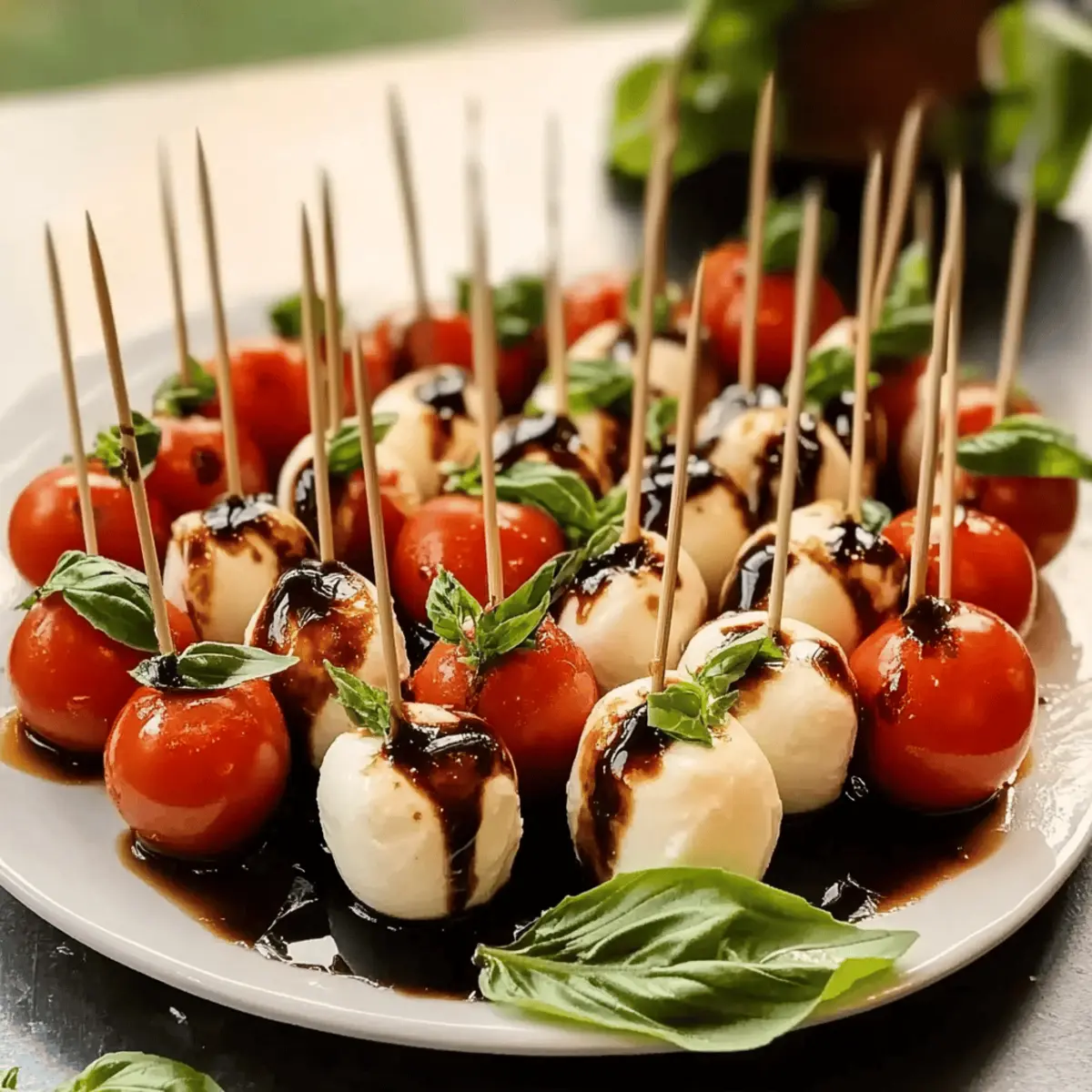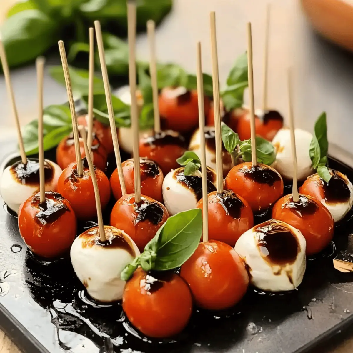 Jump to Recipe Print RecipeAs I was assembling appetizers for a recent gathering, I couldn’t resist the vibrant colors and fresh aroma of my Easy Caprese Skewers with Balsamic Glaze. These no-cook wonders are more than just a feast for the eyes; they’re a delightful combination of juicy cherry tomatoes, creamy mozzarella balls, and aromatic basil, perfect for any occasion. Not only do they take minutes to prepare, but they also cater to gluten-free diets, making them an easy choice for everyone—friends and family alike. Whether you’re hosting a summer BBQ or simply looking for a healthy appetizer to brighten your day, these skewers are versatile and crowd-pleasing. So, are you ready to elevate your appetizer game and impress your guests with this simple yet elegant dish? Let’s dive in! Why are Caprese Skewers a must-try? Vibrant Flavors: Each bite bursts with the sweetness of cherry tomatoes, creamy mozzarella, and fragrant basil—truly a taste of summer! Quick Assembly: Perfect for busy cooks, these no-cook skewers come together in minutes, allowing you to enjoy more time with your guests. Healthy Delight: At around 70 calories per skewer, these gluten-free appetizers are a guilt-free option for any gathering. Versatile Pairing: Pair them with garlic bread or a refreshing fruit salad for a complete meal that satisfies any palate. If you’re looking for more no-cook options, check out the delightful Berry Caprese Salad for another tasty twist! Crowd-Pleaser: Impress your guests with this elegant appetizer that looks stunning on any platter. Caprese Skewers with Balsamic Glaze Ingredients For the Skewers • Cherry Tomatoes – Choose ripe, firm tomatoes for the best flavor and a delightful sweetness. • Mini Mozzarella Balls – Adds creaminess and texture; you can substitute with cubed regular mozzarella if preferred. • Fresh Basil Leaves – Offers aromatic freshness; for a different taste, baby spinach can be used as a substitute. • Toothpicks or Mini Skewers – Essential for assembling your beautiful bite-sized skewers. For the Drizzle • Extra Virgin Olive Oil – Enhances flavor and richness, ideally use a high-quality cold-pressed variety. • Balsamic Glaze – Provides a delicious tangy sweetness; you can go for store-bought or whip up your homemade version. • Sea Salt – Elevates all flavors, adjust to taste to ensure every bite is savory. • Cracked Black Pepper – This optional addition introduces a subtle kick that complements the other ingredients beautifully. Elevate your gatherings with these Caprese Skewers with Balsamic Glaze; they’re not only delicious but also a feast for the eyes! Step‑by‑Step Instructions for Caprese Skewers with Balsamic Glaze Step 1: Prepare the Ingredients Start by rinsing the cherry tomatoes and basil leaves under cold water to ensure freshness. Pat them dry gently with a clean towel. Next, drain the mini mozzarella balls in a colander to remove any excess moisture, which will keep the skewers from becoming soggy. Gather your toothpicks or mini skewers for easy assembly. Step 2: Assemble the Skewers Take a toothpick or mini skewer and thread on a cherry tomato, followed by a fresh basil leaf, and then a mini mozzarella ball. Repeat this process for all skewers, ensuring that you alternate the colors for an appealing presentation. Each skewer should feature a beautiful combination of juicy red, vibrant green, and creamy white—delightful Caprese Skewers with Balsamic Glaze await! Step 3: Drizzle the Skewers Once your skewers are assembled on a large serving platter, drizzle a generous amount of extra virgin olive oil over them, followed by a rich balsamic glaze. The oil will add a lovely gloss while the glaze provides a sweet-tart complexity. Take a moment to visually check that every skewer is evenly coated for maximum flavor impact. Step 4: Season to Taste Sprinkle a pinch of sea salt over the skewers to elevate the flavors of the cherry tomatoes, mozzarella, and basil. If desired, finish with a light dusting of cracked black pepper for a subtle kick. The seasoning enhances the Caprese Skewers with Balsamic Glaze, making each bite more delightful and satisfying for your guests. Step 5: Serve or Refrigerate To serve immediately, present the skewers as is or refrigerate them for up to 2 hours, ensuring they remain fresh without the drizzles. If making ahead, cover the platter with cling film, but remember to add the balsamic glaze just before serving to maintain the perfect texture and taste. Enjoy these colorful, no-cook appetizers! Expert Tips for Caprese Skewers Choose Quality Ingredients: Use fresh, ripe cherry tomatoes and high-quality mozzarella for the best flavor in your Caprese Skewers with Balsamic Glaze. Drain Properly: Ensure all ingredients, especially mozzarella, are well-drained to prevent sogginess and maintain the integrity of the skewers. Assemble Just Before Serving: For optimal taste and texture, assemble your skewers close to serving time. This ensures freshness and presents beautifully. Customize Your Skewers: Don’t hesitate to mix in other ingredients like olives or marinated artichokes for added flavor twists. Adjust Seasoning: Always taste and adjust salt and pepper to suit your preference, enhancing the overall enjoyment of the Caprese Skewers. Make Ahead Options These Caprese Skewers with Balsamic Glaze are perfect for meal prep, making them a fantastic choice for busy home cooks! You can assemble the skewers up to 24 hours in advance, just don’t forget to cover them in an airtight container to keep them fresh. To maintain quality and prevent sogginess, ensure the cherry tomatoes and mozzarella are well-drained before assembly. When you’re ready to serve, simply drizzle the balsamic glaze and olive oil right before presenting for that fresh, vibrant taste. With these make-ahead tips, you’ll save time and still impress your guests with these delightful bites! Caprese Skewers with Ba