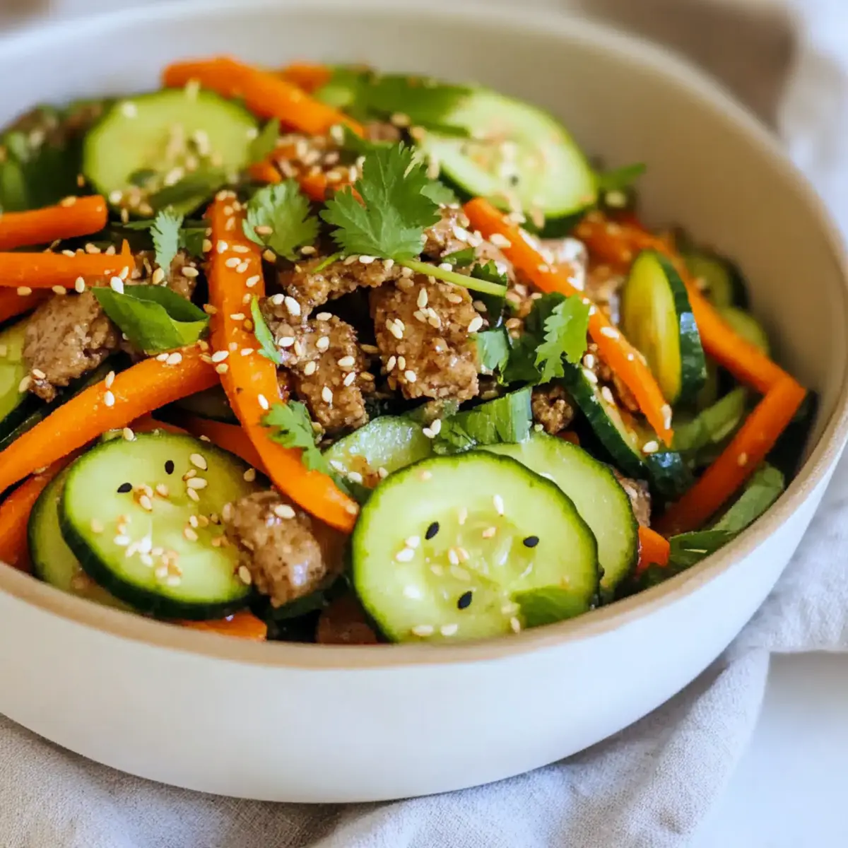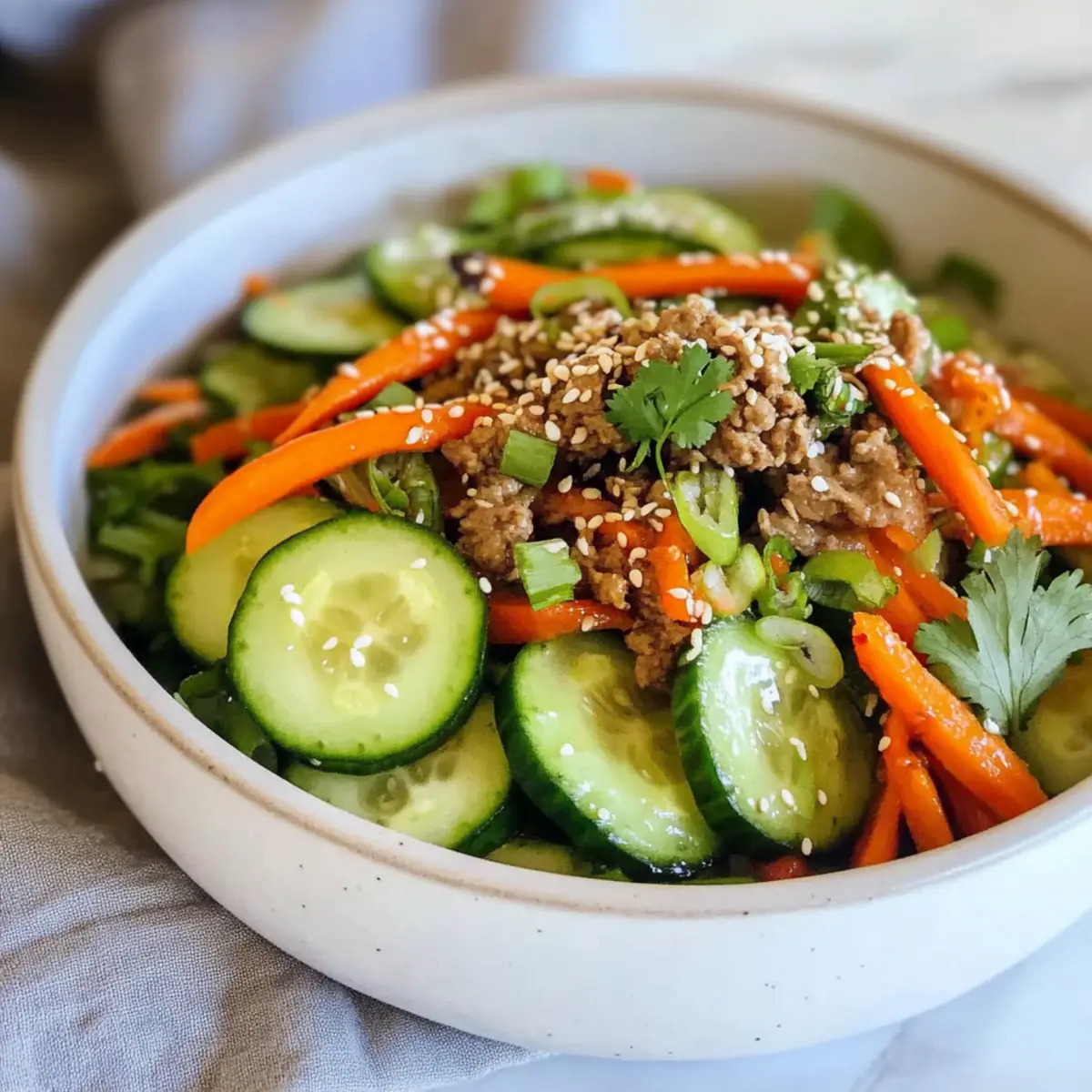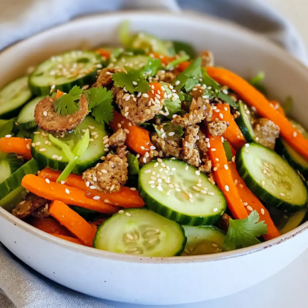These Carrot and Cucumber Salad ingredients are perfect for busy home cooks looking to save time! You can wash and prepare the vegetables—slicing the cucumber and julienning the carrots—up to 24 hours in advance. Simply store them in an airtight container in the refrigerator to keep them crisp and fresh. The dressing can also be made ahead (up to 3 days) and kept in a sealed jar in the fridge, locking in those vibrant flavors. When you’re ready to serve, combine the prepped veggies with the dressing, toss gently, and garnish with cilantro and toasted sesame seeds for a refreshing burst of flavor just like freshly made!