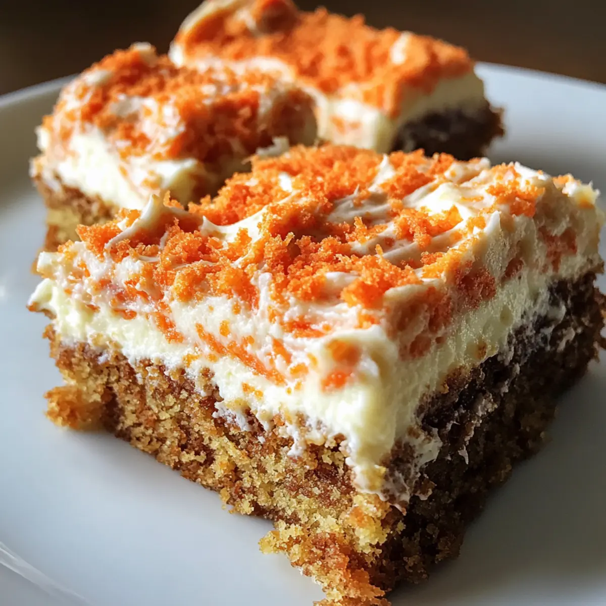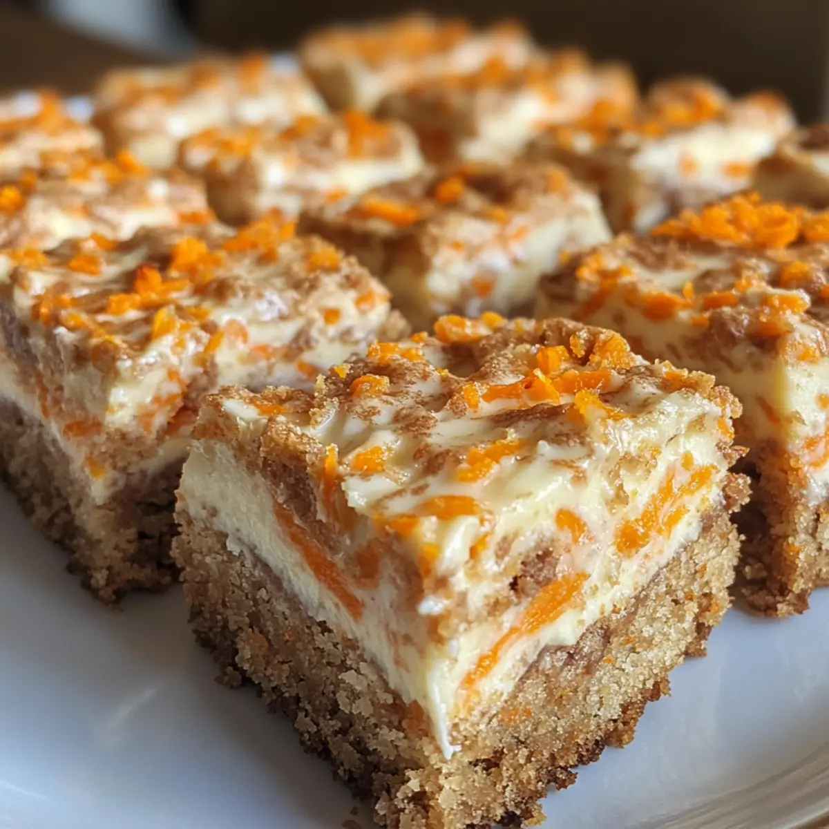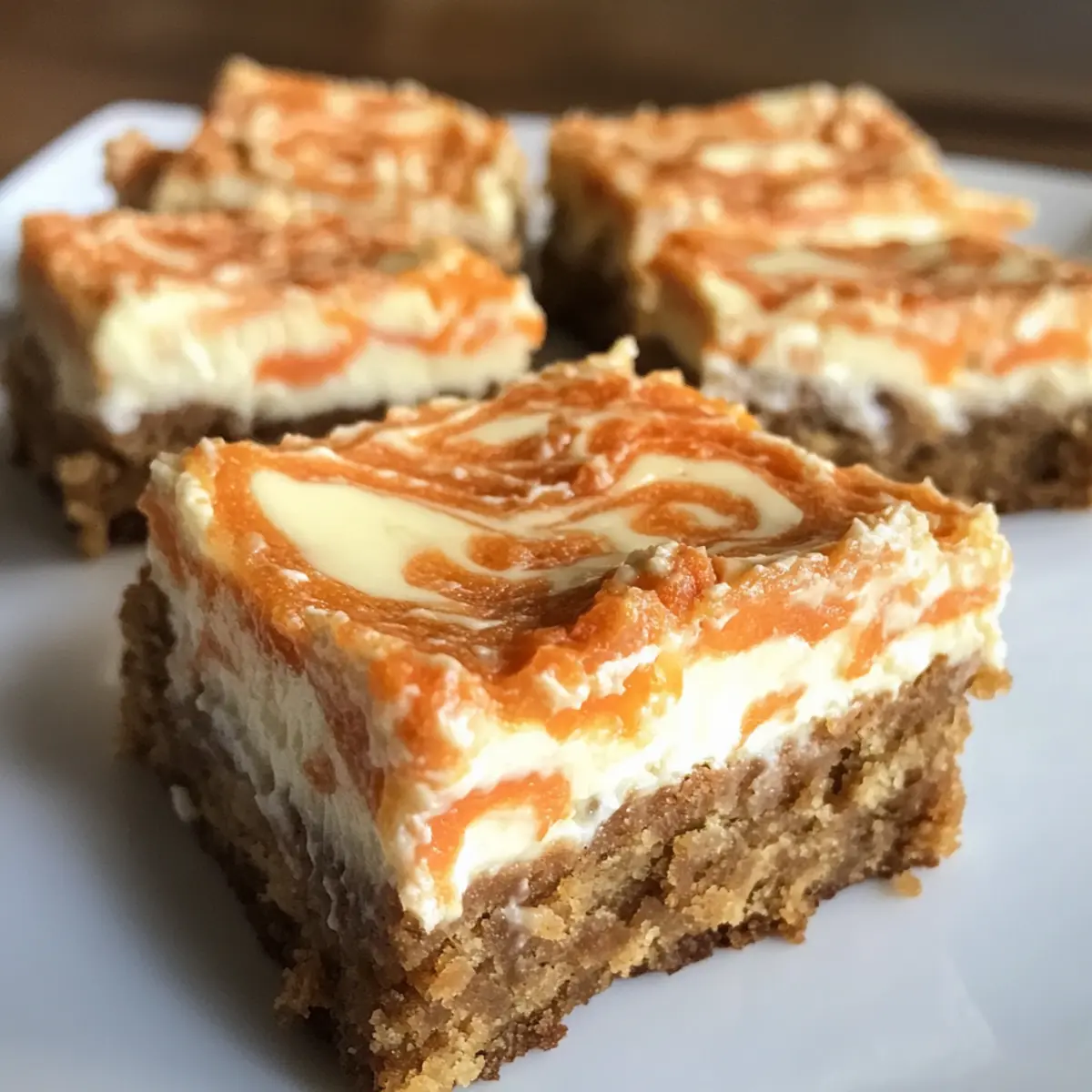 Jump to Recipe Print RecipeThe aroma of warm spices fills the kitchen as I mix together the vibrant orange shreds of carrot, creating a symphony of color and flavor in my bowl. These Carrot Cake Cream Cheese Bars are not just a treat; they’re a revelation—offering a sweet, moist bite that hides nutritious vegetables inside. With just 15 minutes of prep time, this easy recipe is perfect for busy weeknights or family gatherings, making it a delightful way to enjoy dessert without sacrificing nutrition. Plus, with a creamy swirl of tangy cream cheese, each bite seamlessly blends indulgence with wholesome goodness. Curious about how you can bring this crowd-pleaser to your table? Let’s dive into the recipe! Why Are These Bars So Irresistible? Simplicity: You’ll love how this recipe takes just 15 minutes of prep! Perfect for home cooks looking to whip up something extraordinary without the hassle. Flavorful Fusion: The combination of spices and fresh carrots creates an unforgettable taste, while the creamy cream cheese swirl adds a delightful tang. Satisfying Treat: These bars are a perfect sweet tooth indulgence that sneak in healthy veggies—making them guilt-free! Versatile Serving Options: Serve these bars warm with a scoop of vanilla ice cream or top them with whipped cream for an extra touch of decadence. Family-Friendly: Not only are these Carrot Cake Cream Cheese Bars delicious, but they’re also ideal for family gatherings, satisfying both kids and adults alike. If you love amazing desserts, check out these Strawberry Cheesecake Sandwiches for another delightful treat! Carrot Cake Cream Cheese Bars Ingredients For the Cake Base • Light Brown Sugar – Provides deep, caramel-like sweetness; coconut sugar can be used for a different flavor profile. • Kosher Salt – Enhances flavors and balances sweetness. • Vanilla Extract – Adds warmth and depth; almond extract offers a unique twist if you wish. • All-Purpose Flour – Provides structure for the bars; a gluten-free blend works as a substitute. • Ground Cinnamon – Imparts cozy, warming spice that perfectly complements the carrots. • Ground Nutmeg – Adds a hint of earthiness to the flavor profile. • Baking Powder – Ensures a light and airy texture in the bars. • Large Egg – Acts as a binder for the ingredients. • Unsalted Butter – Creates a tender, moist crumb; melted coconut oil is a great dairy-free alternative. • Freshly Grated Carrots – Contributes moisture and nutrition; avoid pre-packaged shredded carrots for better texture. For the Cream Cheese Swirl • Cream Cheese (Softened) – Provides that creamy, tangy swirl; Neufchâtel cheese is a lower-fat alternative. • Egg Yolk – Adds richness to the cream cheese mixture. • Granulated Sugar – Sweetens the cream cheese mixture, balancing the tanginess. Get ready to bring these scrumptious Carrot Cake Cream Cheese Bars to your next gathering or special occasion! Step‑by‑Step Instructions for Carrot Cake Cream Cheese Bars Step 1: Preheat the Oven and Prepare the Pan Begin by preheating your oven to 350°F (175°C). While the oven warms up, take an 8×8-inch baking pan and line it with non-stick aluminum foil, ensuring that it hangs over the edges for easy lifting later. Lightly spray the foil with cooking spray to ensure a smooth release of the Carrot Cake Cream Cheese Bars once baked. Step 2: Melt the Butter In a microwave-safe bowl, melt ½ cup of unsalted butter until fully liquid, which should take about 30 seconds to a minute. Be careful not to overheat; let it cool slightly after microwaving. This melted butter will be the base for your moist carrot cake batter, adding richness to each delicious bar. Step 3: Mix the Wet Ingredients Whisk together the melted butter, 1 large egg, 1 cup of light brown sugar, a pinch of kosher salt, and 2 teaspoons of vanilla extract. Mix these ingredients vigorously until they’re well combined and smooth, about 1 to 2 minutes. This step is crucial as it helps to dissolve the sugar and incorporate air into the batter, leading to delightful texture in your Carrot Cake Cream Cheese Bars. Step 4: Incorporate the Dry Ingredients Now, sift in 1 cup of all-purpose flour, 1 teaspoon of baking powder, 1 teaspoon of ground cinnamon, and ½ teaspoon of ground nutmeg to the wet mixture. Gently stir these dry ingredients into the wet ones using a spatula or wooden spoon until just combined. Be careful not to overmix, as this could lead to dense bars; you want a tender crumb in your finished product. Step 5: Fold in the Carrots Add 1 cup of freshly grated carrots into the batter, folding them in gently until they are evenly distributed. The bright orange shreds should be well integrated, creating a vibrant and flavorful carrot cake base. Freshly grated carrots are key here, adding moisture and sweetness that will enhance the overall flavor of the Carrot Cake Cream Cheese Bars. Step 6: Prepare the Cream Cheese Mixture In a separate bowl, beat together 8 ounces of softened cream cheese, 1 egg yolk, and ¼ cup of granulated sugar until the mixture is smooth and fluffy. This should take about 2 to 3 minutes of mixing. The goal is to create a creamy, rich swirl that will contrast beautifully with the spiced carrot cake base. Step 7: Assemble the Bars Pour the carrot cake batter into the prepared baking pan, spreading it evenly with a spatula. Next, take the cream cheese mixture and dollop it on top of the carrot cake batter. Use the back of a knife to swirl the cream cheese mixture gently throughout, creating beautiful marbling that will tease your taste buds with visual appeal and creamy bites. Step 8: Bake to Perfection Place the pan in the preheated oven and bake for 25-30 minutes. Keep an eye on the bars, checking for doneness by inserting a toothpick in the center; it should come out clean or with a few moist crumbs. The edges will be slightly golden, and the center should be set but still moist for that pe