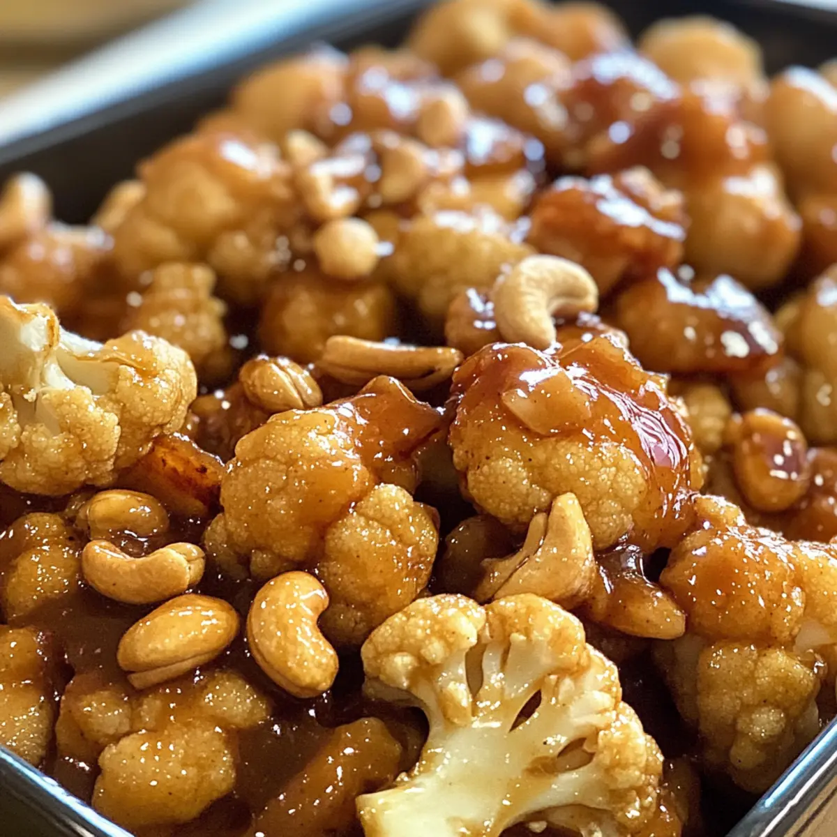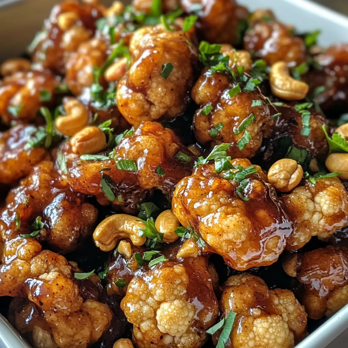 Jump to Recipe Print RecipeWalking through the bustling streets of any city, the aromas wafting from Chinese eateries can be irresistible. But what if you could capture that essence in a healthier, vegetarian format? Enter Cashew Cauliflower! This delightful twist on the classic Cashew Chicken brings together tender cauliflower florets coated in a sticky, savory sauce, creating a dish that’s as quick to prepare as it is satisfying. Not only is it a flavorful weeknight dinner option, but it also allows you to enjoy all the savory goodness without the meat. Your taste buds will dance with joy thanks to its sweet, spicy, and tangy notes! Are you ready to recreate that satisfying takeout experience right at home? Why is Cashew Cauliflower a game-changer? Flavorful and satisfying: This dish bursts with sweet, spicy, and tangy notes that mimic your favorite Chinese takeout, ensuring a delightful dining experience. Quick and easy: Ready in just under 30 minutes, it’s perfect for busy weeknights. Healthy alternative: Packed with wholesome ingredients, this vegetarian version allows you to enjoy comfort food without the guilt. Versatile base: Swap out cauliflower for broccoli or other seasonal veggies for endless variations. Crowd-pleaser: Impress family and friends with a dish that even meat-lovers will adore—perfect when served with Cauliflower Black Bean Tostadas. Cashew Cauliflower Ingredients • A vibrant mix for your savory delight! For the Cauliflower Cauliflower – Fresh, large heads are preferred for optimal texture and a satisfying bite. Cornstarch – Coats the cauliflower to create a crispy exterior once baked; shake off excess for best results. For the Sauce Water – Helps dissolve cornstarch and achieve the desired sauce consistency. Soy Sauce – Adds rich umami flavor; opt for low-sodium for a healthier touch. Ketchup – Brings in sweetness and tang; feel free to substitute with homemade tomato sauce if preferred. Brown Sugar – Enhances the sauce’s sweetness; can be reduced for lower sugar content. Garlic – Freshly minced is best for a vibrant, aromatic flavor. Fresh Ginger – Adds a zesty kick; use grated for easier mixing into the sauce. Ground Black Pepper – Adds subtle heat; adjust to your taste. Dried Red Chili Flakes – Provides spiciness; use according to your heat preference. For the Crunch Cashews – Use roasted, unsalted nuts for the best crunch and nuttiness to complement the dish. Try out these ingredients and create a Cashew Cauliflower that will become a staple in your home-cooked meals! Step‑by‑Step Instructions for Cashew Cauliflower Step 1: Preheat and Prepare Begin by preheating your oven to 350°F (175°C), allowing it to reach the proper temperature for baking. While the oven heats up, grease a shallow baking dish with a drizzle of olive oil to prevent sticking. This will set the stage for your delicious Cashew Cauliflower, ensuring a crispy exterior that will delight. Step 2: Coat the Cauliflower In a large mixing bowl, toss the fresh cauliflower florets with cornstarch until they’re completely coated. Make sure to shake off any excess cornstarch; this crucial step prevents a gummy texture in your finished dish. The layering of cornstarch will help achieve that crispy bite, making your Cashew Cauliflower irresistible. Step 3: Bake the Cauliflower Carefully arrange the coated cauliflower florets in the greased baking dish, spreading them out evenly. Bake in your preheated oven for about 10 minutes, or until they start to become tender and lightly golden. This initial cooking will create the perfect base for the robust sauce you’ll soon add. Step 4: Whisk Together the Sauce While the cauliflower is baking, prepare the sauce by whisking together water and cornstarch in a small bowl until fully dissolved. Then, mix in the soy sauce, ketchup, brown sugar, minced garlic, grated ginger, black pepper, and, if desired, dried red chili flakes. This savory blend will infuse your Cashew Cauliflower with vibrant flavor. Step 5: Combine and Bake Again Once the cauliflower is done baking, carefully remove it from the oven. Pour the prepared sauce over the cauliflower and gently stir to combine, ensuring each floret is nicely coated. Return the baking dish to the oven for an additional 5 minutes, allowing the sauce to thicken and envelop the cauliflower. Step 6: Add the Cashews After the second baking period, sprinkle the roasted cashews over the cauliflower and lightly stir them into the mix. This adds a delightful crunch to your Cashew Cauliflower. Bake for an additional 15 minutes, during which the sauce will continue to thicken and the cashews will warm through. Step 7: Serve and Enjoy Once fully baked, your Cashew Cauliflower is ready to be served! Take care to check that everything is well-coated and fragrant. Enjoy it immediately, either on its own or over a bed of rice or quinoa for a satisfying meal that brings home the flavors of your favorite takeout. Expert Tips for Cashew Cauliflower Choose Fresh Cauliflower: Always select large, fresh cauliflower heads for the best texture. Softer or older cauliflower won’t have the same satisfying crunch. Coat Well: Don’t rush the cornstarch coating process. Ensure each floret is evenly coated to avoid gummy spots in your Cashew Cauliflower. Adjust for Spice: Tailor the number of red chili flakes to your taste and those of your guests. Start small, then add more if desired after tasting. Keep It Crispy: To maintain the crispy texture, reheat leftovers in the oven under a broiler, avoiding the microwave which can make them mushy. Double the Sauce: If you love saucy dishes, consider doubling the sauce ingredients. Just be mindful to adjust the baking time accordingly for optimal flavor. Cashew Cauliflower Variations & Substitutions Feel free to mix things up and personalize this dish with lovely alternative ingredients and ideas! Broccoli Swap: Replace cauliflower with tender broccoli florets for 