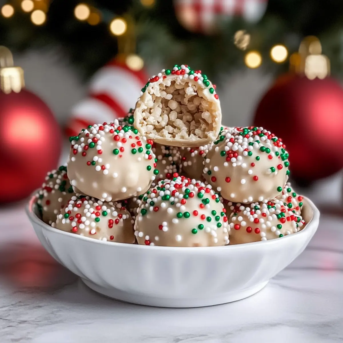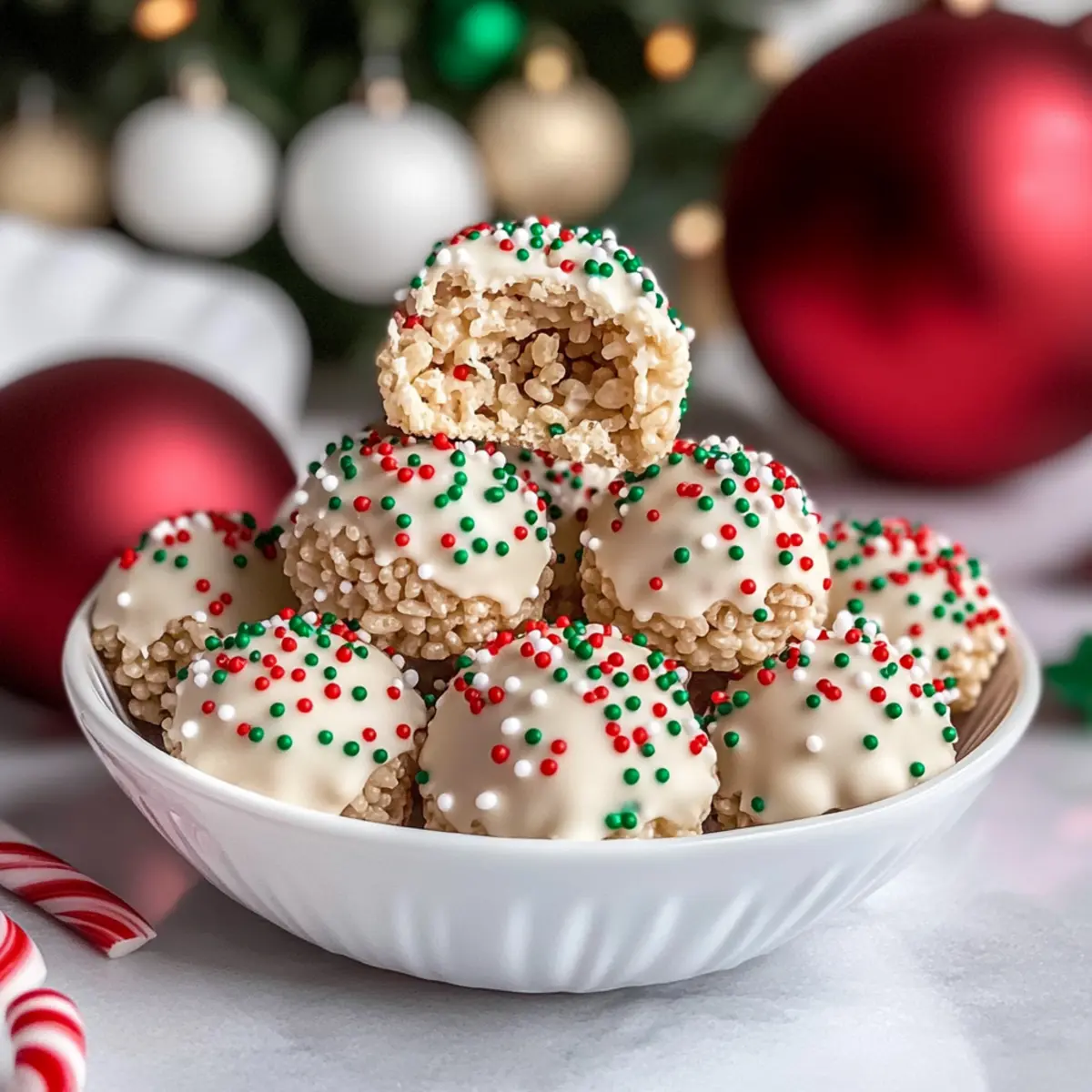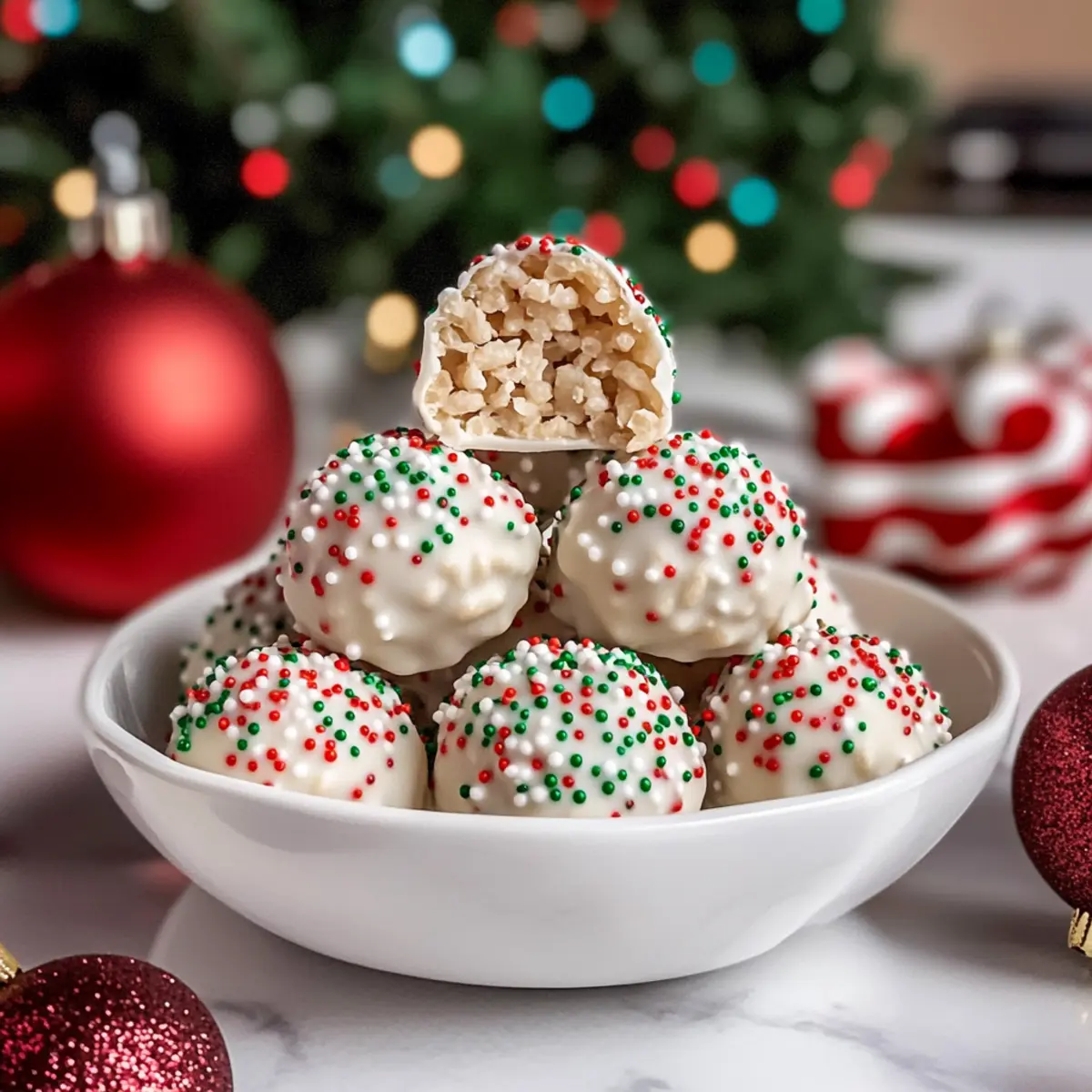 These White Chocolate Christmas Rice Crispy Treats are perfect for busy holiday planners! You can prepare the rice crispy mixture up to 24 hours in advance; simply shape the balls and store them in an airtight container at room temperature. To maintain their crispness, avoid refrigerating them until coated. When you’re ready to finish, melt the white chocolate and dip the preformed balls, then sprinkle with festive decorations. Allow them to set either at room temperature or quickly in the fridge. By prepping ahead, you’ll enjoy the festive spirit without the last-minute rush!