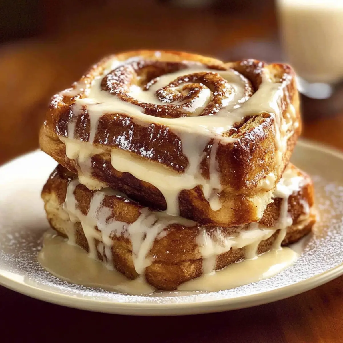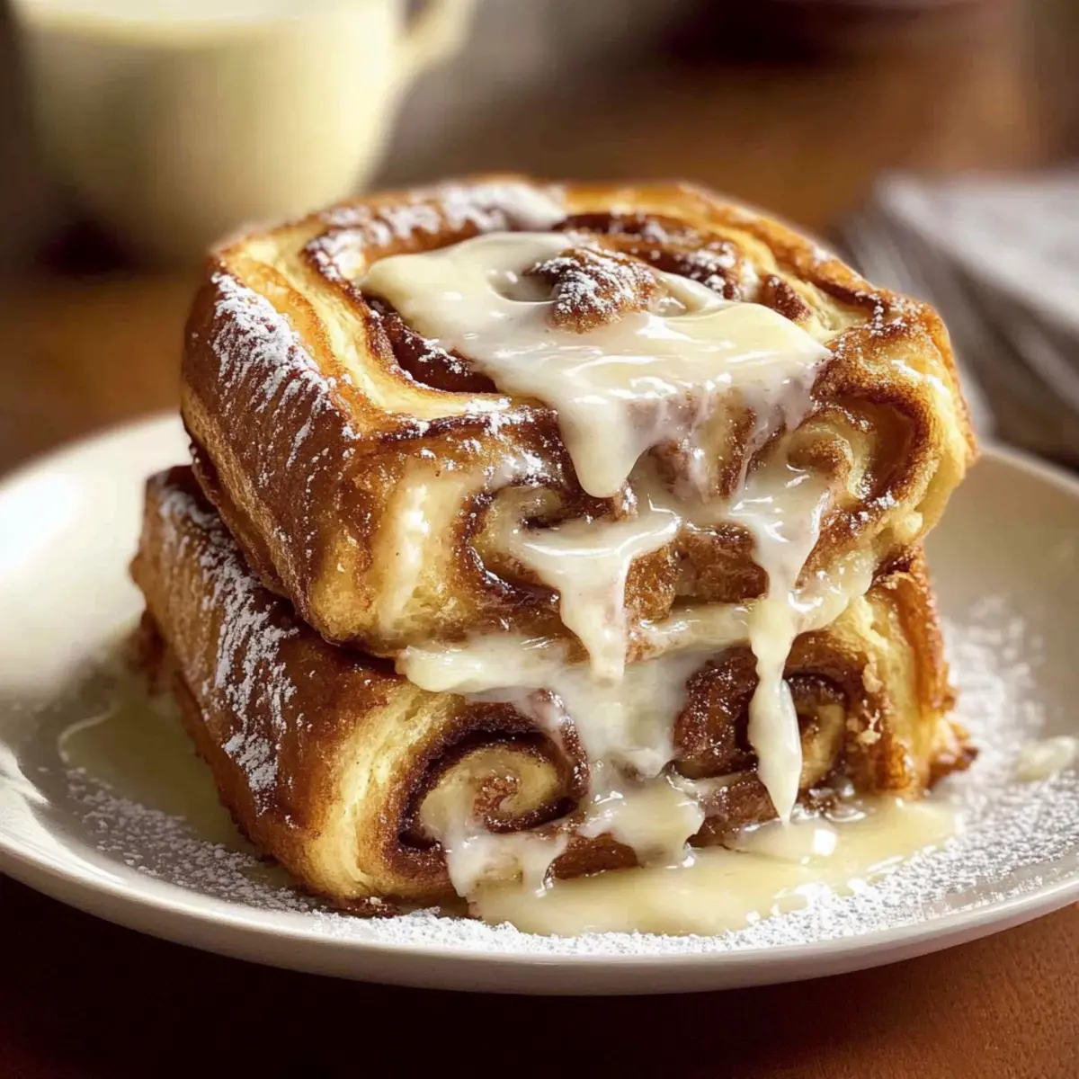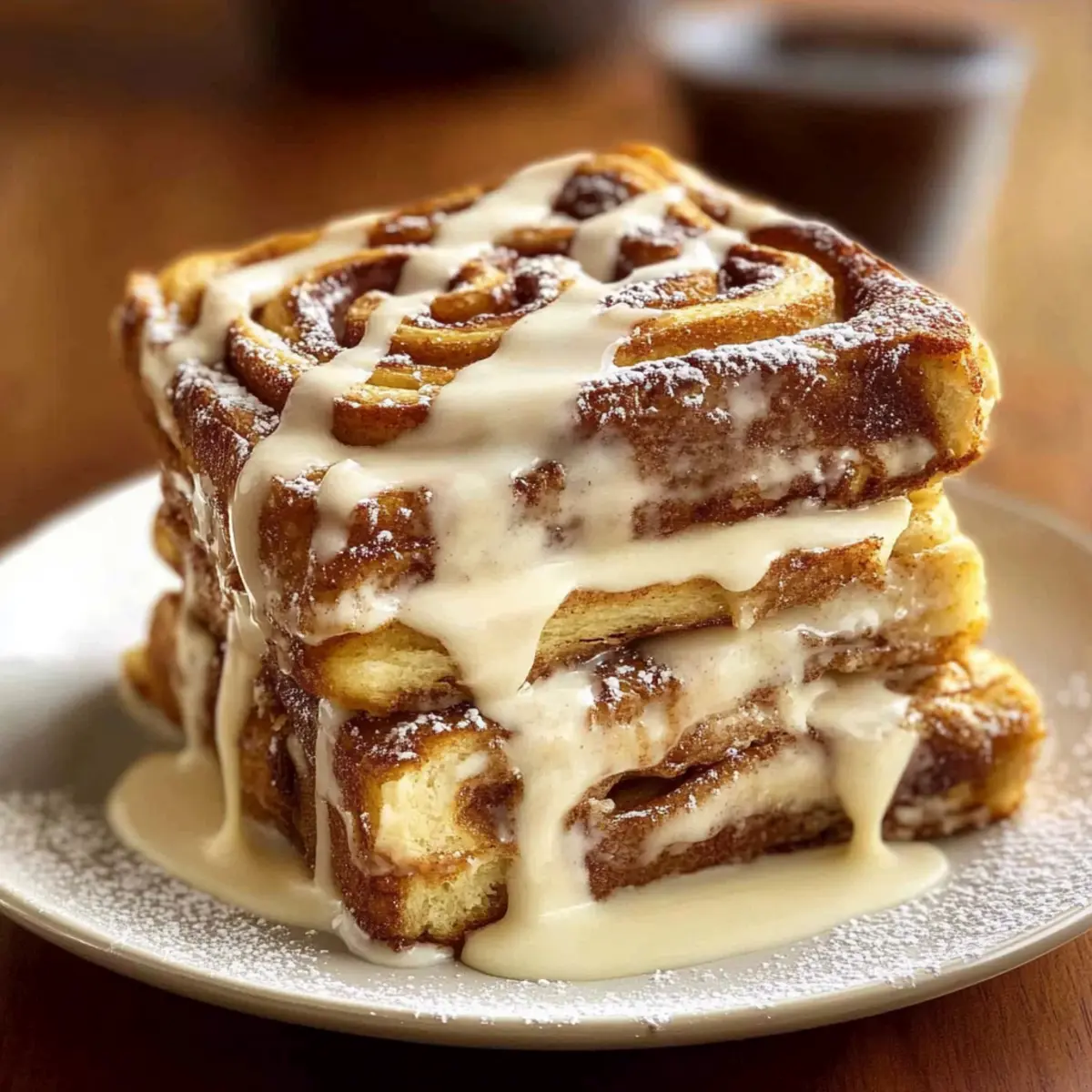 Jump to Recipe Print RecipeThe sweet aroma of cinnamon swirling through the air can instantly transport you to cozy mornings and lazy brunches with friends. With this Ultimate Cinnamon Roll French Toast, I’m excited to share a recipe that marries the beloved texture of classic French toast with the delightful flavors of warm cinnamon rolls. This dish is not only a show-stopping breakfast option but also a customizable delight; you can easily tweak it to suit your preferences, whether you prefer it dairy-free or with an extra swirl of cream cheese in the custard. The crispy exterior and soft, custardy center create a blissful contrast, making every bite a cozy celebration. What toppings will you choose to elevate your photo-worthy creation? Why is this recipe a must-try? Irresistible Flavor Fusion: The combination of warm cinnamon spices with the creamy texture of French toast is nothing short of heavenly. Customizable Delight: Add cream cheese or switch to plant-based milk, making it a versatile choice for any dietary need. Quick and Easy: Whip it up in just a few steps, perfect for busy mornings or a delightful brunch with friends. Crowd-Pleaser: Impress guests with this show-stopping breakfast that looks and tastes gourmet. Pair it with fresh fruit or maple syrup for the ultimate sweet experience! This recipe stands alongside other favorites like Basil Beef Rolls and Spring Rolls Peanut as a go-to comfort food that you’ll love making again and again. Cinnamon Roll French Toast Ingredients For the French Toast Cinnamon Swirl Bread – The base for this dish, offering delicious flavor and texture; use day-old bread to prevent sogginess. Eggs – Key for creating a rich custard; always opt for fresh eggs to achieve best results. Milk – Essential for the custard mixture; you can easily swap in half-and-half or plant-based milk for a dairy-free option. Vanilla Extract – Adds depth of flavor; be sure to use pure extract for an authentic taste. Ground Cinnamon – The star of the show, enhancing the sweetness; adjust based on your cinnamon preferences. Ground Nutmeg – Provides a warm, aromatic quality to the mixture; optional but adds a lovely nuance. Butter (for cooking) – Essential for achieving that golden crispy exterior; melt without letting it brown. For the Glaze Powdered Sugar – The main ingredient for that luscious glaze; feel free to adjust the amount according to your desired sweetness level. Extra Milk (for glaze) – Helps create the right consistency for the glaze; add as needed to achieve your desired thickness. Let’s dive into this comforting breakfast dish that combines the comforting essence of cinnamon rolls and the beloved French toast you know and love! Step‑by‑Step Instructions for Cinnamon Roll French Toast Step 1: Prep Workspace Begin by setting up your cooking area—clear your countertop and gather all ingredients. Preheat your skillet or griddle to medium heat, ensuring it’s hot enough to achieve a golden crust. Lightly grease it with butter to prevent sticking, creating a welcoming space for your soon-to-be delicious Cinnamon Roll French Toast. Step 2: Make Custard In a mixing bowl, whisk together fresh eggs until frothy, then gradually add in milk, pure vanilla extract, ground cinnamon, and optional nutmeg. Continue whisking until the mixture is smooth and light golden, creating a velvety custard base that will infuse flavor into your cinnamon roll bread. Set this aside, letting it rest as flavors meld. Step 3: Prepare Bread Next, take your cinnamon swirl bread and slice it into thick ¾-inch pieces, ensuring even thickness for a perfect cook. If using day-old bread, the slightly drier texture will help the custard absorb better, preventing sogginess in your future bites of Cinnamon Roll French Toast. Step 4: Soak Bread Individually dip each slice of cinnamon swirl bread into the custard mixture for about 10-15 seconds on each side. Keep an eye on the bread—avoid oversaturation to maintain structural integrity, allowing the custard to permeate while still holding its shape. This is essential for achieving that perfect custardy center! Step 5: Heat Butter Once your bread is soaked, melt a generous amount of butter in the preheated skillet. Allow it to melt completely, ensuring it bubbles gently but doesn’t brown, as you want a beautiful golden finish on your Cinnamon Roll French Toast without any burnt edges. Step 6: Cook Toast Carefully place the soaked bread slices into the skillet, making sure not to overcrowd the pan. Cook each slice for about 3-4 minutes per side, flipping them when they are golden brown and crispy. Keep a watchful eye for even cooking, creating that enticing aroma that fills your kitchen! Step 7: Prepare Glaze While the toast is cooking, combine powdered sugar with a splash of milk and a hint of vanilla extract in a bowl. Whisk until the mixture is smooth and reaches your desired consistency; this glaze will serve as the sweet finishing touch on your warm Cinnamon Roll French Toast. Step 8: Serve Once your French toast is perfectly cooked, plate it up immediately while it’s still warm. Drizzle the creamy glaze generously over the top, allowing its sweetness to meld with the warm toast. Get ready to savor every bite of this comforting and delicious breakfast treat! Expert Tips for Cinnamon Roll French Toast Choose the Right Bread: Opt for day-old cinnamon swirl bread to enhance texture; fresh bread can result in sogginess during soaking. Perfectly Whisked Custard: Ensure eggs are whisked until frothy before adding milk and spices—this incorporates air and creates a fluffy custard for your French toast. Watch Cooking Temp: Maintain medium heat while cooking; too high may lead to burnt edges before the center is fully cooked. Avoid Soggy Slices: Dip bread in custard for no more than 10-15 seconds per side; this helps to keep your Cinnamon Roll French Toast structurally sound. Prep Glaze Ahead: Make the glaze in adva