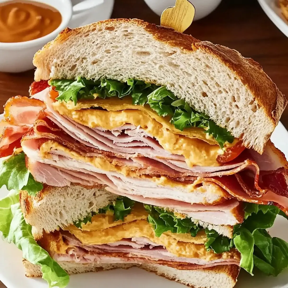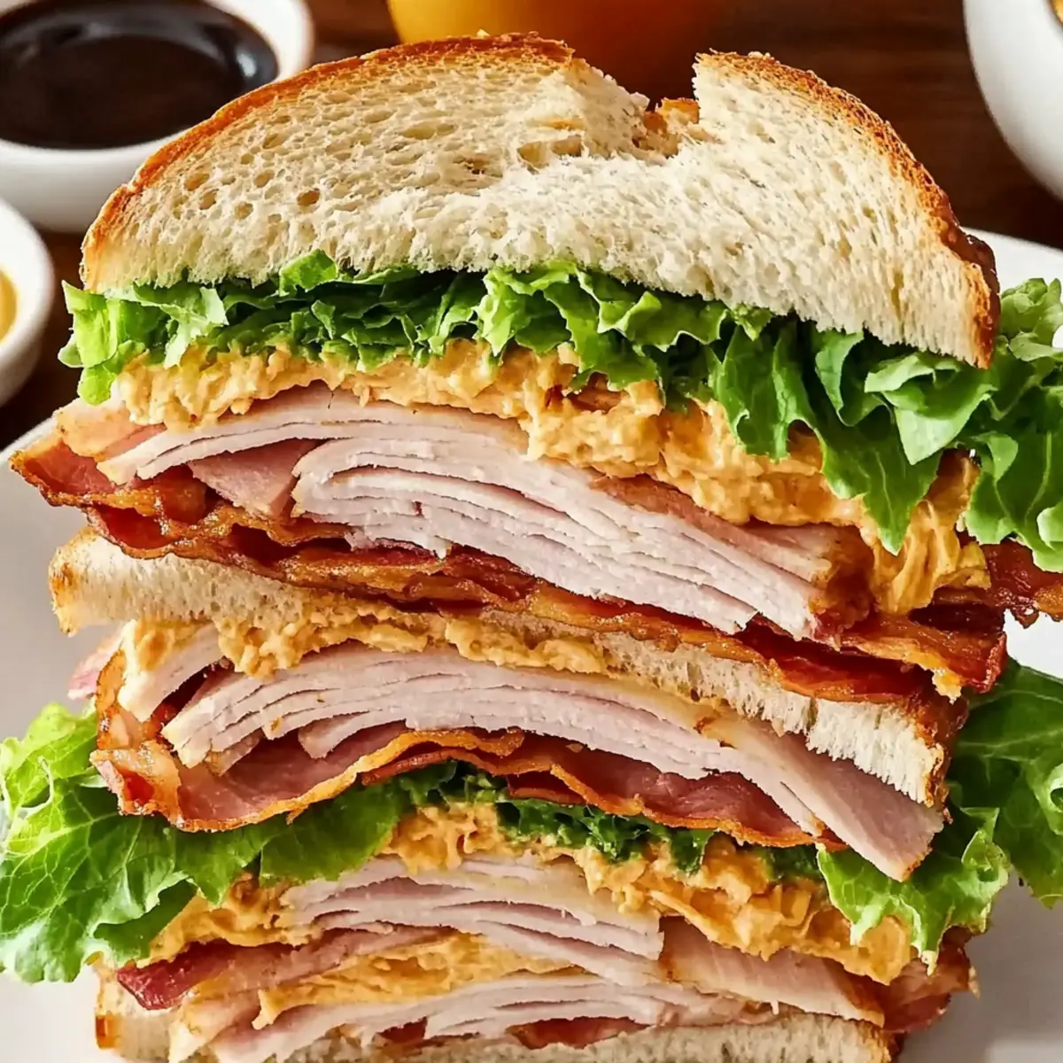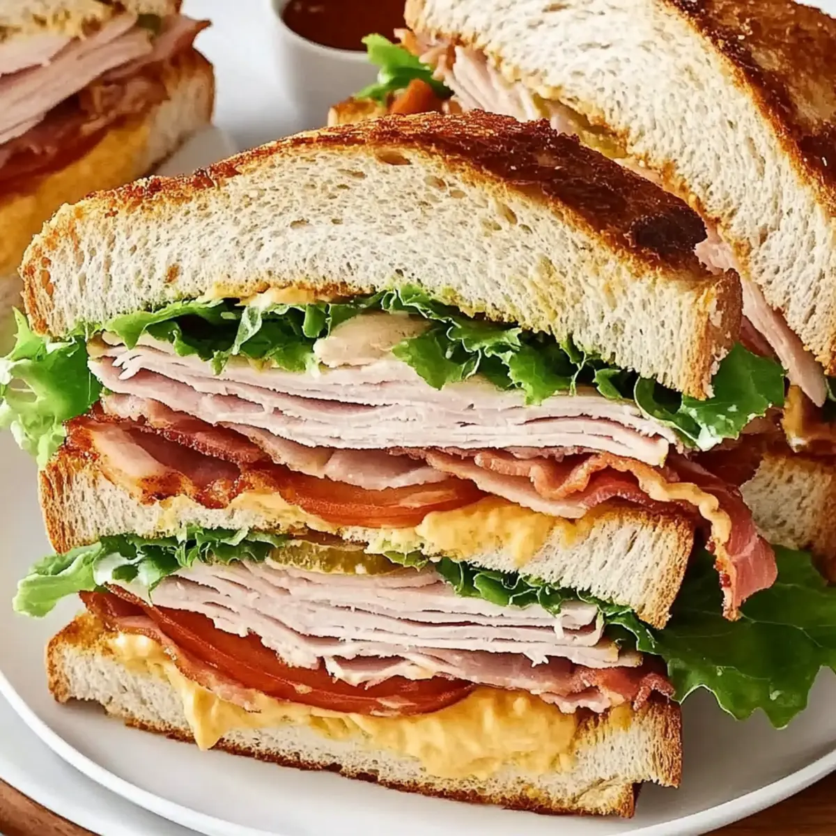 Jump to Recipe Print RecipeYou won’t believe how much joy a well-made club sandwich can bring! With layers of savory ham, turkey, crispy bacon, and fresh veggies, this classic sandwich is my go-to for a quick lunch or an easy dinner when I need something satisfying. The best part? My Classic Club Sandwich can be ready in just 10 minutes. It’s a true crowd-pleaser that caters to everyone in the family—whether you want to keep it traditional or customize with lighter options like grilled veggies or whole-grain bread. As a passionate home-chef, I adore that I can swap ingredients to suit my mood or dietary preferences. What’s your favorite twist on this timeless favorite? Let’s get cooking! Why is the Club Sandwich a Favorite? Simplicity: Incredible ease makes this club sandwich perfect for busy evenings or last-minute lunches. Customizable: Endless options allow you to enjoy this classic your way, whether opting for a traditional meat combo or a vegetarian twist with grilled veggies. Flavor Explosion: Savory layers of ham, turkey, and crispy bacon create a mouthwatering experience that satisfies every craving. Quick Preparation: Ready in just 10 minutes, it’s an ideal choice for anyone needing a fast and delicious meal. Crowd-Pleaser: Perfect for gatherings, this classic sandwich appeals to both young and old, making it a staple for family get-togethers or casual picnics, just like Cucumber Sandwiches Refreshing or Strawberry Cheesecake Sandwiches. Club Sandwich Ingredients For the Sandwich • Sliced Bread – Use fresh, sturdy bread for an ideal texture that holds all the layers together. • Butter – Enhances flavor and aids in crisping the bread; olive oil makes for a lighter option. • Mayonnaise – Adds moisture and richness; Greek yogurt or avocado are great substitutes for a healthier spread. • Romaine Lettuce – Provides a refreshing crunch; feel free to swap with iceberg for a lighter option. • Tomato Slices – Fresh and juicy, opt for vine-ripened tomatoes for the best flavor. • Bacon – Offers that desired smoky flavor and crispiness; turkey bacon is a leaner alternative. • Cheddar Cheese – Contributes sharp and creamy taste; consider using Swiss or provolone for a twist. • Turkey & Ham – Serve as hearty protein bases; elevate your sandwich with mortadella or prosciutto for a gourmet flair. For Customization • Whole-Grain or Gluten-Free Bread – Perfect for dietary needs; ensures everyone can enjoy a slice of this classic. • Grilled Veggies or Plant-Based Alternatives – Ditch the meats for a flavorful vegetarian version that doesn’t compromise on taste. • Avocado or Hummus – Use in place of mayonnaise for a unique flavor twist and creaminess. With all these fabulous ingredients, your Club Sandwich will surely elevate your lunch game! Step‑by‑Step Instructions for Club Sandwich Step 1: Toast the Bread Begin by lightly toasting four slices of your chosen bread in a toaster or on a skillet over medium heat for about 2–3 minutes, until they turn a beautiful golden brown. This will provide a perfect crispy texture for your Club Sandwich. Keep an eye on the bread to ensure it doesn’t over-toast. Step 2: Spread Butter & Mayo Once toasted, take the bread slices and spread softened butter generously on one side of each piece. On the first slice, spread a layer of mayonnaise on the unbuttered side. The butter will enhance the flavor and help achieve crispiness while the mayo adds moisture. Step 3: Layer the Fresh Ingredients Begin building your Club Sandwich by placing a layer of crisp romaine lettuce on top of the mayo-covered slice. Next, add juicy tomato slices, ensuring they are seasoned lightly with salt and pepper for extra flavor. Finally, layer on crispy bacon pieces, creating a delightful crunchy foundation. Step 4: Add More Layers On the next slice, spread mayo on both sides before placing it on top of the bacon layer. Now, stack slices of sharp cheddar cheese, followed by turkey and ham to create a hearty protein-rich layer. This combination will make your Club Sandwich incredibly satisfying. Step 5: Finish with the Top Layer Take your final slice of bread, spread mayo on one side, and place it mayo-side down on top of your layered sandwich. This will seal the flavorful ingredients inside, making sure every bite is as delicious as the last. Step 6: Cut & Serve Secure the towering Club Sandwich with toothpicks for stability. Use a sharp knife to cut the sandwich diagonally into triangles for easy serving. Enjoy this classic Club Sandwich as is or with crispy potato chips on the side for a complete meal! Expert Tips for Club Sandwich Perfectly Toasted Bread: Ensure your bread is toasted to a golden brown; too light, and it may become soggy, too dark, and it can lose its great flavor. Layering Technique: Follow the traditional layering pattern: lettuce at the bottom, then tomatoes, bacon, cheese, and meats. This keeps flavors balanced and prevents ingredients from sliding. Moisture Matters: Always use mayonnaise or a healthy alternative to keep the sandwich moist. Avoid skipping this step to enhance the overall taste and texture of your Club Sandwich. Fresh Ingredients: Use fresh, high-quality ingredients, especially tomatoes and lettuce. This not only elevates flavor but adds a crunch that’s satisfying in every bite. Customize Wisely: When using substitutions like turkey bacon or whole-grain bread, consider how these choices will affect the overall flavor profile. Make adjustments gradually to find what works for you. What to Serve with Club Sandwich Enjoying a club sandwich is a delightful experience, and pairing it with the right sides can transform your meal into a feast. Crispy Potato Chips: Perfectly salty and crunchy, these chips enhance the savory flavors of your sandwich while adding a satisfying texture. Fresh Fruit Salad: A medley of sweet, juicy fruits provides a refreshing contrast that lightens up the meal and 