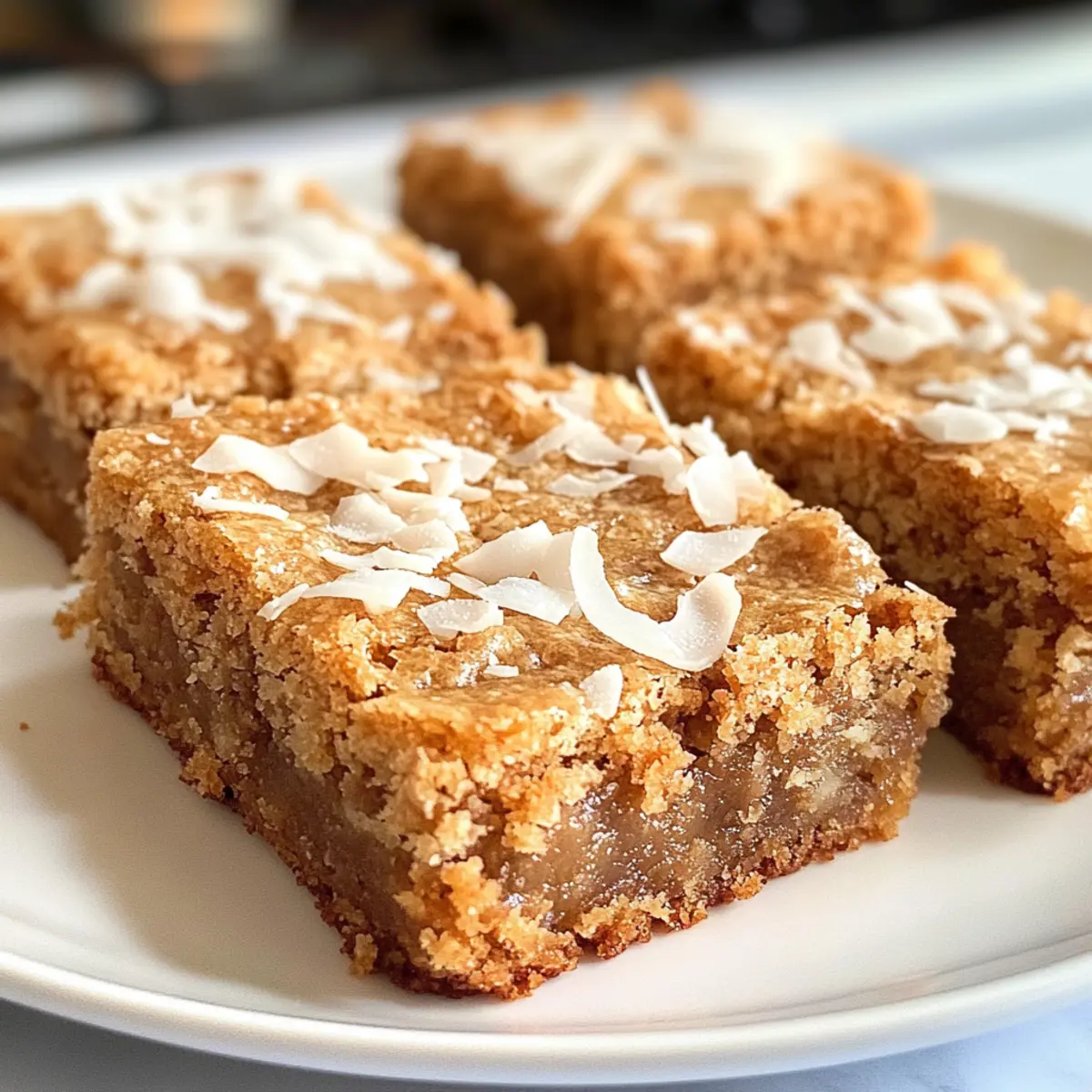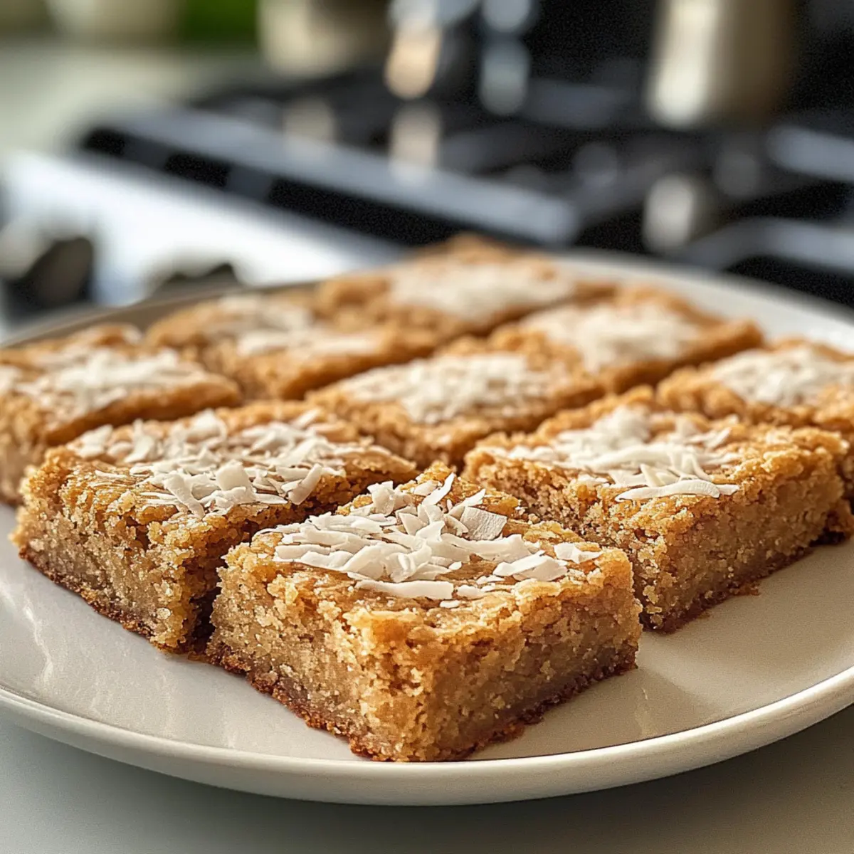 Jump to Recipe Print RecipeAs I stood in my kitchen, the warm aroma of baking chocolate chip cookies filled the air—until I abruptly remembered those weren’t on my menu today. Instead, I felt inspired to whip up a batch of Easy Coconut Blondies, a buttery and chewy alternative that never fails to impress. The beauty of this recipe lies in its simplicity; it requires just one bowl and minimal prep time, making it perfect for those busy afternoons when a dessert craving strikes unexpectedly. Infused with sweetened coconut, these blondies are a delightful change from traditional brownies, inviting everyone to indulge in a rich, flavor-packed treat without the fuss. Are you ready to transform ordinary ingredients into something extraordinary? Let’s dive into this mouthwatering adventure! Why Are Coconut Blondies So Irresistible? Simplicity at its finest: This recipe requires just one bowl, making clean-up a breeze. Buttery goodness: The blend of unsalted butter and sugars creates a rich flavor that melts in your mouth. Chewy texture: With sweetened shredded coconut folded in, every bite bursts with delightful chewiness. Quick to make: Ready in under an hour, these blondies are perfect for spontaneous cravings or last-minute gatherings. Variability: Feel free to get creative by adding nuts or chocolate chips, customizing your treats to suit any palate. These Coconut Blondies are sure to please everyone, providing a refreshing twist on typical desserts. Whether enjoyed warm or chilled, get ready for tastes that truly shine! Coconut Blondies Ingredients • For those eager to bake! For the Batter Unsalted Butter – Richness and moisture. Use salted butter and omit additional salt if preferred. Granulated Sugar – Sweetness and structure. No specific substitutes recommended. Brown Sugar – Adds moisture and a hint of toffee flavor. Can substitute with an equal part of coconut sugar for a deeper flavor. Large Eggs – Binding agent for structure. No substitutes; however, flax eggs can be used for a vegan option. Pure Vanilla Extract – Enhances flavor. Almond extract is a viable alternative for a flavor twist. All-Purpose Flour – Base structure for the blondies. Gluten-free flour blend can be used as a substitute for a gluten-free version. Baking Powder – Leavening agent to ensure the blondies rise. Not replaceable in this recipe without altering texture. Salt – Balances sweetness. Can be omitted if using salted butter. Sweetened Shredded Coconut – Key ingredient providing flavor and texture. Unsweetened coconut or different mix-ins like nuts or chocolate can be swapped. Step‑by‑Step Instructions for Easy Coconut Blondies Step 1: Preheat and Prepare Begin by preheating your oven to 350°F (175°C). While the oven warms, grab a 9×13 inch baking pan and line it with parchment paper, leaving some excess hanging over the sides for easy removal. Lightly spray the parchment with non-stick spray to prevent sticking, ensuring your Coconut Blondies will release perfectly when baked. Step 2: Melt the Butter In a medium saucepan, melt 1 cup of unsalted butter over low heat. Once fully melted, remove it from the heat and let it sit to cool slightly until it’s warm but not hot, about 5-10 minutes. This step is crucial for achieving that rich, buttery flavor without greasiness in your blondies. Step 3: Combine the Sugars In a large mixing bowl, whisk together the cooled melted butter with 1 cup of granulated sugar and 1 cup of brown sugar until fully combined. This mixture should be smooth and creamy, with a slight sheen. Take your time to ensure the sugars dissolve well, as they contribute to the lovely texture of the Coconut Blondies. Step 4: Add Eggs and Vanilla Crack in 2 large eggs and add 1 teaspoon of pure vanilla extract to the sugar mixture. Using an electric mixer on medium-high speed, beat until the eggs are fully incorporated and the mixture is light and fluffy, about 1-2 minutes. This aeration adds structure to your blondies, making them tender and chewy. Step 5: Mix in Dry Ingredients Sift together 2 cups of all-purpose flour, 1 teaspoon of baking powder, and ½ teaspoon of salt, then gradually add this dry mixture to the wet ingredients. Mix on low speed just until combined, being careful not to overmix. The dough will be thick and should look slightly shaggy, but that’s perfect for your Easy Coconut Blondies. Step 6: Fold in Coconut Gently fold in 1 cup of sweetened shredded coconut using a rubber spatula. Make sure the strands are evenly distributed through the batter for the best texture. This step will give every bite that glorious coconut flavor and chewy consistency, enhancing your blondies’ deliciousness. Step 7: Pour and Spread Carefully pour the blondie batter into the prepared baking pan, using a spatula to spread it evenly to the corners. Smooth the top with the spatula to create a nice surface. This even distribution ensures that your blondies bake uniformly, resulting in those perfect golden edges and soft center. Step 8: Bake to Perfection Place the pan in the preheated oven and bake for 35-40 minutes. Keep an eye out for a light golden color around the edges, and insert a cake tester in the center; it should come out clean or with a few moist crumbs when done. Avoid overbaking to maintain that chewy, buttery texture of your Coconut Blondies. Step 9: Cool and Slice Once baking is complete, let the blondies cool in the pan for at least 15-20 minutes. Once cooled, use the parchment overhang to lift them out. Place on a cutting board to slice into bars. The cooling process ensures that the blondies set properly, making them easier to cut and serving to you that deliciously rich flavor. Coconut Blondies Variations & Substitutions Feel free to explore these delightful twists that can elevate your Coconut Blondies experience, transforming them into your new favorite treat! Nutty Boost: Add 1 cup of chopped pecans or walnuts for a crunchy texture that compleme