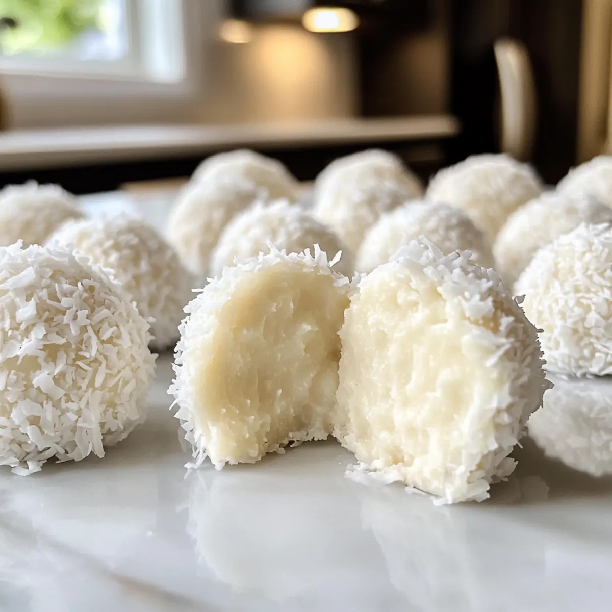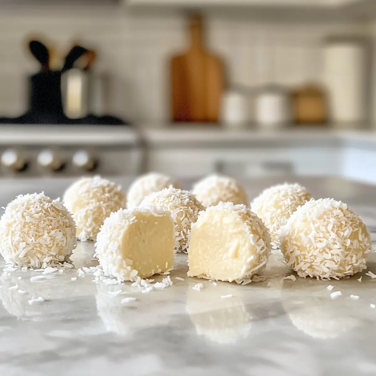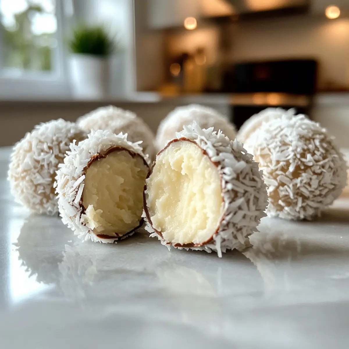 Jump to Recipe Print RecipeAs I stood in the kitchen, the scent of sweet coconut wafted through the air, whisking me back to sun-kissed beaches and tropical getaways. Today, I’m excited to share my 3-Ingredient Coconut Snowball Truffles, a delightful no-bake treat that combines simplicity and joy. With just a few pantry staples—desiccated coconut, sweetened condensed milk, and your choice of chocolate—these creamy little bites come together in no time and make the perfect addition to any festive gathering. Whether you’re looking for a quick treat to satisfy your sweet tooth or a charming homemade gift, these truffles are gluten-free and an absolute crowd-pleaser. Ready to dive into a blissful coconut experience? Let’s roll up our sleeves and make some delicious memories together! Why are Coconut Snowball Truffles amazing? Quick and Easy: You’ll love how effortlessly these truffles come together—perfect for those busy holiday seasons. Coconut Bliss: The creamy desiccated coconut satisfies your sweet cravings, bringing a taste of paradise to your home. No Baking Required: No oven? No problem! These truffles are a fantastic no-bake option, saving you time and energy. Versatile and Customizable: Feel free to mix it up with your favorite chocolate coatings or add-ins like nuts for extra crunch. Perfect for Gifting: Pack them into decorative boxes for a thoughtful homemade gift that friends and family will adore. With all these delights, why not create memories and delicious moments by trying your hand at these Coconut Snowball Truffles? They’re bound to become a festive favorite! Coconut Snowball Truffles Ingredients • Here’s what you need to create these delightful Coconut Snowball Truffles! For the Truffles Desiccated Coconut – This brings texture and a rich coconut flavor; feel free to substitute with finely shredded coconut if you prefer a smoother texture. Sweetened Condensed Milk – Adds the perfect sweetness and creaminess; for a less sweet truffle, unsweetened condensed milk with added sugar works well. White Chocolate – This coating enhances both flavor and visual appeal, creating that festive look; for a different taste experience, you can use milk or dark chocolate instead. These simple ingredients come together to create the delicious Coconut Snowball Truffles you’ll love! Step‑by‑Step Instructions for Coconut Snowball Truffles Step 1: Prepare the Tray Start by lining a large tray with baking paper or clingfilm. This will keep your Coconut Snowball Truffles from sticking and make transfer easy. Ensure the surface is smooth and flat, creating a perfect workspace for your truffles to rest as they set. Step 2: Mix the Ingredients In a large mixing bowl, combine 350g of desiccated coconut with 1 tin (397g) of sweetened condensed milk. Stir the mixture thoroughly until there are no dry pieces remaining and it forms a sticky, cohesive mass. This mixture will be the delicious center of your truffles, so make sure everything is well incorporated. Step 3: Form the Truffles Using your hands, roll the mixture into bite-sized balls, about 1-2 tablespoons each, aiming for 28-30 truffles. If the mixture feels too sticky, slightly dampen your hands to help with rolling. Place each truffle carefully onto the lined tray, ensuring they have enough space without touching. Step 4: Firming Up Once all the truffles are shaped, place the tray in the freezer for 30 minutes. This chilling time allows the Coconut Snowball Truffles to firm up, making them easier to coat with chocolate later. Keep an eye on them; they should feel solid to the touch when ready. Step 5: Melt the Chocolate While the truffles are chilling, melt 400g of white chocolate in a medium bowl. Use a microwave in short bursts of 20-30 seconds, stirring in between until smooth and glossy. The melted chocolate should be warm, not hot, for easy dipping without causing the truffles to melt. Step 6: Coat the Truffles Once melted, take the chilled truffles from the freezer. Dip each one into the white chocolate using a fork, ensuring they’re completely coated. Allow excess chocolate to drip off before placing them back on the lined tray. This step not only enhances flavor but also creates that signature snowball look. Step 7: Add Finishing Touches After dipping, sprinkle additional desiccated coconut on top of each truffle while the chocolate is still wet. This adds a delightful texture and reinforces the coconut theme. Be generous for that beautiful snowy appearance that makes your Coconut Snowball Truffles even more inviting. Step 8: Set the Chocolate Place the tray with the coated truffles in the refrigerator for 1 hour to let the chocolate set completely. This final chilling ensures that the chocolate hardens, making each Coconut Snowball Truffle a delightful treat to bite into, perfectly firm yet creamy inside. Storage Tips for Coconut Snowball Truffles Fridge: Store your Coconut Snowball Truffles in an airtight container for up to 2 weeks. This will keep them fresh and ready to enjoy whenever you crave a treat. Freezer: You can also freeze these truffles for up to 3 months. Ensure they are in a single layer on a tray until firm, then transfer them to an airtight container or freezer bag. Thawing: When ready to enjoy, simply remove the truffles from the freezer and let them sit at room temperature for about 30 minutes before serving, allowing chocolate to soften slightly. Reheating: If desired, you can briefly warm them in the microwave (about 5-10 seconds) to enhance their softness, but be careful not to melt the chocolate coating. Coconut Snowball Truffles Variations Feel like getting a bit creative? Here’s how you can customize these truffles to suit your taste and preferences! Chocolate Variations: Switch things up by coating the truffles in milk or dark chocolate for a richer flavor. Each type brings its own delightful twist. Nutty Delight: Fold in chopped nuts like almonds or pistachios into the co