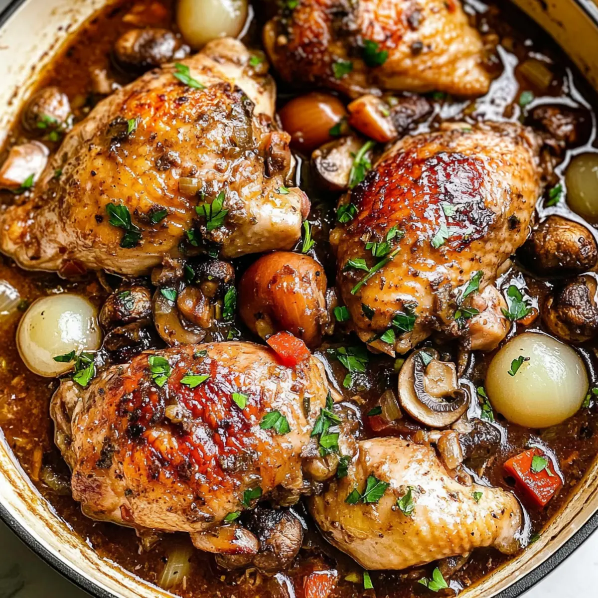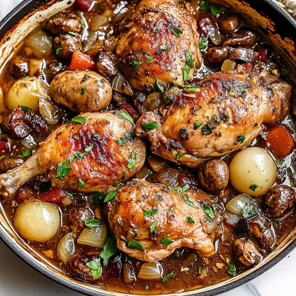 Jump to Recipe Print RecipeAs I stood in my kitchen, the rich aroma of garlic and wine bubbling in the pot reminded me of the charm of a rustic French bistro. This is the magic of Coq Au Vin, a classic French chicken stew that effortlessly transforms an ordinary evening into something special. With its tender chicken, smoky bacon, and a velvety sauce, this comforting dish not only satisfies the palate but also offers a delightful one-pan experience that makes cleanup a breeze. Whether you’re hosting a gathering or enjoying a cozy night in, this easy recipe will surely impress and warm the hearts of everyone at your table. Ready to dive into a dish that’s perfect for all occasions? Let’s get cooking! Why is Coq Au Vin a Must-Try? Comforting Flavor: Coq Au Vin delivers an incredibly rich, savory taste, thanks to the essence of red wine and aromatic herbs. This dish is all about indulgence in every satisfying bite. One-Pan Wonder: You’ll love the simplicity of cooking everything in one pot, making it a breeze to clean up after a delicious meal with little effort. Versatile Ingredients: From using different wines to adding veggies like peas or mushrooms, this recipe allows creativity in the kitchen. Perfect for Gatherings: Impress your guests with this classic French dish that’s great for any occasion, whether a cozy family dinner or a classy soirée. Check out our other one-pan delights like Air Fryer Hand for additional inspiration! Coq Au Vin Ingredients • Classic French chicken stew requires simple yet flavorful components! For the Chicken Chicken (drumsticks and thighs) – Main protein providing richness; bone-in, skin-on preferred for better flavor. Salt – Enhances overall flavor; adjust according to taste. Cracked pepper – Adds a gentle heat; feel free to adjust this to your spice preference. For the Cooking Base Olive oil – Adds fat for cooking; you can substitute with vegetable oil if needed. Bacon – Provides a smoky flavor base; pancetta works well as a substitute too. Onion – Base flavor and texture; swap for shallots if you prefer a milder taste. Carrots – Sweetness and color come from these; no substitution needed, but parsnips are an option. Garlic – Aromatic goodness; fresh works best, but garlic powder can be used in a pinch. For Flavor and Richness Brandy – Optional, but enhances depth of flavor; feel free to omit if not available. Red wine (Burgundy/Pinot Noir/Shiraz) – Essential for braising; contributes aroma and flavor—choose according to your taste! Chicken stock – Moisture and flavor are enhanced with this; low sodium is preferred, or vegetable broth can work as an alternative. Thyme sprigs – Fresh thyme is ideal for flavor; dried thyme can be used (about 1/3 of the amount). For the Sauce Unsalted butter – Adds creaminess to the sauce and is used both for sautéing and finishing. All-purpose flour – Thickens the sauce; feel free to use gluten-free flour if needed. For the Extras Pearl onions – Offers sweetness and visual appeal; frozen small onions are a great shortcut. Cremini mushrooms – Earthy flavor and texture; button mushrooms can substitute if preferred. Fresh parsley – Garnish that adds color and herbal freshness to the dish. Each ingredient plays an integral role to ensure that your Coq Au Vin is as authentic and delightful as possible! Enjoy this classic French recipe. Step‑by‑Step Instructions for Coq Au Vin Step 1: Preheat the Oven Begin by preheating your oven to 350°F (175°C). This temperature is key for braising the chicken to tender perfection later in the cooking process. Ensure your oven is fully heated to create an ideal environment that will allow the flavors to meld beautifully. Step 2: Cook the Bacon In a large pot or Dutch oven, heat a tablespoon of olive oil over medium heat. Once shimmering, add chopped bacon and cook until crispy, about 5-7 minutes. Stir occasionally to prevent burning. Once done, remove the bacon with a slotted spoon and set it aside on a paper towel-lined plate to absorb excess grease. Step 3: Sear the Chicken Season your chicken drumsticks and thighs generously with salt and cracked pepper. In the same pot with the bacon fat, carefully add the chicken pieces in batches, searing each side until golden brown, approximately 4 minutes per side. Once browned, transfer the chicken to a plate and set it aside. Step 4: Sauté the Vegetables With the chicken removed, add diced onions and sliced carrots to the pot. Sauté for about 5-7 minutes, stirring frequently until the onions turn translucent and start to soften. Then, add minced garlic and continue to sauté for an additional minute, allowing the aroma of the garlic to fill your kitchen. Step 5: Deglaze the Pot Pour in ¼ cup of brandy (if using) to deglaze the pot, scraping up any browned bits stuck to the bottom. Cook for about 2 minutes until the alcohol evaporates. Then, add 2 cups of red wine and 1 cup of chicken stock, stirring to combine all the flavors together. The mixture should begin to bubble gently. Step 6: Combine Ingredients Add the thyme sprigs, cooked bacon, and the seared chicken back into the pot, ensuring that the chicken is submerged in the flavorful liquid. Bring everything to a simmer over medium heat, then cover the pot and carefully transfer it to your preheated oven. Bake for 20-30 minutes, or until the chicken is cooked through and reaches an internal temperature of 165°F. Step 7: Sauté the Mushrooms While the Coq Au Vin cooks in the oven, melt 2 tablespoons of unsalted butter in a skillet over medium heat. Add sliced cremini mushrooms and sauté for about 5 minutes until they’re tender and lightly browned. Remove from heat and set aside for later. Step 8: Thicken the Sauce After the chicken has cooked, carefully remove the pot from the oven. To thicken the sauce, melt another tablespoon of butter in the skillet, then whisk in 2 tablespoons of flour until smooth. Slowly stir this mixture back in