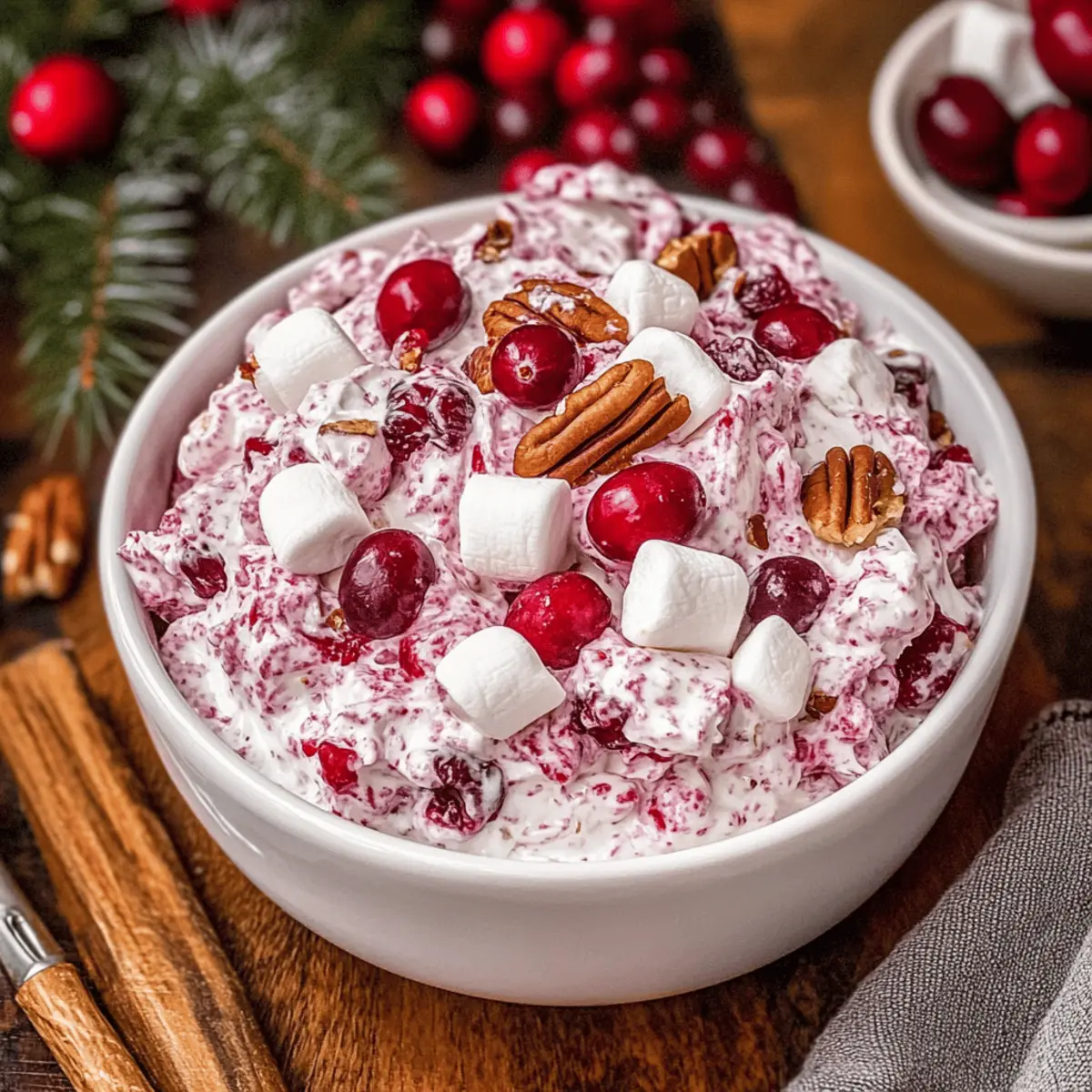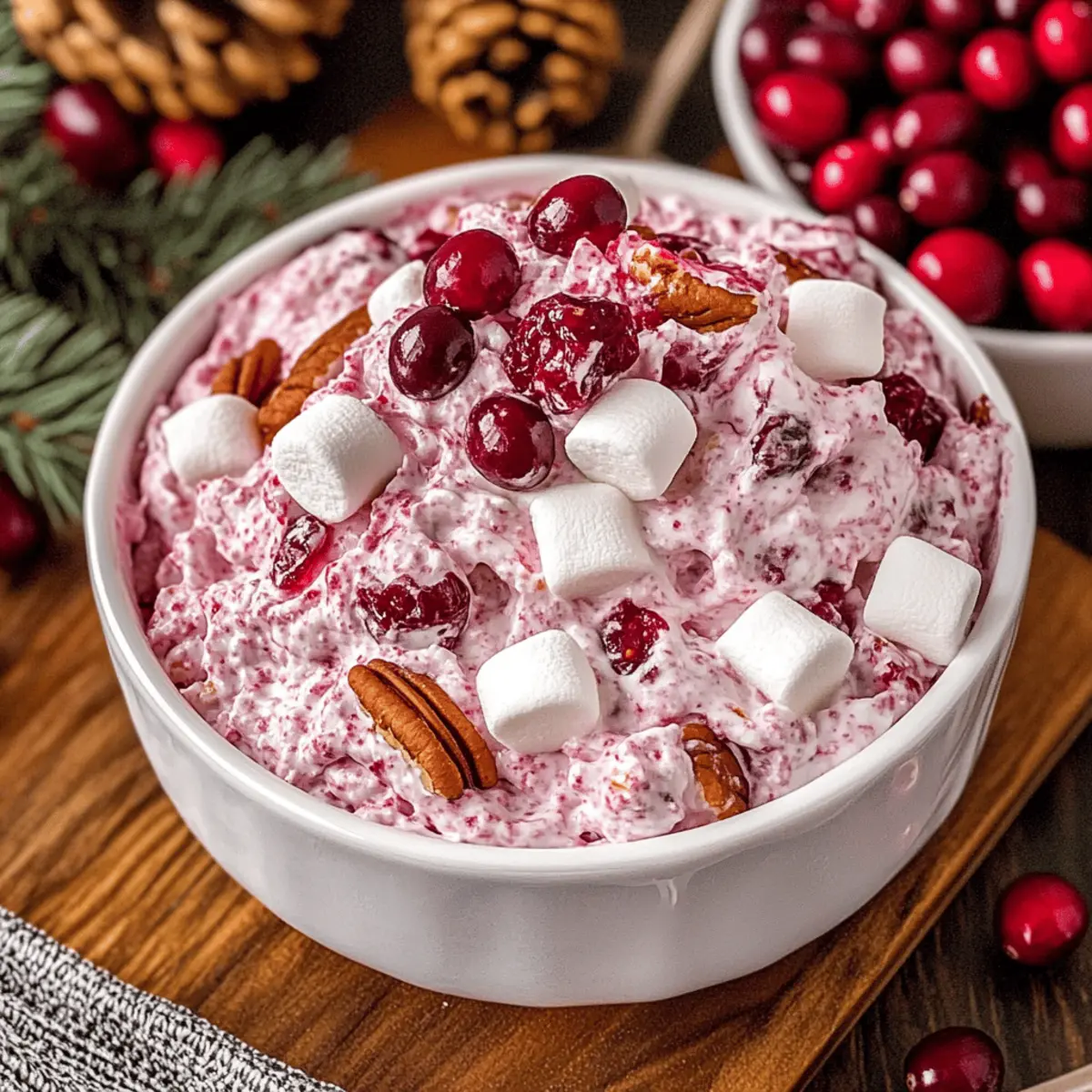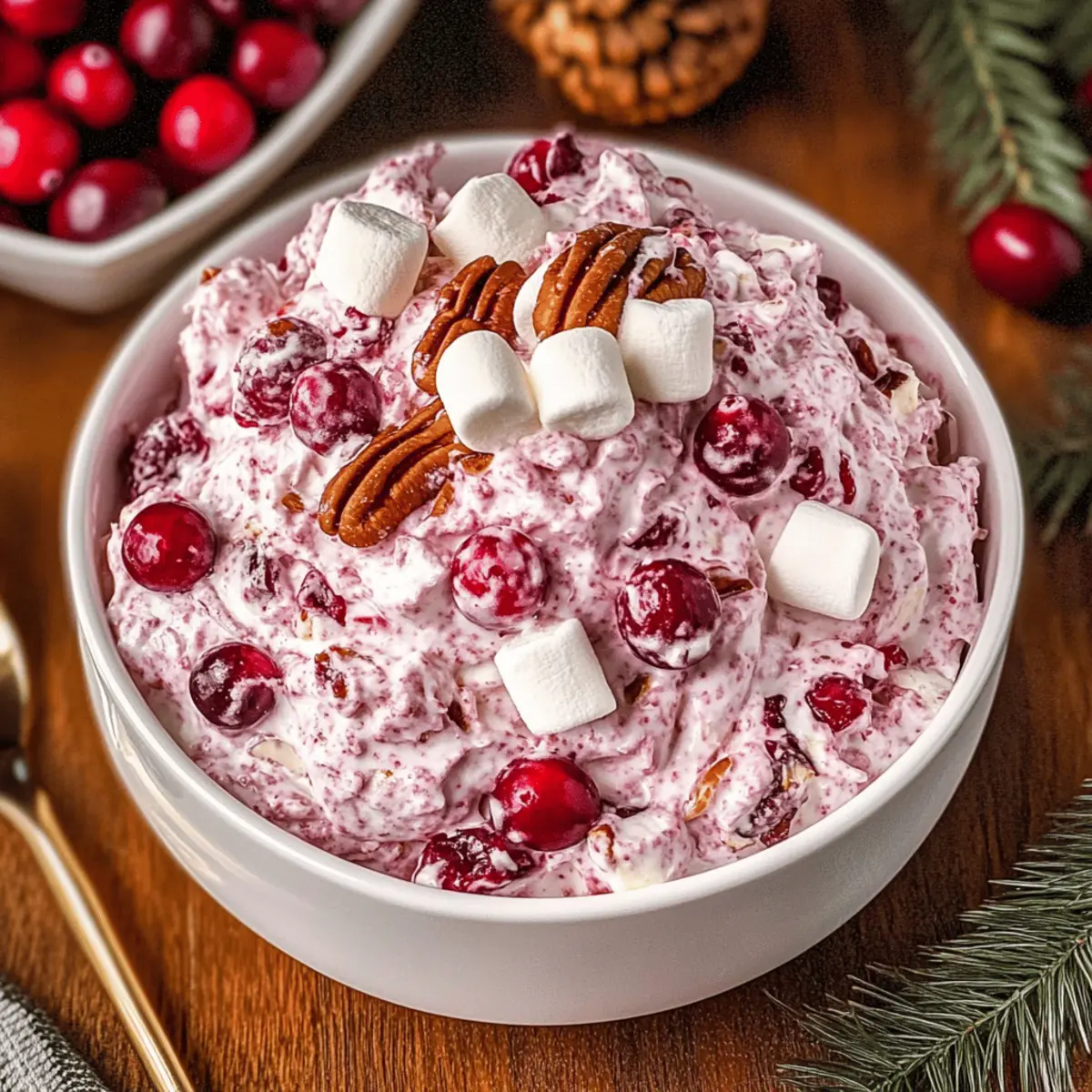 Jump to Recipe Print RecipeAs the holiday season approaches, one irresistible dish always takes center stage on my festive table: Cranberry Fluff. This delightful blend of fresh cranberries, sweet pineapple, and fluffy cream cheese creates a symphony of flavors that dances across your palate. Not only is this recipe a stunningly colorful addition to your holiday spread, but it’s also gluten-free and quick to prepare, ensuring you have more time to enjoy the festivities with your loved ones. Whether served as a side dish or a light dessert, this creamy cranberry fluff salad will charm your guests and leave them craving seconds. With the right balance of tart and sweet, it’s hard to resist the allure of this seasonal treat! Curious how to whip up this colorful crowd-pleaser? Let’s get started! Why is Cranberry Fluff a Must-Try? Colorful Presentation: This Cranberry Fluff Salad brightens any holiday table, instantly captivating guests with its vibrant hues. Easy to Make: With just a few simple steps, you’ll create a delightful side dish or dessert that doesn’t take hours in the kitchen. Crowd-Pleasing Flavor: The perfect blend of sweet and tart makes it a favorite among both kids and adults. Versatile Ingredients: Customize it by adding your favorite nuts or substitute fruits for an entirely new twist! Time-Saving: Prepare it in advance and chill, so you can spend more time enjoying the holiday festivities. Gluten-Free Delight: This dish caters to gluten-free diets, making it an inclusive option for all your guests. Cranberry Fluff Ingredients For the Salad • Cranberries – Fresh or thawed cranberries provide the tartness that balances the sweetness of the salad. • Crushed Pineapple – Adds tropical sweetness; be sure to drain it well to maintain the perfect texture. • Mini Marshmallows – These delightful bites contribute sweetness and a fun chewy element to the fluff. • Chopped Pecans – Introduces a crunch; feel free to use walnuts or almonds for a variety of textures. • Powdered Sugar – Sweetens the mixture and dissolves easily, creating a smooth consistency; adjust to your preference. • Cream Cheese – The creamy base that adds richness; remember it should be at room temperature for blending ease. • Cool Whip – This whipped topping gives the salad its fluffiness; ensure it’s fully thawed before use. For Optional Toppings • Fresh Cranberries – Add a pop of color and a hint of tartness as a garnish. • Additional Whipped Topping – Elevate the fluffiness further for a delightful finish. • Chopped Nuts – Sprinkle on top for extra crunch and flavor. • Fresh Herbs – Bright herbs like mint can provide a refreshing touch and visual appeal. This Cranberry Fluff Salad is not just a treat to the taste buds, but it also brings a festive flair to your holiday gatherings! Step‑by‑Step Instructions for Cranberry Fluff Salad Step 1: Prepare the Cranberries Begin by pulsing the fresh or thawed cranberries in a food processor until they are coarsely chopped, ensuring a few small chunks remain for texture. This should take about 10-15 seconds. You’ll know they are ready when the color brightens, and they resemble small bits rather than whole berries. Step 2: Mix the Base Ingredients In a medium-sized mixing bowl, combine the processed cranberries with the well-drained crushed pineapple and powdered sugar. Stir until the ingredients are thoroughly mixed, creating a vibrant medley. This process should take about 2-3 minutes. Set the mixture aside, allowing the flavors to meld while you prepare the cream cheese mixture. Step 3: Beat the Cream Cheese In a separate large mixing bowl, take your room-temperature cream cheese and beat it with an electric mixer at medium speed until it becomes smooth and creamy, which should take about 2-3 minutes. Make sure to scrape down the sides of the bowl to incorporate all the cream cheese. This is the base for your creamy cranberry fluff! Step 4: Fold in the Whipped Topping Once the cream cheese is smooth, gently fold in the thawed Cool Whip with a spatula until fully combined. Be careful not to overmix as you want to maintain that airy fluffiness. This step should take another 2-3 minutes. The mixture should look light and creamy, resembling a cloud. Step 5: Combine Everything Together Now, combine the cranberry-pineapple mixture with the creamy mixture you just made. Use a spatula to carefully fold them together, ensuring all flavors are melded for a perfect Cranberry Fluff Salad. This should only take about 2 minutes; you want it to be well combined without losing the light fluffiness. Step 6: Add Marshmallows and Pecans Fold in the mini marshmallows and chopped pecans, distributing them evenly throughout the mixture. This process adds a delightful chewy texture and nutty crunch to your cranberry fluff. Take about 1 minute for this step, being gentle to keep the fluffiness intact. Step 7: Chill the Salad Cover your mixture with plastic wrap or a lid and refrigerate for a minimum of 4 hours, or ideally overnight. Chilling allows the flavors to meld beautifully, resulting in a stunning Cranberry Fluff Salad. The salad will firm up and become even fluffier, so be sure to plan ahead! Step 8: Serve with Style When ready to serve, scoop the cranberry fluff into a festive bowl. For an extra touch, top with additional whipped topping, fresh cranberries, or a sprinkle of chopped nuts. Enjoy this colorful salad chilled, as a delightful side dish or festive dessert, during your holiday gatherings! Storage Tips for Cranberry Fluff Fridge: Store leftovers in an airtight container in the refrigerator for up to 2 days to maintain freshness and flavor. Freezer: For longer storage, freeze the cranberry fluff in a freezer-safe container for up to 2-3 months. Thaw overnight in the refrigerator before serving. Serving: Enjoy the salad chilled; it retains its delightful texture best when served fresh. If it seems a bit dense after fre