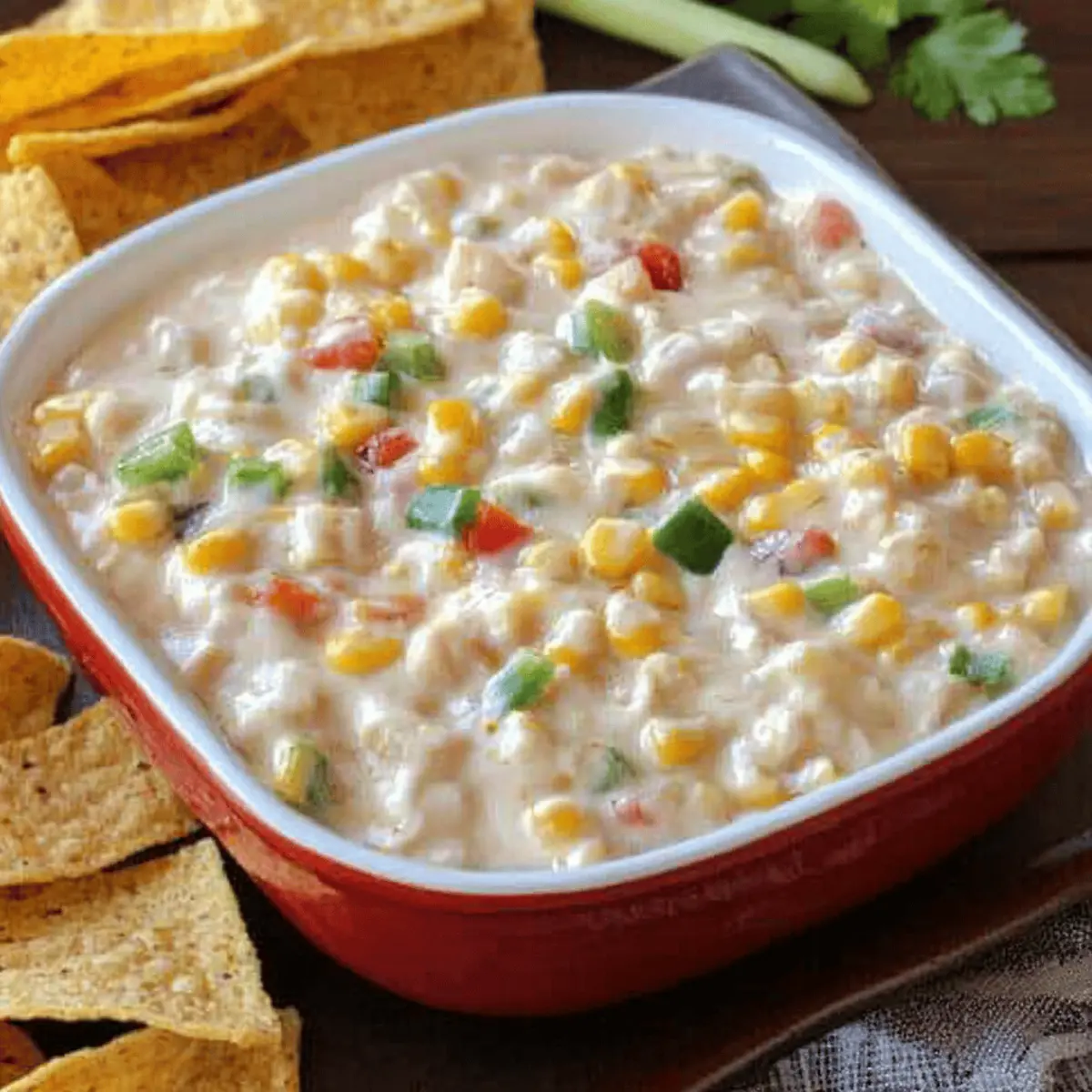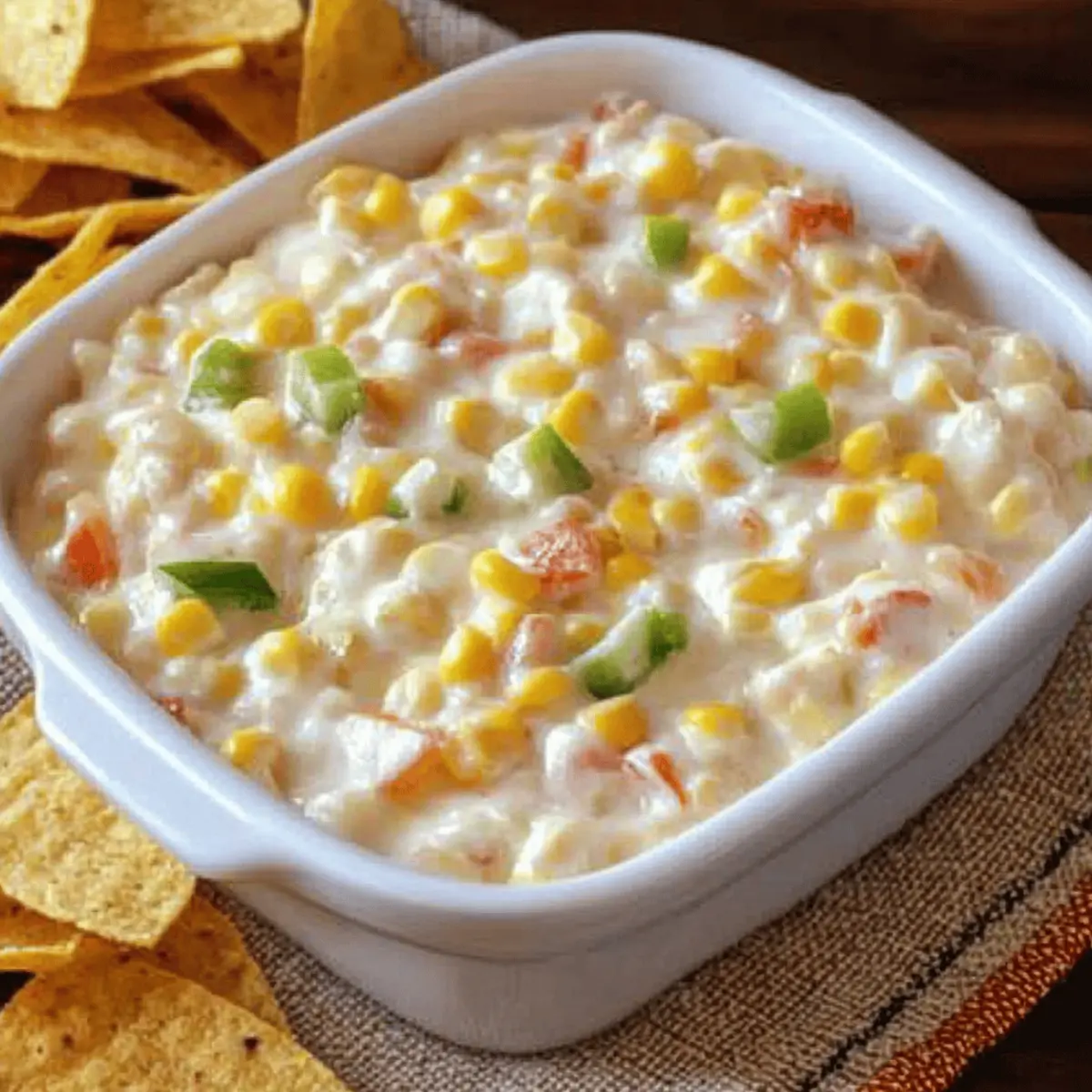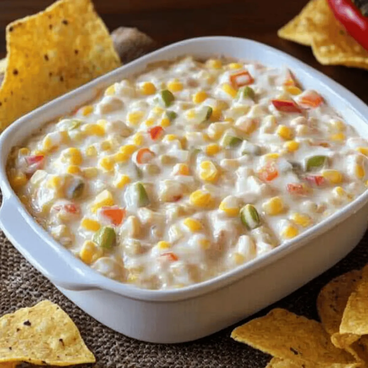 Jump to Recipe Print RecipeThere I was, surrounded by friends, the laughter flowing as effortlessly as the warm summer breeze, when someone brought out a bowl of creamy goodness that changed everything—a Cream Cheese Corn Dip that instantly stole the show. This delightful appetizer combines ingredients we all adore: velvety cream cheese, sweet corn, and just the right kick from green chilis. In just 15 minutes, you can whip it up for your next gathering, making it not only a quick win but also a guaranteed crowd-pleaser. Whether served with crispy crackers or fresh veggie sticks, this gluten-free dip is perfect for those moments when you crave something comforting yet impressive. Ready to dive into this delicious, creamy creation? Why is this dip a must-try? Creamy Texture: This dip offers a velvety mouthfeel that feels like a hug in every bite. It’s the ultimate comfort food! Quick & Easy: Ready in just 15 minutes, this dip is perfect for those last-minute gatherings, ensuring you spend less time in the kitchen and more time with your friends. Flavor Explosion: The combination of sweet corn and zesty green chilis gives this dip a delightful kick, striking a perfect balance between savory and slightly spicy that everyone will love. Versatile Serving Options: Enjoy it with crackers, baguette slices, or even as a spread on sandwiches—this dip fit any occasion. You might even want to check out my delicious Garlic Parmesan Cheeseburger for more serving ideas! Make-Ahead Convenience: Prepare this dip in advance and store it in the fridge for up to three days; the flavors only get better over time! Cream Cheese Corn Dip Ingredients For the Dip Cream Cheese – Provides a creamy base; for a lighter option, use Neufchâtel. Sour Cream – Adds tanginess; can be swapped with Greek yogurt for a healthier twist. Mayonnaise – Contributes richness; opt for light mayonnaise to reduce calories. Salt – Enhances flavors; adjust based on personal taste preferences. Ground Black Pepper – Adds mild heat; white pepper can be a subtle alternative. Garlic Powder – Infuses savory depth; fresh minced garlic will provide a stronger flavor. Smoked Paprika – Adds a smoky note; regular paprika works if you prefer a milder taste. Lime Juice – Balances flavors with acidity; lemon juice is a suitable substitute if needed. Diced Green Chilis – Introduces heat and flavor; use jalapeños for an extra spicy kick. Bell Peppers (Green and Red) – Adds color and crunch; yellow or orange bell peppers can sweeten things up. Shredded Mexican Cheese Blend – Contributes a melty texture; Cheddar or Monterey Jack are great alternatives. Corn – Brings sweetness and texture; fresh corn offers a lighter, fresher taste compared to canned. Step‑by‑Step Instructions for Cream Cheese Corn Dip Step 1: Mix the Creamy Base In a large mixing bowl, combine 8 ounces of softened cream cheese, 1 cup of sour cream, and ½ cup of mayonnaise. Using a hand mixer or spatula, blend these until the mixture is smooth and creamy, with no lumps remaining. This should take about 2-3 minutes. The mixture should appear velvety and well-combined, creating a luscious base for your Cream Cheese Corn Dip. Step 2: Season the Mixture Add 1 teaspoon of salt, ½ teaspoon of ground black pepper, 1 teaspoon of garlic powder, 1 teaspoon of smoked paprika, and the juice of 1 lime to the cream mixture. Stir well with a spoon or spatula until all seasonings are fully incorporated, enhancing the depth of flavor. This step should take about 1-2 minutes and will ensure a balanced taste throughout the dip. Step 3: Fold in the Fresh Ingredients Gently fold in 1 can (15 ounces) of drained corn, 1 cup of diced green chilis, ½ cup of finely chopped bell peppers (both green and red), and 1 ½ cups of shredded Mexican cheese blend. Use a spatula to ensure the ingredients are mixed evenly without breaking down the corn or peppers. This might take about 2-3 minutes. The mixture should look colorful and chunky, showcasing the fresh ingredients. Step 4: Chill for Enhanced Flavor Transfer your Cream Cheese Corn Dip to an airtight container or cover the mixing bowl with plastic wrap. Place it in the refrigerator for at least 30 minutes to allow the flavors to meld together beautifully. You’ll notice the dip thickens slightly as it chills. This step enhances the overall taste, resulting in a dip that’s even better once served. Step 5: Serve and Enjoy After chilling, serve your Cream Cheese Corn Dip cold alongside an array of dippers like tortilla chips, baguette slices, or fresh veggie sticks. Keep the dip in the fridge until you’re ready to serve for the best texture and flavor. This delightful appetizer is sure to impress your guests with its creamy consistency and delicious flavor! Expert Tips for Cream Cheese Corn Dip Room Temperature Cream Cheese: Always start with cream cheese at room temperature for a smoother blend. Cold cream cheese can result in lumps that make the dip less creamy. Freshness Factor: Don’t shy away from adding more lime juice; it elevates the freshness of the dip alongside the sweetness of the corn. Let it Rest: Allow the dip to chill for at least 30 minutes, or longer if possible. This resting time lets the flavors meld beautifully, creating a more delicious Cream Cheese Corn Dip. Salt Smart: If you’re using salted cheese or mayonnaise, be cautious with extra salt in the recipe. Taste before seasoning to avoid over-salting! Customize Your Heat: Adjust the spice level by choosing milder or spicier green chilis. You can even switch to jalapeños if you’re craving a more intense kick. How to Store and Freeze Cream Cheese Corn Dip Fridge: Store in an airtight container for up to 3 days. The flavors will intensify, making it even more delicious when served after a day in the fridge. Freezer: For longer storage, freeze in a suitable container for up to 2 months. Thaw overnight in the fridge before reheating. Reheating: While thi
