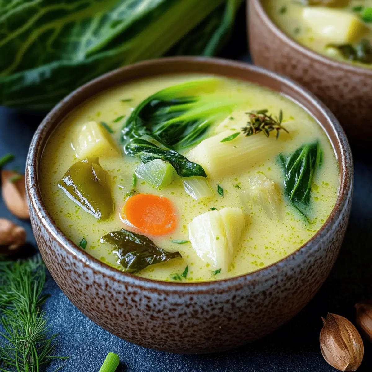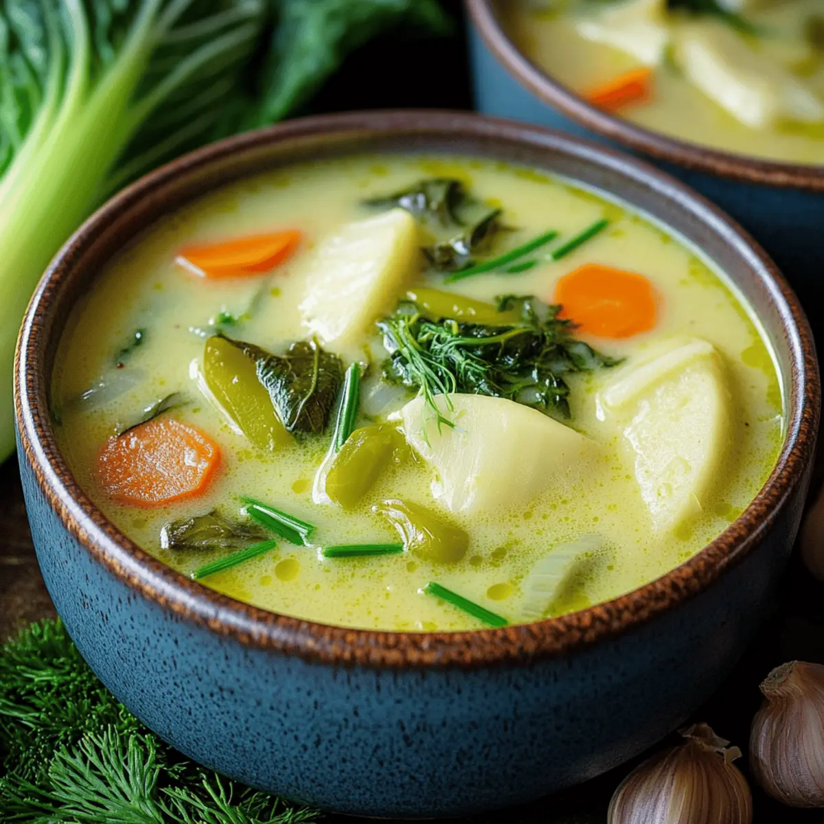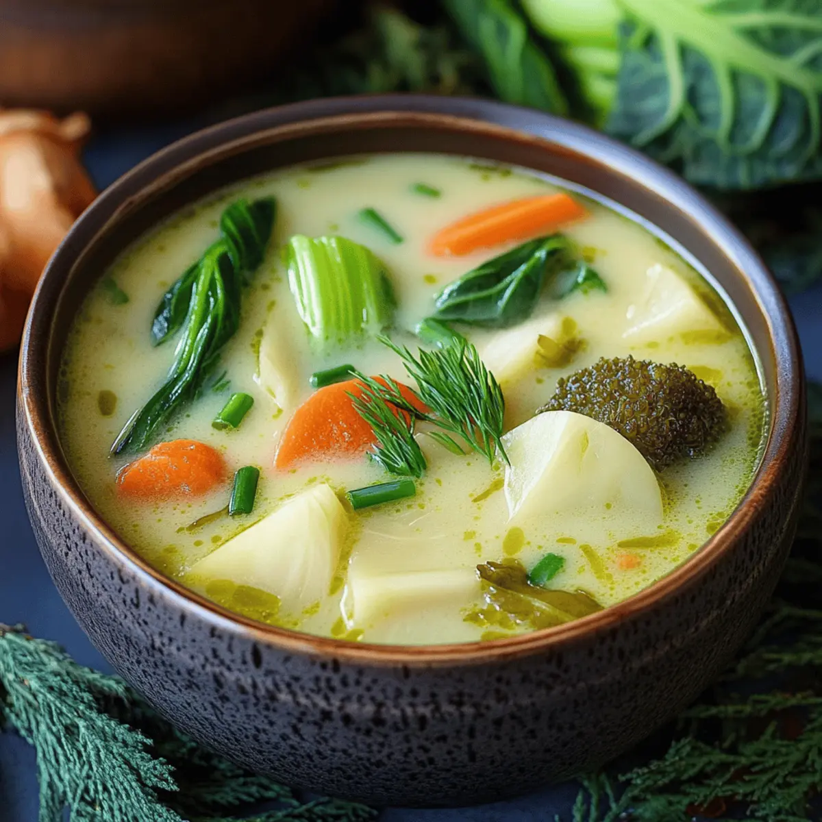 Jump to Recipe Print RecipeAs I stirred the pot, the aroma of fresh ginger and sautéed garlic wafted through the kitchen, instantly transporting me to a bustling market in Thailand, where vibrant flavors take center stage. This Creamy Vegetable Soup with Green Chili Paste is a lovely nod to those lively days, bringing together the warmth of coconut milk and a vibrant medley of veggies. Not only is this soup a quick, weeknight go-to for when the temperature drops, but it also offers a hearty, gluten-free option that’s perfect for clearing out your produce drawer. With a perfect balance of creamy richness and spicy zest, it’s a comforting dish that the entire family will adore. Are you ready to discover a soul-soothing recipe that will redefine the classic vegetable soup? Why is this soup a must-try? Creaminess at its best! This Cream of Vegetable Soup is luxuriously smooth, thanks to velvety coconut milk that wraps around each flavorful bite. Unique twist: The zesty green chili paste adds a surprising kick that elevates the traditional vegetable soup to new heights. Quick to make: Perfect for busy weeknights, it comes together in under 30 minutes! Full of nutrition: Packed with fresh vegetables, this recipe ensures a hearty and healthy meal for you and your family. Serve it with crusty bread for the ultimate comforting experience! Don’t forget to check out my Slow Cooker Soup for more cozy meal ideas. Cream of Vegetable Soup Ingredients For the Soup • Cilantro – Fresh herb for flavor; substitute fresh parsley for a milder taste. • Garlic – Aromatic base flavor; garlic powder can work in a pinch, but fresh is preferred. • Scallions – Mild onion flavor; chives or shallots can be used as alternatives. • Thai Green Chili – Adds heat and depth; jalapeño can be substituted for less heat. • Ginger – Warmth and spice; omit for a milder soup if needed. • Lemongrass – Enhances taste with a citrus note; fresh lime zest can serve as a substitute. • Black Peppercorns – Warming spice; ground black pepper can be used instead. • Coriander Seeds – Provides citrusy notes; ground coriander works too. • Cumin Seeds – Adds an earthy flavor; ground cumin can be a quick substitute. • Salt – Essential for flavor enhancement; adjust based on your preference. • Sugar – Balances the acidity of the lime; taste and adjust as necessary. • Limes (zest and juice) – Brightens the soup; lemon can be a different citrus substitute. • Canola Oil – Prevents sticking during blending the paste; any neutral oil works. • Onion – Adds a base flavor; sweet onions or shallots can be good options. • Red Onion – Offers a sweet, slightly sharp flavor; regular onions can be an alternative. • Small Potato Medley – Adds heartiness; any waxy or sweet potato works well. • Carrots – Provide sweetness and color; sweet bell pepper can be a flavorful substitute. • Vegetable Broth – Base for the soup; you can use water or homemade broth in a pinch. • Baby Bok Choy – Adds texture and nutrition; substitute with spinach or Swiss chard. • Coconut Milk – Imparts creaminess and sweetness; heavy or cashew cream could replace it. • Chives – Used for garnish; green onions can be a suitable alternative. Try this Cream of Vegetable Soup for an inviting, warm embrace of flavors! Step‑by‑Step Instructions for Cream of Vegetable Soup Step 1: Prepare Green Chili Paste In a food processor, combine fresh cilantro, garlic, scallions, Thai green chili, ginger, lemongrass, black peppercorns, coriander seeds, cumin seeds, salt, sugar, lime zest, and lime juice. Pour in canola oil until the mixture resembles a thick salsa. Blend until smooth, then transfer the paste to a container and store it in the refrigerator while you prepare the soup. Step 2: Cook Vegetables In a large pot, heat a tablespoon of canola oil over medium heat. Add sliced onions (both red and white), stirring frequently for about 5 minutes until they are soft and translucent. This forms a fragrant base for your Cream of Vegetable Soup, enhancing the overall flavor profile of the dish. Step 3: Add Root Veggies Introduce the small potato medley and carrots into the pot, stirring well to combine. Sauté the mixture for another 5 minutes to allow the vegetables to begin softening and developing their natural sweetness. This step adds heartiness to your soup, creating a comforting depth of flavor. Step 4: Simmer Base Pour in the vegetable broth, raising the heat to bring the mixture to a boil. Once boiling, reduce the heat to simmer gently, partially covered, for 20 minutes. This allows the flavors to meld and the vegetables to become tender — perfect for your creamy base. Step 5: Add Paste and Coconut Milk Stir in the green chili paste that you prepared earlier, followed by coconut milk. Mix well to ensure the paste and milk are thoroughly incorporated with the broth and vegetables. Allow the soup to heat through for about 5 minutes, creating a rich, creamy texture that’s a hallmark of this Cream of Vegetable Soup. Step 6: Final Cook Add the chopped baby bok choy to the pot and continue to simmer for an additional 5 minutes. This brief cooking time will soften the bok choy while retaining some crunch. The vibrant green will also enhance the soup’s appeal and nutrition, making your dish even more inviting. Step 7: Serve Ladle the Cream of Vegetable Soup into warm bowls, serving it alone or over rice or udon for a heartier meal. Finish with a sprinkle of diced chives, adding a fresh garnish that enhances both the look and taste of your soup, ready to be enjoyed by family and friends. Expert Tips for Cream of Vegetable Soup Uniform Cutting: Ensure vegetables are cut into uniform sizes for even cooking, preventing some from becoming mushy while others remain undercooked. Heat Adjustment: Adjust the amount of green chili based on your heat preference. Start with less if you’re unsure; you can always add mo