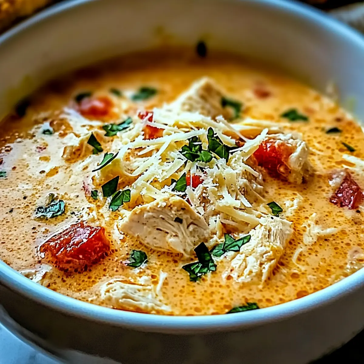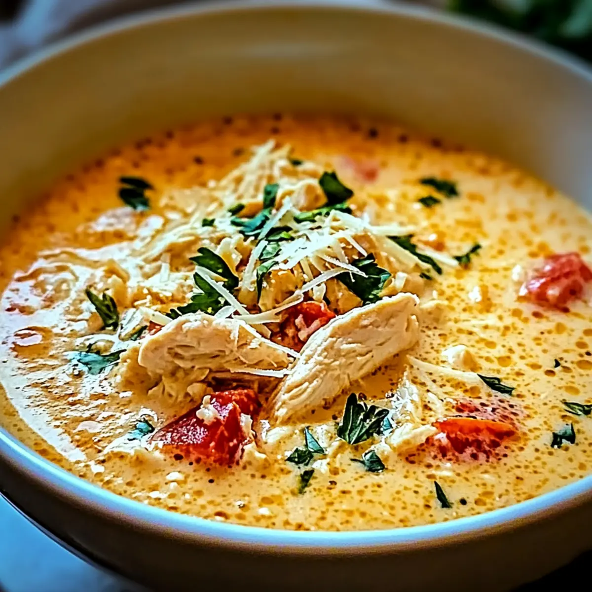 Jump to Recipe Print RecipeSliding into the kitchen on a chilly evening, I found myself craving something warm, rich, and utterly satisfying. That’s when I decided to whip up a batch of Creamy Chicken Parmesan Soup—a dish that perfectly fuses my love for cozy comfort food with the bold flavors of classic Italian cuisine. This soup effortlessly combines tender chicken, vibrant tomatoes, and a luxurious cheesy swirl, making it an instant hit with family and friends. One of the best perks? It can be on the table in under 30 minutes, leaving you more time to relax. Plus, it’s gluten-free friendly, ensuring everyone can enjoy its creamy delight. Are you ready to embrace this soul-soothing bowl of goodness? Why Is Creamy Chicken Parmesan Soup Irresistible? Comforting Warmth: This soup envelops you in a cozy embrace, perfect for chilly evenings. Speedy Prep: Ready in under 30 minutes, it’s a time-saver for busy nights, letting you enjoy quality family time. Rich, Creamy Flavor: Combining creamy textures with savory chicken and tangy tomatoes creates an explosion of flavor in every spoonful. Versatile Delight: Whether served as a satisfying dinner or a warm appetizer, it’s sure to impress. Try pairing it with Garlic Parmesan Chicken for a delightful meal! Healthy Twist: With gluten-free options available, everyone can savor this creamy delight without worry. Add in seasonal veggies and make it your own! Creamy Chicken Parmesan Soup Ingredients For the Soup Cooked shredded chicken – A primary protein source; use rotisserie chicken for a quicker prep. Olive oil – Adds richness and is used for sautéing aromatics; can substitute with vegetable oil. Yellow onion (diced) – Provides a savory base flavor; substitute with shallots for a milder taste. Garlic (minced) – Enhances overall flavor profile; use garlic powder in a pinch, but fresh is preferred. Diced tomatoes (canned) – Adds acidity and body to the soup; fresh tomatoes may be used, but adjust cooking time. Chicken broth – Deepens the flavor and forms the liquid base of the soup; vegetable broth provides a lighter version. Italian seasoning – Essential for herb flavors; can substitute with equal parts homemade mix of dried basil, oregano, thyme, and rosemary. Heavy cream – Creates a rich, velvety texture; whole milk can be a lighter alternative, but the soup will be less rich. Parmesan cheese (shredded) – Offers a salty, nutty flavor and creaminess; Asiago or Pecorino Romano are good substitutes. Salt and pepper – Season to taste; essential for enhancing flavors. Fresh parsley (chopped) – For garnish, adds color and freshness. Step‑by‑Step Instructions for Creamy Chicken Parmesan Soup Step 1: Sauté the Aromatics In a large soup pot, heat 2 tablespoons of olive oil over medium heat. Add 1 diced yellow onion and 3 cloves of minced garlic, and sauté until the onion turns translucent and soft, about 3 to 4 minutes. The fragrant aroma will fill your kitchen, setting the stage for the delicious Creamy Chicken Parmesan Soup. Step 2: Add Tomatoes and Seasoning Stir in 1 can of diced tomatoes and 1 tablespoon of Italian seasoning. Allow the mixture to simmer for about 5 minutes; this helps the flavors meld and intensifies the taste. You’ll notice the tomatoes starting to break down, creating a beautiful, vibrant base for your soup. Step 3: Incorporate Chicken Broth Pour in 4 cups of chicken broth, bringing the mixture to a gentle boil. Once boiling, reduce the heat and let it simmer uncovered for 10 minutes. The broth will begin to thicken slightly, and the flavors will deepen, turning your soup into a comforting concoction. Step 4: Mix in the Chicken Add 2 cups of cooked shredded chicken to the pot, stirring gently to combine. Allow it to warm through for about 5 minutes, ensuring the chicken absorbs the rich flavors while remaining tender. You’ll start to see steam rising as the soup warms, inviting you to enjoy a bowlful. Step 5: Create the Creamy Base Lower the heat, then stir in 1 cup of heavy cream, mixing until completely combined and smooth. This step is key to achieving the creamy texture that makes this dish so delightful. The soup should now appear luscious and inviting, a warm hug in a bowl. Step 6: Add the Parmesan Gradually sprinkle in 1 cup of shredded Parmesan cheese while stirring continuously. Allow the cheese to melt completely, enriching the soup with its nutty flavor. Taste the Creamy Chicken Parmesan Soup and adjust the seasoning with salt and pepper as needed, ensuring every bite is perfectly seasoned. Step 7: Serve and Garnish Ladle the soup into bowls while it’s still hot, and finish with a sprinkle of freshly chopped parsley and additional Parmesan on top. The vibrant colors and creamy texture create an irresistible presentation. Dive in and savor the warmth of this comforting dish, perfect for any evening! How to Store and Freeze Creamy Chicken Parmesan Soup Fridge: Keep your Creamy Chicken Parmesan Soup in an airtight container for up to 3 days. Let it cool completely before sealing to avoid steam buildup. Freezer: Store the soup in a freezer-safe container for up to 2 months. For best results, omit the cream and cheese before freezing, adding them fresh when reheating. Reheating: Gently reheat on low heat to prevent the cream from separating. Stir continuously until warmed through, and feel free to add a splash of broth if it thickens too much. Make-Ahead: This soup can be prepared a day in advance; just wait to add the cream and cheese until you’re ready to serve. Make Ahead Options These Creamy Chicken Parmesan Soup preparations are perfect for busy home cooks looking to save time during hectic weeknights! You can prep the base of the soup—sautéed onions, garlic, tomatoes, broth, and seasoning—up to 24 hours in advance. Simply refrigerate the mixture in an airtight container. When it’s time to enjoy your soup, heat the base on the stove, add the shredded chicken, the heav