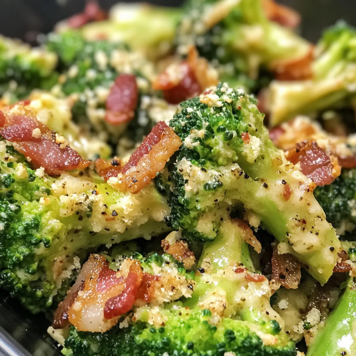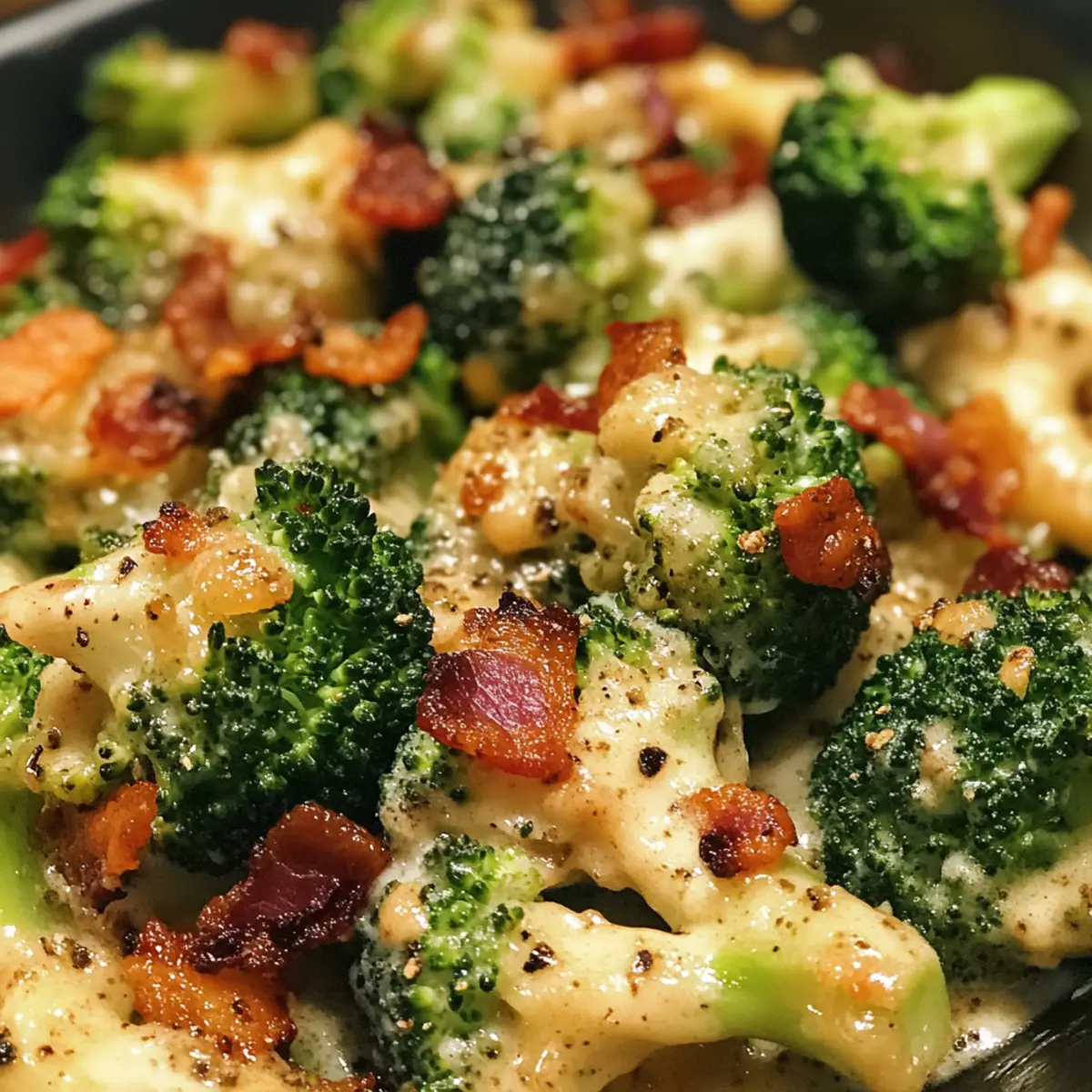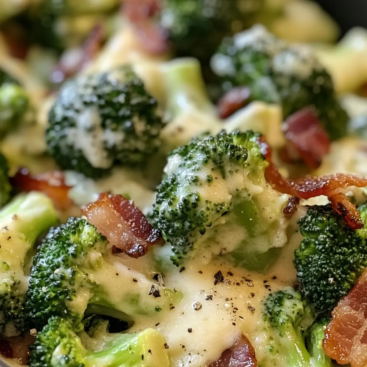 Jump to Recipe Print RecipeAs I melted into the cozy scent of sautéing garlic and crisp bacon, I felt an undeniable wave of comfort wash over me. This Creamy Garlic Parmesan Broccoli with Bacon truly transforms an ordinary vegetable side into an extraordinary delight. With its creamy, luscious sauce and the perfect crunch of bacon, it’s a dish that promises satisfaction in every bite. Not only is it quick to whip up on busy weeknights, but it also caters to those of us navigating gluten-free, low-carb, and keto diets without sacrificing flavor. Whether you’re serving it as a main course or alongside your favorite protein, this scrumptious recipe is bound to become a cherished staple in your culinary repertoire. Ready to elevate your vegetable game? Let’s dive into the details! Why is this dish a game-changer? Indulgent Comfort: This Creamy Garlic Parmesan Broccoli with Bacon is pure bliss, blending rich flavors and textures that will have you craving more. Quick and Easy: Perfect for busy nights, you can have this delicious dish on your table in no time, making it a reliable weeknight staple. Healthy Twist: With its gluten-free and low-carb profile, it fits well into various healthy eating plans without compromising on flavor. Versatile Side or Main: Serve it next to grilled chicken or as a stand-alone dish—this recipe is adaptable and satisfying! Texture Paradise: Expect a delightful crunch from the bacon and a velvety sauce that clings to the broccoli, creating an irresistible mouthfeel. Want to complement this dish? Consider pairing it with some Cheesy Garlic Breadsticks for that extra comfort! Creamy Garlic Parmesan Broccoli with Bacon Ingredients For the Broccoli Mix Broccoli florets – Fresh broccoli is preferred for maximum flavor, but frozen works as a quick substitute. Bacon – Adds a savory, smoky flavor; swap with turkey bacon for a lighter option. Butter – Essential for sautéing and adding richness; can be replaced with olive oil for a dairy-free version. Garlic – Use fresh minced garlic for the best taste and aromatic impact. For the Creamy Sauce Heavy cream – Forms the base of the creamy sauce; substitute with coconut cream for a dairy-free option. Cream cheese – Essential for a rich, creamy texture; low-fat cream cheese can lighten it up. Chicken stock – Enhances flavor depth; vegetable broth is a great alternative for vegetarians. Grated Parmesan – Provides a delicious cheesy flavor; Pecorino Romano can be used if desired. Mozzarella – Adds gooey texture; feel free to omit or substitute with a dairy-free alternative if needed. Paprika – Introduces a lovely hint of warmth; smoked paprika can enhance the flavor profile further. This creamy delight highlights the versatility of vegetables and promises to satisfy your cravings for comfort food! Step‑by‑Step Instructions for Creamy Garlic Parmesan Broccoli with Bacon Step 1: Preheat the Oven Begin by preheating your oven to 375°F (190°C). This step is crucial for ensuring that the cheese gets perfectly bubbly and golden. While the oven heats up, gather all your ingredients and equipment, such as a large oven-safe skillet to make the cooking process smooth and enjoyable. Step 2: Cook the Bacon In your large skillet, add bacon over medium heat and cook until crispy, which should take about 6–8 minutes. Once cooked, transfer the crispy bacon to a paper towel-lined plate to drain excess fat, leaving about 1 tablespoon of the bacon fat in the skillet. This will add flavor to your Creamy Garlic Parmesan Broccoli with Bacon. Step 3: Sauté the Broccoli With the skillet still over medium heat, melt the butter in the remaining bacon fat. Add the broccoli florets, seasoning with salt and pepper. Sauté for about 6 minutes, allowing the broccoli to turn bright green and tender while scraping the flavorful browned bits off the bottom. This adds a delicious depth to your dish! Step 4: Add the Garlic Next, stir in the minced garlic and continue to cook for about 1 minute until you can smell the aroma wafting through your kitchen. This step enhances the overall flavor profile of the Creamy Garlic Parmesan Broccoli. Then, pour in the heavy cream, cream cheese, chicken stock, half of the grated Parmesan, and paprika. Stir this mixture, simmering on low for 3–4 minutes until the sauce is smooth and creamy. Step 5: Incorporate the Bacon Once your sauce is well combined, fold in the crispy bacon, ensuring all the delicious flavors meld together. This step gives the Creamy Garlic Parmesan Broccoli with Bacon its hearty texture. Finally, sprinkle the remaining cheeses on top to create a gooey, cheesy crust as it bakes. Step 6: Bake the Dish Transfer the skillet into your preheated oven and bake for 15 minutes. This will allow the cheese to melt beautifully and get bubbly. For a delightful touch, broil for an additional 2 minutes to achieve a crispy, golden top that adds an enticing crunch to the creamy dish. Step 7: Final Touches Once out of the oven, season with freshly ground pepper and garnish with chopped parsley for a pop of color before serving. Your Creamy Garlic Parmesan Broccoli with Bacon is now ready to be enjoyed as a comforting side or a satisfying main dish that delights the taste buds! Creamy Garlic Parmesan Broccoli with Bacon Variations Feel free to customize this delightful recipe according to your taste preferences and dietary needs! Chicken Swap: Substitute the bacon with diced chicken for a protein boost. This switch adds a different texture while keeping the flavor satisfying. Turkey Bacon: Use turkey bacon to lighten the dish, keeping it savory and smoky without the extra fat. It’s a delicious option that still pairs beautifully with the creamy sauce. Vegetable Additions: Toss in diced bell peppers or spinach for a splash of color and added nutrition. These veggies complement the broccoli while enhancing the dish’s overall flavor profile. Dairy-Free Option: Replace heavy cream and cre