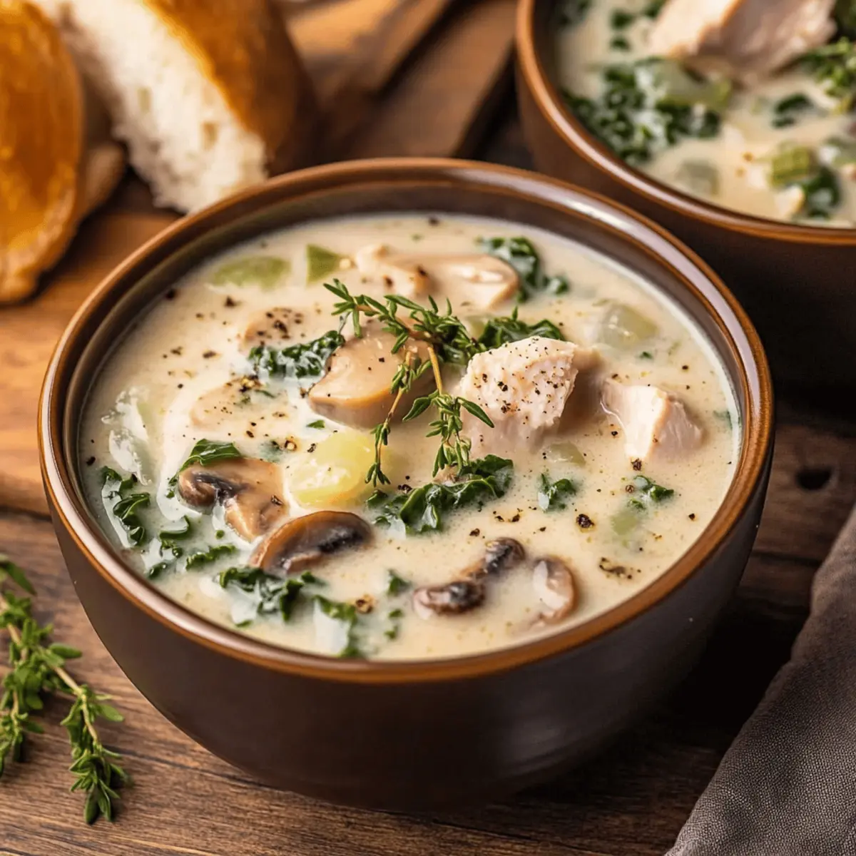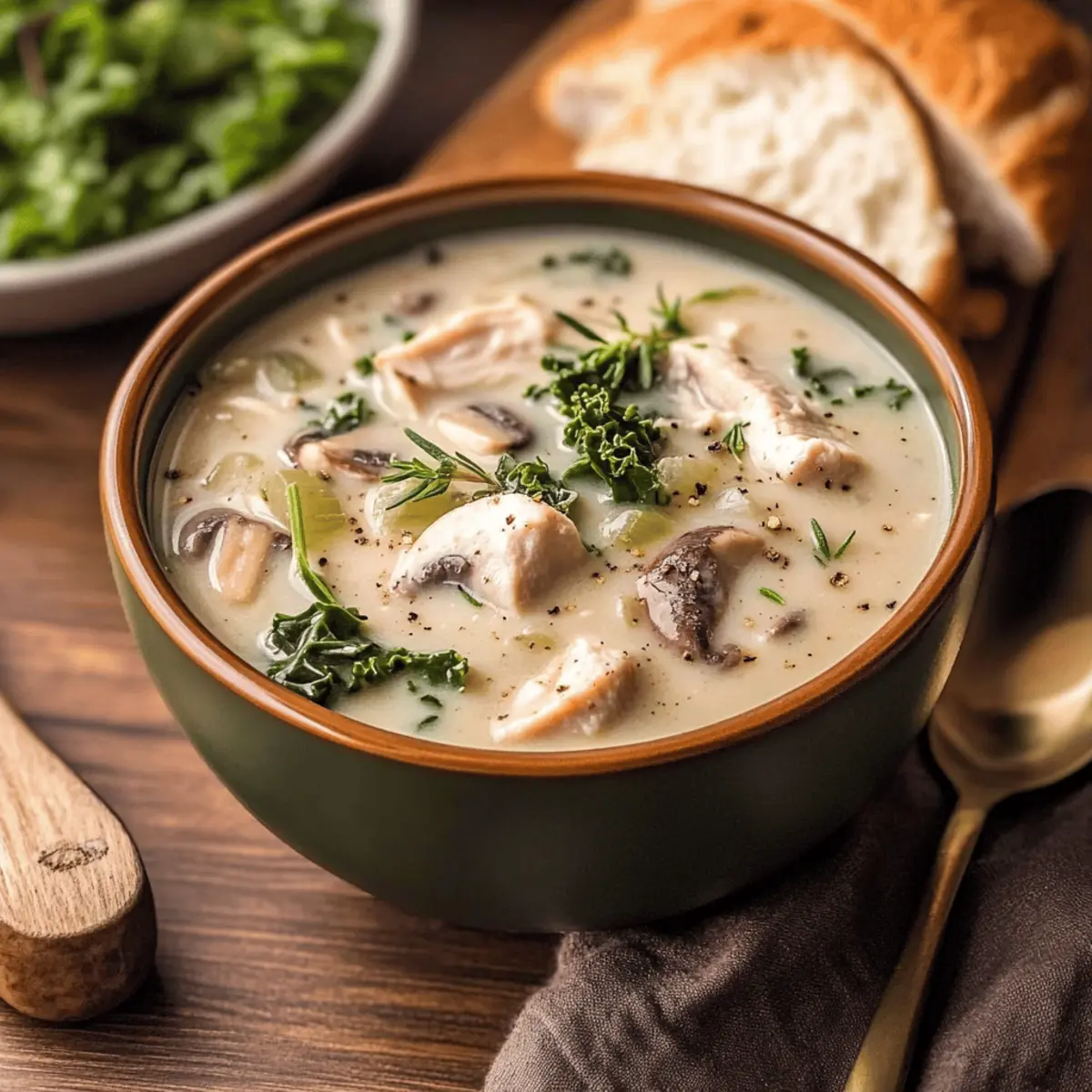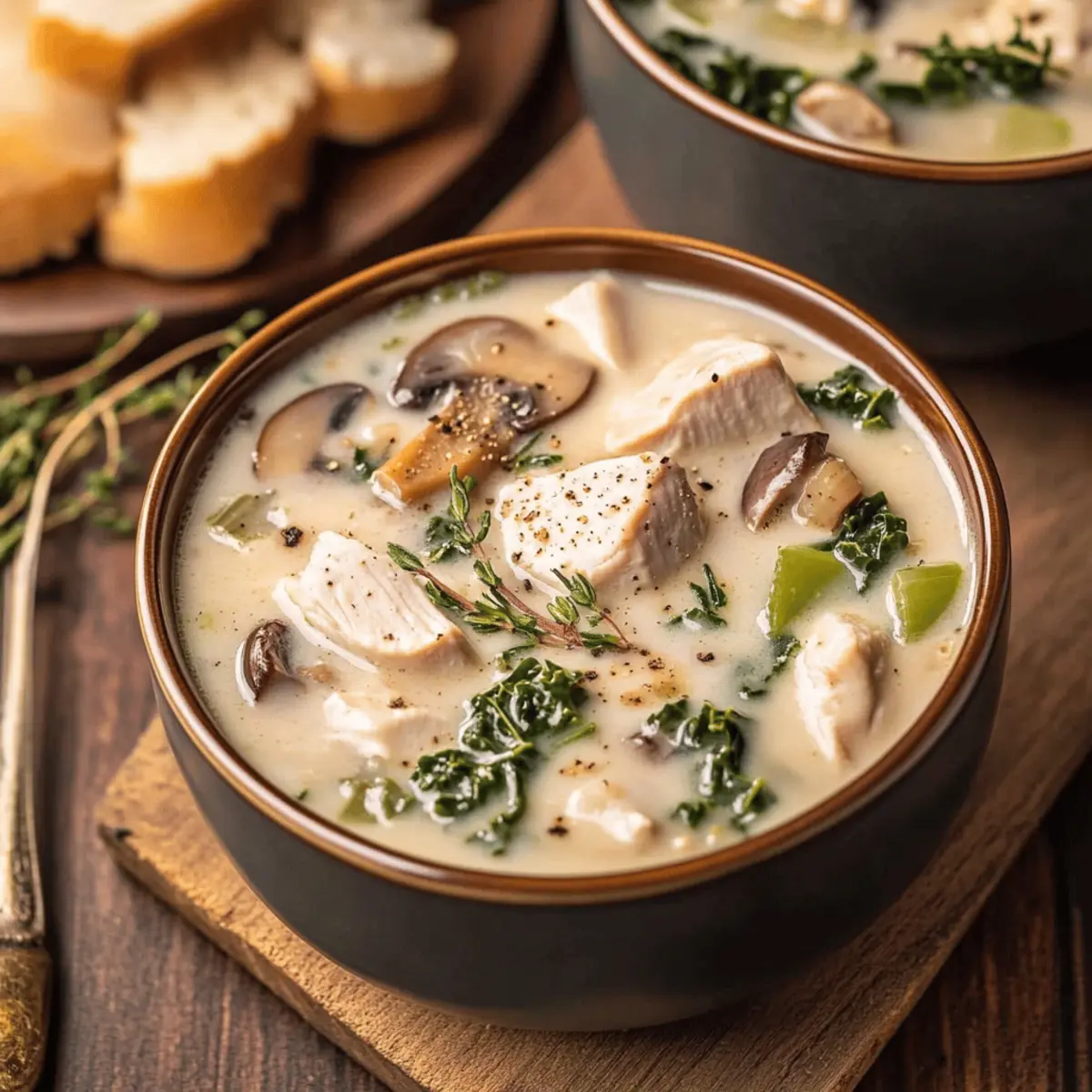 A comforting bowl of Creamy Mushroom Kale Turkey Soup, perfect for chilly days, featuring tender turkey, earthy mushrooms, and vibrant kale.