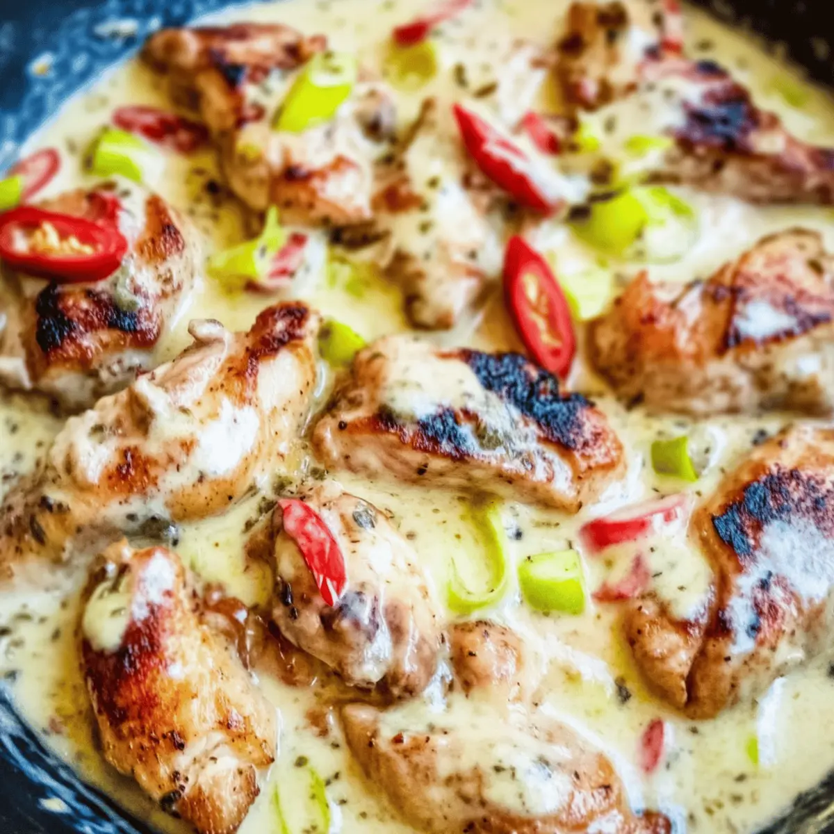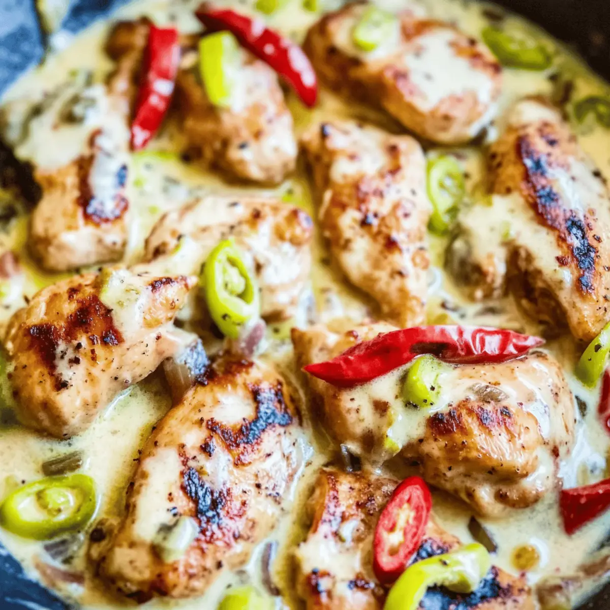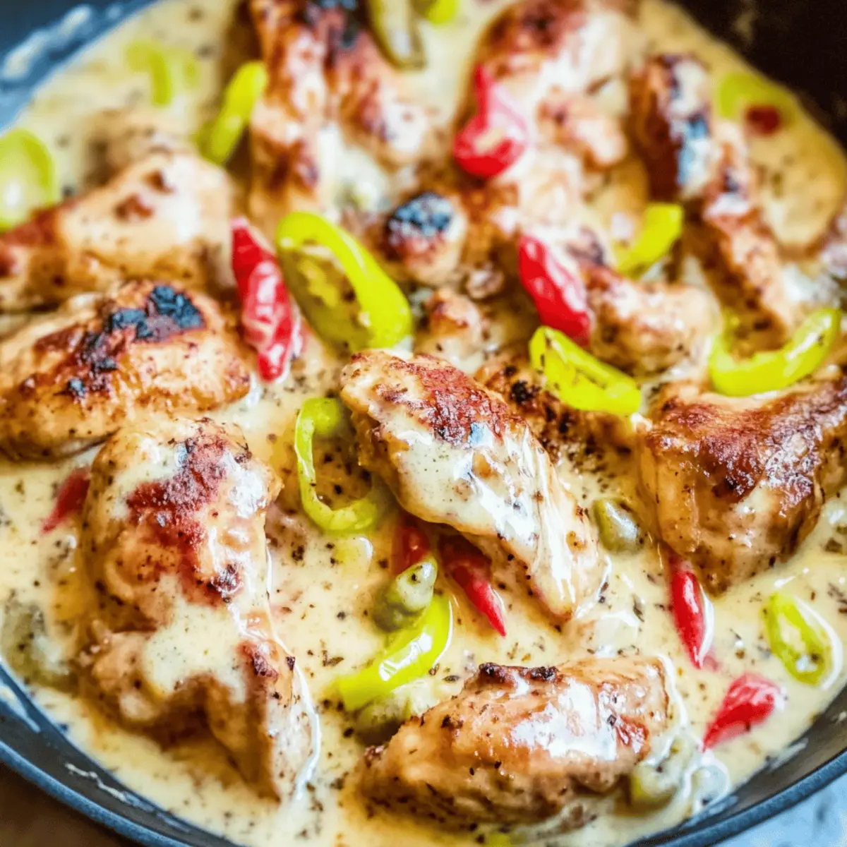 Jump to Recipe Print RecipeAs I stood in my kitchen, the comforting aroma of sautéing garlic danced through the air, instantly transporting me to those bustling weeknight dinners I cherished as a child. That’s when I decided to whip up a Creamy Pepperoncini Chicken Skillet, a dish that seamlessly combines tender chicken with the playful zing of pepperoncini peppers in a luxuriously creamy sauce. This effortless one-pan meal not only saves you time but also delivers an explosion of flavor that even the pickiest eaters will devour. Whether you’re looking to impress, feed a hungry family, or simply indulge in a little culinary adventure, this recipe is bound to become a go-to staple in your kitchen. Are you curious to discover how to create this creamy delight in just a few simple steps? Let’s dive in! Why is Creamy Pepperoncini Chicken Skillet a Must-Try? Simplicity at its finest: With just a few ingredients, this recipe makes cooking a breeze, perfect for those hectic weeknights. Bursting with flavor: The tang of pepperoncini combined with creamy goodness creates a mouthwatering experience that’s simply irresistible. Versatile options: Feel free to substitute chicken for turkey or tofu, and add any veggies like spinach for extra nutrition! Crowd-pleaser: Ideal for families or gatherings, it’s a dish that caters to both kids and adults alike. Quick cooking: In under 30 minutes, you can have a nourishing meal ready without the fuss of multiple pots and pans. Dive into this delightful recipe and pair it with a refreshing Rainbow Chicken Salad for a complete meal! Creamy Pepperoncini Chicken Skillet Ingredients • Get ready to discover the key components of this flavorful dish! For the Chicken Chicken Breasts – Your main protein source; use skinless for a healthier option. For the Sauce Pepperoncini Peppers – Adds a tangy kick; substitute with banana peppers for a similar flavor. Garlic – Fresh garlic enhances the flavor; garlic powder is a decent alternative in a pinch. Onions – Provides sweetness and depth to the sauce; shallots can be used instead. Cream (heavy or sour) – Creates that luscious creamy sauce; opt for half-and-half or coconut cream for a dairy-free option. Chicken Broth – Adds moisture and flavor; go for low-sodium broth for health-conscious cooking. Seasonings (salt, pepper, etc.) – Essential for bringing everything together; adjust according to your taste preferences. Dive into the culinary joy of creating a Creamy Pepperoncini Chicken Skillet that’s rich, comforting, and perfect for weeknight dinners! Step‑by‑Step Instructions for Creamy Pepperoncini Chicken Skillet Step 1: Heat the Oil In a large skillet, heat 2 tablespoons of olive oil over medium heat until shimmering. This should take about 2 minutes. Ensure the skillet is hot enough by tilting it slightly; the oil should easily slide around. This initial step is crucial for achieving a beautifully seared chicken in your Creamy Pepperoncini Chicken Skillet. Step 2: Sauté the Chicken Add 1 pound of diced chicken breasts to the hot skillet, seasoning them with salt and pepper. Sauté the chicken for about 5-7 minutes, stirring occasionally, until it turns golden brown and is cooked through. The chicken should no longer be pink in the center. Once done, transfer the chicken to a plate and set aside to keep it warm. Step 3: Cook the Aromatics In the same skillet, add 1 diced onion and 2 minced garlic cloves. Stir and cook for about 3-4 minutes or until the onion becomes translucent and fragrant. This step enhances the flavor profile of your Creamy Pepperoncini Chicken Skillet, as the aromatic blend fills your kitchen with a warm, inviting scent. Step 4: Incorporate the Peppers Next, add 1 cup of sliced pepperoncini peppers to the skillet with the onions and garlic. Stir to combine and cook for an additional 2 minutes until the peppers become slightly tender. Their tangy flavor will meld beautifully with the aromatics, elevating the overall taste of your dish. Step 5: Create the Sauce Pour in ½ cup of heavy cream and ½ cup of chicken broth into the skillet, stirring continuously to mix all the ingredients well. Bring the mixture to a gentle simmer over medium-low heat. Allow it to bubble gently for about 5 minutes, thickening the sauce slightly while the comforting aroma fills the air. Step 6: Adjust Seasonings and Combine Return the cooked chicken to the skillet, stirring it into the creamy sauce. Allow everything to cook together for another 2-3 minutes. Taste the sauce and adjust the seasoning with additional salt and pepper if needed, ensuring each bite of Creamy Pepperoncini Chicken Skillet is perfectly balanced. Step 7: Serve and Enjoy Once the chicken is heated through and the sauce is creamy, remove the skillet from the heat. Serve the Creamy Pepperoncini Chicken Skillet immediately over steamed rice, mashed potatoes, or your choice of side. This delightful dish is ready to be savored, bringing comfort and joy to your weeknight dining! How to Store and Freeze Creamy Pepperoncini Chicken Skillet Fridge: Store leftovers in an airtight container for up to 3 days. This ensures the flavors remain fresh while keeping your creamy dish safe to enjoy later. Freezer: For longer storage, freeze portions in airtight containers for up to 3 months. When ready to enjoy, thaw overnight in the fridge before reheating. Reheating: Reheat the Creamy Pepperoncini Chicken Skillet gently over medium heat, adding a splash of chicken broth or water to help maintain its creamy texture. Enjoy it again just like the first time! Avoid Overcrowding: When reheating, try to do it in smaller batches for even heating. This will help retain the luscious creaminess you love without turning the dish into a thick paste. Make Ahead Options These Creamy Pepperoncini Chicken Skillets are fantastic for meal prep enthusiasts! You can dice the chicken and slice the pepperoncini, onions, and garlic up to 24 hours in advance; 