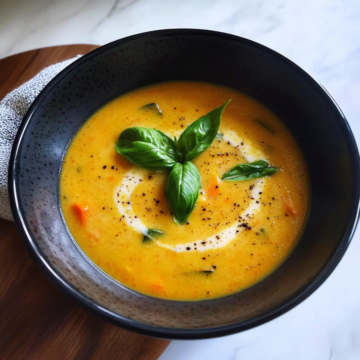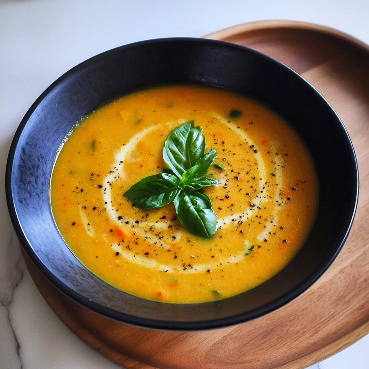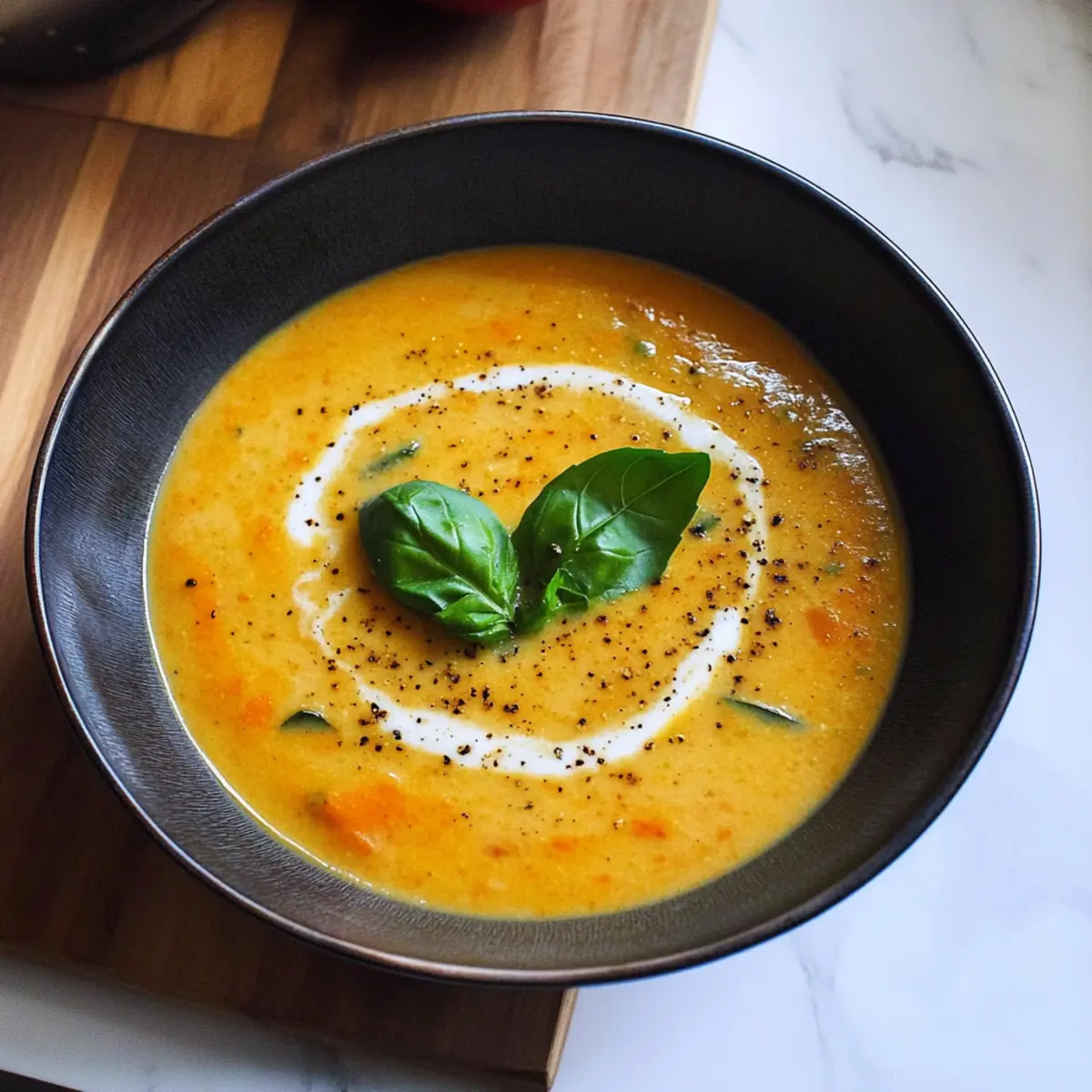 Jump to Recipe Print RecipeThe aroma of roasting vegetables fills my kitchen, instantly transforming a chilly afternoon into a cozy haven. I’m thrilled to share my recipe for Creamy Roasted Veggie Soup with Coconut Milk, a vibrant blend of seasonal produce that warms both the body and soul. This delightfully creamy soup is not only quick to prepare but also vegan and gluten-free, making it a perfect choice for everyone at the dinner table. With each spoonful, you’ll savor the incredible depth of flavor brought out by roasting—ideal for those cold days when comfort food is a must. Wouldn’t you love to cozy up with a warm bowl of this scrumptious soup and perhaps a slice of crusty bread? Let’s dive into the details! Why Love Creamy Roasted Veggie Soup? Comforting warmth: This Creamy Roasted Veggie Soup offers a piquant hug on cold days, bringing together the flavors of cozy autumn and winter with every delightful spoonful. Quick and easy: Even if you have a busy schedule, this soup is a breeze to prepare, making it an ideal weeknight meal for the whole family. Vibrant flavors: The roasting process intensifies the vegetables’ natural sweetness, delivering a rich, savory profile that tantalizes your taste buds. Versatile addition: Pair it with a warm crusty bread or a fresh salad for a well-rounded meal, or enjoy it alongside a refreshing dish like Tomato Pasta for a complete dining experience. Nutritious goodness: Not only is this soup delicious, but it’s also packed with vitamins and fiber, catering to both vegans and those seeking healthier alternatives to fast food. When the chilly weather hits, there’s nothing quite like a bowl of this creamy goodness to cozy up with. Creamy Roasted Veggie Soup Ingredients For the Soup Base Tomatoes (6, plum or roma) – Adds acidity and sweetness; ripe tomatoes enhance the flavor of the soup. Zucchini (2) – Contributes to texture and absorbs flavors; can use yellow squash as a substitute. Carrots (2-3) – Adds sweetness and color; consider parsnips for a different flavor profile. Bell Pepper (1) – Introduces a slight sweetness; can substitute with a poblano for a smokier profile. Onion (1) – Provides aromatic flavor; yellow or white onions work best. Garlic (1 bulb) – Infuses the soup with deep flavor; do not substitute; roast for best results. For Liquid and Creaminess Vegetable Broth (3 cups) – Base liquid for the soup; use homemade or store-bought for a quick option. Coconut Milk (1 can, 13.5 oz) – Adds creaminess and sweetness; can substitute with soy milk, but the texture will differ. For Roasting Olive Oil (drizzle) – For roasting vegetables; can substitute with avocado oil for higher heat tolerance. Enjoy assembling these ingredients for a heartwarming bowl of Creamy Roasted Veggie Soup! Step‑by‑Step Instructions for Creamy Roasted Veggie Soup Step 1: Preheat the Oven Begin by preheating your oven to 425°F (220°C). This high temperature is essential for roasting the vegetables to achieve that beautiful caramelization and deep flavor that will elevate your Creamy Roasted Veggie Soup. Step 2: Prepare the Vegetables While the oven heats up, prepare your vegetables: halve the tomatoes, slice the zucchinis into half-moons, chop the carrots and bell pepper into bite-sized pieces, and roughly chop the onion. Also, slice the top off the garlic bulb to expose the cloves, which will enhance their flavor during roasting. Step 3: Arrange on a Baking Sheet Next, arrange all the prepared veggies on a large baking sheet. Drizzle them generously with olive oil, ensuring every piece is well-coated to promote even roasting. Sprinkle salt and pepper over the vegetables for seasoning, enhancing the overall taste of the Creamy Roasted Veggie Soup. Step 4: Roast the Vegetables Place the baking sheet in your preheated oven and roast the veggies for 35-40 minutes. Keep an eye on them; they should become soft and caramelized, with a lovely golden-brown hue. This deep roasting brings out their natural sweetness and makes the soup irresistibly flavorful. Step 5: Blend the Roasted Veggies Once the vegetables are perfectly roasted, remove them from the oven and let them cool for a few minutes. Transfer all the roasted veggies to a blender or, if you prefer, use an immersion blender directly in a large pot. Add the vegetable broth and blend until the mixture is completely smooth and creamy. Step 6: Simmer the Soup Pour the blended mixture into a large pot and place it over medium heat. Allow the soup to briefly simmer for about 5 minutes. This helps to meld the flavors together and warms the soup through, creating a delicious base for your Creamy Roasted Veggie Soup. Step 7: Add Coconut Milk Remove the pot from heat and gently stir in the coconut milk, mixing until fully combined. The coconut milk adds a luscious creaminess that enhances the soup’s texture and provides a subtle sweetness that complements the roasted vegetables perfectly. Step 8: Serve and Garnish Finally, ladle the hot soup into bowls and garnish with freshly cracked black pepper and some torn basil leaves for a pop of flavor. Serve your Creamy Roasted Veggie Soup with warm crusty bread or alongside a refreshing salad for a cozy and satisfying meal. Storage Tips for Creamy Roasted Veggie Soup Fridge: Store your Creamy Roasted Veggie Soup in an airtight container for up to 4 days. Allow it to cool completely before sealing to maintain freshness. Freezer: For longer storage, freeze the soup in airtight containers for up to 3 months. Divide into single-serving portions for easy thawing and reheating. Reheating: When you’re ready to enjoy, gently reheat on the stove over low to medium heat, stirring occasionally to prevent sticking. Add a splash of vegetable broth or water to adjust the consistency if needed. Defrosting: If frozen, transfer the soup to the fridge overnight to thaw, or use the defrost setting on your microwave, ensuring it heats evenly and maintains its cr
