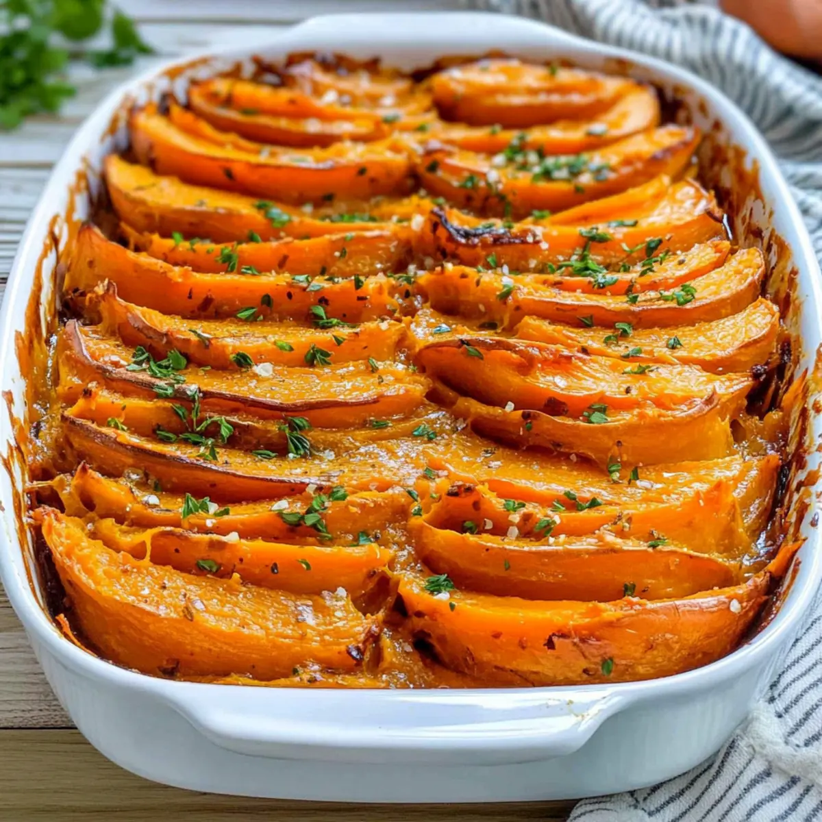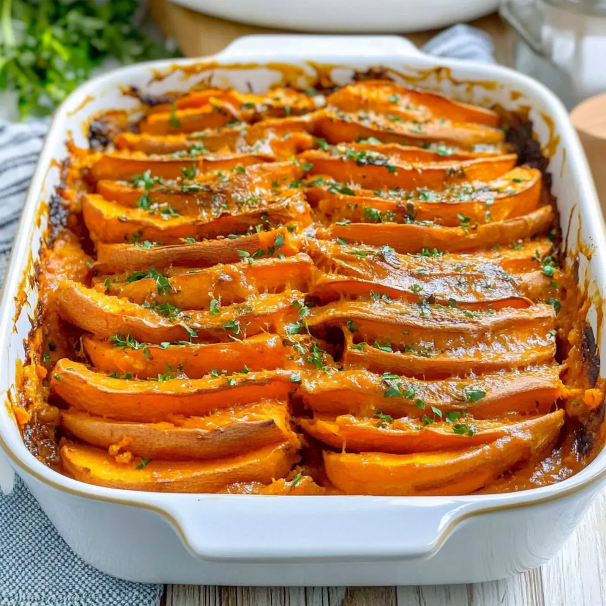 Jump to Recipe Print RecipeThe aroma of sweet potatoes roasting fills the air, wrapping you in a cozy embrace that instantly transports you to holiday gatherings with loved ones. This Dairy-Free Creamy Sweet Potato Bake is my go-to dish when I want to impress without the stress. With its rich coconut milk sauce, this gluten-free delight marries simplicity with indulgence, making it the perfect side dish for any festive occasion. Plus, it’s a breeze to prepare, allowing you to spend more time making memories around the table. Not only does this recipe cater to everyone’s dietary needs, but it also brings a delightful twist to traditional favorites, ensuring your family will request it time and time again. Curious how to create this delightful dish? Let’s dive in! Why is This Sweet Potato Bake a Must-Try? Irresistible comfort: The creamy texture and savory sauce create a warmth that feels like a hug on a plate. Diet-Friendly: This recipe is not only dairy-free and gluten-free, but also perfect for clean eating, allowing everyone to indulge. Easy Preparation: With simple steps, you can whip this up without culinary stress, making it ideal for busy holidays. Versatile Ingredients: Feel free to swap sweet potatoes for butternut squash to change it up, as well as adding greens like kale for an extra nutritional boost. Crowd-Pleasing: This bake is guaranteed to impress family and friends alike at any gathering, becoming a cherished addition to your holiday table. Check out more delicious ideas like our Smashed Potato Salad to complete your meal! Creamy Sweet Potato Bake Ingredients For the Sweet Potatoes • Sweet Potatoes – These provide the main sweetness and texture; feel free to substitute with other root vegetables for a different flavor. For the Sauce • Olive Oil – Adds richness and helps sauté the onions; avocado oil is a great alternative. • Yellow Onion – Brings sweetness and depth to the dish; you can use a shallot for a milder flavor. • Garlic – Enhances the flavor with its savory kick; garlic powder can be a substitute if you’re out of fresh, just reduce the quantity. • Coconut Milk – Gives creaminess without dairy, or swap with cashew cream for another delicious twist. • Smoked Paprika – Adds a smoky depth to the sauce; regular paprika can be used in a pinch, but it lacks that unique flavor. • Gluten-Free Flour – Acts as a thickening agent in the sauce; almond flour or cornstarch can also work, just adjust the amount as needed. For Seasoning and Garnish • Sea Salt and Black Pepper – Season to taste to elevate all the flavors in this creamy sweet potato bake. • Fresh Parsley & Chives – Adds a pop of freshness for garnish; you can substitute with any herbs you prefer. Indulge in this Creamy Sweet Potato Bake at your next gathering and watch it become an instant favorite! Step‑by‑Step Instructions for Creamy Sweet Potato Bake Step 1: Preheat the Oven Begin by preheating your oven to 350°F (175°C). This warm-up ensures the environment inside is perfect for creating that lovely golden top that defines the Creamy Sweet Potato Bake. While the oven heats, prepare your ingredients to save time later on. Step 2: Sauté the Onions In a medium skillet, heat a tablespoon of olive oil over medium-high heat. Once hot, add finely chopped yellow onion and sauté until softened and translucent, about 3 minutes. The aromatic scent will fill your kitchen, signaling that your base for the creamy sauce is well on its way to perfection. Step 3: Add Garlic to the Mix Stir in minced garlic to the skillet with onions, cooking for an additional minute until fragrant and slightly golden. This step enhances the flavor profile, infusing the Creamy Sweet Potato Bake with a savory depth that everyone will love. Step 4: Prepare the Coconut Sauce In a small bowl, whisk together coconut milk, smoked paprika, and gluten-free flour until smooth. This mixture will create the rich, creamy sauce that envelops the sweet potatoes. Ensure there are no lumps for a silky texture that blends perfectly with your sautéed aromatics. Step 5: Combine and Simmer Pour your coconut mixture over the sautéed onions and garlic in the skillet. Stir to combine, then reduce the heat to simmer for about 2-3 minutes until the sauce thickens slightly. It should be velvety and creamy, ready to embrace the sweet potatoes. Step 6: Layer the Sweet Potatoes Take an 8×8 baking dish and pour the coconut sauce evenly across the bottom. Arrange thinly sliced sweet potatoes in an overlapping pattern on top, creating a beautiful layered look. Each piece should be coated with sauce, maximizing flavor throughout the bake. Step 7: Bake the Dish Cover the baking dish with foil and place it in the preheated oven. Bake for 60 minutes, allowing the sweet potatoes to soften beautifully. After this time, remove the foil to allow the top to become golden and crispy, baking for an additional 12-15 minutes. Step 8: Garnish and Serve Once cooked, remove your creamy sweet potato bake from the oven and let it cool for a few minutes. Before serving, sprinkle fresh parsley and chives on top for a pop of color and freshness. Your Creamy Sweet Potato Bake is now ready to be the star of your holiday table! How to Store and Freeze Creamy Sweet Potato Bake Fridge: Store your creamy sweet potato bake in an airtight container for up to 4 days. Allow it to cool completely before sealing to maintain freshness and texture. Freezer: For longer storage, freeze the baked dish in a freezer-safe container for up to 3 months. Make sure to wrap it tightly in plastic wrap and aluminum foil to prevent freezer burn. Reheating: When ready to enjoy, thaw overnight in the fridge, then reheat in the oven at 350°F (175°C) for about 20-25 minutes, covered with foil to keep it moist. Quality Check: Before serving, ensure the creamy sweet potato bake is heated through and bubbly. This creamy treat will taste just as delightful as when it was fre