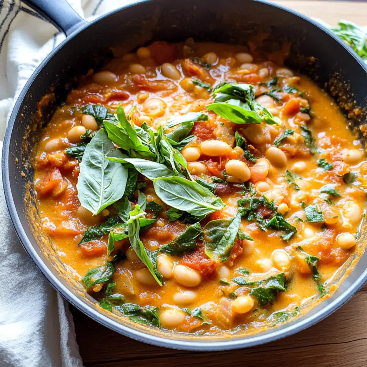 Jump to Recipe Print RecipeAs I stirred the pot of this Creamy Vegan Tomato White Bean Stew, the aroma immediately transported me to sun-kissed Mediterranean gardens bursting with ripe tomatoes. This delightful one-pan dish not only offers a quick 25-minute prep but is also a nourishing connection to nature, filled with wholesome ingredients. Each spoonful delivers a velvety texture and a vibrant blend of flavors that will warm your heart and satisfy your palate. Perfect for those busy weeknights, this plant-based meal is not only gluten-free but also incredibly adaptable—swap in your favorite greens or beans to suit your cravings! Ready to dive into a comforting bowl of goodness? Let’s bring this hearty stew to life together. Why is this stew a must-try? Comforting and Quick: In just 25 minutes, you can create a delicious, hearty dish that will become a weeknight staple. Nutrient-Packed Flavor: With creamy white beans and vibrant tomatoes, each bite offers a satisfying taste of wholesome goodness. One-Pan Wonder: Simplify your clean-up with this easy, one-pan recipe that minimizes hassle and maximizes flavor. Versatile Ingredients: Feel free to get creative—substituting with your preferred greens or beans transforms this stew to fit your cravings or dietary needs. Perfect Pairing: Serve this stew alongside crusty bread or fluffy quinoa for a complete meal, like the ones you’ll love from my Tomato Pasta One or Cauliflower Black Bean recipes! This dish is sure to please everyone at your table! Creamy Tomato White Bean Stew Ingredients For the Stew Small Yellow Onion – Adds aromatic sweetness; substitute with shallots for a milder flavor. Cherry Tomatoes – Provides freshness and vibrant color; canned diced tomatoes are a good alternative if fresh are out of season. Garlic Cloves – Essential for depth of flavor; opt for garlic powder in a pinch (1/4 teaspoon per clove). Sun-Dried Tomatoes – Intensifies the flavor and adds a chewy texture; extra fresh tomatoes can be used in a pinch. Tomato Paste – Contributes to a concentrated tomato flavor; omit only if absolutely unavailable. Cannellini Beans – Acts as the protein source; any white bean can be swapped, with chickpeas offering a different texture. Vegetable Broth – Provides moisture and flavor; choose homemade or low-sodium broth for healthier options. Arrowroot Starch – Thickens the stew; tapioca starch or cornstarch can be used, adjusting quantities as needed. For Finishing Touches Baby Greens (arugula or spinach) – Adds nutrition and color; feel free to use kale or Swiss chard for a flavor twist. Vegan Cream Cheese – Creates the stew’s creamy consistency; coconut cream or cashew cream makes a great dairy-free alternative. Salt and Pepper – Essential for seasoning; adjust to your taste preference. Lemon (juiced) – Brightens the flavors; lime juice can serve as an effective substitute. Fresh Basil (sliced) – Offers a delightful garnish and extra flavor; parsley or cilantro can also be great alternatives. This Creamy Tomato White Bean Stew promises to deliver a warm, satisfying experience for all dinner lovers! Step‑by‑Step Instructions for Creamy Tomato White Bean Stew Step 1: Heat the Oil Start by heating 1 tablespoon of olive oil in a medium saucepan over medium heat. Allow the oil to shimmer gently, signaling it’s ready for the next ingredients. This step sets the base for a flavorful Creamy Tomato White Bean Stew. Step 2: Sauté the Onion Add the sliced small yellow onion to the pan, sautéing for about 3 minutes until it softens and becomes translucent. As the onions cook, their aroma will fill your kitchen, creating a comforting atmosphere that foreshadows the deliciousness to come. Step 3: Add the Cherry Tomatoes Next, incorporate the halved cherry tomatoes into the mix. Stir and let them cook for an additional 5 minutes, allowing them to soften and release their juices. Keep stirring frequently, so they don’t stick to the bottom of the pan, enhancing the stew’s vibrant flavor. Step 4: Introduce Garlic and Sun-Dried Tomatoes Stir in the minced garlic, chopped sun-dried tomatoes, and tomato paste. Cook this mixture for about 1 minute until the garlic is fragrant. This pivotal step deepens the flavor profile of your Creamy Tomato White Bean Stew, ensuring each bite bursts with deliciousness. Step 5: Whisk in the Thickener In a small bowl, whisk arrowroot starch with a splash of vegetable broth until smooth. Pour this mixture into the pan along with the remaining vegetable broth. Stir well to combine; this will help thicken your stew beautifully, making it rich and creamy. Step 6: Add the Beans and Simmer Now, add the rinsed cannellini beans to the pan and let the stew simmer for 5 minutes. Keep an eye on it as it cooks, watching for it to thicken up slightly and heat through. The beans will absorb the wonderful aromatic flavors of the stew during this time. Step 7: Stir in the Cream and Greens Once simmered, stir in the vegan cream cheese and baby greens. Cook for about 1 minute, just until the greens wilt. This step adds a delightful creaminess to your Creamy Tomato White Bean Stew, integrating fresh nutrients and color. Step 8: Season and Finish with Lemon Mix in the freshly squeezed lemon juice and season with salt and pepper to taste. Balance the flavors until they sing; the acidity of the lemon brightens the entire dish, making your stew irresistibly vibrant. Step 9: Garnish and Serve To finish, garnish your Creamy Tomato White Bean Stew with freshly sliced basil just before serving. The fragrant basil not only enhances the visual appeal but also adds a fresh flavor that rounds out the dish perfectly, ready to be enjoyed! Make Ahead Options This Creamy Vegan Tomato White Bean Stew is a fantastic option for busy home cooks who appreciate meal prep! You can chop the onions, garlic, and sun-dried tomatoes—what I like to call your “flavor base”—up to 24 hours in advance and store