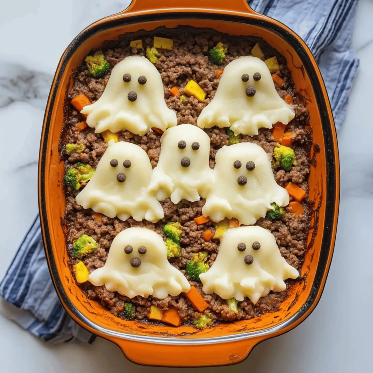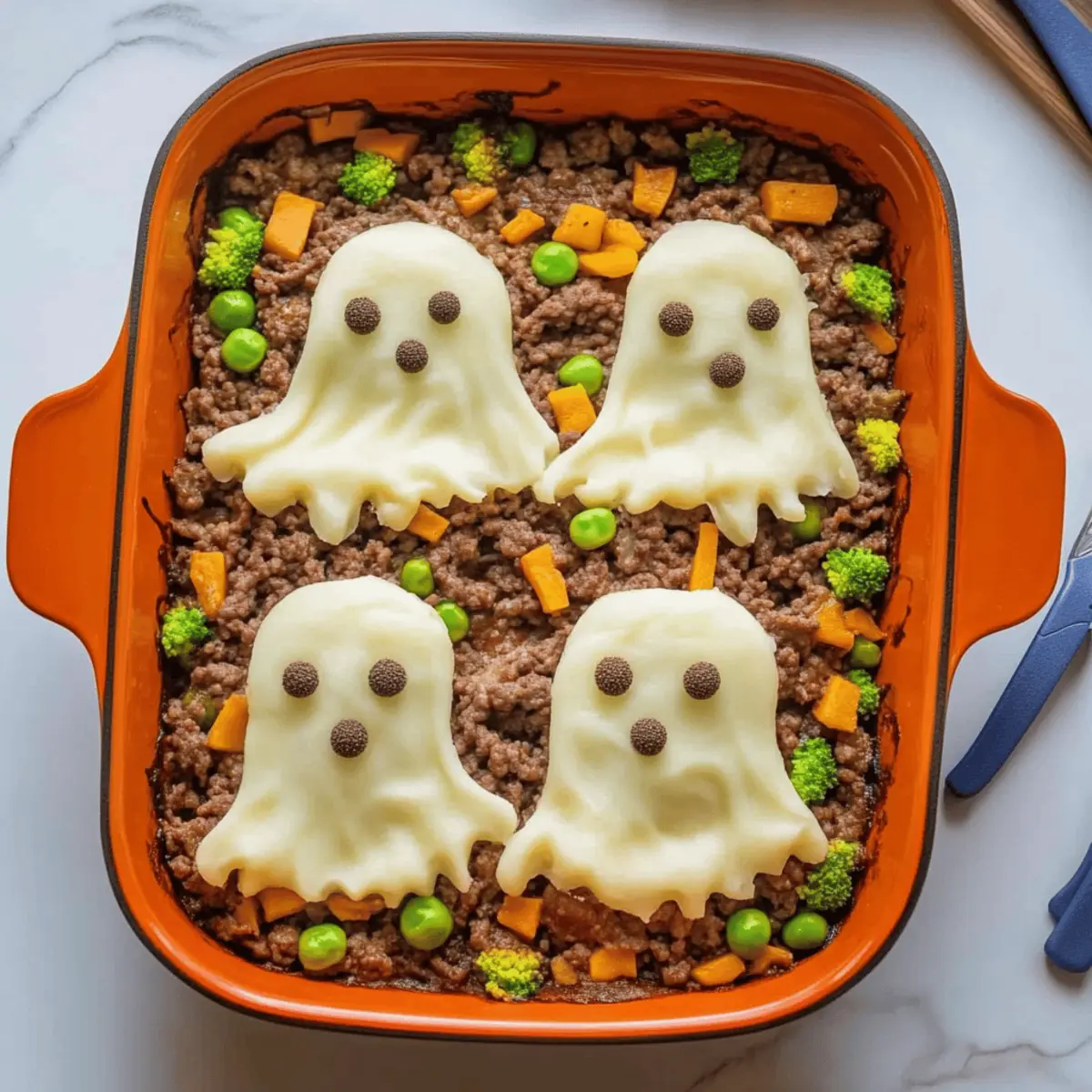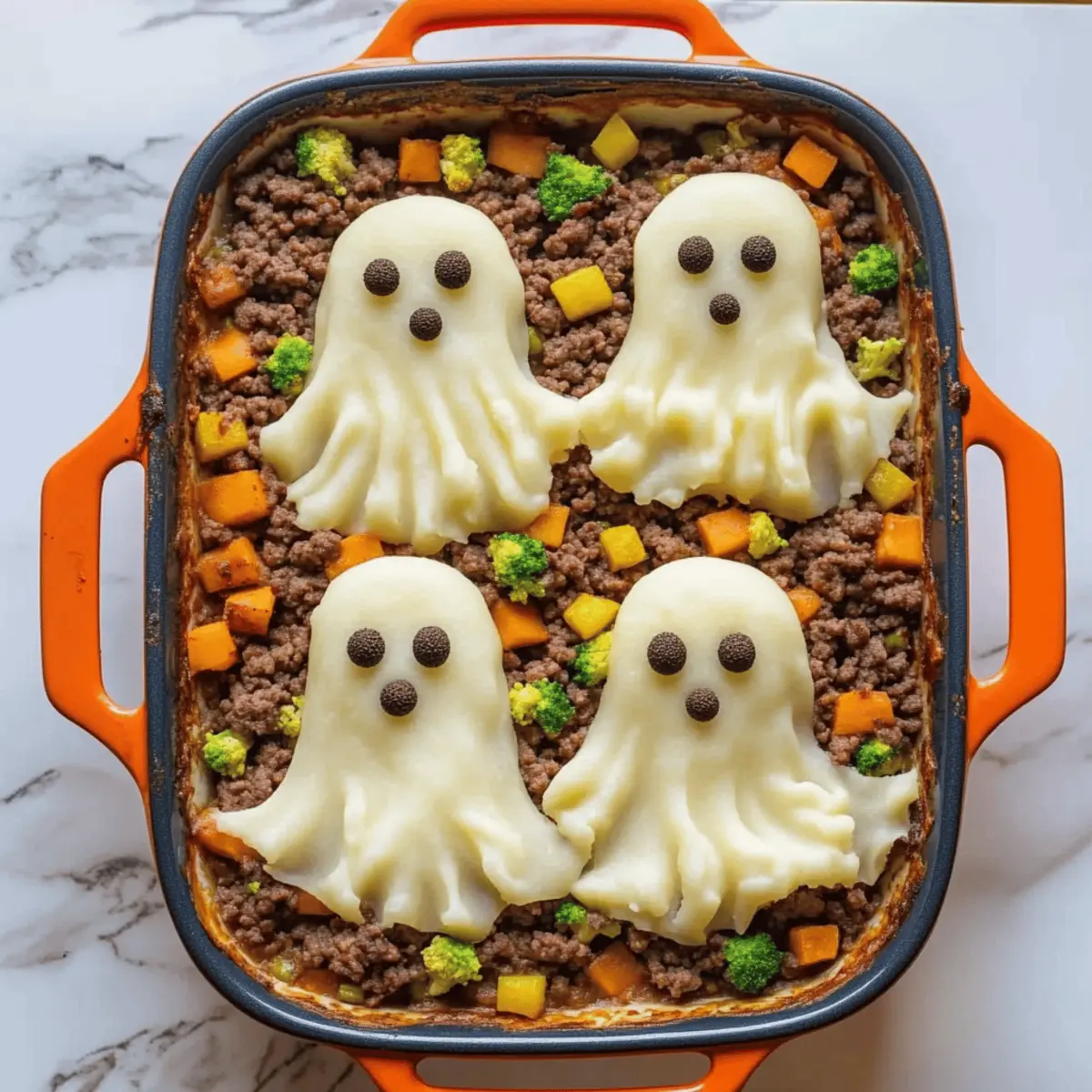 Jump to Recipe Print RecipeAs I prepared the kitchen for our annual Halloween feast, a wave of nostalgia swept over me. Nothing screams comfort quite like a classic shepherd’s pie, but this year, I wanted to add a twist to the traditional recipe. Enter my Creepy Shepherd’s Pie with Ghost Potatoes—a playful, spooky take that will enchant guests of all ages. Featuring fluffy, whipped potato “ghosts” perched atop a rich, savory beef filling, this dish is not just a feast for the eyes but also a hearty comfort food that warms the soul. With its quick prep time and whimsical presentation, it’s perfect for those chilly nights when you crave something indulgent yet fun. Ready to give your Halloween a deliciously spooky flair? Let’s dive into this delightful recipe! What Makes Creepy Shepherd’s Pie Special? Comforting and fun, this dish combines rich flavors with a playful presentation that’s sure to impress! Quick prep time means more moments with family and friends. Versatile and adaptable, it can easily cater to various dietary preferences, whether you’re using ground turkey or plant-based protein. Thinking of other exciting combinations? Check out my Zucchini Onion Pie for more flavor inspirations! With each serving, you’ll not only satisfy your appetite but also bring a dose of spooky charm to your table. Get ready to enjoy a warm, heavenly aroma wafting through your kitchen! Creepy Shepherd’s Pie Ingredients • Perfectly curated for a spooky dish! For the Ghost Potatoes Chopped potatoes – Use russet or Yukon gold potatoes for a creamy texture. Butter – Adds a rich flavor; olive oil can be used for a dairy-free version. Milk – Incorporates creaminess; substitute with plant-based milk for a vegan option. Garlic powder – Enhances flavor; fresh minced garlic can provide a stronger taste. Salt and pepper – Essential for seasoning; adjust according to your preferences. For the Beef Filling Olive oil – Ideal for sautéing; vegetable oil can be a good substitute. Diced onion – Adds sweetness to the filling; shallots can provide a milder taste. Garlic – Freshly minced enhances the beef flavor; garlic powder can be used in a pinch. Ground beef – The main protein source; consider ground turkey or lentils for variations. Tomato paste – Offers depth and richness; tomato sauce can be an alternative but may need seasoning adjustments. Worcestershire sauce – Provides umami flavor; soy sauce is a great substitute. Mixed vegetables (carrots, peas) – Adds nutrition and color; frozen veggies save prep time. Broth (beef or vegetable) – Moistens and flavors the filling; stock offers a richer taste. For Decoration Peppercorns – Great for creating “eyes” on the ghosts; black olives or sesame seeds can achieve a similar spooky effect. Now that you have all the ingredients lined up for your Creepy Shepherd’s Pie, let the fun of cooking begin! Step‑by‑Step Instructions for Creepy Shepherd’s Pie Step 1: Prepare Potatoes Begin by chopping your potatoes into even chunks and placing them in a large pot. Fill the pot with cold, salted water and bring it to a boil over medium-high heat. Cook for about 15 minutes, or until the potatoes are fork-tender. Drain the water and mash the potatoes in the same pot with butter, milk, garlic powder, salt, and pepper until creamy. Allow the mashed potatoes to cool slightly before moving on. Step 2: Cook Filling In a large skillet, heat olive oil over medium heat. Add the diced onion and minced garlic, sautéing for 2-3 minutes until the onion becomes translucent and fragrant. Next, increase the heat slightly and add the ground beef, cooking until browned and fully cooked through. Stir in the tomato paste, Worcestershire sauce, mixed vegetables, and broth, seasoning everything with salt and pepper. Let the mixture simmer for 5-7 minutes, or until it thickens. Step 3: Assemble Dish Preheat your oven to 375°F (190°C). Carefully spoon the rich filling into a baking dish, spreading it evenly to create a solid base. Using a piping bag or a spoon, pipe or spread the fluffy mashed potatoes over the filling, creating playful swirls that resemble ghosts. To make the dish even spookier, place peppercorns as “eyes” on the potato ghosts for a ghoulish touch. Step 4: Bake Place the assembled Creepy Shepherd’s Pie in the preheated oven and bake for 20-25 minutes. Watch closely for the topping to become golden brown and for bubbling filling around the edges. This will ensure that your pie is cooked perfectly and will give it an inviting appearance for your Halloween table. Step 5: Cool and Serve Once baked, take the Creepy Shepherd’s Pie out of the oven and allow it to cool for about 10 minutes. This resting period allows the filling to set a bit, making it easier to slice when serving. Enjoy the delightful playfulness and comfort of this spooky dish with family and friends! What to Serve with Creepy Shepherd’s Pie Add a touch of warmth and delight to your table with these perfect pairings! Crisp Green Salad: A fresh salad with mixed greens and a tangy vinaigrette offers a refreshing contrast to the creamy pie. Garlic Breadsticks: These buttery, garlicky delights bring a satisfying crunch that complements every bite of hearty shepherd’s pie. Roasted Vegetables: Colorful, caramelized veggies like carrots and Brussels sprouts enhance the meal with their sweet, rich flavors. They add nutrition and a pop of color! Colcannon: This traditional Irish dish of mashed potatoes mixed with cabbage is a comforting companion that ties wonderfully with the shepherd’s pie theme. Pumpkin Soup: Smooth, velvety pumpkin soup adds a seasonal twist to your meal, evoking the spirit of fall and Halloween. Chocolate Chip Cookies: End your meal on a sweet note with warm, gooey cookies—everybody loves a treat, especially around Halloween! Mulled Wine: A warm glass of spiced mulled wine brings festive flavors, making it an ideal drink to elevate 
