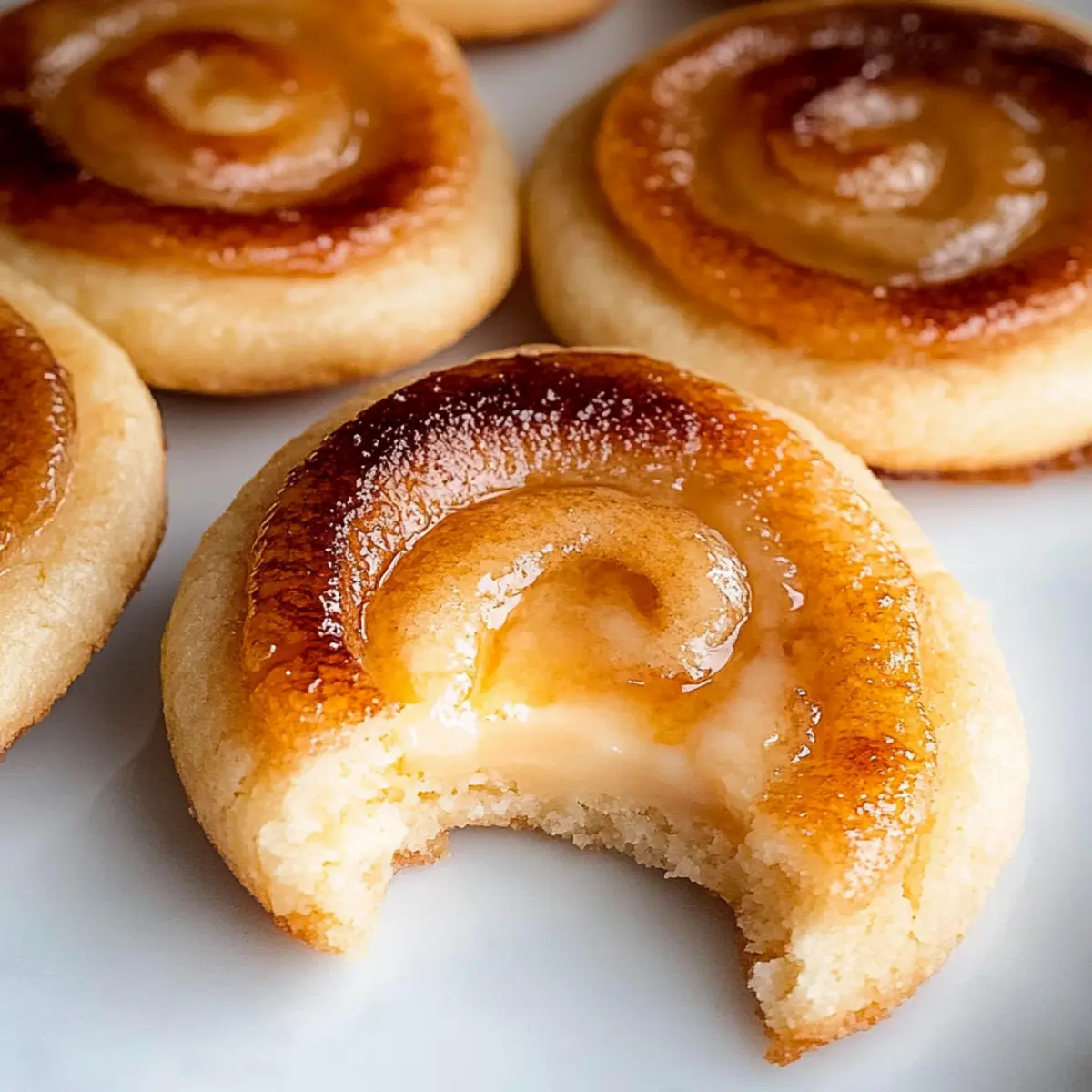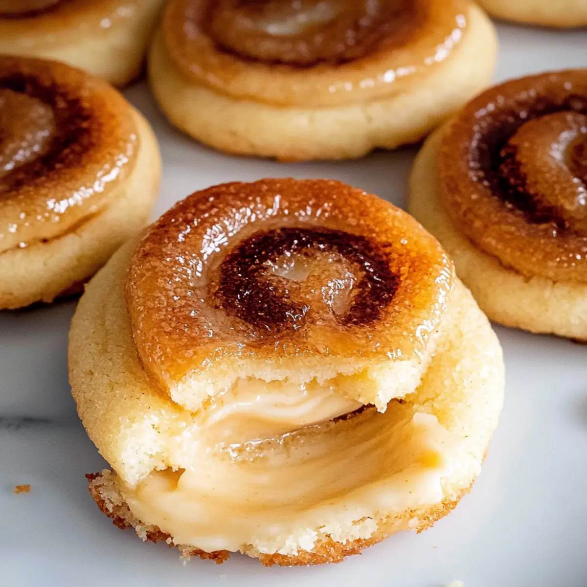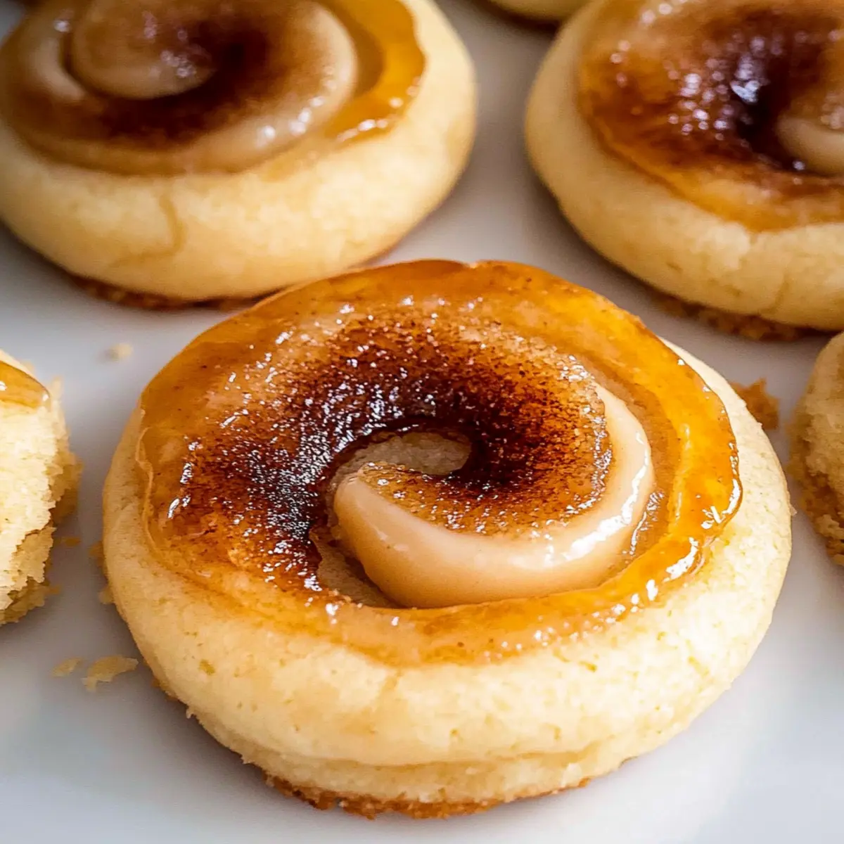 Jump to Recipe Print RecipeThe enticing aroma of freshly baked cookies wafted through my kitchen as I remembered my first encounter with crème brûlée. Until that moment, my sweet tooth had been satisfied only by the simplest treats, but I was never quite prepared for the transformation: smooth, creamy custard crowned with a perfectly caramelized sugar shell. Inspired by that classic dessert, I just had to recreate that magic in cookie form with these Chewy Crème Brûlée Cookies. With a rich pastry cream hiding within a chewy cookie exterior, these delightful treats strike the perfect balance between comfort and gourmet indulgence. Quick to whip up, they’re perfect for impressing guests or savoring on a cozy evening in. Are you ready to elevate your dessert game? Let’s dive into this scrumptious recipe together! Why are these Crème Brûlée Cookies special? Indulgent, these chewy crème brûlée cookies bring a gourmet twist to a classic favorite, offering an unforgettable dessert experience. Rich pastry cream enveloped within soft cookie goodness creates a heavenly contrast of textures. Easily made at home, they require no extensive baking skills. Perfect for special occasions, or just because! After trying these, you may also enjoy our delightful Lemon Raspberry Cookies or the classic Chocolate Chip Cookies for a tasty variety. Creme Brûlée Cookies Ingredients For the Pastry Cream Whole Milk (2 1/4 cups / 540 ml) – Provides the creamy base for the pastry cream; heat until steaming but not boiling. Egg Yolks (6) – Adds richness and acts as a thickener for the pastry cream; no substitutes are recommended for this role. Granulated Sugar (1 cup + 2 tbsp / 225 g) – Sweetens and balances the flavors; ensure it’s fine to caramelize for the brûlée topping. Salt (1/8 tsp) – Enhances overall flavor; use kosher salt as a substitute if needed. Vanilla Bean Paste (1 1/2 tbsp) – Provides intense vanilla flavor; can substitute with pure vanilla extract at half the amount. Cornstarch (3 1/2 tbsp / 28 g) – Thickens the pastry cream; no substitutes necessary. Unsalted Butter (3 tbsp / 42 g) – Adds richness; for a dairy-free version, you can use margarine. For the Cookie Dough Granulated Sugar (1 1/4 cups / 250 g) – Sweetens the cookie dough for a delightful taste. All-Purpose Flour (2 1/2 cups / 313 g) – Provides structure to the cookies; for gluten-free, opt for a 1:1 gluten-free flour blend. Baking Powder (1/2 tsp) – Helps cookies rise, contributing to their chewy texture; ensure it’s fresh for best results. Salt (1/2 tsp) – Balances the sweetness and enhances flavor; adjust as needed. Unsalted Butter (1 cup / 224 g) – Adds richness and moisture to the cookie dough. Granulated Sugar for rolling (1/2 cup / 100 g) – Envelops cookie dough for a sweet crust. These creme brûlée cookies combine indulgent flavors and textures, making them an unforgettable dessert experience! Step‑by‑Step Instructions for Creme Brûlée Cookies Step 1: Prepare Pastry Cream Begin by heating 2 1/4 cups of whole milk in a saucepan over medium heat until steaming, but do not let it boil. In a separate bowl, whisk together 6 egg yolks, 1 cup plus 2 tablespoons of granulated sugar, 1/8 teaspoon of salt, 1 1/2 tablespoons of vanilla bean paste, and 3 1/2 tablespoons of cornstarch until the mixture turns pale. Gradually pour the hot milk into the egg mixture while whisking constantly, then return it to the heat. Cook while whisking continuously for 8-12 minutes until thickened. Step 2: Finish Pastry Cream Once thickened, remove the saucepan from the heat and mix in 3 tablespoons of unsalted butter until melted and creamy. Allow the pastry cream to cool for about 10 minutes at room temperature. Then, transfer it to a bowl, cover it with plastic wrap (pressing it against the surface to avoid a skin), and refrigerate for at least 2 hours until fully chilled and set. Step 3: Make Cookie Dough Preheat your oven to 350°F (175°C). In a separate bowl, whisk together 2 1/2 cups of all-purpose flour, 1/2 teaspoon of baking powder, and 1/2 teaspoon of salt. In a large mixing bowl, cream together 1 cup of unsalted butter and 1 1/4 cups of granulated sugar using an electric mixer until light and fluffy, about 3-5 minutes. Add in 1 egg and 1 tablespoon of vanilla bean paste, mixing until well combined. Step 4: Combine Dry and Wet Ingredients With the mixer on low speed, gradually add the flour mixture to the creamed butter until just combined, being careful not to overmix. Once a dough forms, use your hands to scoop and roll the dough into 1-inch balls. Roll each ball in 1/2 cup of granulated sugar to coat evenly, creating a sweet crust for your creme brûlée cookies. Step 5: Bake Cookies Line a baking sheet with parchment paper and place the coated cookie dough balls on the sheet, spacing them at least 2 inches apart. Gently flatten each ball with the palm of your hand. Bake the cookies in your preheated oven for 9-10 minutes, watching for a golden edge while the centers remain soft. Let them cool on the baking sheet for 5 minutes before transferring to a wire rack to cool completely. Step 6: Assemble Cookies Once the cookies are fully cooled, take the chilled pastry cream from the refrigerator and pipe or spoon a generous dollop onto the center of each cookie. Sprinkle a thin layer of granulated sugar over the pastry cream. Using a kitchen torch, carefully caramelize the sugar on top until it’s golden brown and bubbly, akin to the top of traditional crème brûlée. Step 7: Serve and Delight Serve the assembled creme brûlée cookies immediately for the best experience, ensuring that each bite has that delightful contrast of chewy cookie, rich cream, and a satisfying crack of burnt sugar. Consider enjoying them with fresh berries or a dollop of whipped cream for an extra special touch! Creme Brûlée Cookies Variations Get ready to customize your crème brûlée cookies for a dessert experien