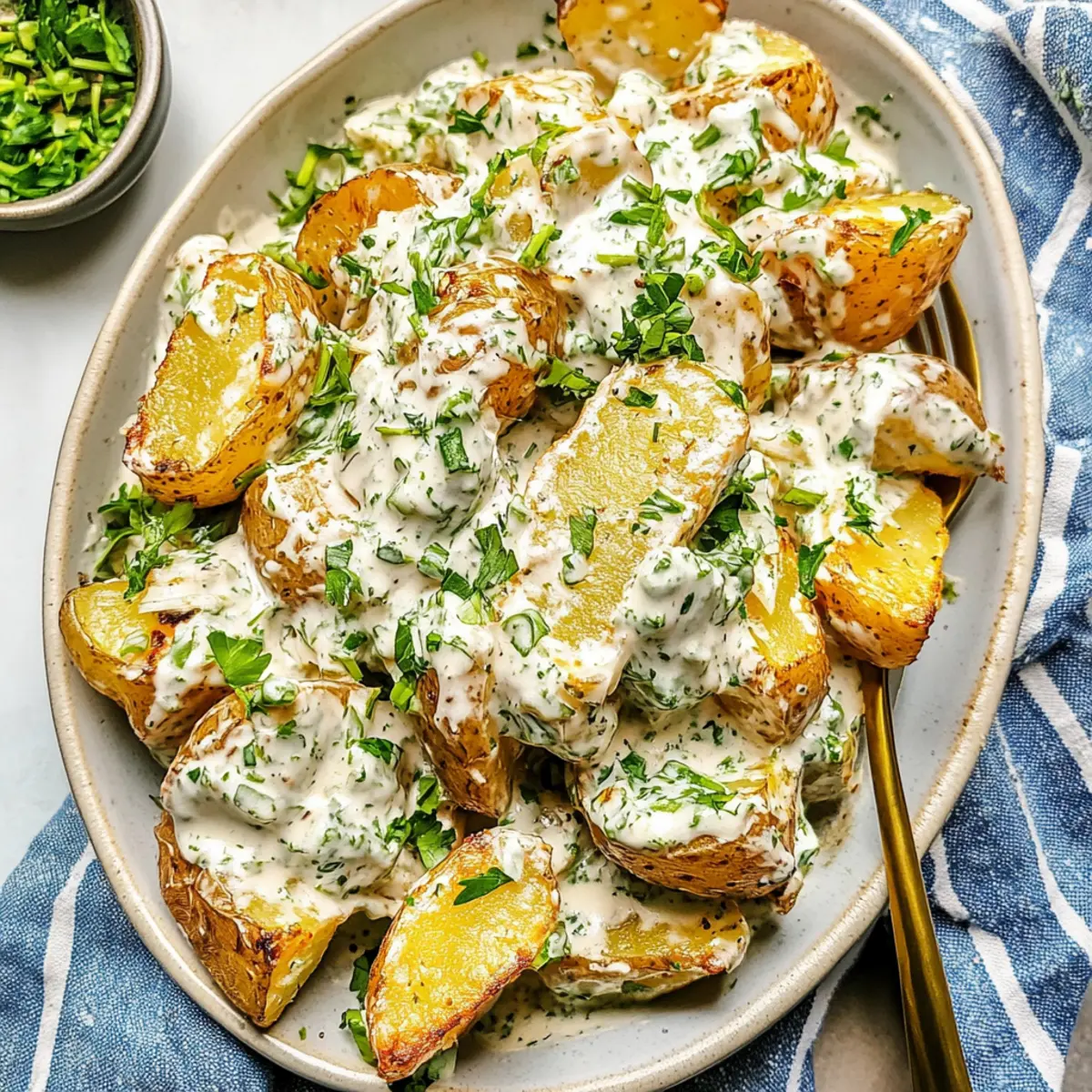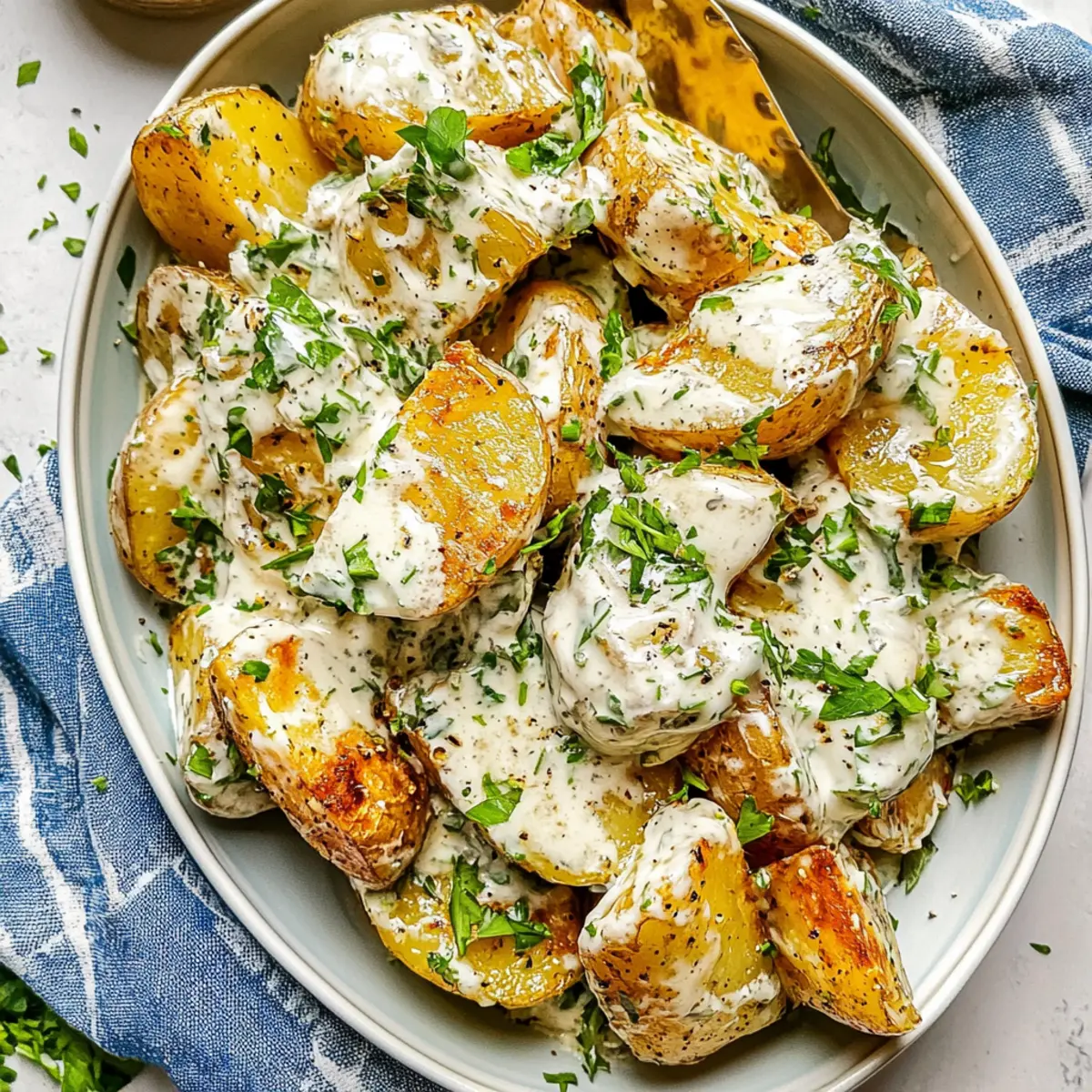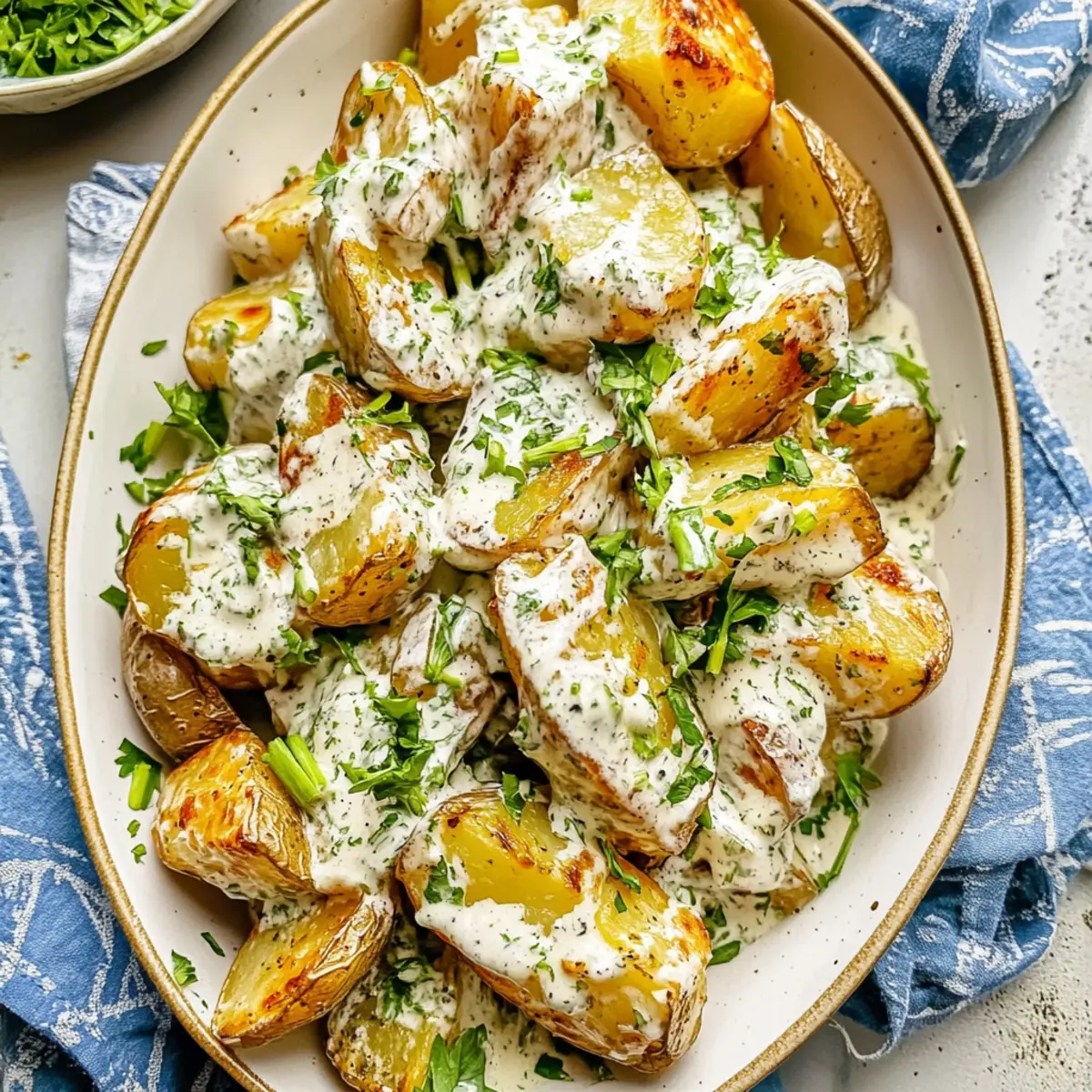 Jump to Recipe Print RecipeAs I strolled through the vibrant farmer’s market last weekend, the sun-kissed aroma of roasted potatoes danced in the air, instantly inspiring me to whip up a dish that marries both comfort and crunch. Enter my Crispy Potato Salad, where Yukon Gold potatoes meet a creamy dressing that brings out their rich, buttery essence. This delicious side dish is not only a hit at potlucks but also a breezy addition to summer barbecues or cozy weeknight dinners. With a quick prep time and a delightful twist on the classic, you’ll find yourself craving seconds (and maybe even thirds!). Ready to dive into this crispy, flavorful delight that’s bound to become a staple on your table? Let’s get cooking! Why Is This Potato Salad So Special? Uniquely Crunchy: This Crispy Potato Salad transforms the classic dish by adding a golden, crunchy bite that your taste buds will love. Creamy Goodness: Infused with a velvety dressing of sour cream and mayonnaise, every scoop is bursting with rich flavor that rivals even the fanciest of sides. Easy Preparation: With just a few simple steps, you’ll have a stunning dish that’s perfect for weekday meals or gatherings—no culinary skills required! Crowd-Pleaser: Ideal for potlucks and barbecues, this recipe is bound to impress friends and family alike with its delightful combination of textures. Versatile Options: Feel free to customize with your favorite add-ins—try roasted vegetables or swap for red potatoes for a fun twist! This is as easy as whipping up a side of Smashed Potato Salad or Egg Pasta Salad if you’re in the mood for something different. Keep Fresh: This salad tastes best when served immediately, making it a quick preparation before your next meal or gathering. Crispy Potato Salad Ingredients Get ready to create the perfect blend of crunch and creaminess! For the Potatoes Yukon Gold Potatoes – This tender variety offers the ideal buttery flavor and texture; feel free to use any waxy potato as a substitute. Olive Oil – Provides richness and crispiness during roasting; canola or avocado oil works well too. For the Dressing Sour Cream – Adds creaminess and a touch of tang; Greek yogurt is a healthier substitute. Mayonnaise – Contributes a smooth texture to the dressing; use vegan mayo for a plant-based version. Dijon Mustard – Infuses tang and depth into the dressing; instead, any grainy mustard can also work. Lemon Juice – Balances the flavors with its acidity; white vinegar makes a great alternative. For Flavor Enhancements Garlic Powder – Elevates overall flavor; fresh minced garlic can intensify the taste. Scallions – Offers a mild onion flavor; red onions can be used for a sharper bite. Dill and Parsley – Brightens the dish with fresh herb goodness; dried herbs can substitute if fresh aren’t available, but use less. Kosher Salt and Black Pepper – Essential for seasoning; season to taste for the best flavor profile. Get ready for a deliciously crunchy Crispy Potato Salad that will elevate your next meal! Step‑by‑Step Instructions for Crispy Potato Salad Step 1: Boil the Potatoes Start by cubing your Yukon Gold potatoes into even pieces, then place them in a large pot and cover with cold water. Add a generous pinch of kosher salt for flavor, and bring it to a boil. Reduce the heat and simmer for about 12-16 minutes, until they are fork-tender but not mushy. Drain the potatoes and set them aside to cool slightly. Step 2: Preheat the Oven While the potatoes rest, preheat your oven to 400°F (200°C). Line a baking sheet with aluminum foil for easy cleanup. This temperature is perfect for achieving the crispy exterior you desire in your Crispy Potato Salad. Make sure everything is ready as you prepare to roast those potatoes to golden perfection. Step 3: Season the Potatoes In a large mixing bowl, combine the drained potatoes with olive oil, garlic powder, salt, and black pepper. Gently toss the potatoes until they are well-coated with the seasoning, ensuring every piece gets that rich flavor. The layers of seasoning will enhance the overall taste of your crispy potato salad. Step 4: Roast the Potatoes Spread the seasoned potato mixture evenly onto the prepared baking sheet, ensuring the pieces are not overcrowded. Roast in your preheated oven for about 30 minutes, checking halfway through to give them a stir. You want the potatoes to turn a lovely golden brown and achieve a crunchy texture, which will make your Crispy Potato Salad truly delightful. Step 5: Prepare the Dressing While the potatoes are roasting, it’s time to make the creamy dressing. In a separate bowl, mix together the sour cream, mayonnaise, chopped scallions, dill, parsley, Dijon mustard, and lemon juice. Season with salt and pepper to taste. This dressing should be rich and tangy, complementing the crispy potatoes perfectly when combined. Step 6: Combine and Serve Once the potatoes are roasted and crispy, remove them from the oven and let them cool slightly for easy handling. In a large serving bowl, toss the warm potatoes with the prepared dressing just before serving. This ensures the flavors meld together beautifully while maintaining that crispy texture. Garnish with reserved herbs for an extra pop of freshness. Step 7: Presentation Time Transfer your delicious Crispy Potato Salad to a pretty serving dish, and don’t forget to sprinkle some extra fresh herbs on top for a vibrant finish. This salad is best served warm or at room temperature, making it an inviting side for any occasion—from potlucks to family dinners. Enjoy the celebration of flavor and texture! Expert Tips for Crispy Potato Salad Perfect Potato Prep: Cut the Yukon Gold potatoes into uniform cubes to ensure even cooking. This prevents some pieces from being undercooked while others become mushy. Don’t Skip the Salt: Always season your boiling water with kosher salt. It helps infuse flavor into the potatoes, enhancing the overall taste of your cri
