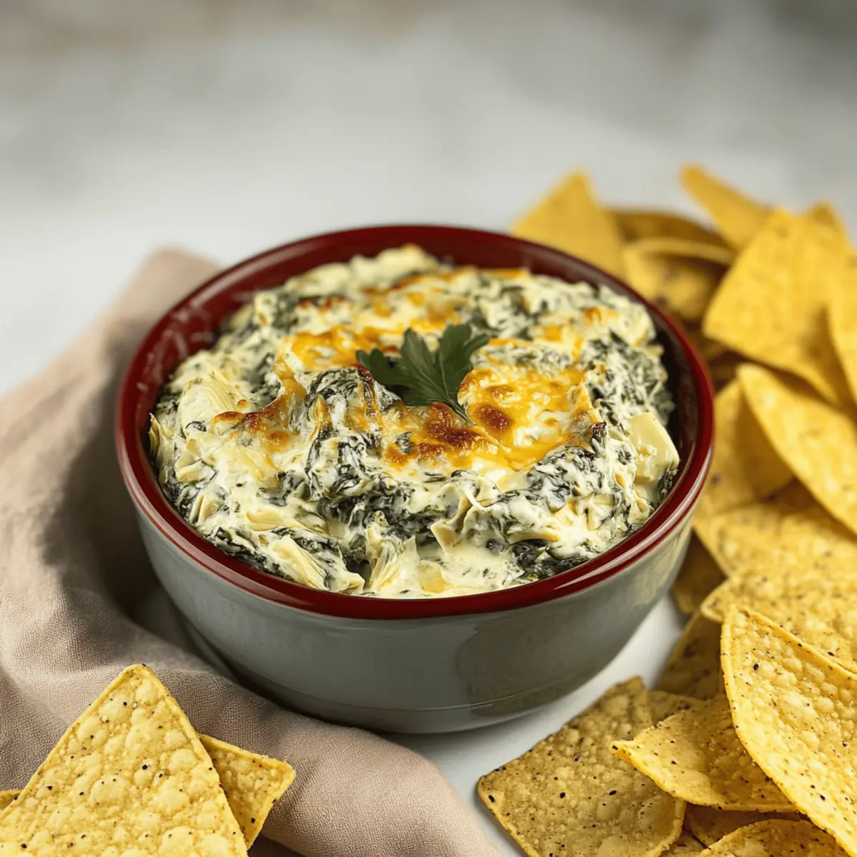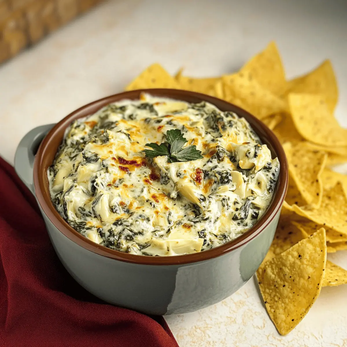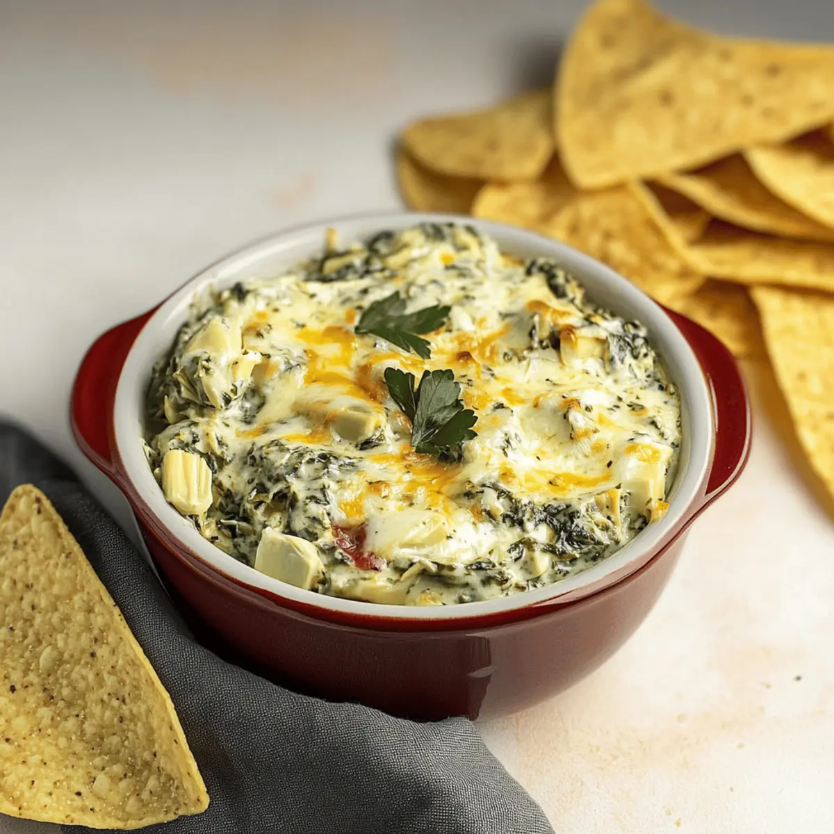 Jump to Recipe Print RecipeAs I walked through the bustling kitchen, I couldn’t help but notice the comforting aroma of garlic and cheese dancing through the air. That’s when it hit me—nothing brings people together quite like a creamy, dreamy Crockpot Spinach Artichoke Dip with Frozen Spinach. This dish is not only effortless to whip up but also a guaranteed crowd-pleaser for any gathering. Perfect for those of us who want to enjoy homemade snacks without spending hours in the kitchen, this slow-cooked delight offers a rich and flavorful experience. Plus, with a simple tweak, you can create a vegan version that everyone can enjoy! So, whether you’re hosting a party or just craving a cozy night in, I promise this dip will satisfy your taste buds and keep your guests coming back for more. Are you ready to dive into a flavor explosion? Why is this dip a must-try? Simplicity at its best: This Crockpot Spinach Artichoke Dip is a breeze to make—just toss in your ingredients and let the slow cooker do its magic! Rich, creamy flavors: The combination of cheeses and spinach delivers a mouthwatering bite that everyone will love! Versatile options: Not only is there a vegan alternative, but you can also easily switch up the spices or add veggies like roasted red peppers. Crowd-pleaser: Perfect for gatherings and parties, your friends will be raving about this dip long after it’s gone! For other delicious appetizer options, check out this Chicken Spinach Casserole or elevate your meal with a flavorful Nourish Bowl Tahini. Crockpot Spinach Artichoke Dip Ingredients For the Dip Base • Onion – Adds savory depth and aroma. Substitution: Shallots can be used for a milder flavor. • Garlic – Provides robust flavor. Prep Note: Use fresh minced garlic for the best taste. • Frozen Spinach – Offers convenience and retains nutrients. Prep Note: No thawing required, but can be thawed for a smoother consistency. • Canned Artichoke Hearts – Adds tenderness and a unique texture. Substitution: Chopped water chestnuts can be added for crunch. • Sour Cream – Contributes creaminess and tanginess. Substitution: Greek yogurt for a lighter option. • Mayonnaise – Enhances creaminess. Substitution: Can be replaced with extra sour cream or Greek yogurt. • Parmesan Cheese – Provides umami and richness. Note: Freshly grated parmesan melts better than pre-grated. • Shredded Mozzarella Cheese – Adds gooey texture. Note: Feel free to experiment with different cheeses for variation. • Cream Cheese – Creamy base that blends well in the dip. Prep Note: No need to soften beforehand; just add directly to the slow cooker. For Serving • Tortilla Chips – Suggested for serving. Substitution: Serve with crackers, veggie sticks, or French bread for dipping. Whether you’re enjoying this Crockpot Spinach Artichoke Dip at a gathering or savoring it on a quiet night in, these ingredients combine to create the perfect comforting snack! Step‑by‑Step Instructions for Crockpot Spinach Artichoke Dip with Frozen Spinach Step 1: Prepare Ingredients Begin by dicing the onion and mincing the garlic, which will infuse your Crockpot Spinach Artichoke Dip with wonderful flavor. Also, drain the canned artichoke hearts, ensuring they’re ready to add in. This prep will set you up for a smooth mixing process, allowing all the flavors to meld beautifully as they cook. Step 2: Combine Ingredients In your Crockpot, combine the diced onion, minced garlic, frozen spinach, and drained artichoke hearts. Next, add in the sour cream, mayonnaise, Parmesan cheese, and shredded mozzarella. Stir these ingredients well, ensuring that everything is evenly mixed to create a harmonious base for your dip that’s full of vibrant flavors. Step 3: Add Cream Cheese Now it’s time to incorporate the cream cheese. Simply place it on top of the mixture in the Crockpot without stirring it in just yet. This layering will allow the cream cheese to melt and blend smoothly as it cooks, contributing to that rich and creamy texture you’re aiming for in your Crockpot Spinach Artichoke Dip. Step 4: Cook the Dip Cover the Crockpot and set it to cook on High for 1.5 hours. As you wait, enjoy the enticing aroma wafting through your kitchen! Once the time is up, uncover and stir to fully combine the melted cream cheese, ensuring a smooth, creamy consistency throughout, and then let it cook for an additional 15-30 minutes until it’s bubbly and hot. Step 5: Keep Warm & Serve After your dip is fully heated, switch your Crockpot to the warm setting to keep the dip nice and hot while serving. This ensures that every bite of your Crockpot Spinach Artichoke Dip with Frozen Spinach is delightful and warm. Pair it with crispy tortilla chips for the perfect snack that your guests will adore! Expert Tips for Crockpot Spinach Artichoke Dip Avoid Watery Dip: To prevent a runny texture, don’t overcook your dip. If liquid forms, uncook for a few minutes with the lid off. Thicken as Needed: If your Crockpot Spinach Artichoke Dip ends up watery, mix in extra cream cheese or mozzarella to achieve the desired consistency. Prep Ahead: Save time by combining all ingredients a day in advance. Store them in the refrigerator for up to 48 hours before cooking. Keep It Warm: After cooking, switch your Crockpot to the warm setting. This will keep the dip bubbling and delicious for your guests to enjoy! Experiment with Cheeses: Don’t hesitate to add different cheeses or spices for a twist on this classic recipe. Your guests will love the variation! Crockpot Spinach Artichoke Dip Variations Feel free to get creative with this dip and make it your own with these fun ideas! Vegan Option: Swap the sour cream and mayonnaise for their vegan counterparts and use nutritional yeast for a cheesy flavor. Spicy Twist: Add diced jalapeños or a teaspoon of cayenne pepper for a delightful kick that’ll warm up your taste buds! Herb Infusion: Stir in fresh herbs like d