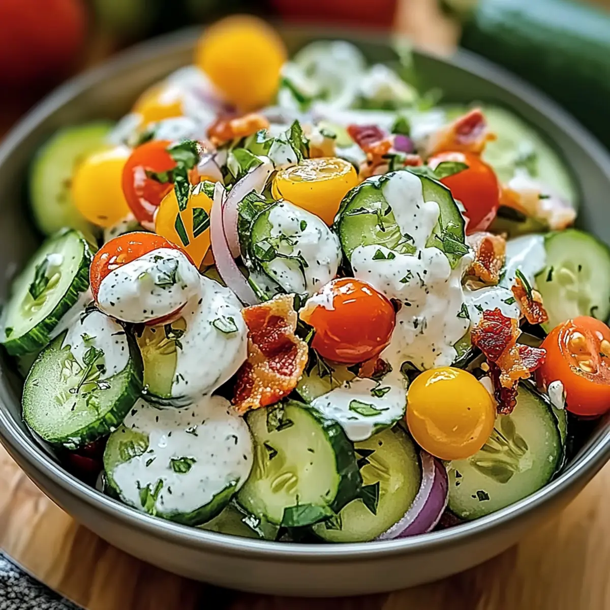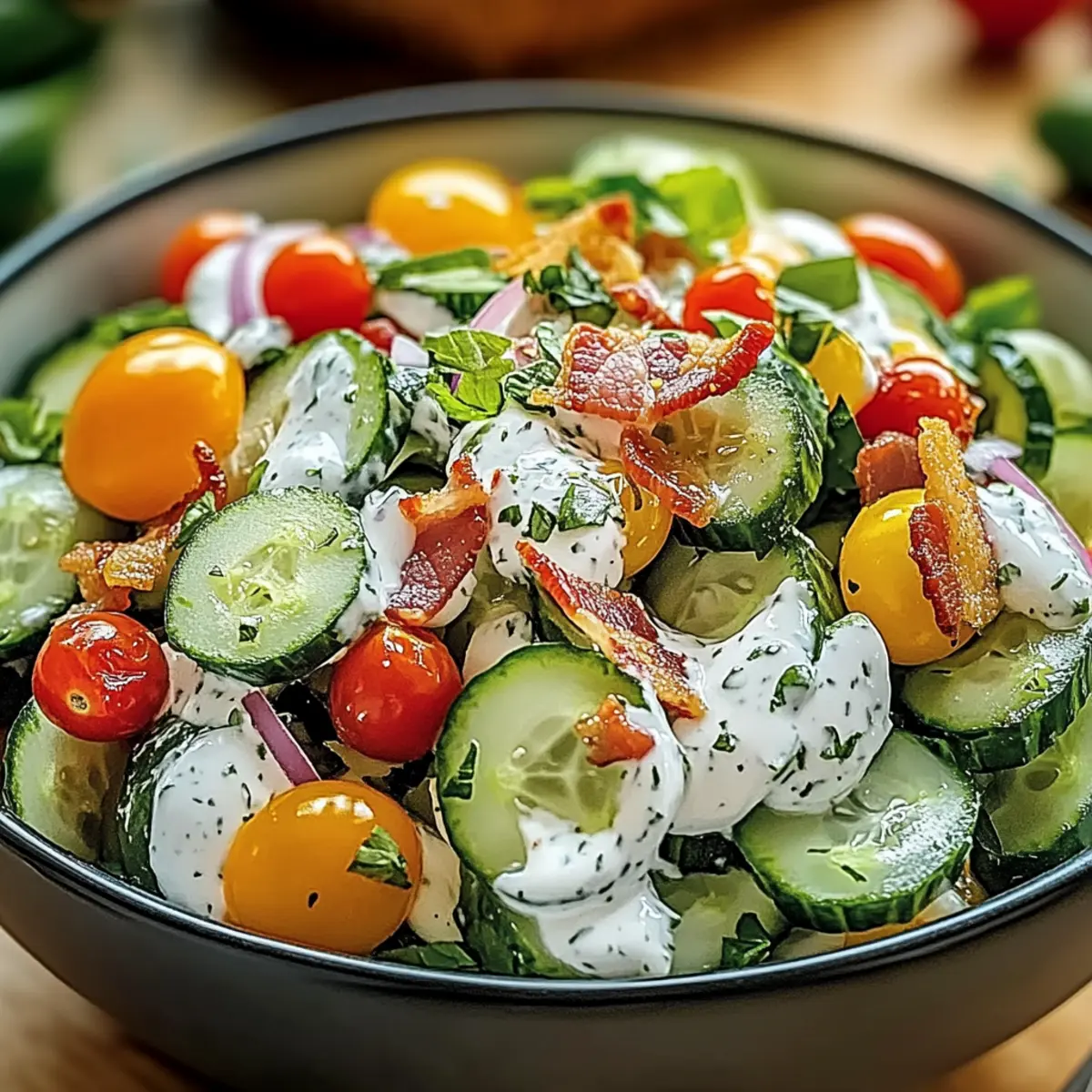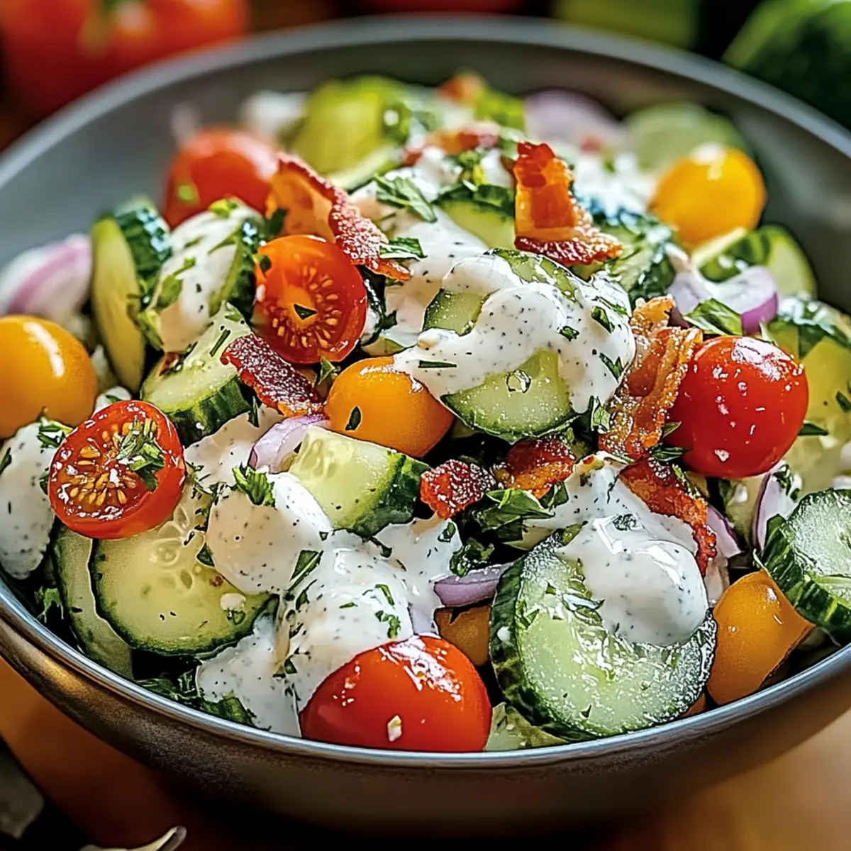 Jump to Recipe Print RecipeAs I chop crisp cucumbers on a sunny afternoon, I’m reminded of family gatherings filled with laughter and good food. Enter the Cucumber Ranch Crack Salad—a vibrant dish that captures the essence of summer in every bite. With its quick preparation and crowd-pleasing nature, this salad offers a delightful blend of refreshing crunch from the cucumbers, rich creaminess from the ranch dressing, and savory bites of bacon and cheese. It’s totally customizable, making it perfect for those picky eaters or adventurous taste buds at your table. Whether I’m serving it at a backyard BBQ or alongside a simple weeknight dinner, this is one recipe that’s sure to be a hit. Curious about how to create this delicious, fuss-free dish? Let’s dive in! Why is Cucumber Ranch Crack Salad a Must-Try? Unforgettable Flavor: The blend of crispy cucumbers, savory bacon, and creamy ranch dressing creates an explosion of taste that will leave your taste buds dancing. Quick & Easy: With simple instructions, this salad can be prepared in just minutes, making it a perfect addition to any meal without stress. Customizable: Easily adapt this recipe to cater to various preferences—try adding fruits, different herbs, or even a spicy kick! Perfect for Gatherings: Whether it’s a summer BBQ or a family dinner, Cucumber Ranch Crack Salad is guaranteed to be a crowd favorite, just like our Smashed Potato Salad or Cucumber Sandwiches Refreshing. Freshness Matters: The use of crisp, fresh ingredients ensures a delightful crunch in every bite, making it a refreshing choice against heavy dishes. Kid-Friendly: With its familiar flavors, kids will love it too, making mealtime easier and more enjoyable for everyone! Cucumber Ranch Crack Salad Ingredients For the Salad Cucumbers – Freshness and crunch; substitute with pickling cucumbers for extra crunch. Cherry Tomatoes – Adds sweetness and a juicy texture; any small tomato variety can work well. Red Onion – Provides zesty flavor and crunch; substitute with green onions for a milder taste. Cooked Bacon – Adds savory depth and crunch; consider using turkey bacon or crispy chickpeas for a vegetarian option. Shredded Cheese – Creaminess and flavor; use mozzarella for a lighter option or vegan cheese for a dairy-free twist. Ranch Dressing – Provides creaminess and tang; opt for Greek yogurt-based ranch for a lighter version or a homemade ranch for freshness. Fresh Dill – Enhances herby notes; substitute with dried dill (1 tablespoon) or other fresh herbs like parsley. Salt and Pepper – Enhances flavor; adjust according to personal taste preferences. For Extra Flavor (optional) Chili Flakes or Hot Sauce – Introduces heat and spice; perfect for those who like a little kick. Additional Cheese – Consider adding feta or goat cheese for more richness. Step‑by‑Step Instructions for Cucumber Ranch Crack Salad Step 1: Prepare the Vegetables Start by washing two fresh cucumbers under cool running water. Once clean, dice them into bite-sized pieces and place them in a large mixing bowl. Next, halve a handful of cherry tomatoes, adding their juicy sweetness to the bowl. The vibrant color of these vegetables will instantly brighten your salad and set the stage for the delicious Cucumber Ranch Crack Salad. Step 2: Chop the Red Onion Finely chop about a quarter of a red onion, ensuring you achieve small pieces for a balanced flavor. As you chop, the aromatic scent will fill your kitchen, adding a zesty crunch to your salad. Once chopped, add the red onion to the mixing bowl with the cucumbers and tomatoes, and gently stir to combine their flavors as you prepare for the next layer of deliciousness. Step 3: Cook and Crumble the Bacon In a skillet over medium heat, cook several strips of bacon until they are crispy, which should take about 8-10 minutes. Keep an eye on them, flipping as necessary for even cooking. Once done, transfer the bacon to a paper towel-lined plate to drain excess grease, then crumble it into bite-sized pieces, ready to add savory depth to your Cucumber Ranch Crack Salad. Step 4: Combine the Salad Ingredients Now it’s time to bring everything together! In your large mixing bowl, add the crumbled bacon along with a generous amount of shredded cheese—choose your favorite variety for extra creaminess. Fold the ingredients gently, making sure the flavors meld without crushing the fresh vegetables, creating a beautiful color medley that enhances the visual appeal of the Cucumber Ranch Crack Salad. Step 5: Dress the Salad Pour a rich ranch dressing over the combined salad ingredients, then sprinkle with fresh dill for an herby aroma. With a large spoon or spatula, carefully mix everything until the ranch dressing is fully incorporated, ensuring every bit of vegetable and bacon is coated. This creamy dressing will elevate your salad from good to unforgettable, truly making it a fantastic Cucumber Ranch Crack Salad. Step 6: Season to Perfection Sprinkle salt and pepper to taste over the salad, adjusting according to your personal preference. Give the salad one final gentle toss to ensure the seasonings are evenly distributed. This simple seasoning step enhances the flavors of the ingredients while letting the freshness of your Cucumber Ranch Crack Salad shine through. Step 7: Chill Before Serving Cover the mixing bowl with plastic wrap or a lid, and place it in the refrigerator for at least 30 minutes. This chilling time allows the flavors to meld beautifully and enhances the refreshing quality of the salad. Just imagine how delightful your Cucumber Ranch Crack Salad will taste after this short wait as the crispiness and creaminess come together! Step 8: Toss and Serve Before serving, take the salad out of the refrigerator and give it a gentle toss to redistribute the ingredients. This is important to ensure every spoonful is packed with the flavorful goodness you’ve created. Transfer the Cucumber Ranch Crack Salad to a co