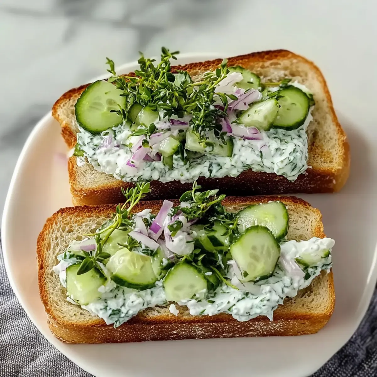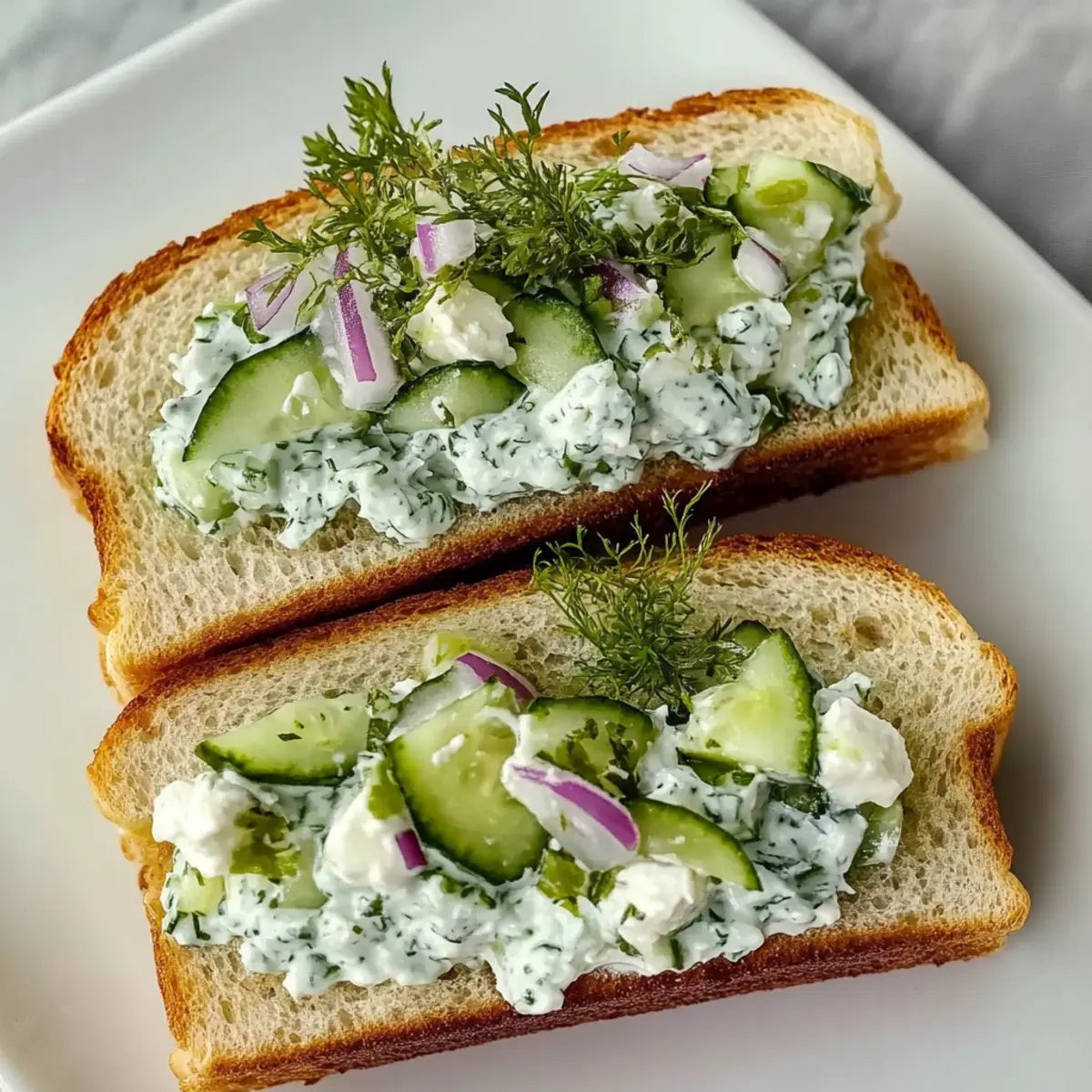 Jump to Recipe Print RecipeAs I stood in my kitchen, the morning sun streaming in, a light bulb moment struck: why not embrace the refreshing crunch of summer with Easy Cucumber Salad Sandwiches? This simple dish is not just about satisfying your midday hunger; it’s a delightful combination of creamy yogurt-feta filling and crisp cucumbers that transforms ordinary lunch into something extraordinary. These sandwiches are quick to whip up, making them a perfect choice for busy afternoons, while also being customizable to suit your taste. Plus, they pack a nutritious punch—easy on the calories but bursting with freshness! Whether you’re hosting a tea party or just craving something light yet satisfying, these Cucumber Salad Sandwiches will soon become a favorite in your culinary repertoire. Ready to elevate your lunch game? Why are Cucumber Salad Sandwiches the best? Light and Refreshing: These Cucumber Salad Sandwiches are the ultimate answer for anyone seeking a refreshing dish to brighten up their lunch. Quick to Prepare: With minimal prep time, you’ll have a satisfying meal ready in no time. Versatile Options: Customize your sandwiches with favorite herbs or swap feta for cream cheese—perfect for any palate! Low-Calorie Goodness: Enjoy the satisfaction of a fulfilling meal without the guilt, ideal for those watching their calories. Crowd-Pleasing: Serve these sandwiches at your next tea party, and watch them disappear—everyone will love this fresh twist on lunch! For additional light meal ideas, check out our Cucumber Shrimp Salad or Radish Salad. Cucumber Salad Sandwiches Ingredients Dive into the fresh flavors of Cucumber Salad Sandwiches with these simple components! For the Filling • English Cucumbers – Provide a crisp, mild taste; you can use regular garden cucumbers if you peel and seed first. • Salt – Helps to draw out moisture from cucumbers to prevent sogginess in your sandwiches. • Plain Yogurt – Acts as the creamy base for the filling, keeping the dish light and refreshing. • Feta Cheese – Adds a tangy, savory kick that perfectly complements the creamy texture. • Fresh Herbs (e.g., dill, parsley) – Enhance the flavor; feel free to customize based on your preferences! • Lemon Zest & Juice – Brightens the filling, giving it a fresh, zesty flavor. • Black Pepper – Adds a hint of spice to elevate your sandwich’s flavor profile. For the Bread • Bread (toasted) – Creates the perfect base for your sandwiches; ensure it’s cooled after toasting to avoid sogginess. • Sprouts (optional) – Adds extra crunch; consider placing them just before serving for freshness. • Onion (sliced, optional) – Introduces additional flavor layers to your delicious filling. Get ready to tantalize your taste buds with these delightful ingredients! Step‑by‑Step Instructions for Cucumber Salad Sandwiches Step 1: Prepare Cucumbers Start by washing and dicing your English cucumbers into small cubes. Place them in a colander, sprinkle with salt, and allow them to sit for 15 minutes. This process helps draw out excess moisture, ensuring a firm and crunchy texture for your Cucumber Salad Sandwiches. Step 2: Make Filling While your cucumbers drain, grab a mixing bowl and combine plain yogurt, crumbled feta cheese, fresh herbs, lemon zest, lemon juice, and a pinch of black pepper. Stir these ingredients together until well mixed, creating a creamy and flavorful filling that perfectly complements the cucumbers. Step 3: Drain Cucumbers After the cucumbers have rested, thoroughly pat them dry with paper towels to remove any remaining moisture. This step is important as it prevents your sandwiches from becoming soggy, ensuring each bite of your Cucumber Salad Sandwiches remains crisp and enjoyable. Step 4: Combine Ingredients Now, gently fold the drained cucumbers into your yogurt and feta mixture. Use a spatula to mix everything until the cucumbers are evenly coated. This delicious filling is the heart of your Cucumber Salad Sandwiches, adding that refreshing crunch and tanginess. Step 5: Assemble Sandwiches Take a slice of toasted bread and generously spread the cucumber salad mixture over the top. If desired, layer on some fresh sprouts and thin slices of onion for an added crunch and flavor. Finally, place another slice of bread on top, completing your Cucumber Salad Sandwich. Step 6: Serve To enjoy your Cucumber Salad Sandwiches at their best, cut them in half and serve immediately. This ensures that the bread stays crisp while the filling is fresh and vibrant. Perfect for a light lunch or tea party, these sandwiches are sure to please! Cucumber Salad Sandwiches Variations Feel free to make these Cucumber Salad Sandwiches your own with some delightful twists and tasty substitutions! Dairy-Free: Swap plain yogurt and feta with a non-dairy yogurt and cashew cheese blend for a creamy texture without dairy. Herb Explosion: Experiment by adding fresh basil or chives to your filling. This herb twist elevates the flavor and adds a vibrant touch! Gluten-Free Option: Use gluten-free bread or lettuce wraps to accommodate dietary needs, allowing everyone to enjoy a refreshing bite. Heat It Up: Toss in some red pepper flakes or diced jalapeños for a spicy kick, transforming the freshness into a zesty adventure. Add Protein: Mix in shredded cooked chicken or chickpeas for a protein-packed version, making your Cucumber Salad Sandwiches a heartier option. Texture Variation: Try adding diced bell peppers or crunchy radishes to the filling for an extra crunch and a pop of color. They create a wonderful texture contrast with the creamy filling. Tangy Twist: Substitute lemon juice with lime juice for a different zesty flavor profile that pairs beautifully with cucumbers. Sliced Avocado: Layer some avocado slices inside the sandwich for creaminess and added nutritional benefits, perfectly complimenting the crisp cucumbers. These delicious variations will keep your lunch excit