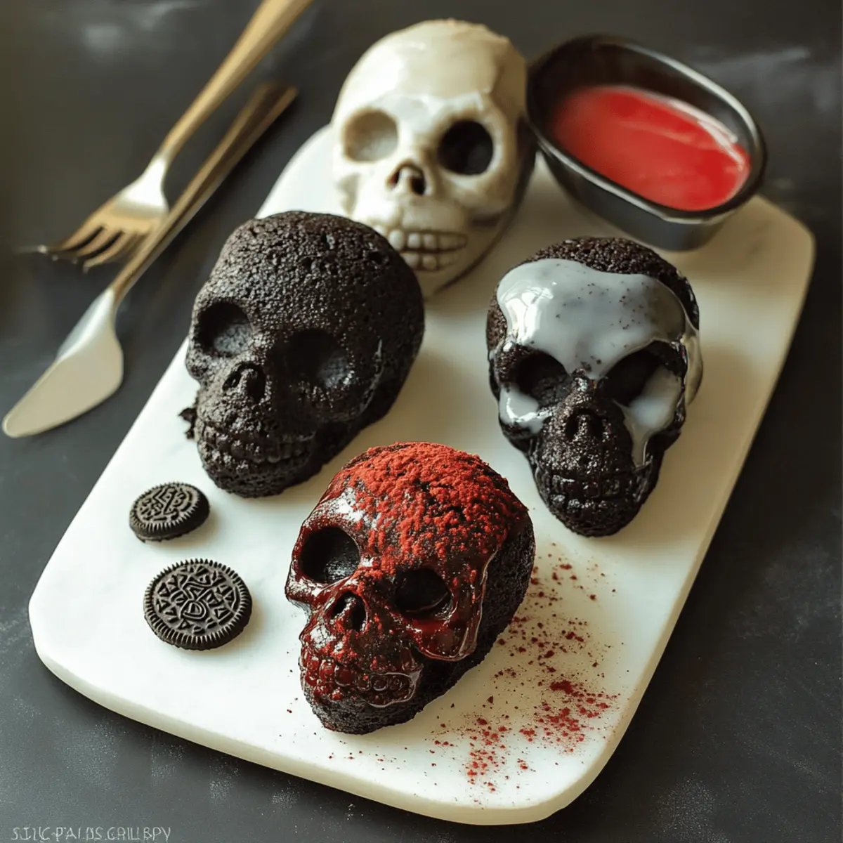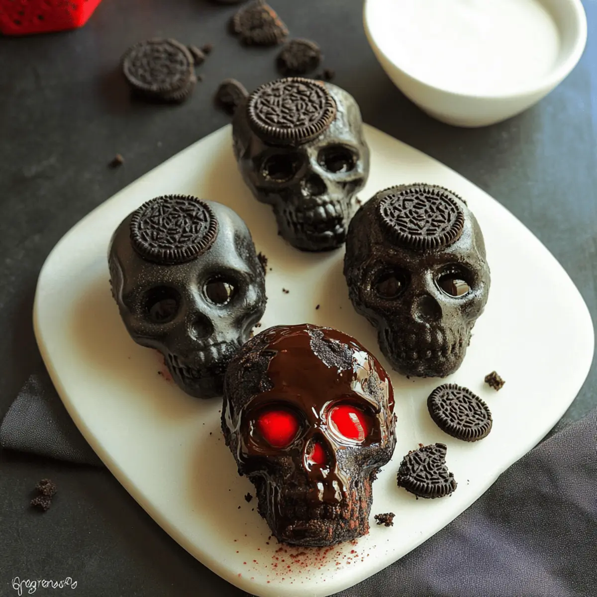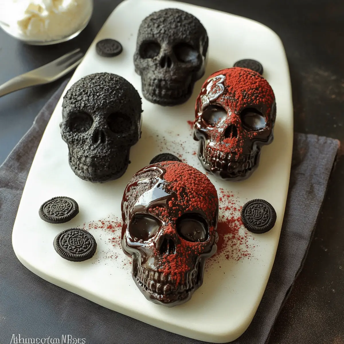 Jump to Recipe Print RecipeAs I rummaged through my pantry, a box of Oreos caught my eye, sparking the inspiration for something delightfully eerie and delicious. These Dark Chocolate Oreo Mini Skull Cakes are a perfect treat to haunt your Halloween festivities, combining rich chocolate and the nostalgic crunch of Oreos into an adorable skull shape. What I love most about this recipe is how easy it is to whip up a batch that will impress your friends and family, whether you’re crafting them for a casual gathering or a spooky soirée. Plus, they are freezer-friendly, so you can bake ahead and be ready for last-minute guests. Are you ready to conjure up some sweet fright this Halloween? Let’s dive in! Why Are These Cakes So Irresistible? Eerily Delightful: Each mini skull cake is not only a treat to the taste buds but also a playful decoration for your Halloween table, creating an exciting visual impact. Rich Chocolate Indulgence: Made with dark chocolate and crushed Oreos, every bite is a decadent experience that chocolate lovers will crave. Easy to Make: The straightforward steps allow both novice and seasoned bakers to prepare these adorable cakes without stress. Crowd-Pleasing Fun: Whether at a Halloween party or family gathering, these little delights are sure to bring smiles and compliments from guests of all ages! Make Ahead Magic: You can easily freeze these cakes, making them a stress-free option for last-minute treats—just thaw, decorate, and serve! If you love festive baking, be sure to check out my recipe for Double Chocolate Chip Cookies too. Dark Chocolate Oreo Mini Skull Cakes Ingredients For the Cake Strong Hot Coffee – Enhances the chocolate flavor; substitute with hot water if avoiding coffee. Dutch Process Cocoa Powder – Provides a deep chocolate flavor; extra for pan dusting creates a great appearance. Sugar – Adds sweetness and moisture to the cake; no substitutions specified. Kosher Salt – Balances the sweetness; standard salt may be used in a pinch. Baking Soda – Acts as a leavening agent; ensure it’s fresh for the best results. Eggs & Egg Yolk – Help bind ingredients and add richness; can use egg substitutes for vegan variations. Buttermilk – Adds moisture and a pleasant tang; substitute with milk and a splash of vinegar if necessary. Peanut Oil (or neutral vegetable oil) – Keeps the cake moist; melted butter can replace for a richer flavor. Vanilla Extract – Adds depth; opt for pure extract for the best overall flavor. All-Purpose Flour – Provides the main structure; measure correctly for the best results. Roughly Crushed Oreos – Adds flavor and texture; avoid using boxed crumbs for optimal taste. For the Glaze Powdered Sugar – Provides sweetness; use a quality brand for smoothness. Milk – Helps in achieving the right glaze consistency; opt for whole milk for richness. Vanilla Extract – Enhances the glaze flavor; choose pure for the best results. With these hearty ingredients and some love from your kitchen, your dark chocolate Oreo mini skull cakes will be the talk of the spooky soirée! Enjoy baking these treats that are not just scrumptious but also perfect Halloween décor. Step‑by‑Step Instructions for Dark Chocolate Oreo Mini Skull Cakes Step 1: Preheat Your Oven Begin by preheating your oven to 350°F (175°C) with the rack positioned in the center. This will ensure even baking for your dark chocolate Oreo mini skull cakes. While the oven warms, you can prepare your cakelet pan for a perfectly smooth finish. Step 2: Prepare the Cakelet Pan Generously butter the skull cakelet pan to ensure easy release of the cakes later. Next, dust each cavity with Dutch process cocoa powder instead of flour, enhancing the dark and rich appearance of your mini skull cakes while also preventing sticking. Step 3: Mix Cocoa and Coffee In a mixing bowl, combine the strong hot coffee with the Dutch process cocoa powder. Stir the mixture until it’s smooth and well combined, then set it aside to cool slightly. This rich blend will deeply enhance the chocolate flavor of your cake batter. Step 4: Blend Sugar and Eggs Using a stand mixer, combine the sugar, kosher salt, baking soda, eggs, and egg yolk on low speed for about 1 minute. This initial mixing will create a mixture that is light and frothy, a great base for the dark chocolate Oreo mini skull cakes. Step 5: Add Buttermilk and Oil Slowly incorporate the buttermilk, peanut oil, and vanilla extract into the egg mixture while continuing to mix on low speed for another minute. The mixture should be well-combined, smooth, and ready for the dry ingredients, contributing to the moist texture of your cakes. Step 6: Mix in the Flour Add the all-purpose flour to the wet mixture and increase the mixer speed to medium for approximately 2 minutes. This step develops the structure of your batter, ensuring that the dark chocolate Oreo mini skull cakes will rise beautifully and maintain their form during baking. Step 7: Combine Cocoa Mixture Now, gradually add the cocoa and coffee mixture to your batter, mixing on medium speed for about 3 more minutes until everything is fully incorporated. The dough will get darker and richer, smelling heavenly as the chocolate flavor intensifies. Step 8: Fold in Oreos Gently fold in the roughly crushed Oreos with a spatula until evenly distributed throughout the batter. This will add delightful pockets of cookie goodness within each mini skull, enhancing the flavor and texture of your dark chocolate Oreo mini skull cakes. Step 9: Fill the Pan Carefully pour the batter into the prepared cakelet pan, filling each cavity approximately 3/4 full. This will allow room for the cakes to rise without overflowing, ensuring that each mini skull comes out looking perfectly formed and notably spooky. Step 10: Bake the Cakes Place the pan in your preheated oven and bake your dark chocolate Oreo mini skull cakes for 20-30 minutes. Check for doneness by inserting a toothpick into t