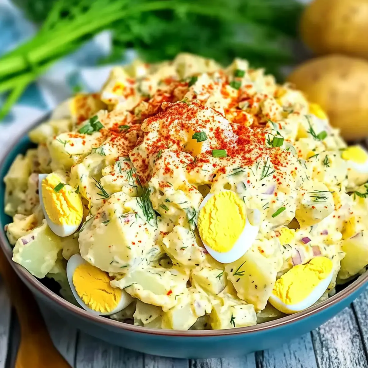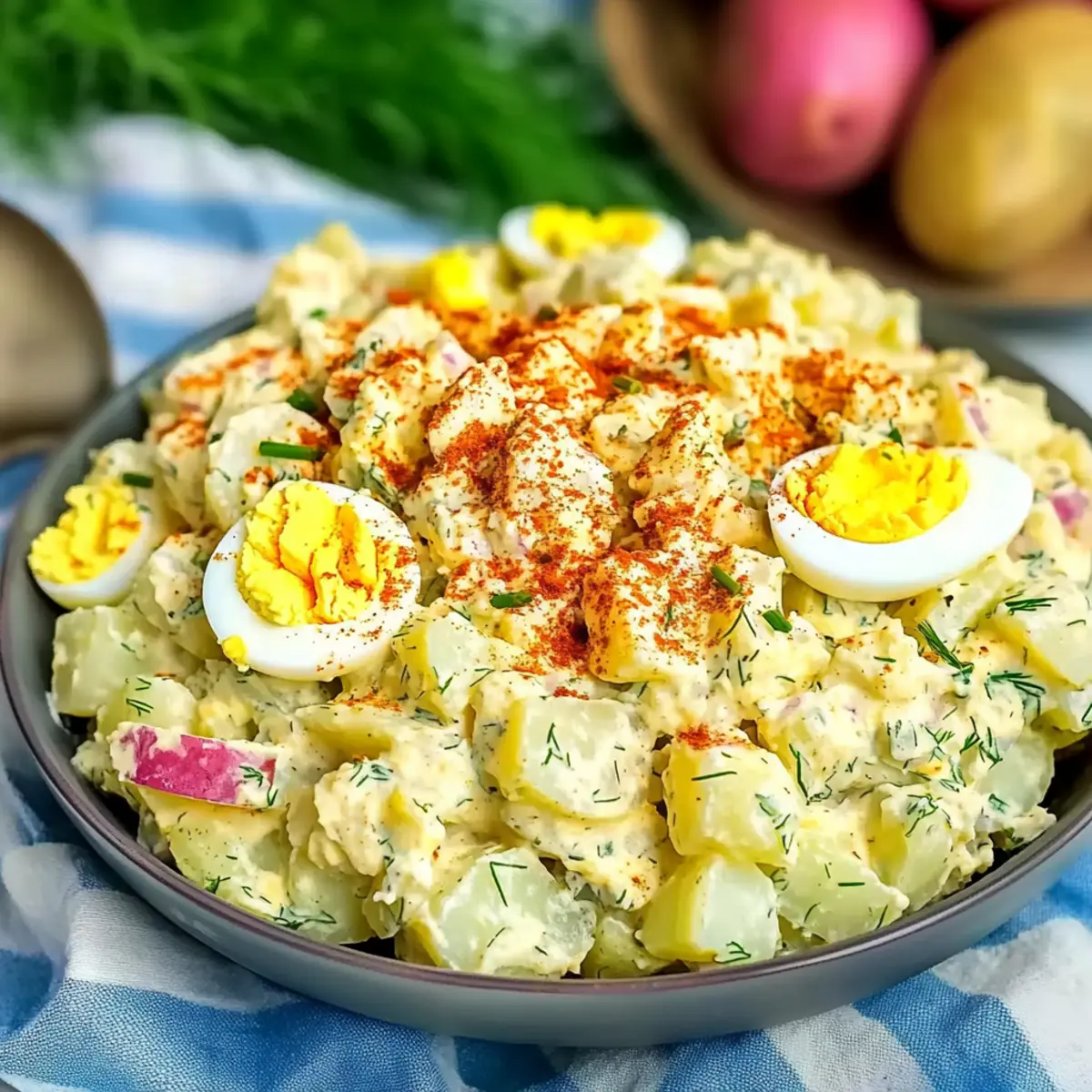 Presentation is key! Garnish your salad with a sprinkle of paprika and some fresh dill for a pop of color and flavor. Want to make it even fancier? A few halved deviled eggs on top will create an eye-catching centerpiece for your gathering!