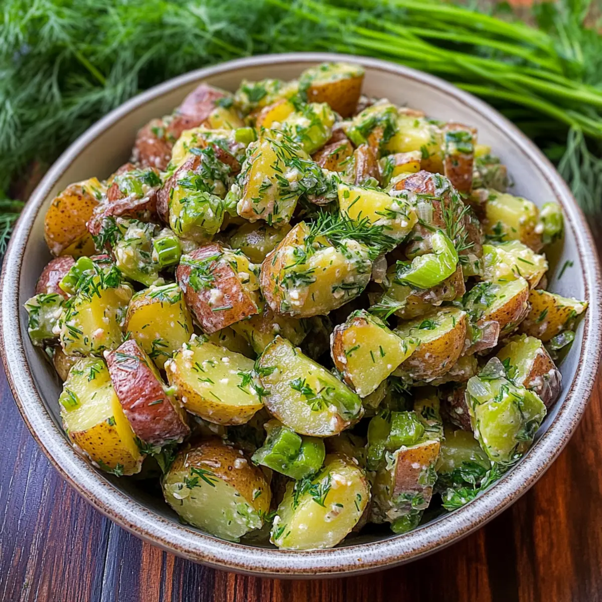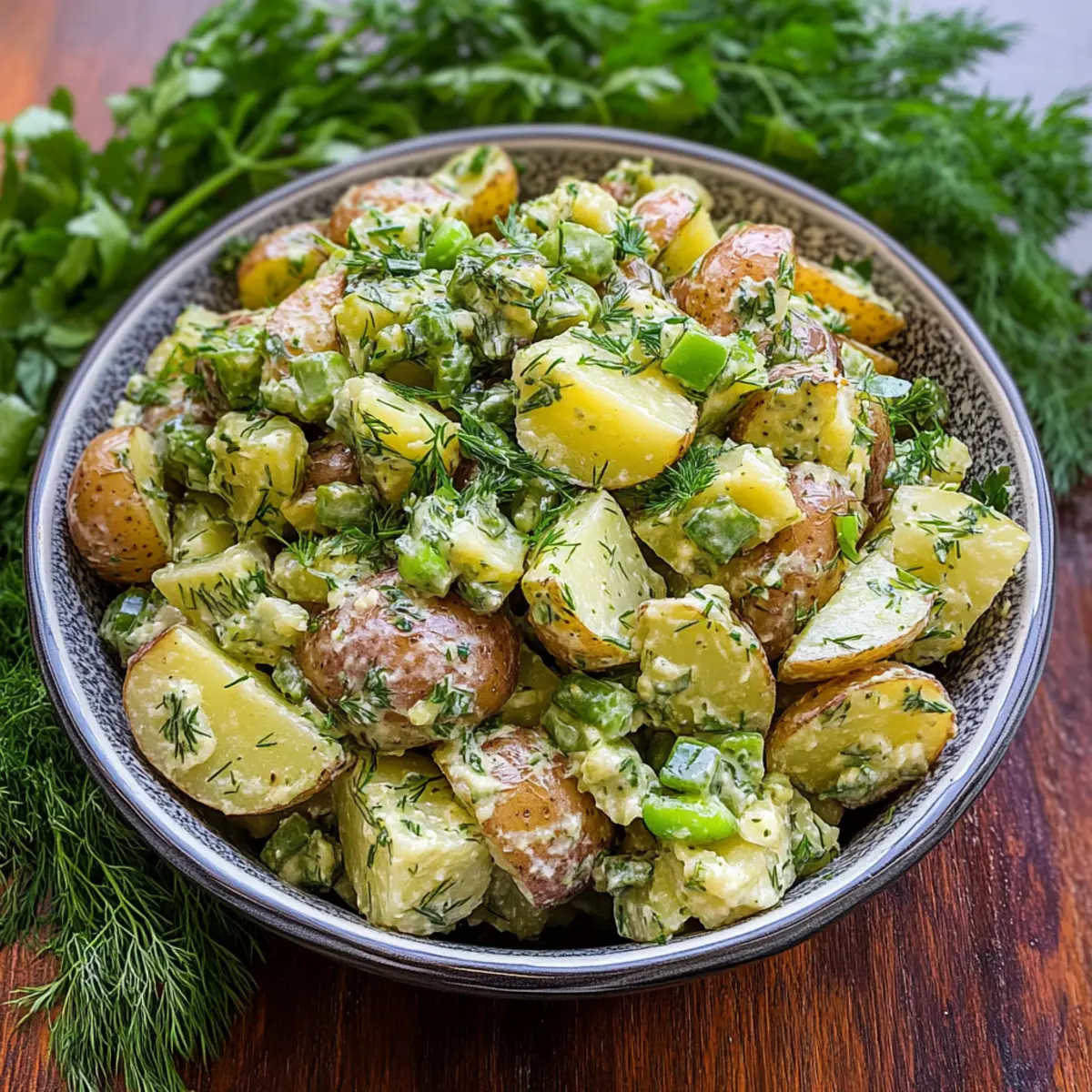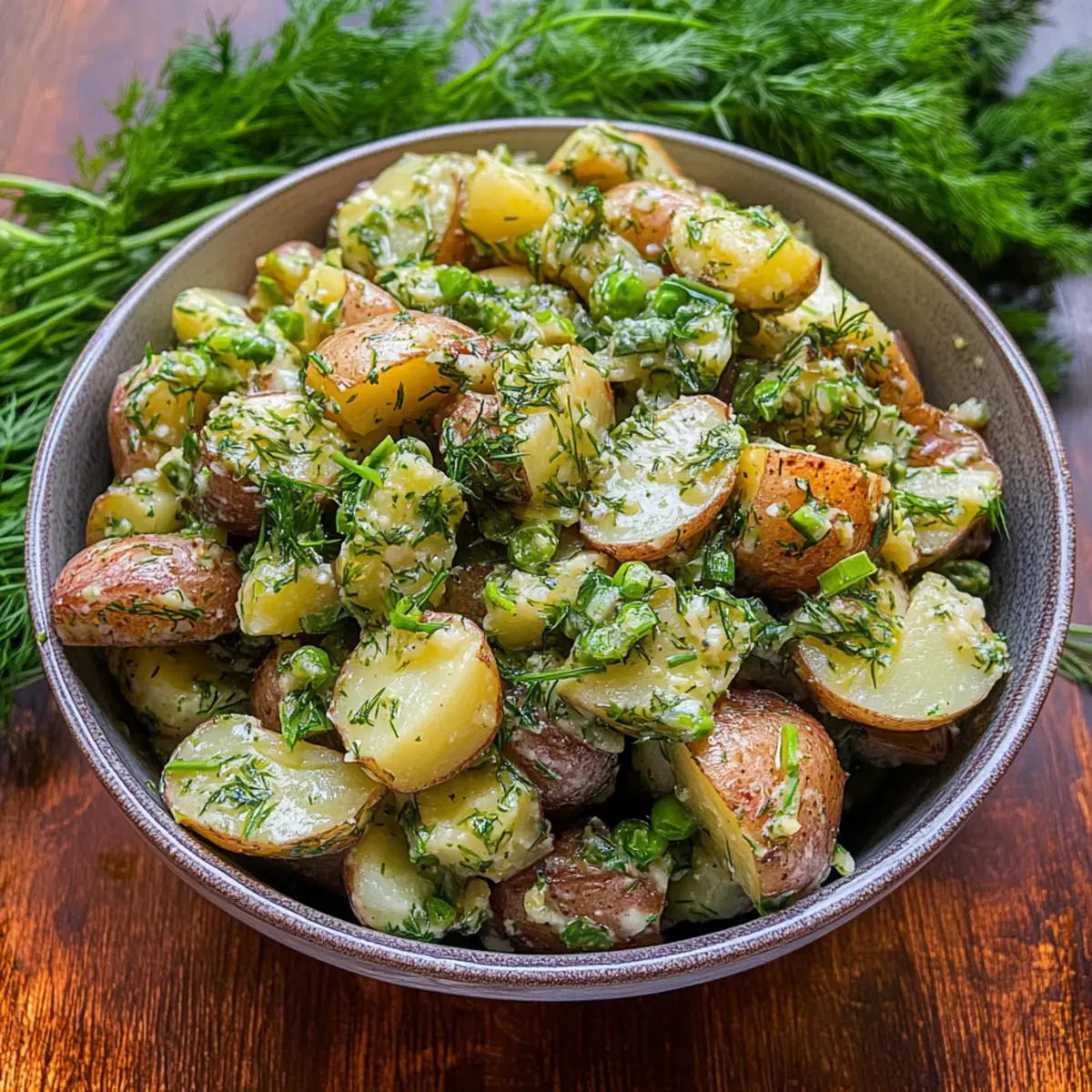 Jump to Recipe Print RecipeStepping outside on a warm afternoon, I’m reminded of sun-drenched picnics and laughter echoing off tree trunks. There’s nothing quite like a Light and Tangy French Potato Salad with Dijon Vinaigrette to capture that summertime essence! This mayo-less twist on the classic recipe is not only gluten-free but also brings a refreshing zing that can transform any barbecue or picnic into a memorable gathering. With its creamy texture complemented by the crispness of fresh herbs and crunchy pickles, this salad serves as a delightful side dish that’s both satisfying and healthy. It’s the perfect way to lighten up your summer meals. Curious how the vibrant combination of flavors comes together? Let’s dive into this refreshing recipe! Why is French Potato Salad So Irresistible? Unique Twist: This Light and Tangy French Potato Salad features a delightful, mayo-less vinaigrette that brings a refreshing zing, perfect for summer picnics. Creamy Yet Light: Enjoy the creamy texture of waxy potatoes without the heaviness of mayonnaise, making it a guilt-free choice. Flavorful Herbs: Fresh parsley and dill elevate the taste, while cornichons add that satisfying crunch. Versatile Side: This salad pairs beautifully with grilled meats, seafood, or even as a vibrant standalone dish. Explore serving ideas with a refreshing Cucumber Shrimp Salad for extra inspiration! Make Ahead: Perfect for meal prep, this salad stays flavorful for days, enhancing its taste with time. Don’t forget to check out our Egg Pasta Salad for another crowd-pleasing dish! French Potato Salad Ingredients • Gather everything you need to create an unforgettable dish! For the Salad Potatoes – Use waxy potatoes like red bliss or baby whites for the best texture; if unavailable, Yukon Gold potatoes add creaminess. Parsley – This herb adds freshness and vibrant color; swap it out for cilantro if you’re seeking a unique flavor. Dill – Offers a lovely, aromatic note; consider using tarragon or chives for a twist on tradition. Green Onions – Provide a milder onion flavor; you can switch to chives or shallots for depth. Shallot (Optional) – Adds savory richness; feel free to omit it for a lighter taste. Cornichons (or Dill Pickles, Optional) – Brings crunch and a touch of saltiness; capers can make a great substitute if you want extra tang. For the Vinaigrette Olive Oil – The base of your dressing; it adds a rich flavor, but feel free to experiment with other oils. Red Wine Vinegar (or Sherry Vinegar) – Provides necessary acidity to brighten the salad; apple cider vinegar can work in a pinch. Dijon Mustard – Central to the vinaigrette, giving that zesty depth; consider honey mustard for a sweeter variation. Grainy Mustard – Adds whole-grain texture; yellow mustard can be a substitute if that’s what you have on hand. Garlic (Optional) – Infuses the vinaigrette with depth; use fresh or powdered as per preference, or skip for a milder dressing. Cornichon Juice (Optional) – Adds extra zing; omit if you’re not using cornichons. Salt and Pepper – Essential for a well-seasoned salad; always adjust to taste. Enjoy crafting this delectable, mayo-less French Potato Salad that is sure to become a favorite for your summer gatherings! Step‑by‑Step Instructions for Light and Tangy French Potato Salad with Dijon Vinaigrette Step 1: Cook Potatoes Begin by bringing a large pot of salted water to a rolling boil. Add the cubed waxy potatoes, such as red bliss or baby whites, and cook for 8 to 10 minutes until they’re just tender yet firm enough to hold their shape. Drain the potatoes, then spread them out on a baking sheet to cool slightly, ensuring they don’t continue cooking. Step 2: Prepare Dressing While the potatoes cool, take a mixing bowl and whisk together ½ cup olive oil, 3 tablespoons of red wine vinegar, 1 tablespoon of Dijon mustard, and 1 tablespoon of grainy mustard. If you’re using garlic, add 1 clove minced, and a teaspoon of cornichon juice if you included cornichons. Season the vinaigrette with salt and pepper to your taste, creating a tangy dressing that will elevate your French potato salad. Step 3: Toss Ingredients In a large mixing bowl, gently combine the cooled potatoes with ¼ cup finely chopped parsley, 2 tablespoons of chopped dill, 3 sliced green onions, and any optional additions like shallots or cornichons. Drizzle the prepared dressing over the mixture, and fold everything together until all the components are well coated, ensuring each potato piece is enveloped in the zesty vinaigrette. Step 4: Chill (Optional) Once mixed, you can serve your Light and Tangy French Potato Salad immediately for a fresh delight! However, for deeper flavors, consider refrigerating the salad for at least one hour or even overnight. This cooling period allows the potatoes to absorb the vinaigrette more fully, enhancing the overall taste experience for your perfect summer dish. Make Ahead Options These Light and Tangy French Potato Salad with Dijon Vinaigrette options are perfect for busy home cooks looking to save time during hectic weeknights! You can prep the potatoes by boiling and cooling them up to 24 hours in advance, ensuring they maintain their firm texture. The vinaigrette can also be made ahead and stored in the refrigerator for up to 3 days—just whisk it again before using to revitalize the flavors. When it’s time to serve, simply combine the potatoes with the dressing and fresh herbs, allowing everything to sit briefly for the flavors to meld. This way, your French Potato Salad will be just as delicious and ready with minimal effort! Expert Tips for French Potato Salad Choose Waxy Potatoes: Use waxy potatoes like red bliss or baby whites for the best texture. They hold their shape without becoming mushy. Flavor Development: Allow the salad to chill for at least an hour before serving. This resting time deepens the flavors beautifully. Season to Taste: Always 