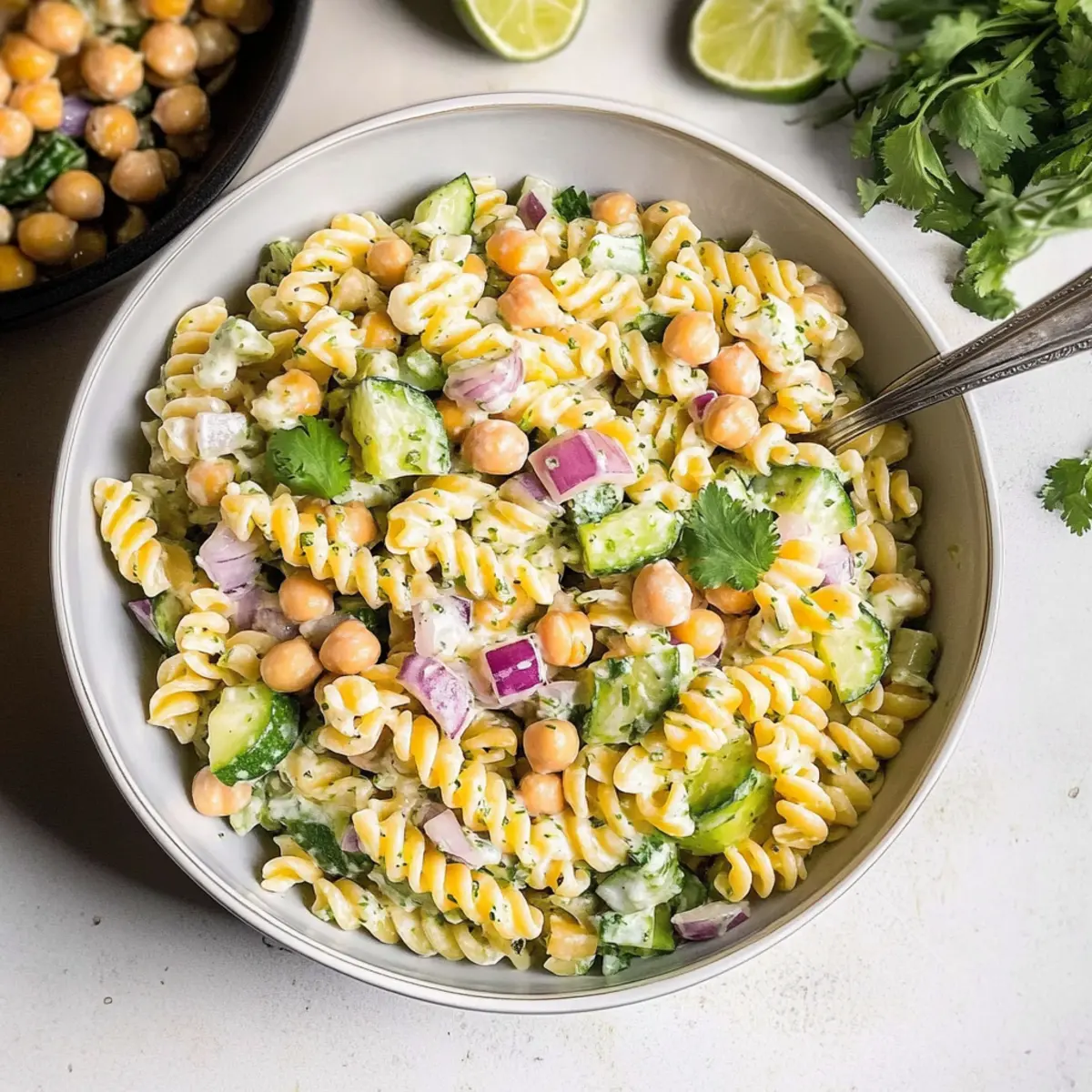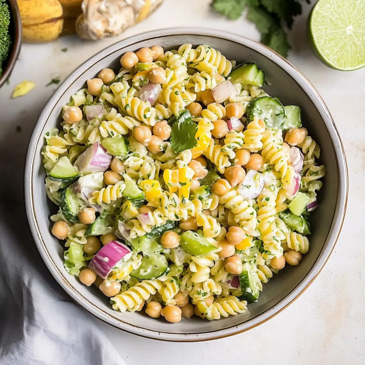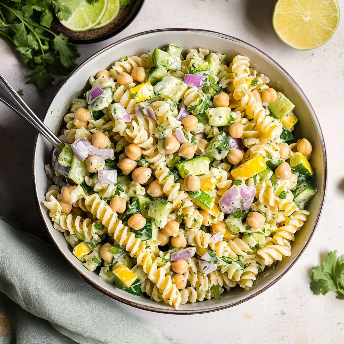 Jump to Recipe Print RecipeAs I was flipping through my recipe collection, a vibrant, zesty creation caught my eye: Fresh & Healthy Cilantro Lime Pasta Salad. Bursting with colors and textures, this delightful dish makes a fantastic addition to any meal, whether you’re aiming for a wholesome lunch or a crowd-pleasing side at your next gathering. With nutritious ingredients like chickpeas, crunchy cucumber, and sweet corn, it’s not just tasty—it’s also perfect for meal prep, allowing you to savor fresh flavors throughout the week. Plus, the creamy dressing made with Greek yogurt adds a delightful twist while packing in a little extra protein. Who else is ready to dive into a bowl of this refreshing goodness? Let’s get cooking! Why is Cilantro Lime Pasta Salad a Must-Try? Vibrant Flavors: This Fresh & Healthy Cilantro Lime Pasta Salad embraces a medley of tastes that will awaken your taste buds, combining fresh cilantro and zesty lime for an invigorating experience. Quick and Easy: With a streamlined preparation process, you can create this dish in no time, making it perfect for busy weeknights or impromptu get-togethers. Meal Prep Friendly: Ideal for those on the go, this salad stores beautifully in an airtight container, ensuring delicious, nutritious meals are always at hand. Just check out our Egg Pasta Salad for another great meal prep option! Crowd-Pleaser: Whether served during a summer BBQ or as a refreshing side at a potluck, this salad is bound to impress your guests and keep everyone coming back for more. Nutritionally Balanced: With protein-packed chickpeas and plenty of veggies, this salad is not only satisfying but also supports your healthy eating goals. Dive into this delightful recipe and experience a new favorite at your table! Fresh & Healthy Cilantro Lime Pasta Salad Ingredients For the Dressing Greek Yogurt – serves as a creamy base while adding tang and protein. Avocado – adds a rich texture and healthy fats to the dressing. Lime Juice – brings bright acidity that enhances the flavors of the dish. Fresh Cilantro – infuses the dressing with a bold, herbaceous kick; use more for extra flavor! For the Salad Short Pasta (375g) – provides the structure; feel free to use rotini, fusilli, or penne. Chickpeas (19 oz can, drained and rinsed) – a great source of protein and fiber, enhancing the salad’s nutritional profile. Corn (12 oz can, drained and rinsed) – adds a sweet crunch that complements the other ingredients. Medium Cucumber (chopped) – contributes refreshing crispness to the dish. Small Red Onion (diced) – brings a sharp bite that balances the creamy dressing. Feta Cheese or Cotija Cheese (1/2 cup, crumbled) – adds a salty creaminess that elevates the flavors. Cilantro (optional, for garnish) – enhances the freshness of the salad and offers a pop of color. Lime Juice (optional, for squeezing on top) – adds an extra burst of zesty brightness right before serving. Get ready to enjoy summer vibes with this fresh & healthy cilantro lime pasta salad that’s ideal for any occasion! Step‑by‑Step Instructions for Fresh & Healthy Cilantro Lime Pasta Salad Step 1: Make the Creamy Dressing In a high-speed blender or food processor, combine Greek yogurt, avocado, lime juice, and fresh cilantro. Blend until the mixture is smooth and creamy, about 1-2 minutes. Taste and adjust the seasoning, then set the dressing aside to allow the flavors to meld while you prepare the salad. Step 2: Cook the Pasta Bring a large pot of salted water to a boil, then add your choice of short pasta. Cook according to package instructions until al dente, typically around 8-10 minutes. Once done, drain the pasta thoroughly in a colander and let it cool while you prepare the other ingredients. Step 3: Prepare the Salad Ingredients While the pasta is cooling, open and drain the chickpeas and corn, rinsing them under cold water to remove any excess sodium. Chop the cucumber and dice the red onion into small pieces. In a large mixing bowl, combine these vegetables along with the chickpeas and corn, creating a colorful and nutritious base for your Fresh & Healthy Cilantro Lime Pasta Salad. Step 4: Combine Pasta and Salad Ingredients Once the pasta has cooled to room temperature, add it to the bowl with the chickpeas and vegetables. Gently fold the ingredients together using a spatula, ensuring that everything is well mixed without breaking the pasta or vegetables. This base will be the foundation of your vibrant pasta salad. Step 5: Dress the Salad Drizzle the creamy cilantro lime dressing over the pasta mixture. Gently toss the salad with a spatula until every ingredient is coated in the luscious dressing, taking care to maintain the pasta’s structure. This step will bring all the fresh flavors together in your Fresh & Healthy Cilantro Lime Pasta Salad. Step 6: Add Cheese and Final Touches Sprinkle the crumbled feta or cotija cheese over the top of the salad. Give it a gentle toss to incorporate the cheese without overwhelming the salad. For an extra burst of flavor, consider garnishing with more fresh cilantro and a squeeze of lime juice just before serving for a zesty finish. Fresh & Healthy Cilantro Lime Pasta Salad Variations Customize this vibrant salad to suit your taste buds and dietary preferences! Black Beans: Swap chickpeas for black beans for a smoky flavor and a different texture. Vegan Option: Substitute feta cheese with nutritional yeast for a cheesy flavor that’s dairy-free. You won’t miss the creaminess, and your salad will still shine! Extra Veggies: Add diced bell peppers or avocados for a splash of color and an added layer of nourishment. Bell peppers bring crunch, while avocados contribute a creamy texture. Spicy Kick: Stir in a diced jalapeño or a sprinkle of red pepper flakes for a delightful kick. This gives your salad a refreshing zing that truly elevates the experience. Quinoa Boost: For a hearty upgrade, incorporate cooked quinoa alo