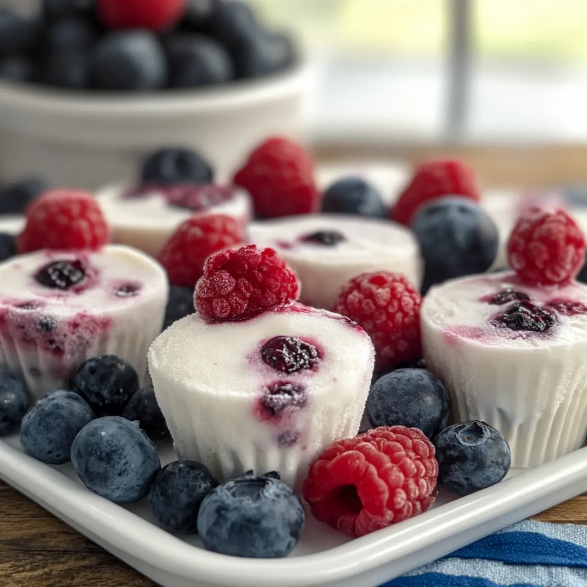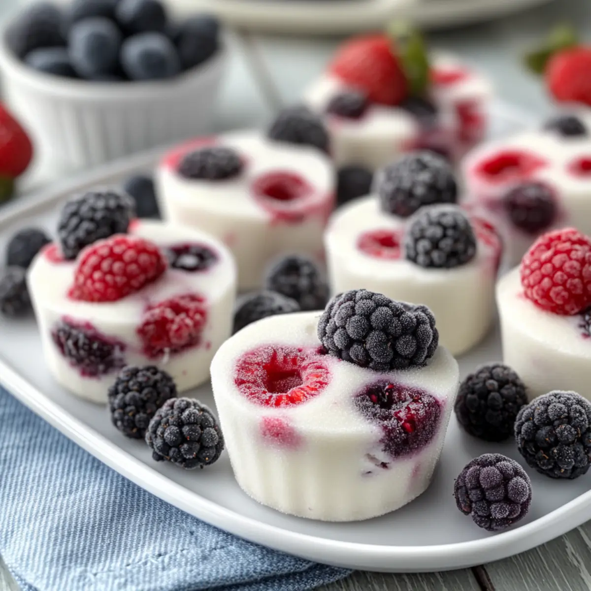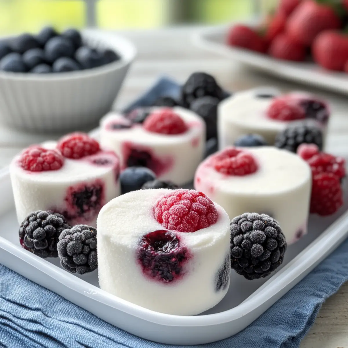 Jump to Recipe Print RecipeThe sun shines bright, and the desire for a cool, refreshing treat strikes. Say hello to these delightful Customizable Frozen Yogurt Berry Bites—a snack that delivers a burst of color and flavor, perfect for those warm summer days! With just a handful of ingredients and no baking required, this recipe is not only quick to whip up but also offers endless customization possibilities to fit your taste. As someone who’s always seeking the perfect balance between indulgence and health, I’ve found these creamy bites to be ideal as both a post-workout snack and a guilt-free dessert. Plus, they can easily accommodate different dietary needs—think gluten-free or dairy-free options! Ready to give your taste buds a refreshing adventure? Let’s dive into this easy, no-fuss recipe that you can make your own! Why Choose Frozen Yogurt Berry Bites? Cool, Refreshing Treat: These bites are a delicious way to beat the heat during summer or anytime you need a hit of refreshment. Customizable Delight: You can easily swap in your favorite fruits or yogurt varieties, making them perfect for everyone, from picky eaters to health enthusiasts. No-Bake Convenience: Quick to prepare with no baking required, they’re a lifesaver for busy evenings or last-minute parties. Guilt-Free Indulgence: Packed with protein and antioxidants, these bites offer a sweet treat without the guilt—ideal for health-conscious snackers. Perfect for Meal Prep: Make a big batch and store them in the freezer for easy access to a nutritious snack or dessert when cravings strike! Enjoy these bites alongside refreshing options like Berry Caprese Salad or Blueberry Cookies Soft for a well-rounded spread. Frozen Yogurt Berry Bites Ingredients • Notes on ingredients that shine in these delightful treats! For the Bites Mixed Berries – Choose fresh or frozen for vibrant flavor and natural sweetness in your frozen yogurt berry bites. Greek Yogurt – Use thick Greek yogurt for creaminess and protein; opt for a dairy-free plant-based yogurt if desired. Honey or Maple Syrup – Add sweetness and balance the yogurt’s tang; feel free to adjust for your taste or omit for lower sugar. Optional Add-Ins Granola – Introduce a delightful crunch; substitute with nuts or seeds for a different texture if you prefer. Nut Butter – Enhance richness and flavor with almond, peanut, or any nut butter of your choice! Step‑by‑Step Instructions for Frozen Yogurt Berry Bites Step 1: Mix the Base In a mixing bowl, combine your thick Greek yogurt with honey or maple syrup. Using a spatula, stir the mixture until smooth and well-combined—aim for a creamy texture that balances the tanginess of the yogurt with the sweetness of your chosen sweetener. This should take about 1-2 minutes and will create the base for your delicious Frozen Yogurt Berry Bites. Step 2: Fold in the Berries Next, gently fold in the mixed berries of your choice, taking care to distribute them evenly throughout the yogurt mixture. Whether using fresh or frozen berries, mix until you see vibrant colors bursting through the creamy base. This should take about 1-2 minutes, ensuring every bite of your Frozen Yogurt Berry Bites is packed with fruity goodness. Step 3: Prepare for Freezing Now, pour the yogurt and berry mixture into mini muffin cups, filling each about three-quarters full. For a thicker layer, you may also spread the mixture in a lined tray. Use a spatula to smooth the surface, ensuring even shapes for easy portioning later. Prepare to freeze by placing the cups or tray in the freezer for a minimum of 2 hours until the bites are firm. Step 4: Remove and Serve Once frozen solid, carefully remove the bites from the muffin cups or cut into squares if using a tray. If using silicone molds, they should pop out easily. If using a tray, simply slide a knife around the edges to release the squares. Your Frozen Yogurt Berry Bites should now have a smooth texture and vibrant color, ready to be enjoyed. Step 5: Store for Later To keep your bites fresh, store them in an airtight container in the freezer until you’re ready to serve. These delightful treats can be kept in the freezer for up to 2 months—perfect for when a sweet craving strikes or you need a cool, healthy snack. Just allow them to thaw for a few minutes before enjoying for ease of eating. Expert Tips for Frozen Yogurt Berry Bites • Thick Yogurt Is Key: Use thick Greek yogurt to ensure your frozen yogurt berry bites hold their shape; otherwise, they may turn out too soft. • Fresh or Frozen Berries: Both fresh and frozen berries work well; however, if using frozen, allow them to thaw slightly before mixing to prevent excess liquid. • Use Silicone Molds: For easy removal, silicone muffin cups are highly recommended; they help keep the bites intact without sticking to the sides. • Sweetness Adjustment: Taste your mixture before freezing; adjusting the honey or maple syrup is simple, ensuring your bites are just the right level of sweetness. • Batch Prep for Convenience: These bites freeze beautifully, so consider making a double batch. Preparing them ahead of time ensures you have a healthy snack ready when cravings strike! Storage Tips for Frozen Yogurt Berry Bites Fridge: Store in the refrigerator for up to 3 days if you plan to enjoy them soon. Keep covered to maintain freshness. Freezer: For long-term storage, place the frozen yogurt berry bites in an airtight container. They can stay fresh for up to 2 months. Serving: Before serving, allow the bites to sit at room temperature for a few minutes to soften slightly, making them easier to eat. Labeling: If you have multiple flavors, label your airtight container with the date and ingredients to keep track of freshness and variations of your frozen yogurt berry bites. What to Serve with Customizable Frozen Yogurt Berry Bites These little frozen gems are perfect for elevating any occasion, making a sweet addition to your warm-weath
