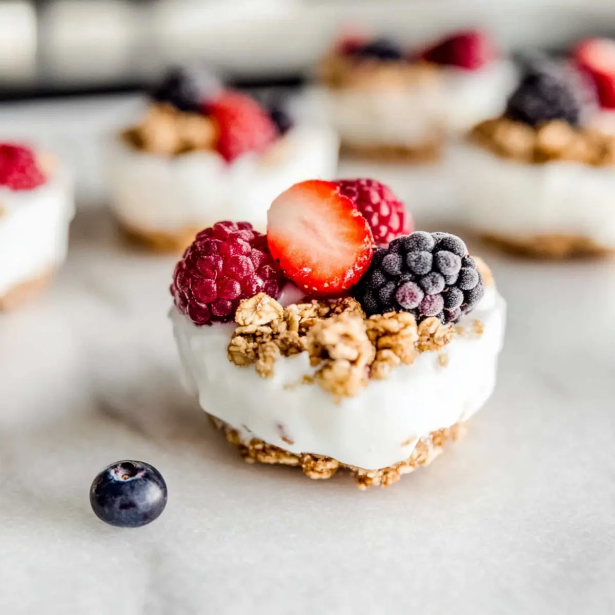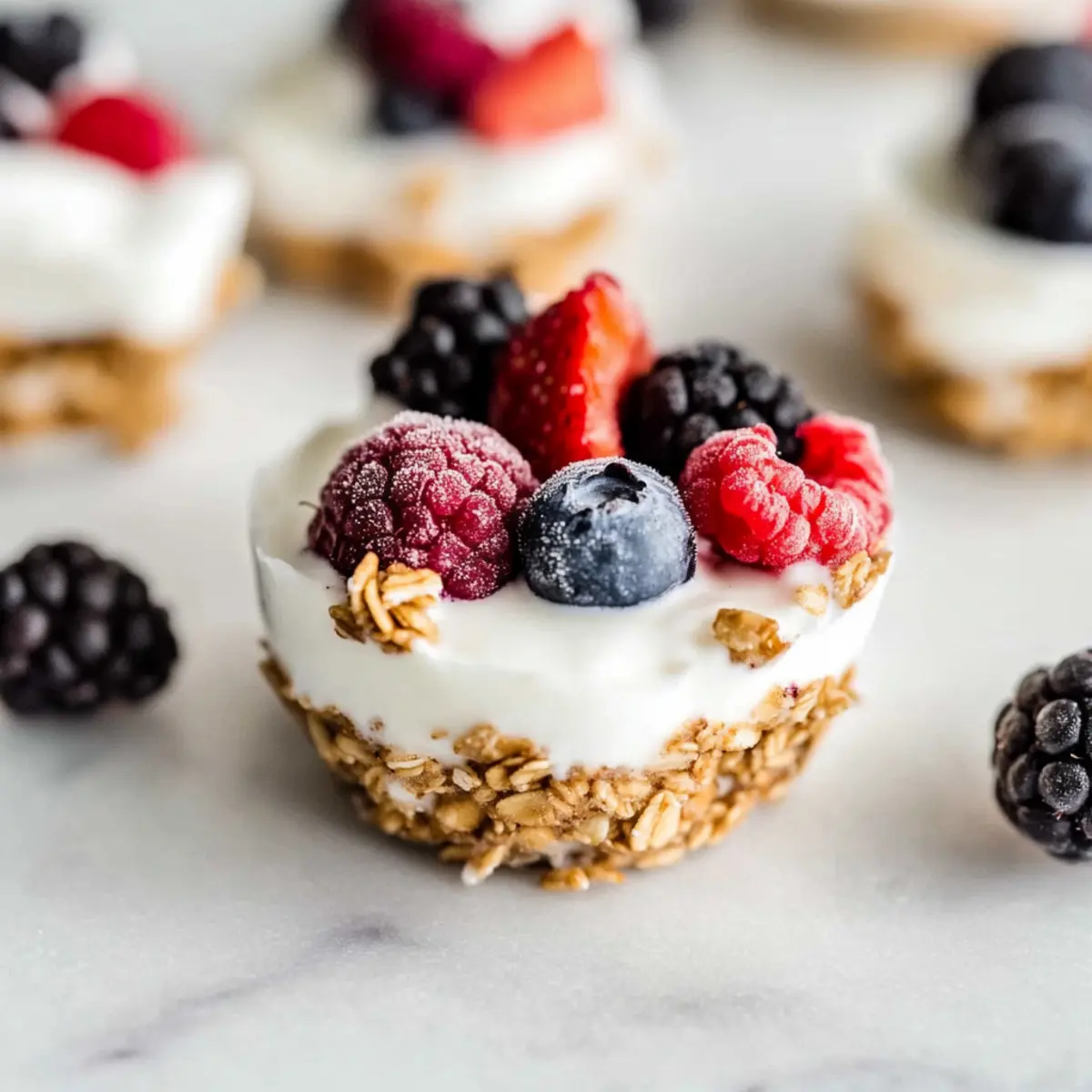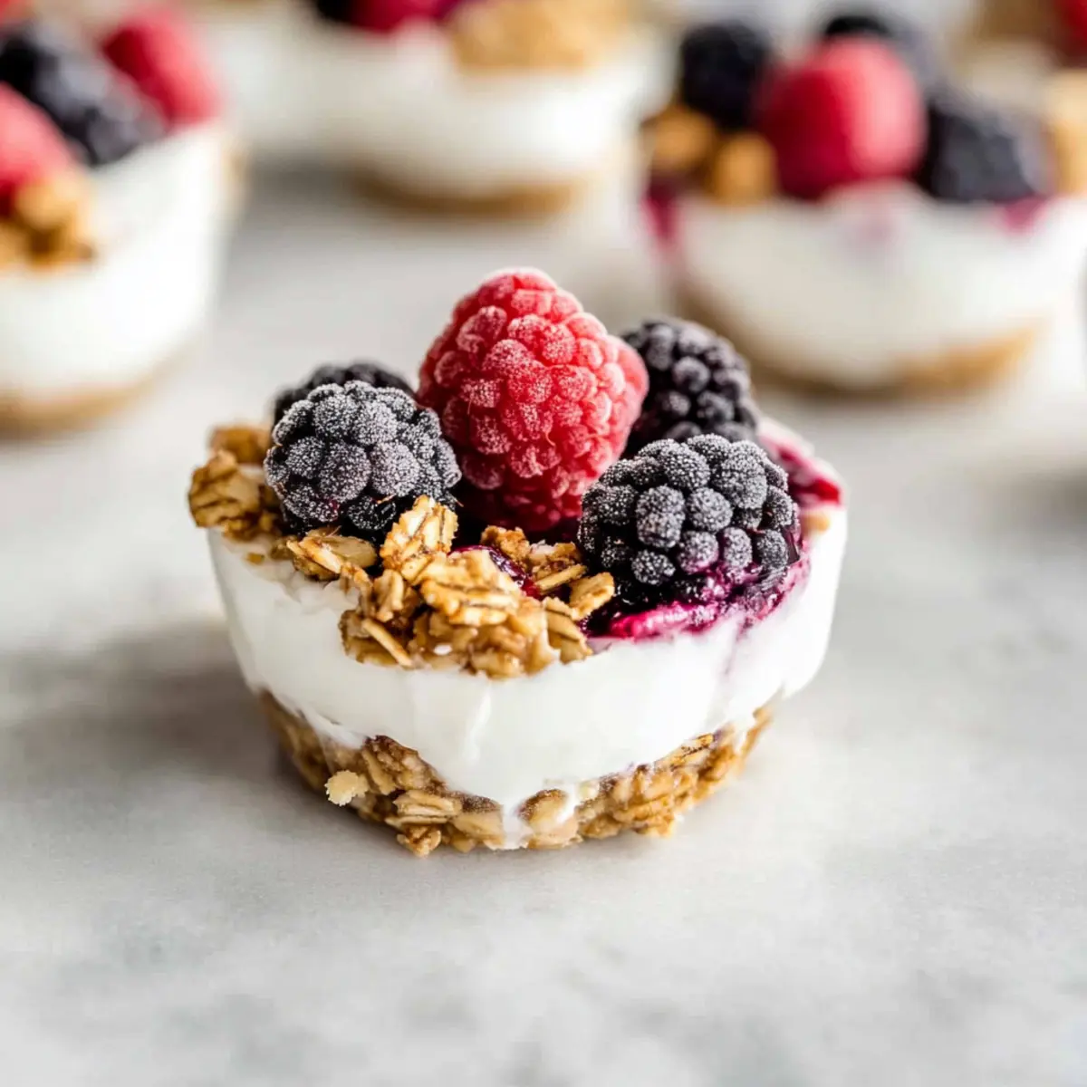 Jump to Recipe Print RecipeAs I rummaged through the pantry, I discovered a treasure trove of ingredients just waiting to come together. That’s how these Healthy Frozen Yogurt Granola Cups were born! This delectable, make-ahead snack combines creamy Greek yogurt, crunchy granola, and a burst of fresh berries, creating a delightful and guilt-free treat. To my joy, they come together in under 15 minutes, making them perfect for any busy day when you crave something quick yet satisfying. Whether you’re looking for a wholesome breakfast on the go or a light dessert, these cups are a protein-packed powerhouse that won’t keep you stuck in the fast-food rut. Curious to see just how simple these are to whip up? Let’s dive into the recipe! Why are these cups the perfect snack? Healthy, Delicious Treat: Packed with protein and fiber, these Frozen Yogurt Granola Cups offer a guilt-free indulgence. Quick Preparation: You can whip these up in under 15 minutes, making them an ideal solution for busy mornings or last-minute cravings. Customizable: Feel free to swap ingredients, like using dairy-free yogurt or your favorite berries, to cater to your preferences. Perfectly Portable: Easily grab a cup for breakfast or a snack, and enjoy it on-the-go without fuss. For more nutritious snacks, you might also want to check out our Bowl Tahini Yogurt for another delightful option! Frozen Yogurt Granola Cups Ingredients • Here’s everything you need to make these delightful Frozen Yogurt Granola Cups! For the Granola Base Oats – Provides structure and crunch; substitute with gluten-free oats for a gluten-free option. Almond Butter – Acts as a binder and adds creaminess; can be replaced with peanut butter or sunbutter for nut allergies. Honey – Adds natural sweetness and helps bind ingredients; substitute with maple syrup for a vegan option. Vanilla Extract – Enhances flavor; use pure vanilla for best results. For the Yogurt Layer Greek Yogurt – Offers creaminess and protein; use dairy-free yogurt (like coconut yogurt) for a dairy-free version. For the Toppings Fresh Berries – Adds natural sweetness and texture; any berries can be used, such as strawberries, blueberries, or raspberries. Step‑by‑Step Instructions for Frozen Yogurt Granola Cups Step 1: Prepare the Granola Crust In a large mixing bowl, combine the oats, almond butter, honey, cinnamon, and vanilla extract. Mix well until the ingredients are fully blended, forming a cohesive and slightly sticky mixture. This will serve as the delicious granola base for your Frozen Yogurt Granola Cups. If it feels too dry, add a splash of water or more almond butter. Step 2: Press Mixture into Pan Using your fingers, press the granola mixture firmly into the bottom of muffin liners placed in a muffin pan. Aim for an even thickness of about half an inch to create a sturdy base for each cup. The granola should be well-packed, giving it a crunchy texture once frozen. Make sure to cover the bottom of each liner completely. Step 3: Add Yogurt Scoop approximately two tablespoons of Greek yogurt into each granola cup, smoothing it out over the granola layer. Ensure the yogurt is evenly spread to create a creamy top layer that balances perfectly with the crunchy base. This creamy yogurt layer will be a delightful contrast in your Frozen Yogurt Granola Cups, so take your time to make it as smooth as possible. Step 4: Top with Berries Next, add a generous handful of fresh berries on top of the yogurt layer in each cup. Feel free to mix and match your favorite berries, such as strawberries, blueberries, or raspberries, for a burst of color and flavor. For an extra crunch, sprinkle a few additional granola crumbs on top before proceeding to the next step. Step 5: Freeze Carefully place the muffin pan in the freezer and let the cups freeze for at least 3 hours, or until they are firm to the touch. The freezing process allows the layers to bind together and solidify, making your Frozen Yogurt Granola Cups easy to handle. Check occasionally to ensure they freeze evenly and thoroughly. Step 6: Serve Once frozen, remove the muffin pan from the freezer and allow the cups to thaw at room temperature for 5-10 minutes. This will make it easier to peel the liners off and enjoy your delicious Frozen Yogurt Granola Cups. Serve them as a healthy snack or quick breakfast, and savor the delightful combination of textures and flavors. What to Serve with Frozen Yogurt Granola Cups Enhance your delightful snack experience with these perfect pairings that cater to every craving. Fresh Fruit Salad: A vibrant mix of seasonal fruits adds a refreshing touch, balancing the creamy texture of the cups with juicy bites. The burst of flavor in every spoonful complements the granola’s crunch beautifully. Nutty Protein Bars: For an extra boost of energy, serve a nutty protein bar alongside. These bars echo the healthy theme while providing a satisfying chew that complements the cooler, creamy yogurt. Chia Seed Pudding: The silky texture of chia pudding pairs excellently with the crunchy granola base. Top it with additional berries for a colorful and nutritious ensemble that makes snack time even more special. Green Smoothie: A refreshing green smoothie with spinach, banana, and almond milk offers a nutrient-packed beverage bursting with flavor that rounds out your healthy treat perfectly. Almond Milk Latte: Enjoy your frozen treats with a cozy almond milk latte. This nutty drink adds warmth and pairs harmoniously with the cups’ refreshing coldness, making it a delightful combination. Honey Drizzle: Add a drizzle of honey over the cups just before serving for an extra touch of sweetness that enhances their natural flavors. This simple addition transforms each bite into a luscious delight. Dark Chocolate Shavings: For a touch of indulgence, sprinkle dark chocolate shavings on top of your cups. This adds a rich contrast to the bright flavors of the yogurt and berries while satisfyi