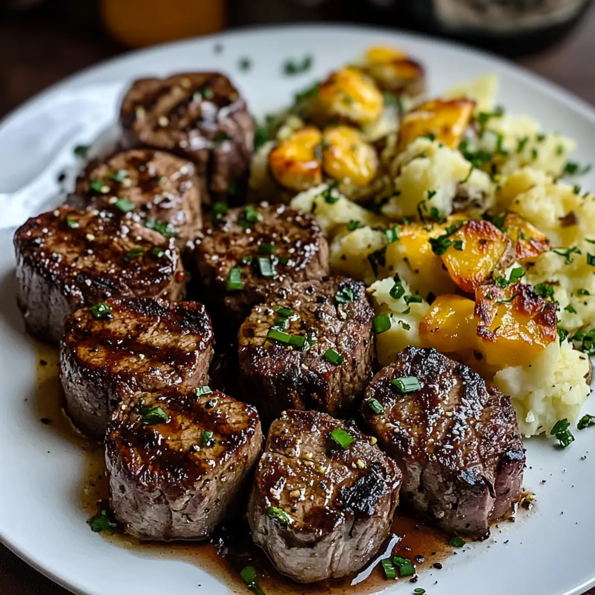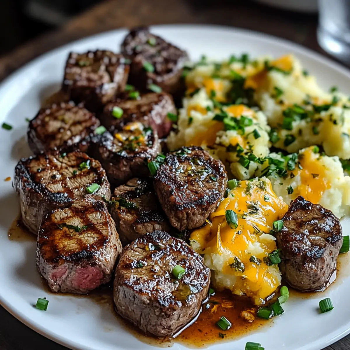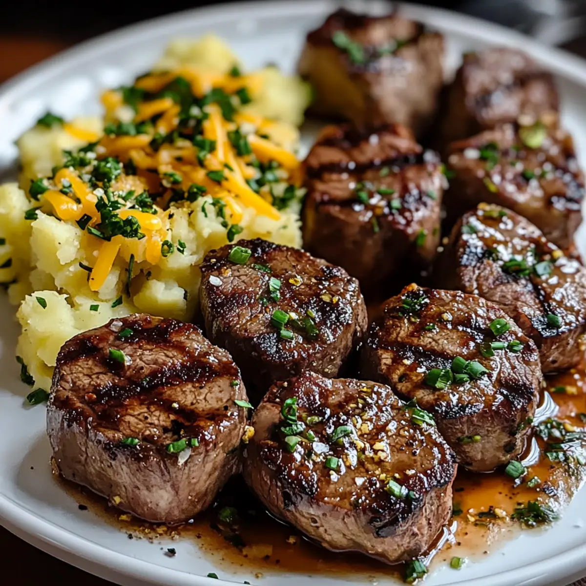 Jump to Recipe Print RecipeAs I stood in the kitchen, the aroma of sizzling steak filled the air, instantly transporting me to my favorite steakhouse. Nothing compares to the magic of Garlic Butter Steak Bites with Cheesy Smashed Potatoes—a dish that marries comfort and indulgence in every bite. This delightful recipe effortlessly transforms ordinary weeknight meals into an experience worth savoring. Not only is it a crowd-pleaser that brings smiles around the dinner table, but it also boasts quick prep time, making it perfect for busy evenings. Imagine treating yourself and your loved ones to tender, juicy steak bites glistening in garlic butter, accompanied by crispy, cheesy potatoes. Ready to dive into culinary bliss? Let’s get cooking! Why will you adore this dish? Comforting Excellence: This recipe transforms classic comfort food into an irresistible feast for the senses. Flavors to Love: The rich garlic butter elevates succulent steak bites, while the cheesy smashed potatoes offer an addictive crunch. Quick and Easy: Perfect for busy weeknights, this dish comes together in under 30 minutes! Versatile Options: Feel free to mix it up—try it with chicken or even a veggie twist for a delightful variation. Crowd-Pleaser: Whether it’s a family dinner or a gathering with friends, this recipe guarantees satisfied smiles all around. Indulge in the fusion of tastes that promise to delight your palate! If you’re in the mood for something else, consider pairing it with Garlic Butter Steak or serve alongside crispy Cheesy Garlic Breadsticks. Garlic Butter Steak Bites Ingredients For the Steak Bites • Strip Steaks – Select ribeye or tenderloin for richer flavor if you want to enhance the dish. • Montreal Steak Seasoning – You can also use a mix of salt, black pepper, and garlic powder if this isn’t on hand. • Minced Garlic – Optional, but adds a deep garlicky flavor to your sauce. For the Cheesy Smashed Potatoes • Baby Potatoes – Yukon gold or red potatoes work perfectly, offering that tender texture. • Olive Oil – A drizzle helps to achieve that crispy texture when smashing the potatoes; avocado oil is a fine alternative. • Salt – Sea salt or kosher salt will bring out all the delicious flavors. • Black Pepper – Freshly cracked black pepper provides the best flavor kick. • Garlic Powder – Adds an essential garlicky kick; fresh minced garlic can be used for a stronger taste. • Shredded Cheddar Cheese – Melts beautifully and offers flavor; consider swapping it with mozzarella or pepper jack. For the Garnish • Chopped Green Onions – Adds a fresh pop; chives or parsley make wonderful substitutes if needed. For the Garlic Butter Sauce • Butter – Always use unsalted to maintain control over the seasoning; it enriches the steak bites. Step‑by‑Step Instructions for Garlic Butter Steak Bites and Cheesy Smashed Potatoes Step 1: Prepare Potatoes Begin by bringing a large pot of salted water to a boil. Add the baby potatoes and boil them for about 15-20 minutes, or until fork-tender. Meanwhile, heat a griddle or large skillet over medium heat, allowing it to warm up while you prepare the smashed potatoes. Step 2: Smash Potatoes Once the potatoes are tender, drain them and let them cool slightly. Transfer the potatoes to the preheated griddle and use a spatula to gently smash each one flat. Drizzle olive oil over the smashed potatoes, then season with salt, black pepper, and garlic powder. Cook for about 5-7 minutes until crispy, flipping occasionally to ensure even browning. Step 3: Prepare Steak While the potatoes are cooking, cut the strip steaks into bite-sized cubes. Season the steak pieces with Montreal Steak Seasoning for enhanced flavor. In a separate hot skillet or on the griddle, add the seasoned steak cubes and cook them for about 3-4 minutes on each side, or until they reach your desired doneness, with a nice sear. Step 4: Make Garlic Butter When the steak bites are cooked to perfection, reduce the heat to low. Add unsalted butter and minced garlic to the skillet, allowing the butter to melt while stirring to coat the steak in the rich garlic butter sauce. Cook for an additional 1-2 minutes, letting the flavors meld together beautifully. Step 5: Final Assembly To finish your Garlic Butter Steak Bites and Cheesy Smashed Potatoes, generously top the crispy smashed potatoes with shredded cheddar cheese and let it melt slightly. Serve the garlic butter steak bites alongside, garnishing both with chopped green onions for a touch of freshness. Enjoy this delightful meal immediately! Garlic Butter Steak Bites Variations Feel free to make these delightful Garlic Butter Steak Bites your own with these fun substitutions and twists! Chicken Alternative: Swap out strip steaks for diced chicken breast, marinating in the same garlic butter sauce for juicy flavor. Shrimp Delight: Replace steak completely with shrimp, cooking them until pink and tender in the garlic butter sauce. Vegetarian Option: For a hearty vegetarian take, substitute with sautéed mushrooms or roasted eggplant—rich umami flavors abound. Add Spices: Give your dish a spicy kick by adding cayenne pepper or red pepper flakes to the steak seasoning for that extra heat. Cheesy Variations: Try different cheeses like pepper jack or feta on the smashed potatoes for a flavorful twist that adds depth. Herb Infusion: Enhance freshness by mixing in herbs like rosemary or thyme into the garlic butter, amplifying the aroma and flavor. Sweet Potato Switch: Swap baby potatoes for sweet potatoes, smashing them for a sweet contrast that pairs beautifully with garlic. Crispy Topping: Add crushed bacon or crispy onion rings on top of the cheesy smashed potatoes for an extra crunch and flavor punch. Adapting this recipe opens a world of scrumptious possibilities—get creative, and don’t hesitate to mix it up! If you’re in the mood for more irresistible dishes, consider making Honey Butter Chicke